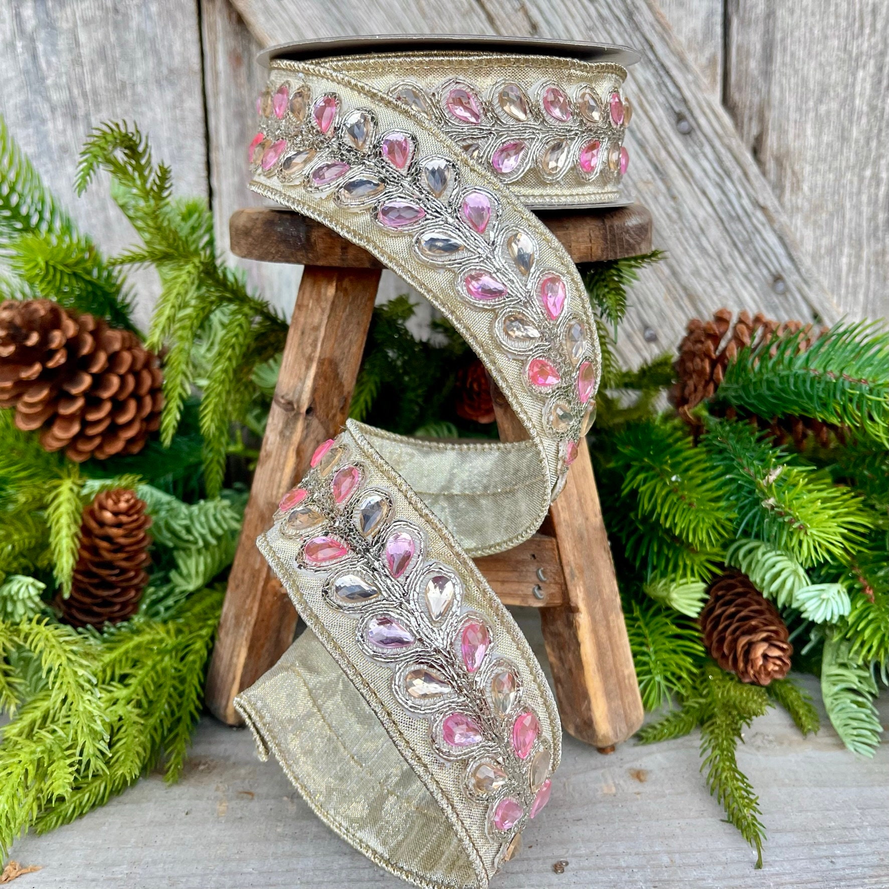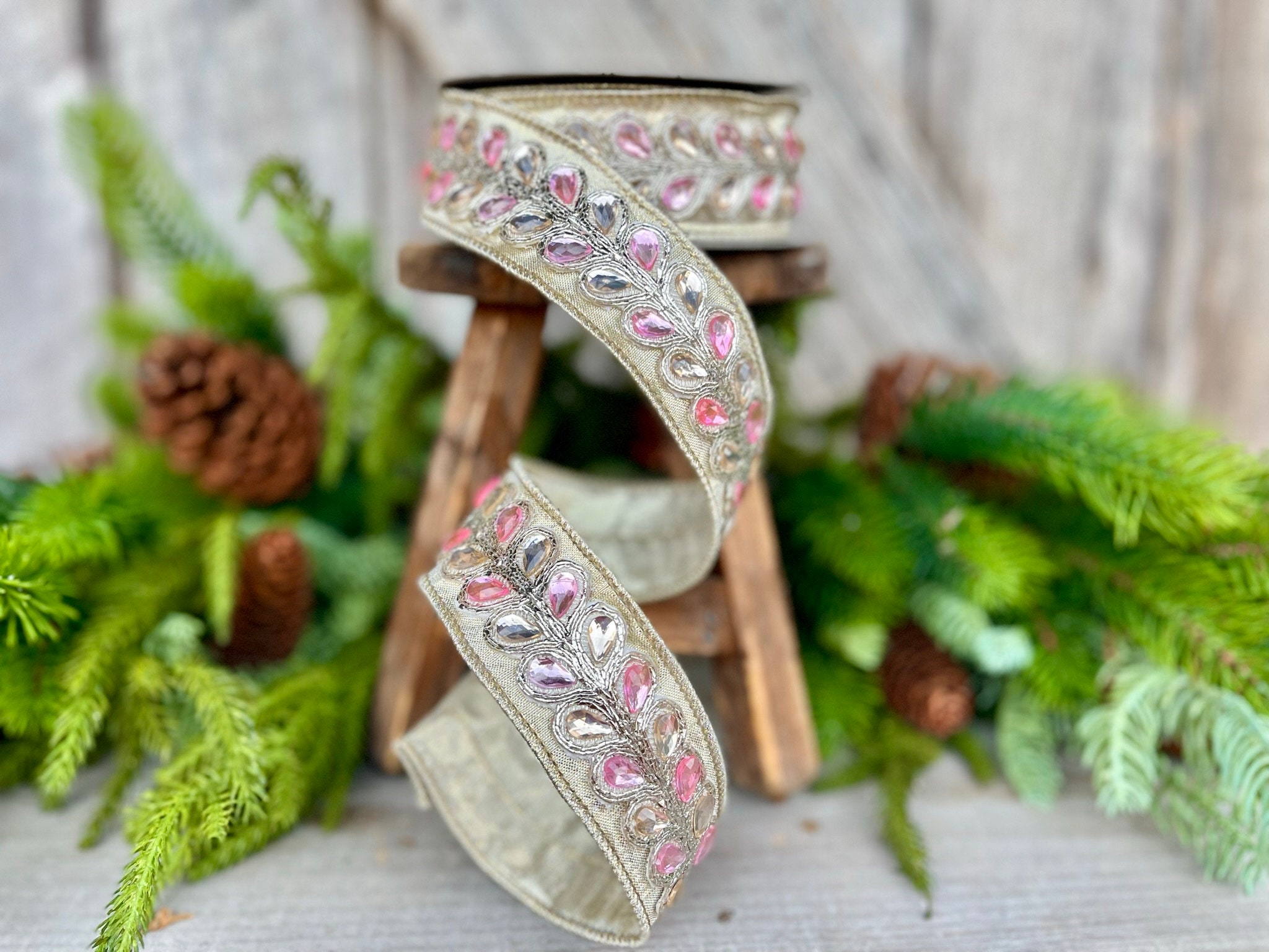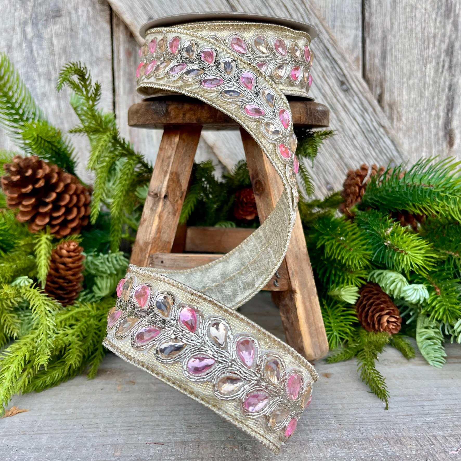 1.5" Dusty Rose Pink Jeweled Ribbon, Farrisilk Ribbon, Wired Ribbon, Christmas Ribbon, Pink Jeweled Ribbon, Pear Shape Jeweled Ribbon, Wired
