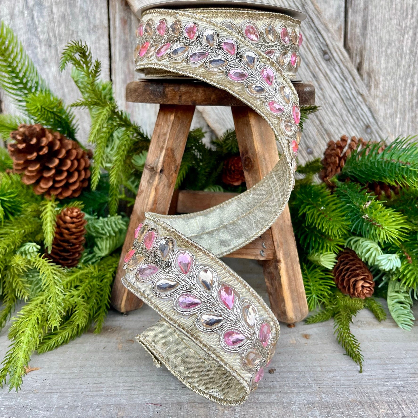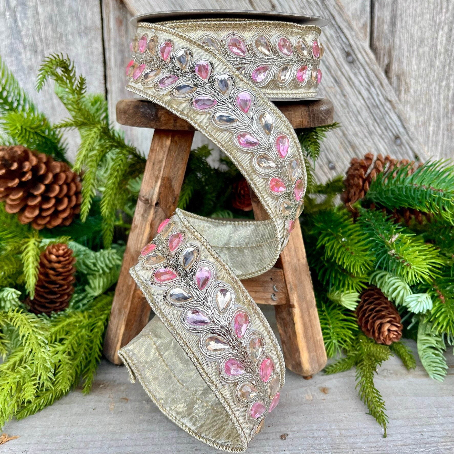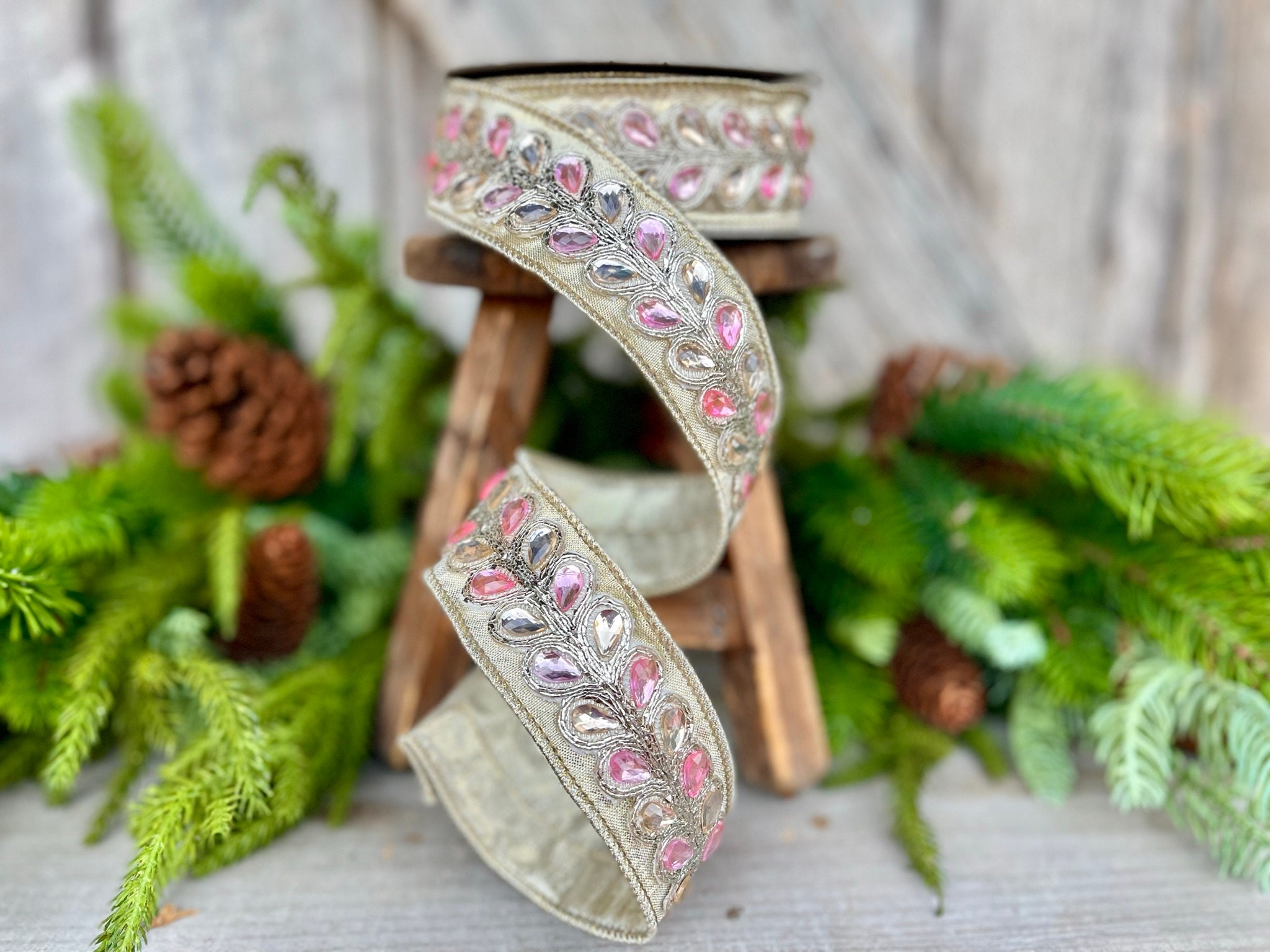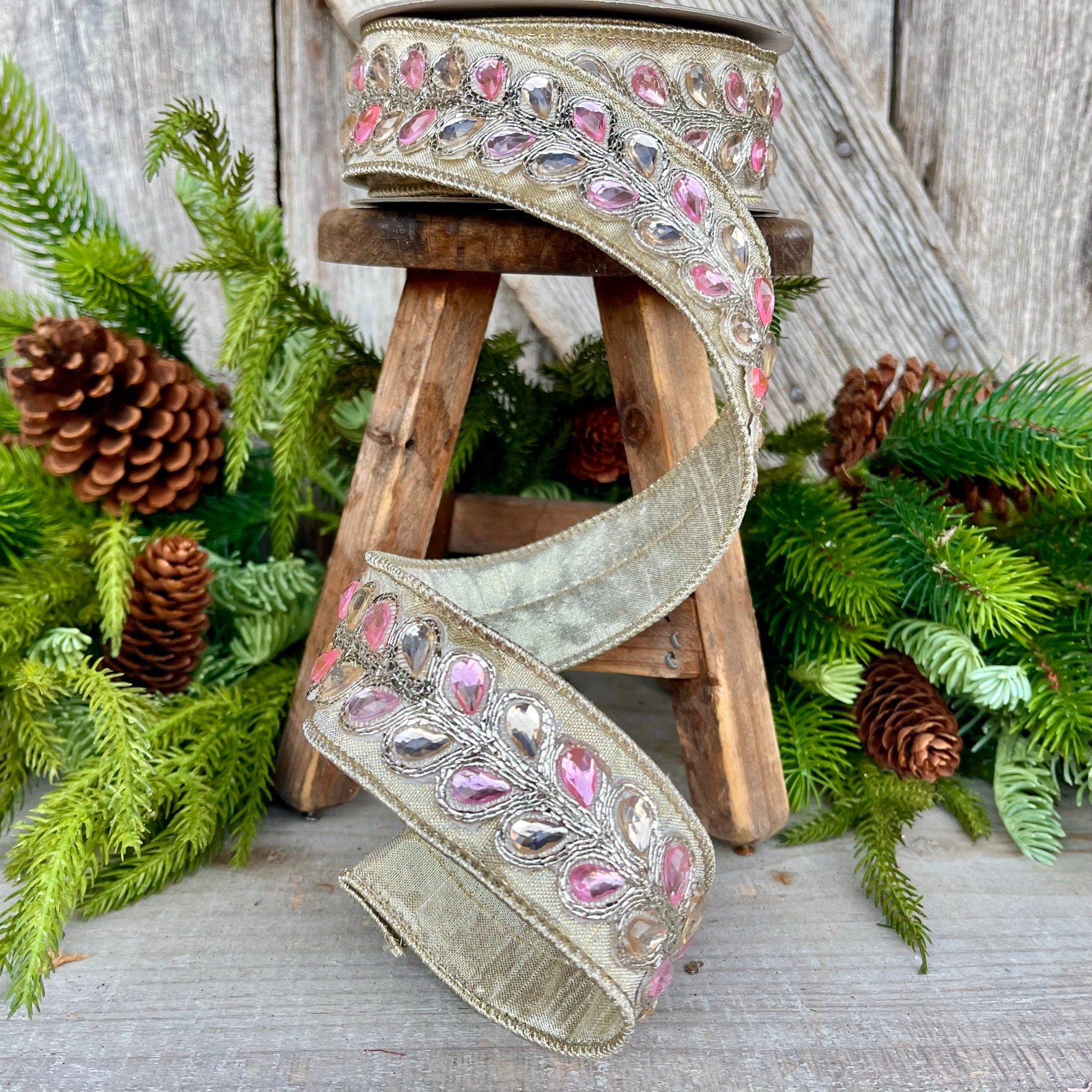 1.5" Dusty Rose Pink Jeweled Ribbon, Farrisilk Ribbon, Wired Ribbon, Christmas Ribbon, Pink Jeweled Ribbon, Pear Shape Jeweled Ribbon, Wired