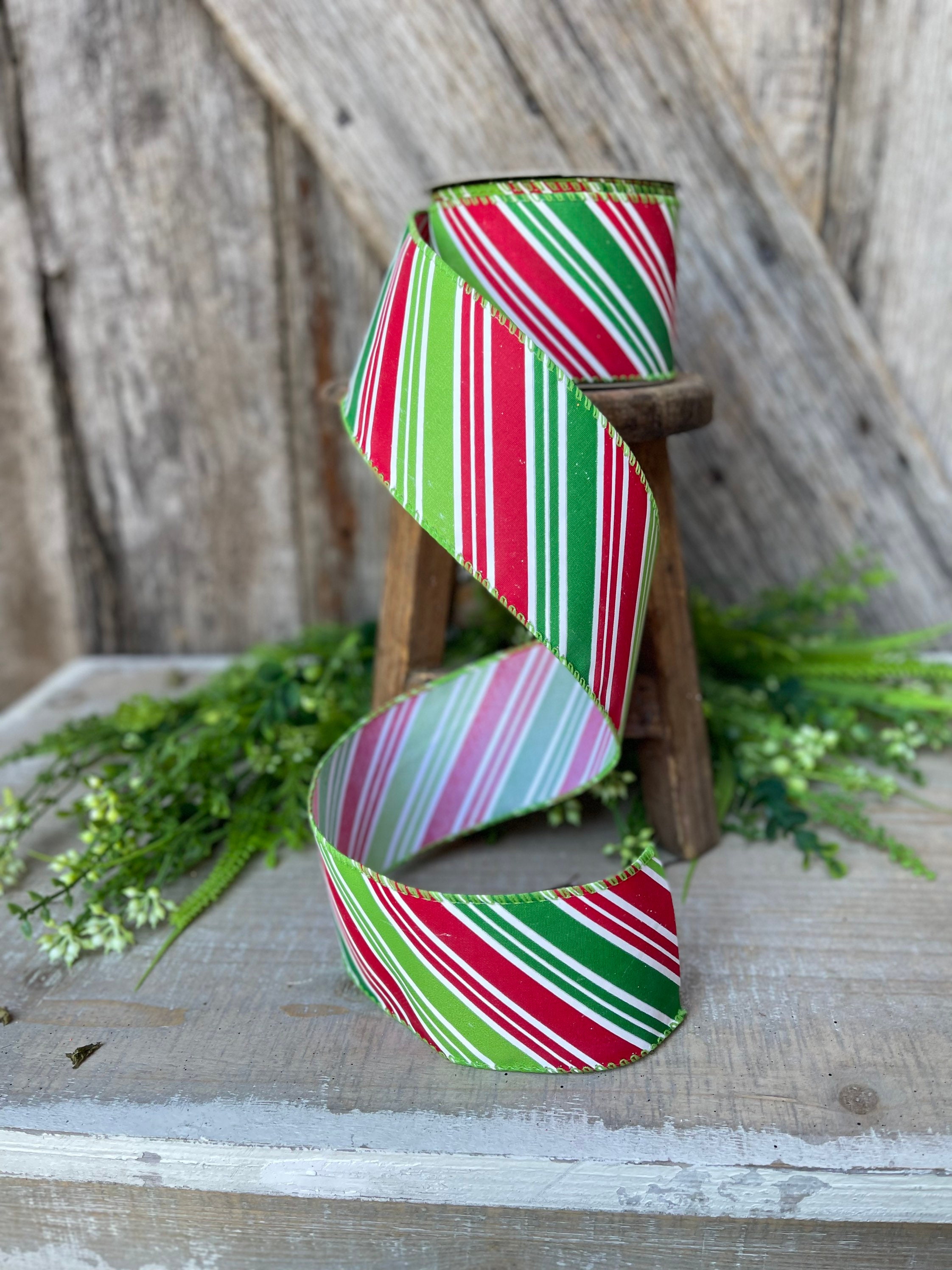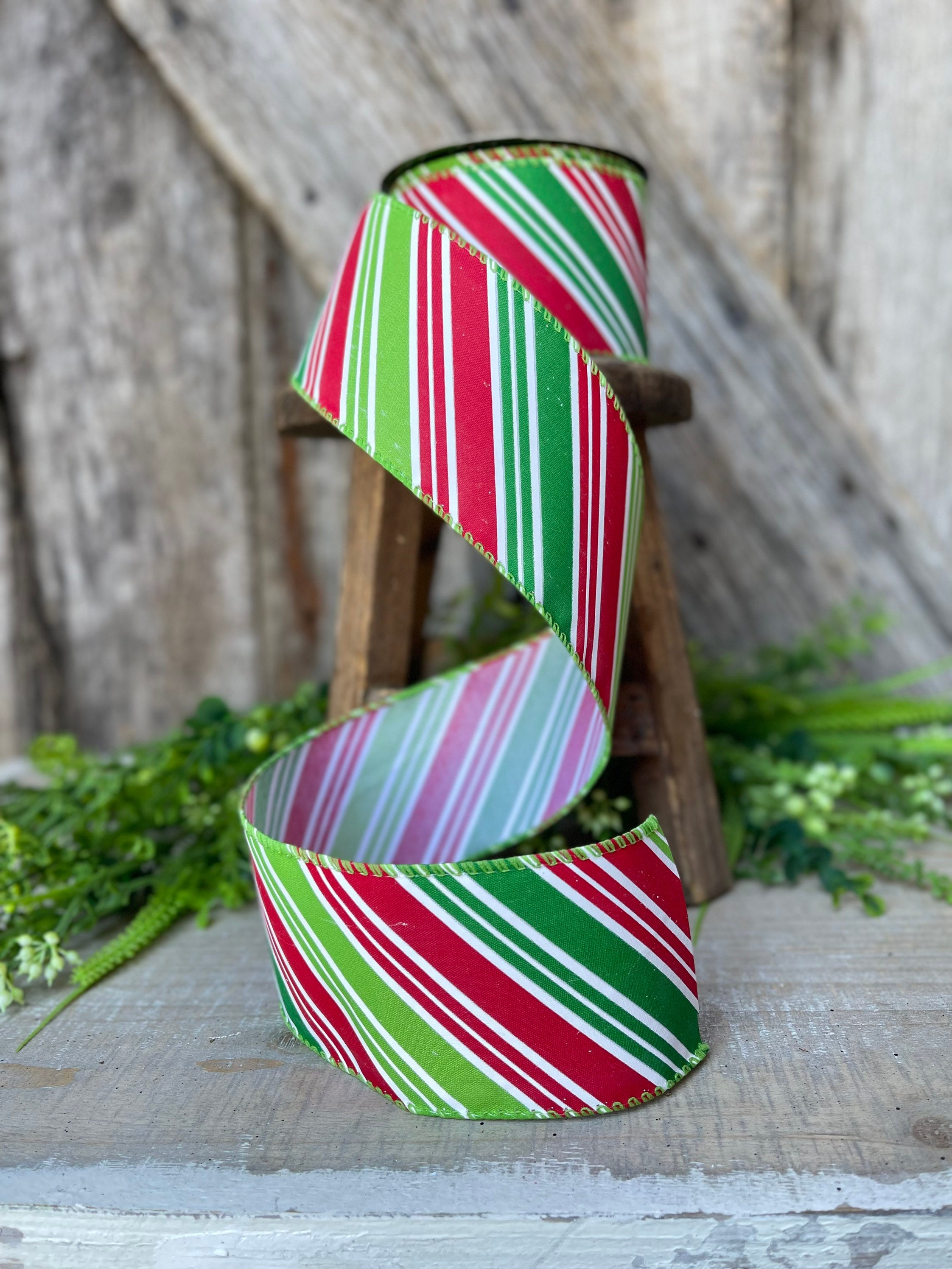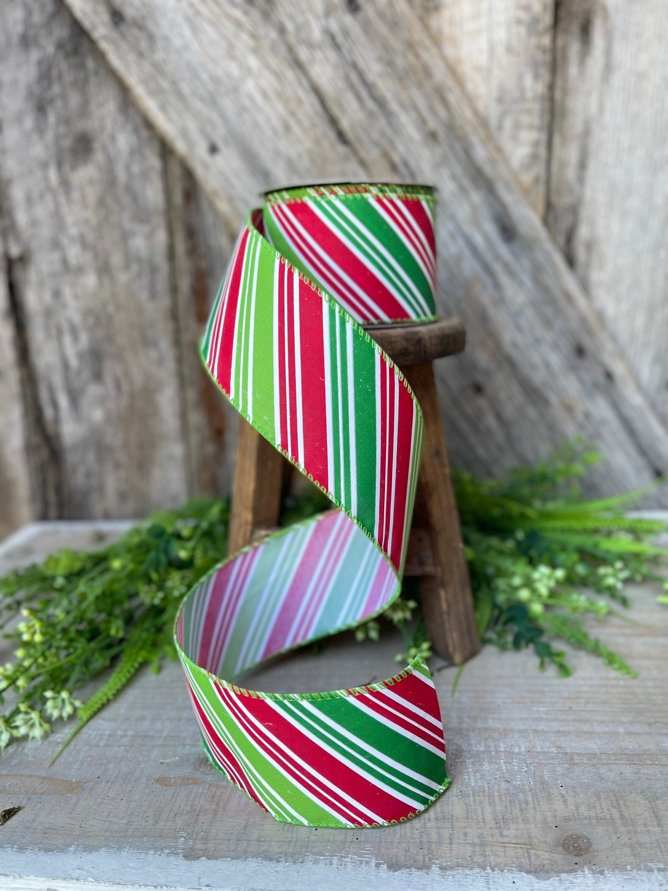 Christmas Tree Ribbon, Candy Cane Ribbon, Red Green White Ribbon, Wired Ribbon, 2.5 inch Ribbon, D Stevens Ribbon, Diagonal Stripe Ribbon