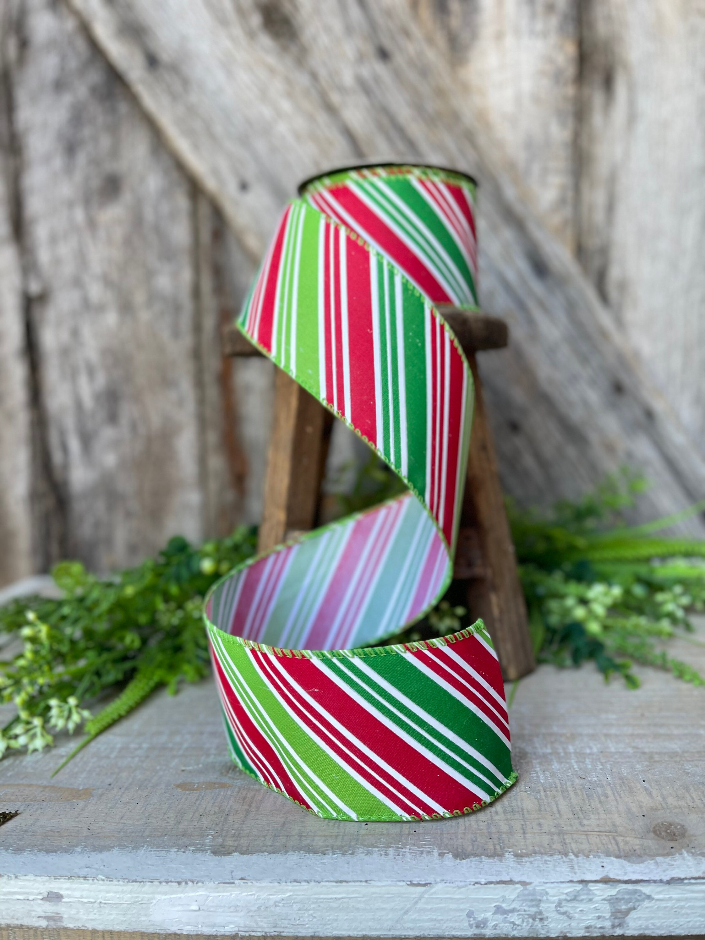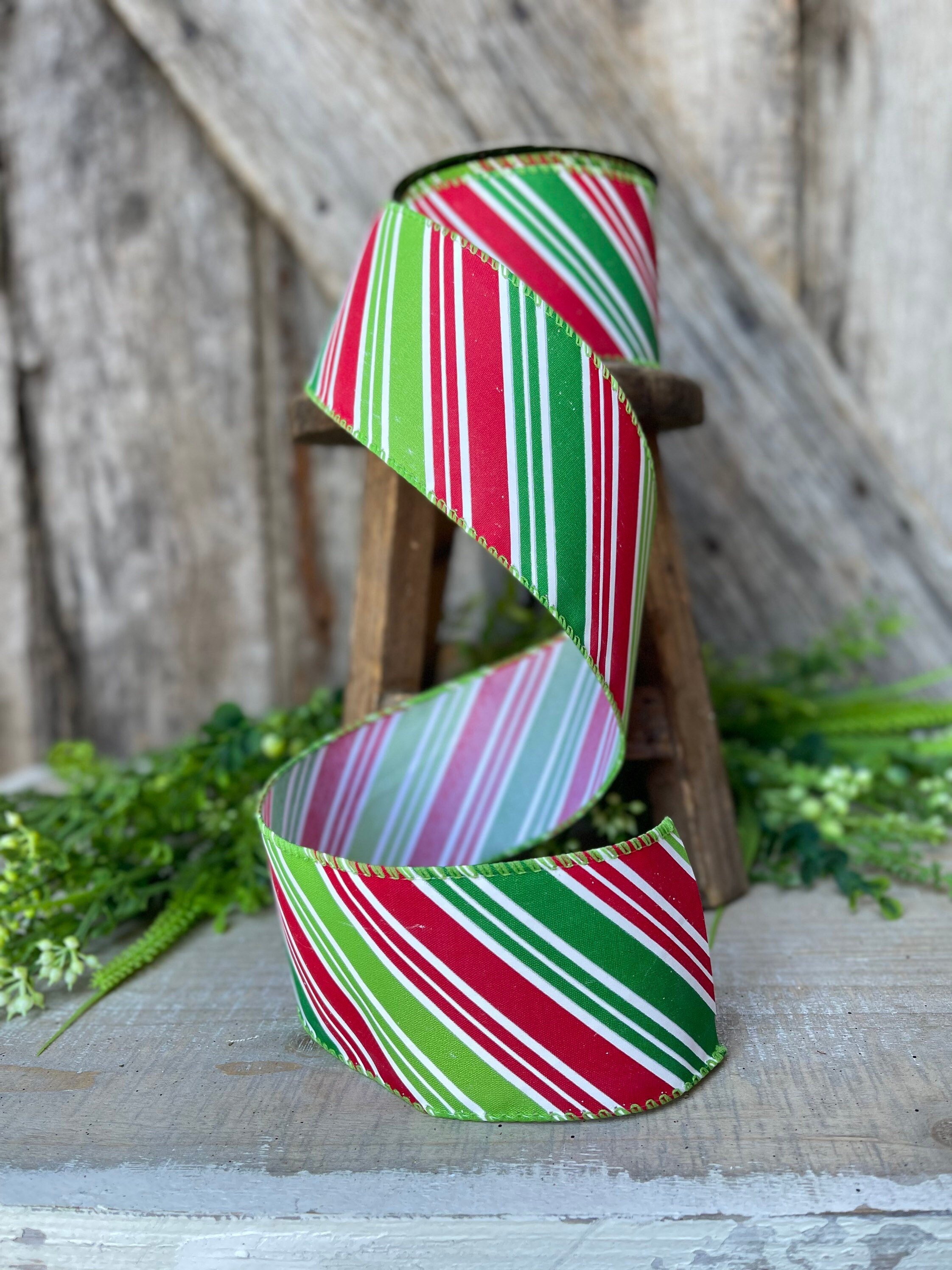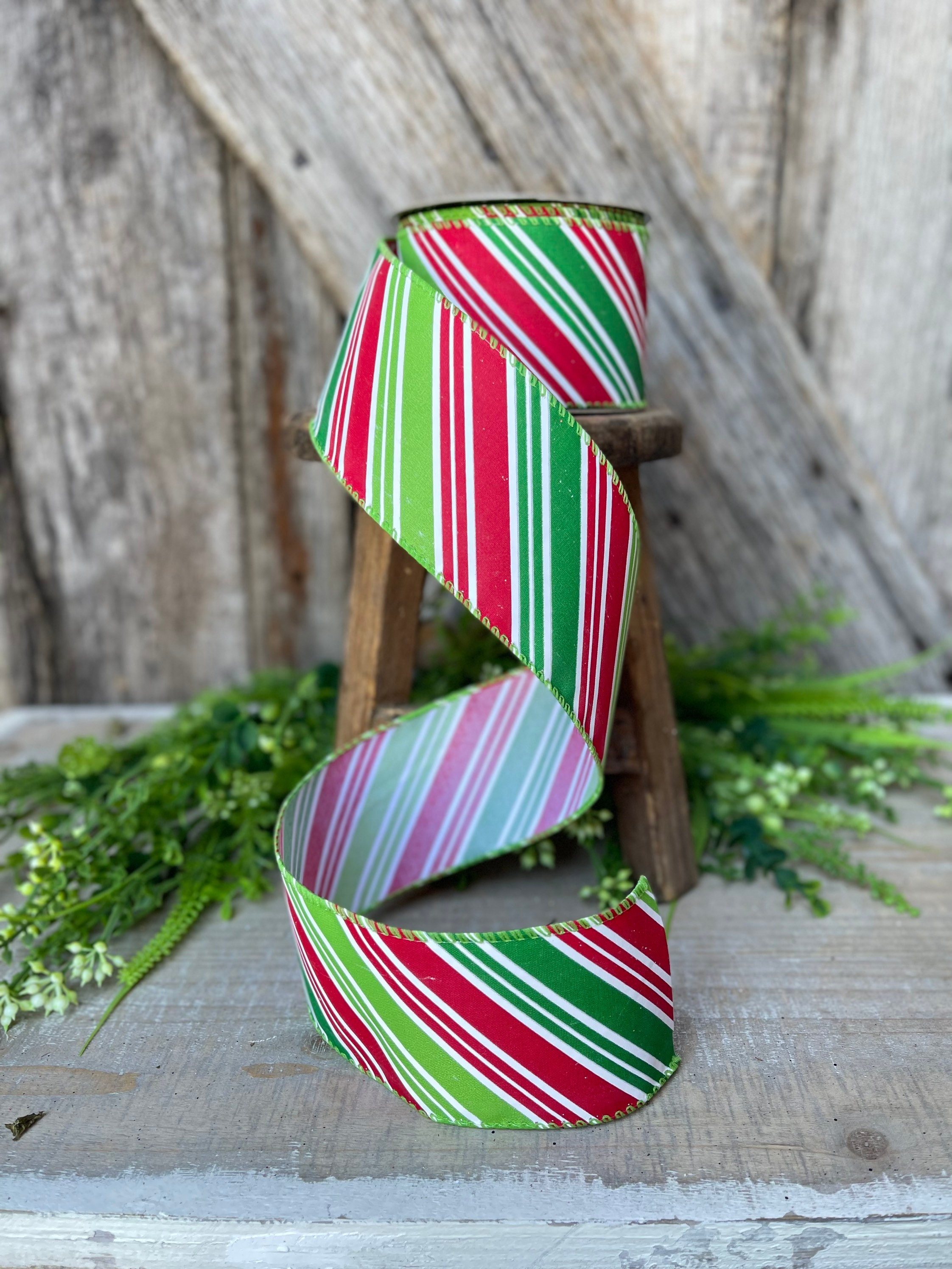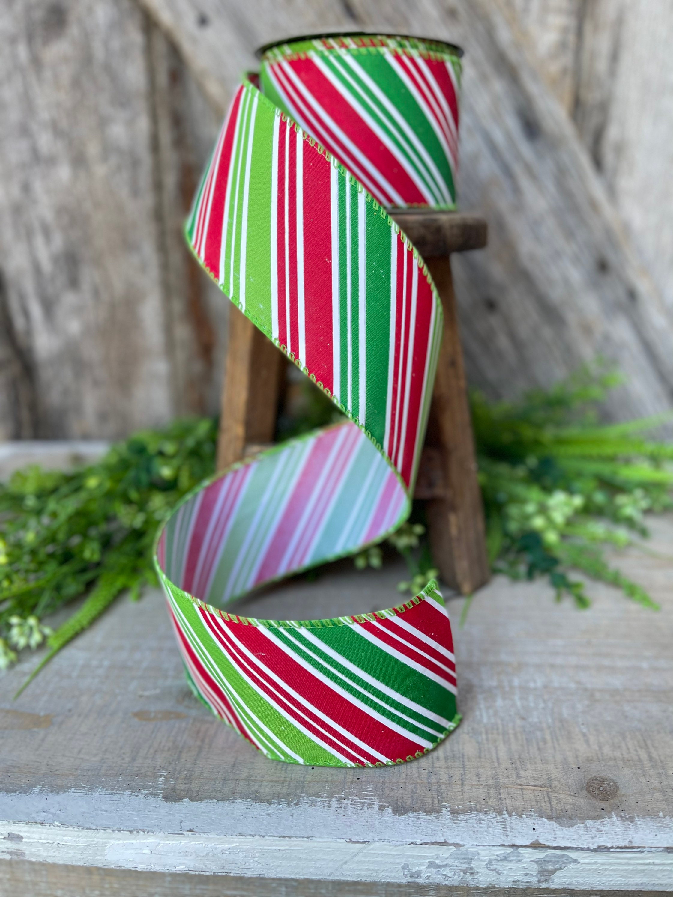 Christmas Tree Ribbon, Candy Cane Ribbon, Red Green White Ribbon, Wired Ribbon, 2.5 inch Ribbon, D Stevens Ribbon, Diagonal Stripe Ribbon