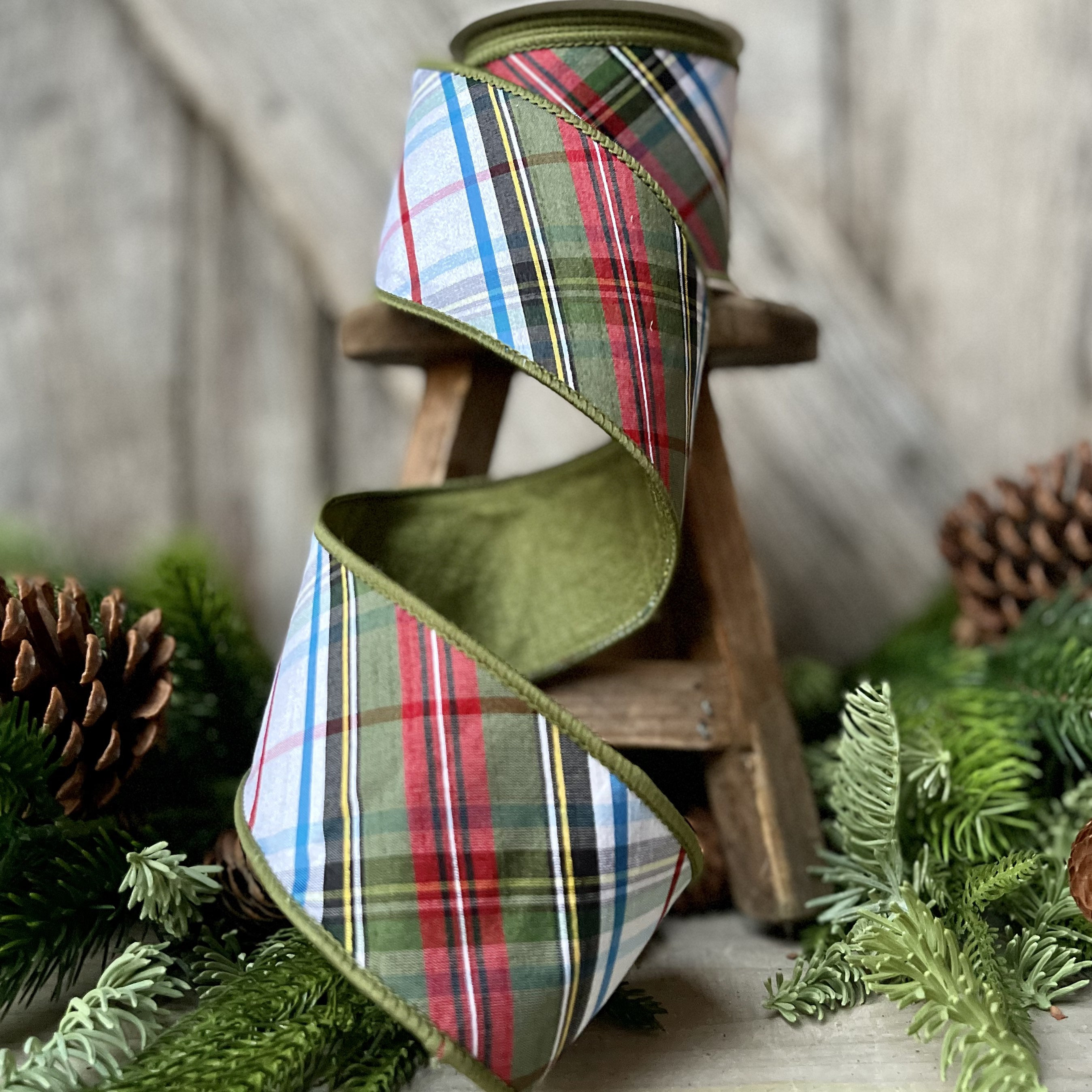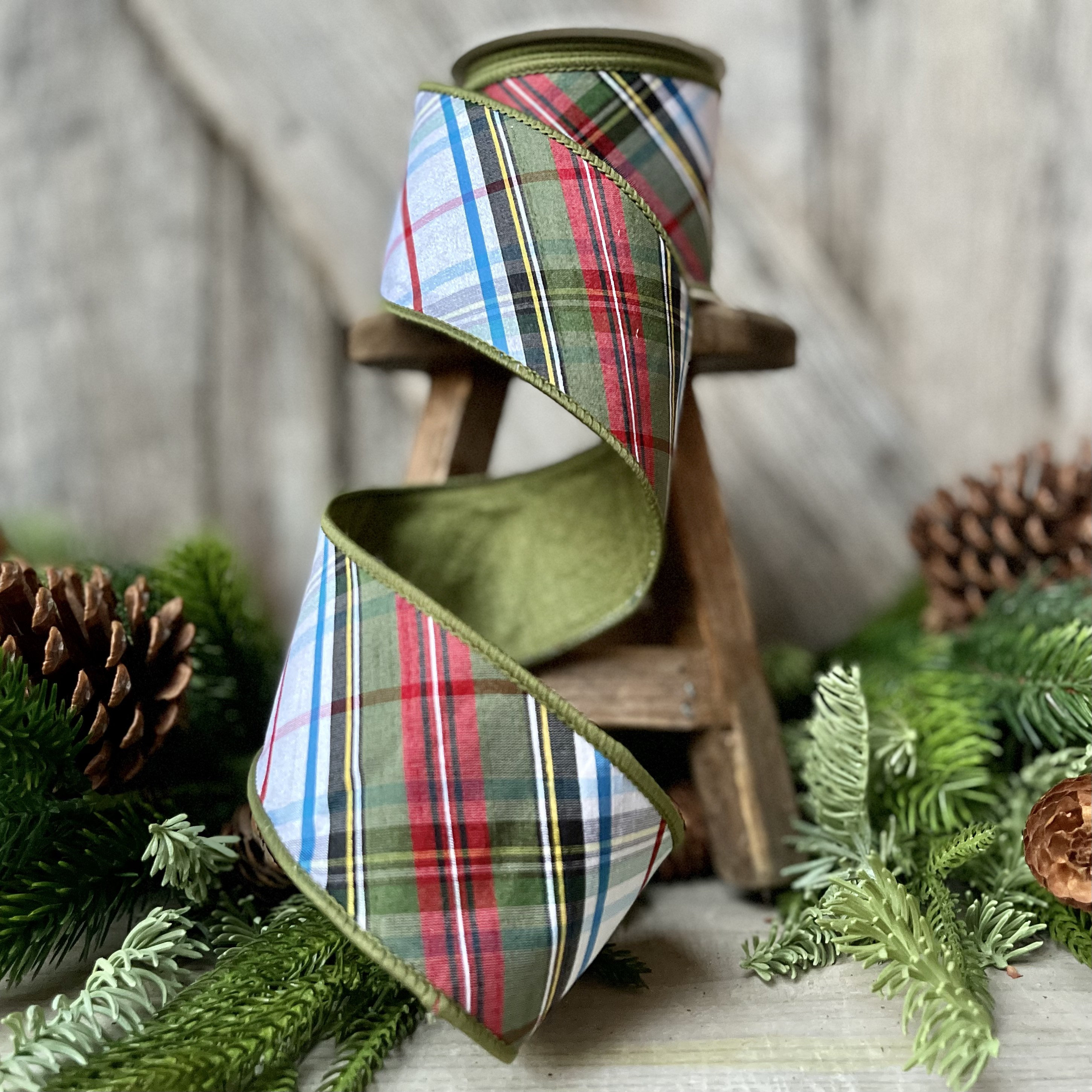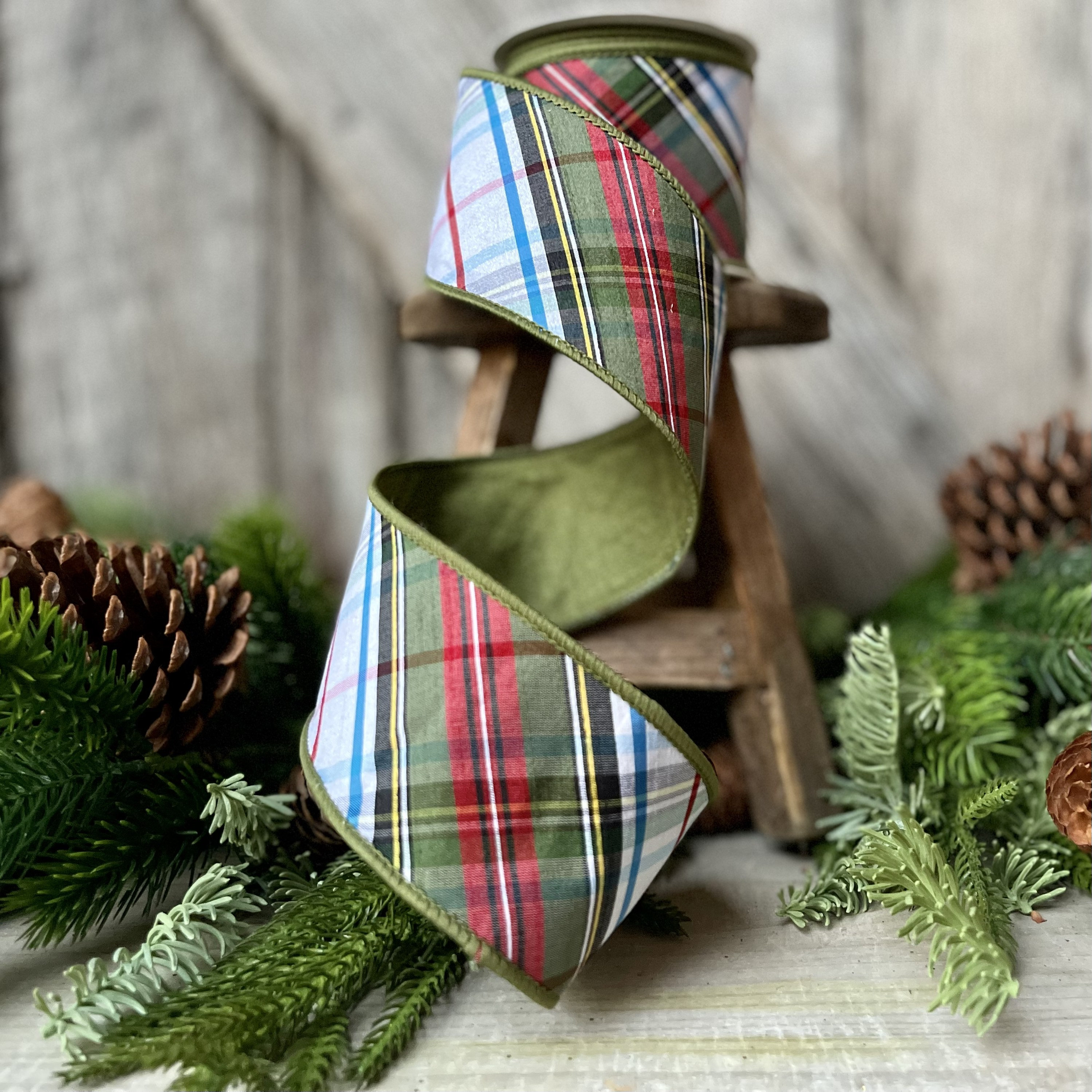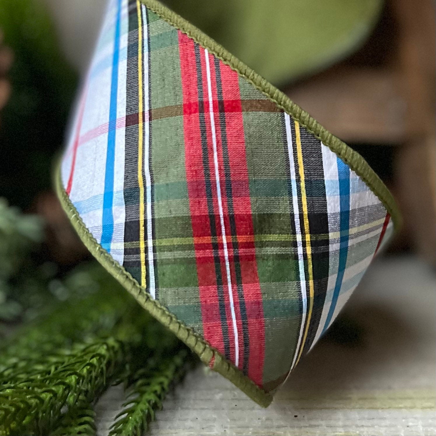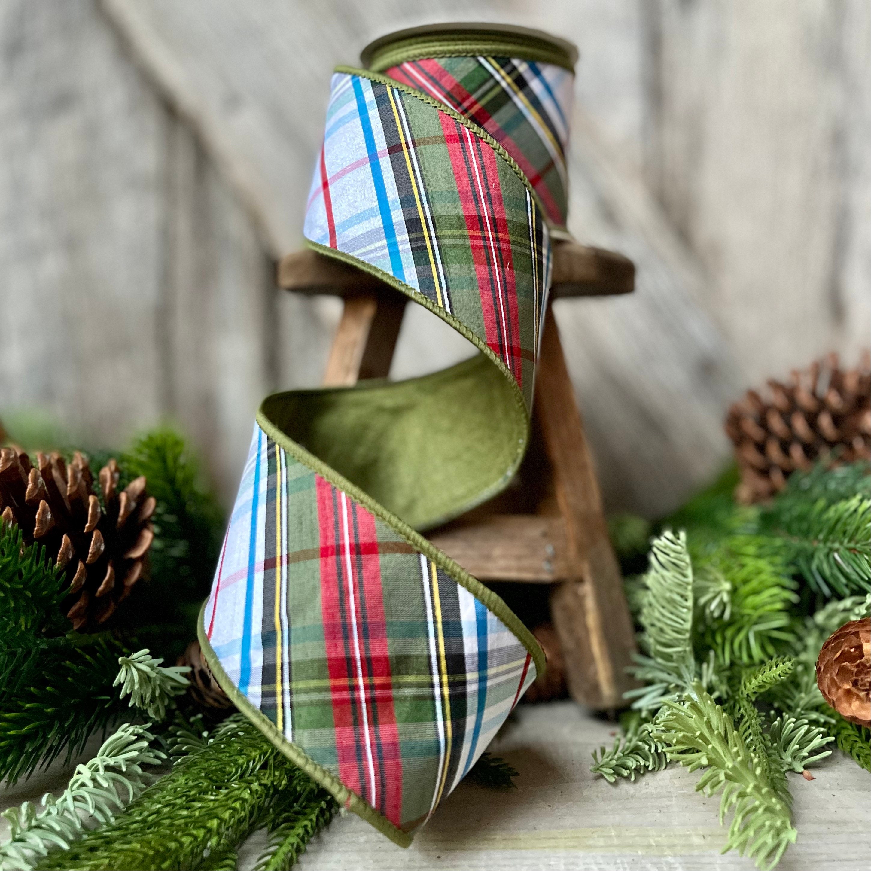 2.5" Christmas Plaid Ribbon in Moss Green, White, Red, and Blue, Wired Ribbon, Christmas Ribbon, Christmas Decor, Designer Ribbon