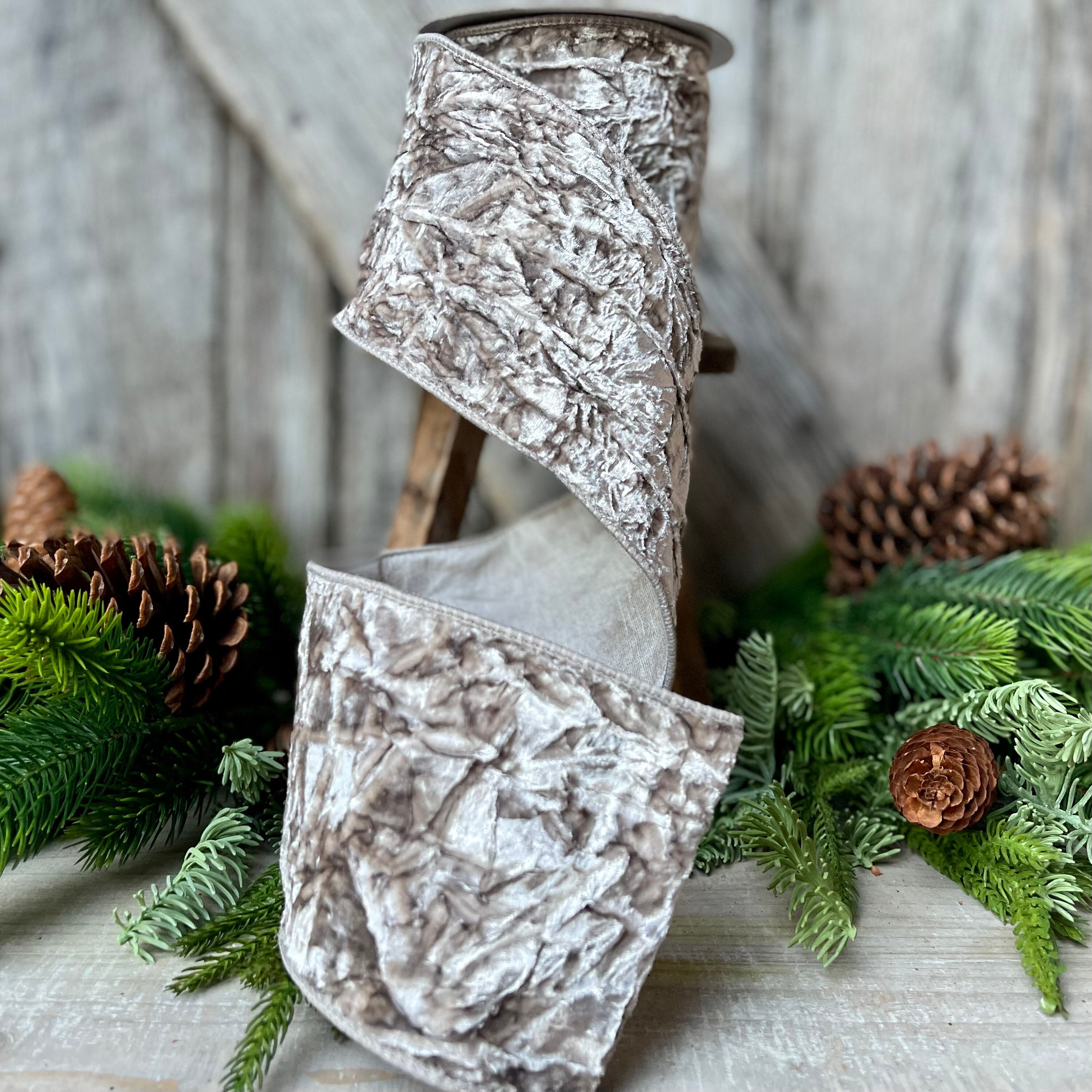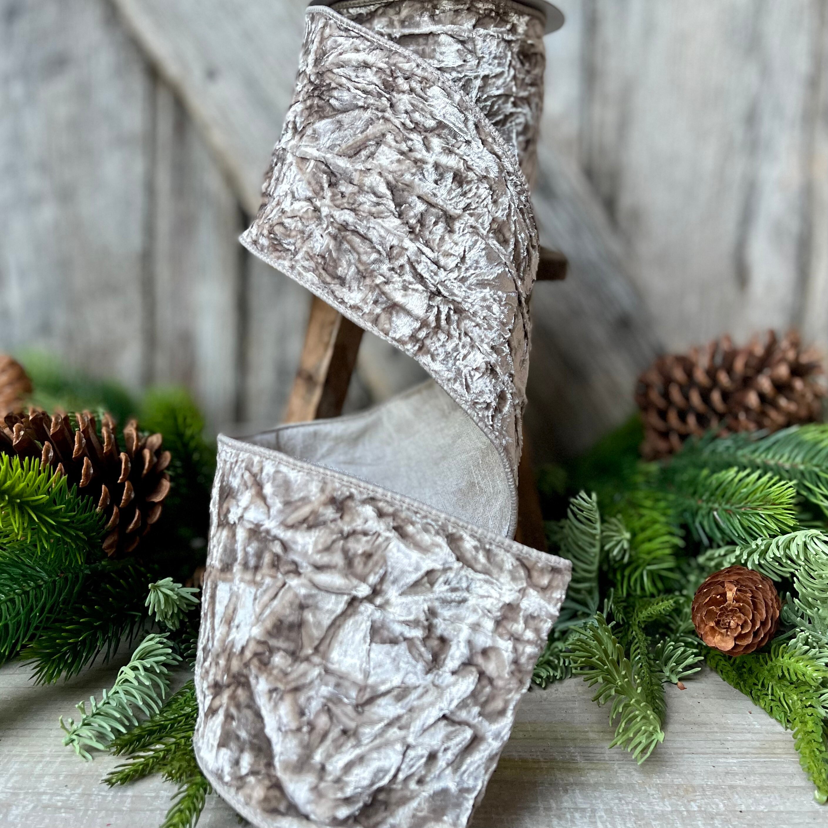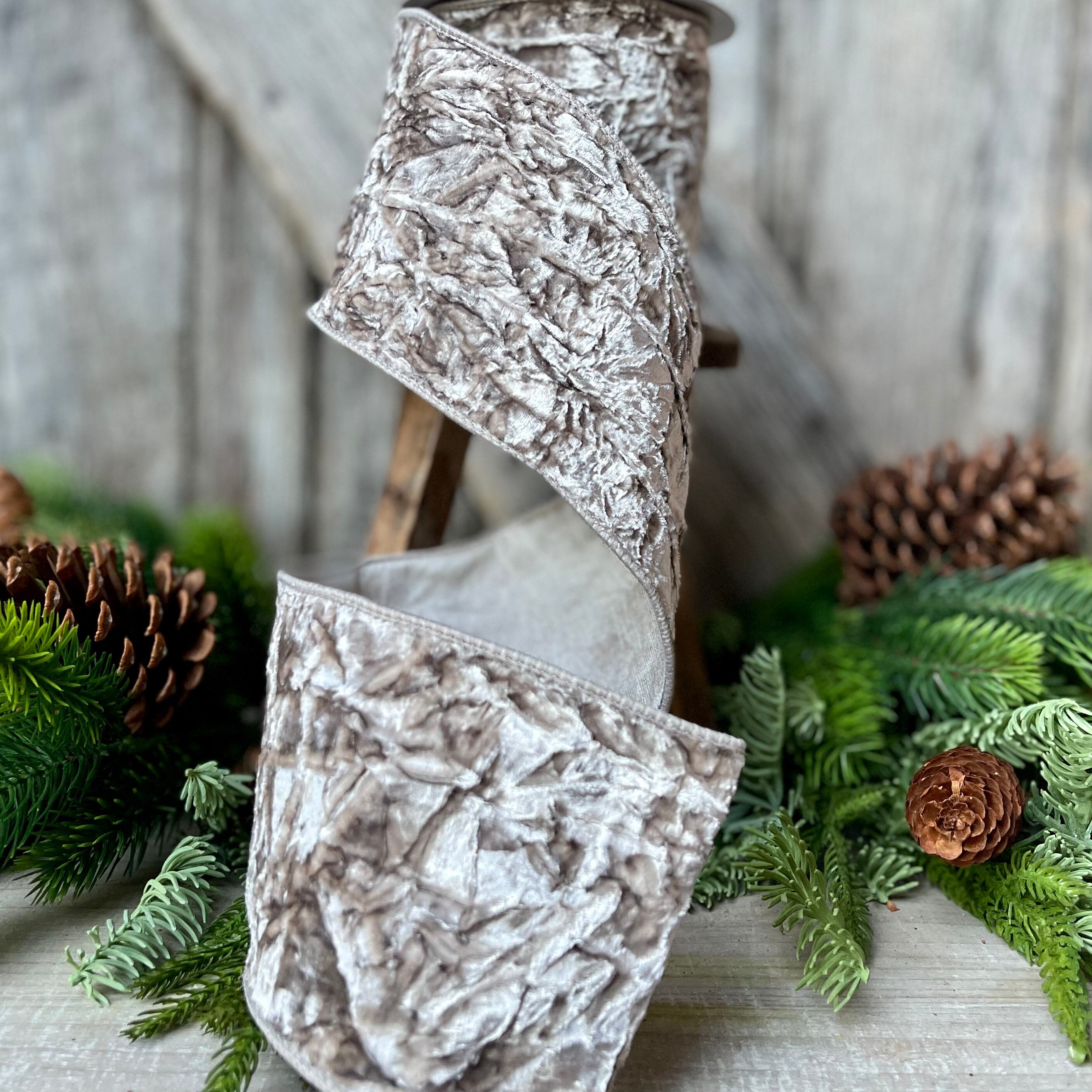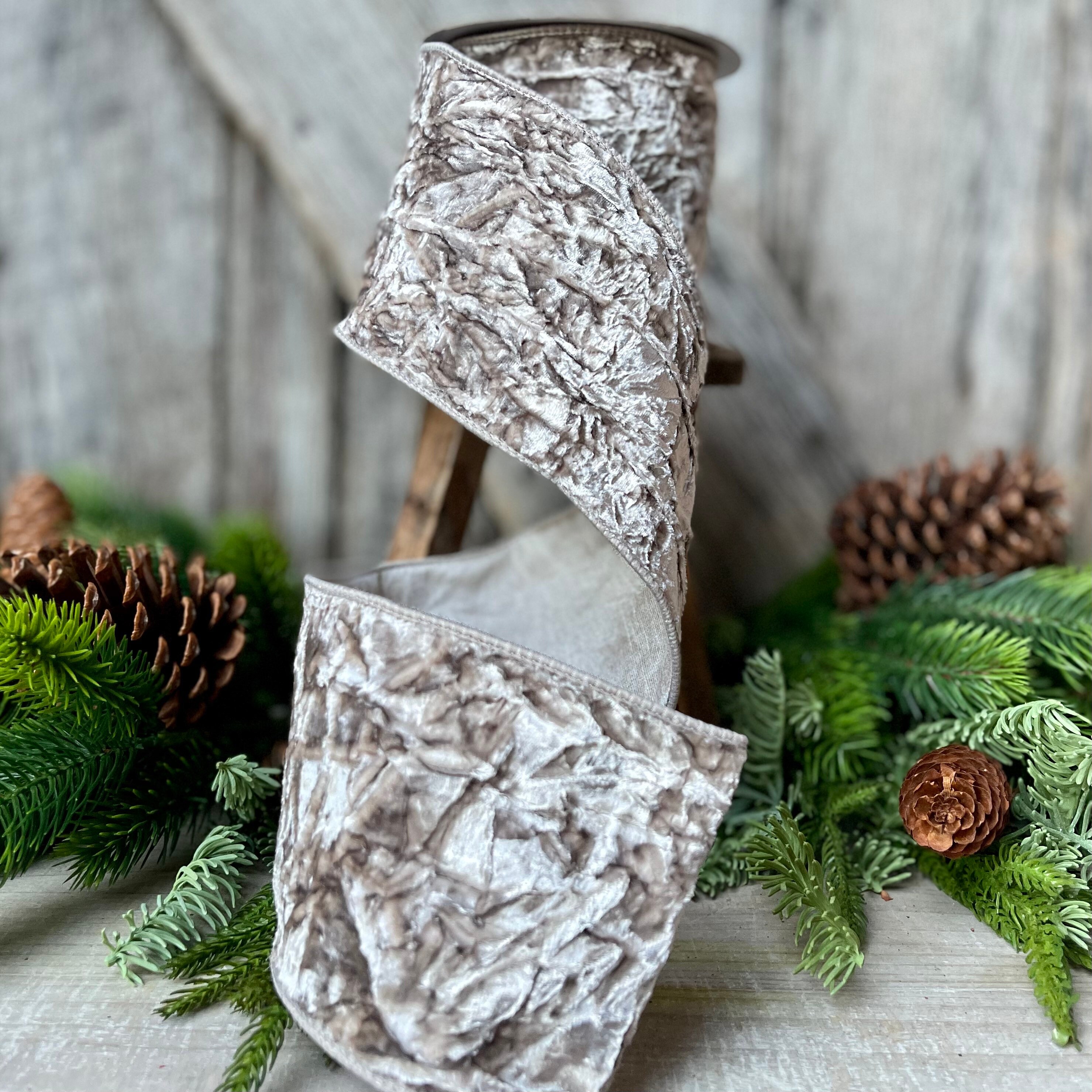 4" Platinum Crushed Velvet, Christmas Tree Ribbon, Platinum Velvet Ribbon, Platinum Ribbon, wired ribbon, velvet ribbon, 5 yards