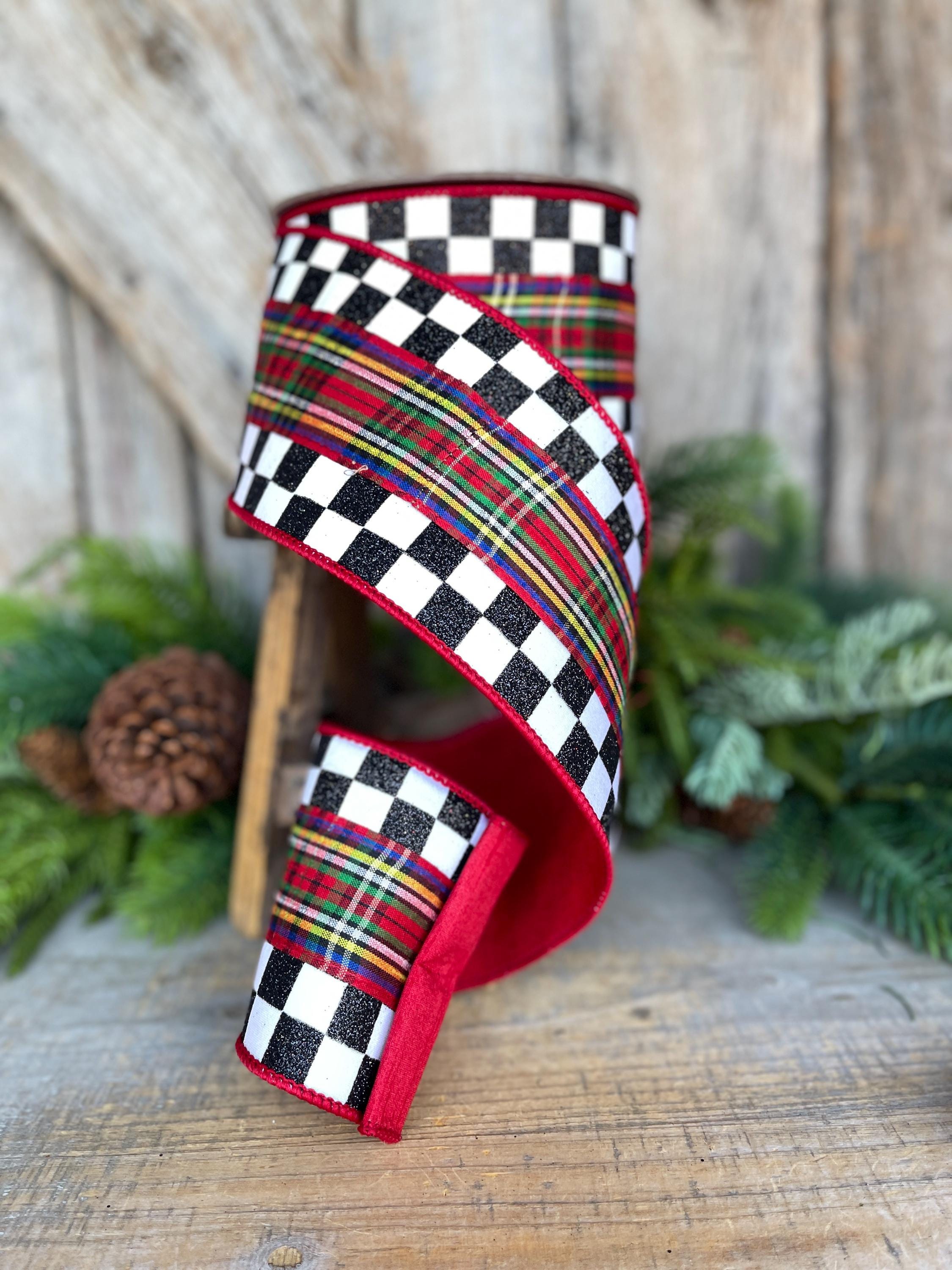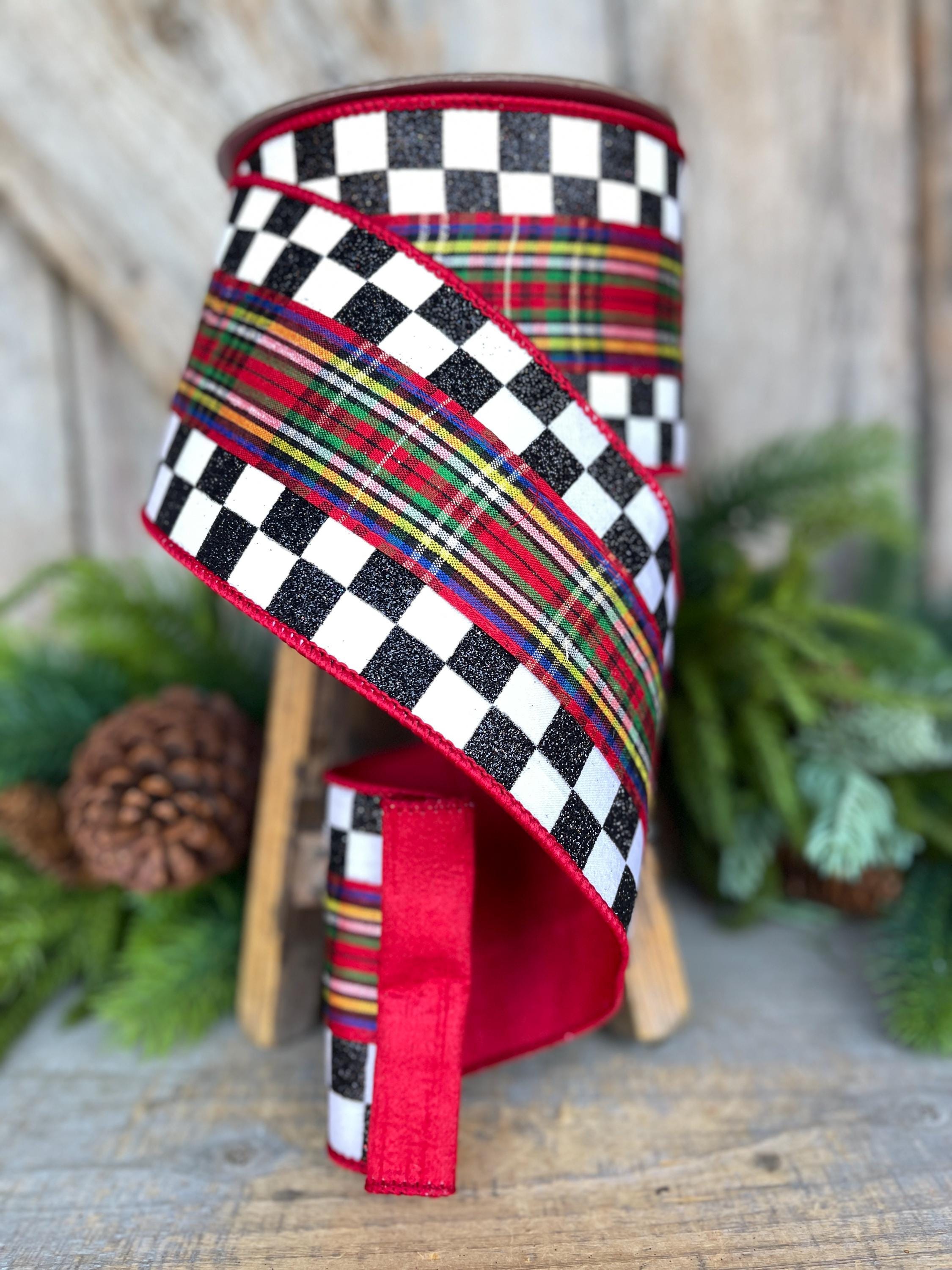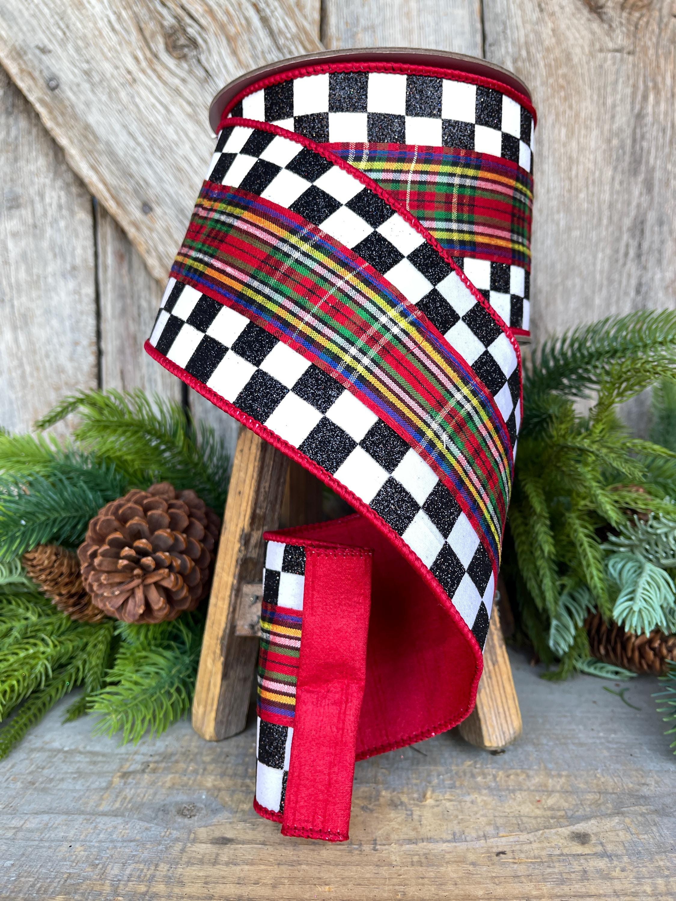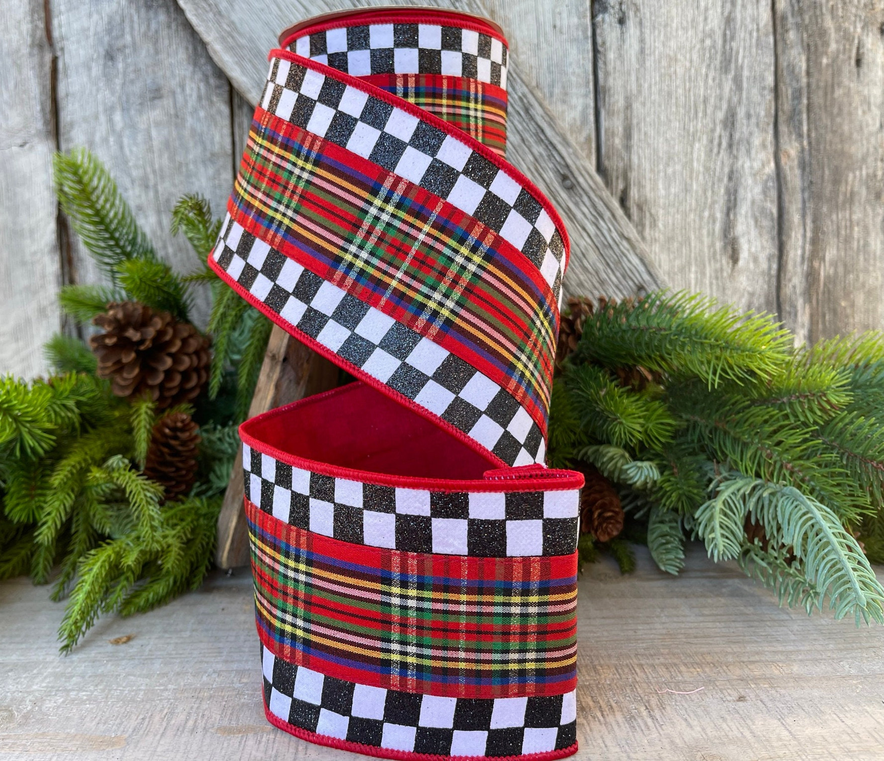 4" Christmas Checks and Plaid Ribbon, Farrisilk ribbon, 4 inch ribbon, Christmas Tree ribbon, wired ribbon, Christmas Tree RIbbon, Wired