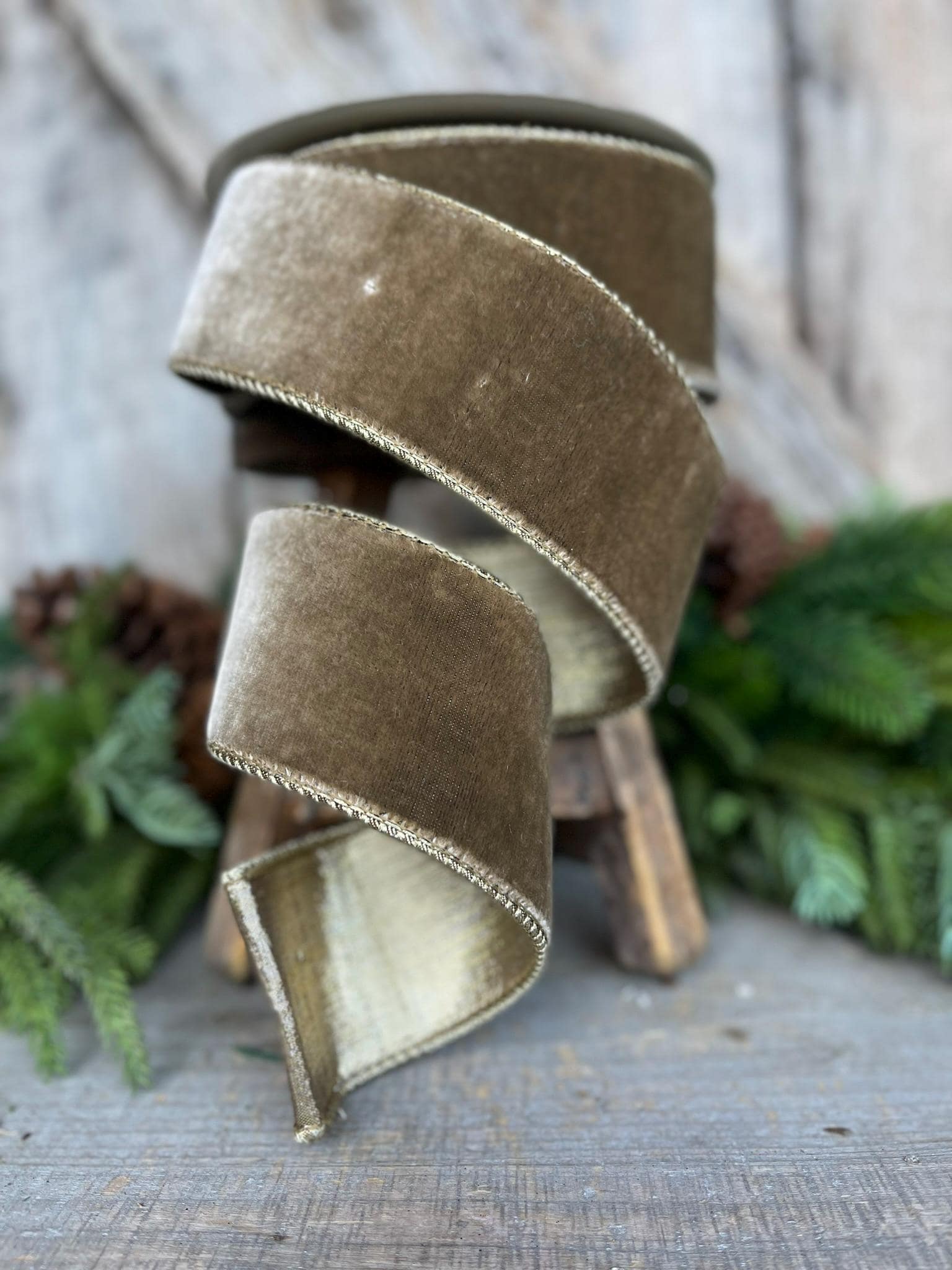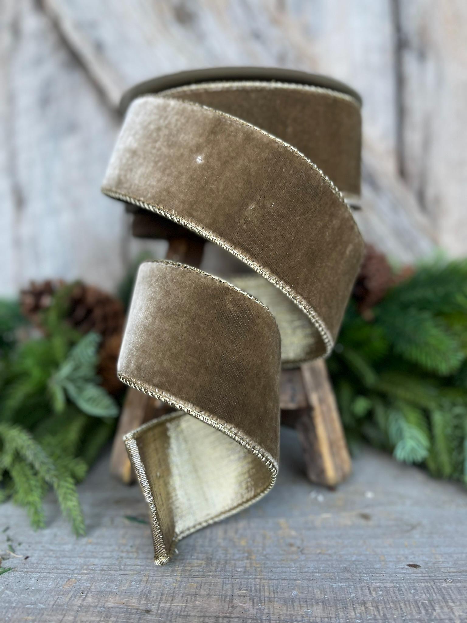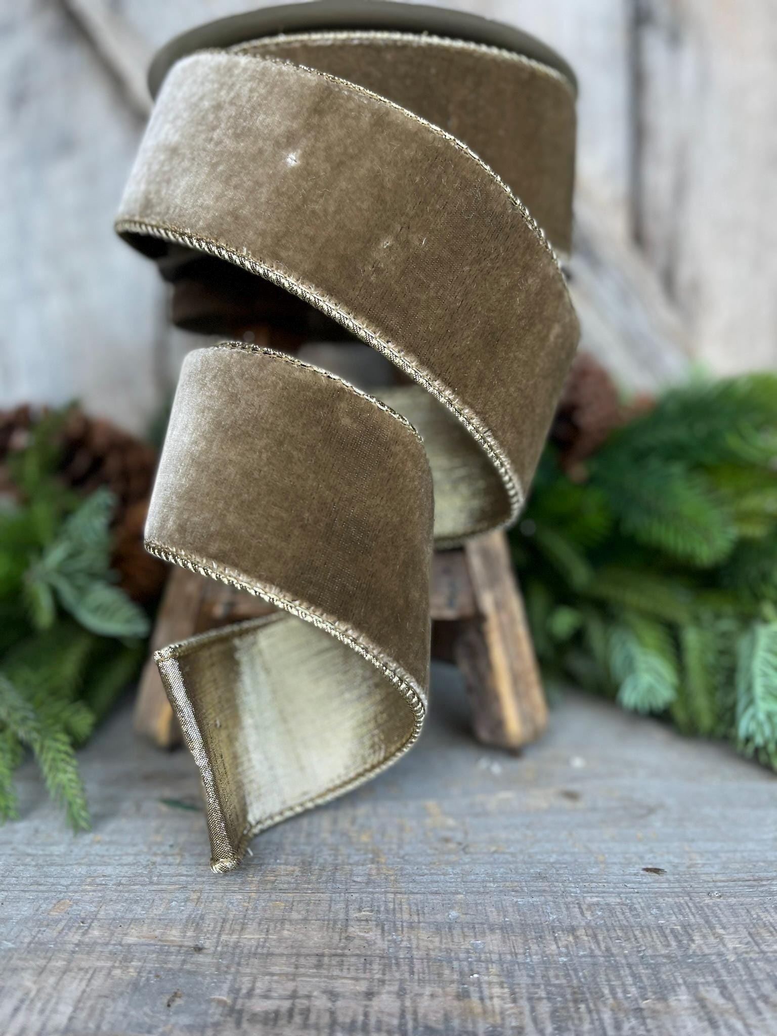 Features a lush mink colored velvet. Ribbon is constructed with thick, wired edge and is fused with a secondary fabric to provide shape and structure.