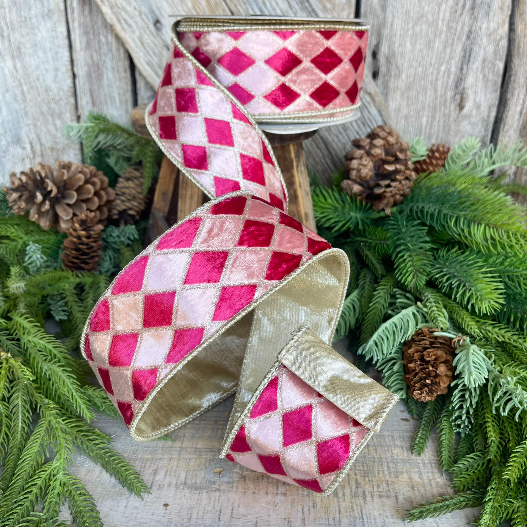 2.5" Pink Velvet Diamonds Ribbon, Farrisilk Ribbon, Hot pink Velvet Ribbon, Harlequin Ribbon, Christmas Ribbon, Pinkmas Ribbon, RK759-22