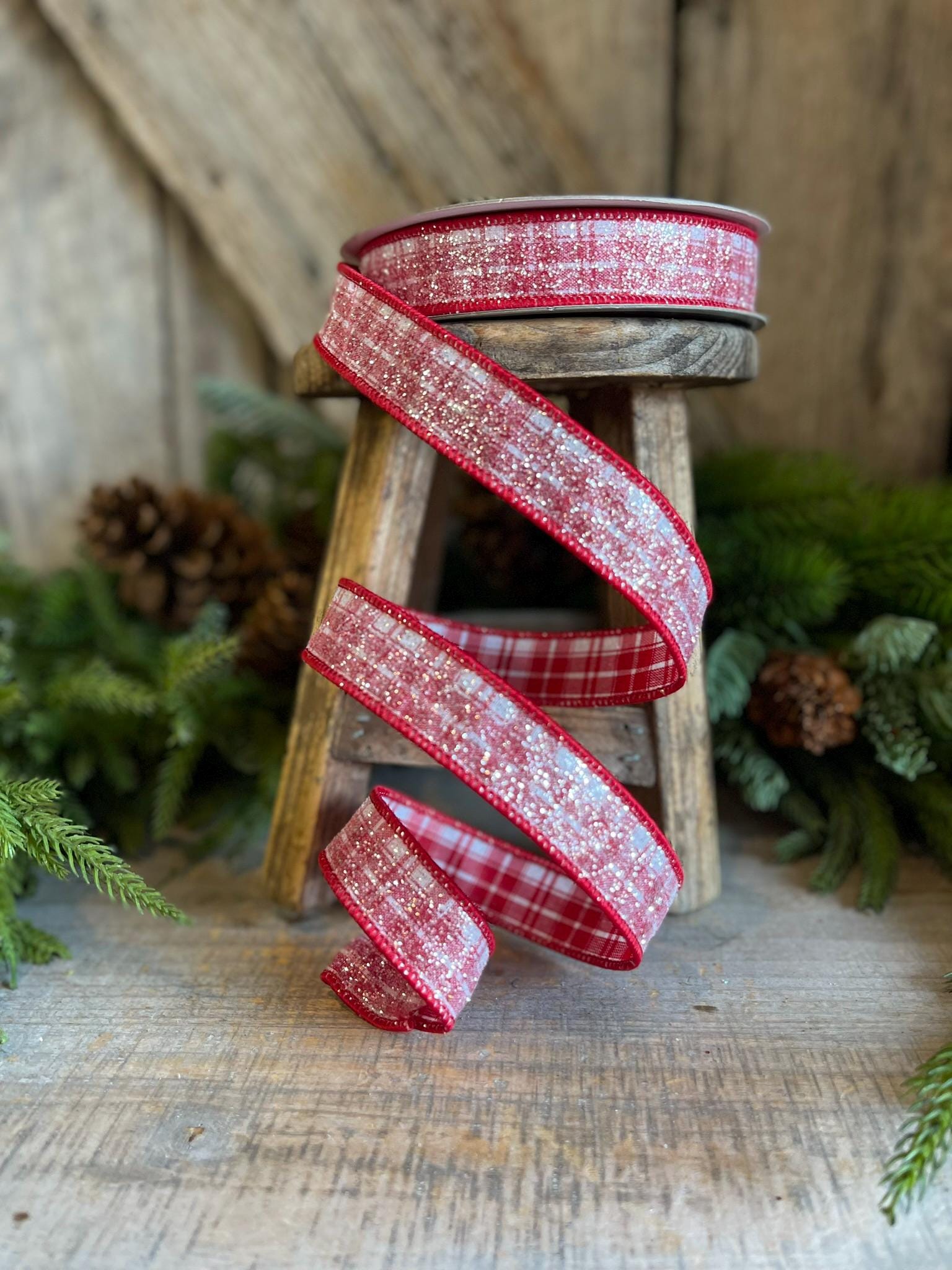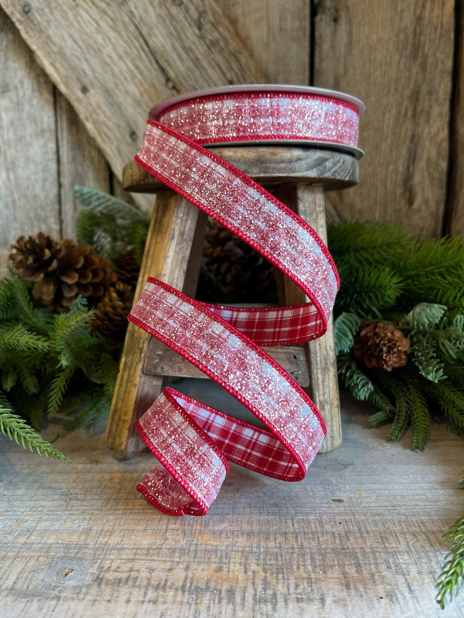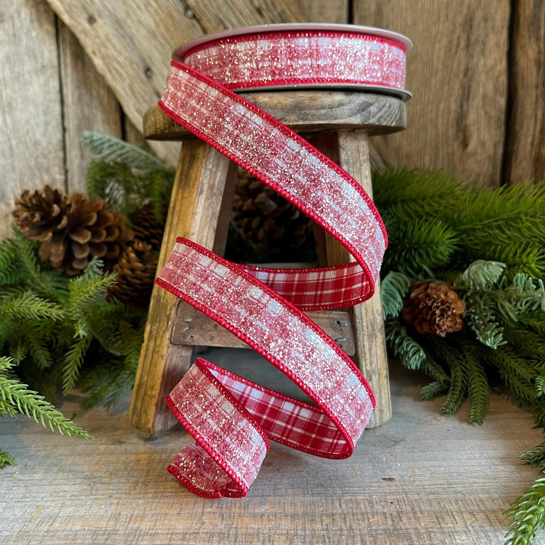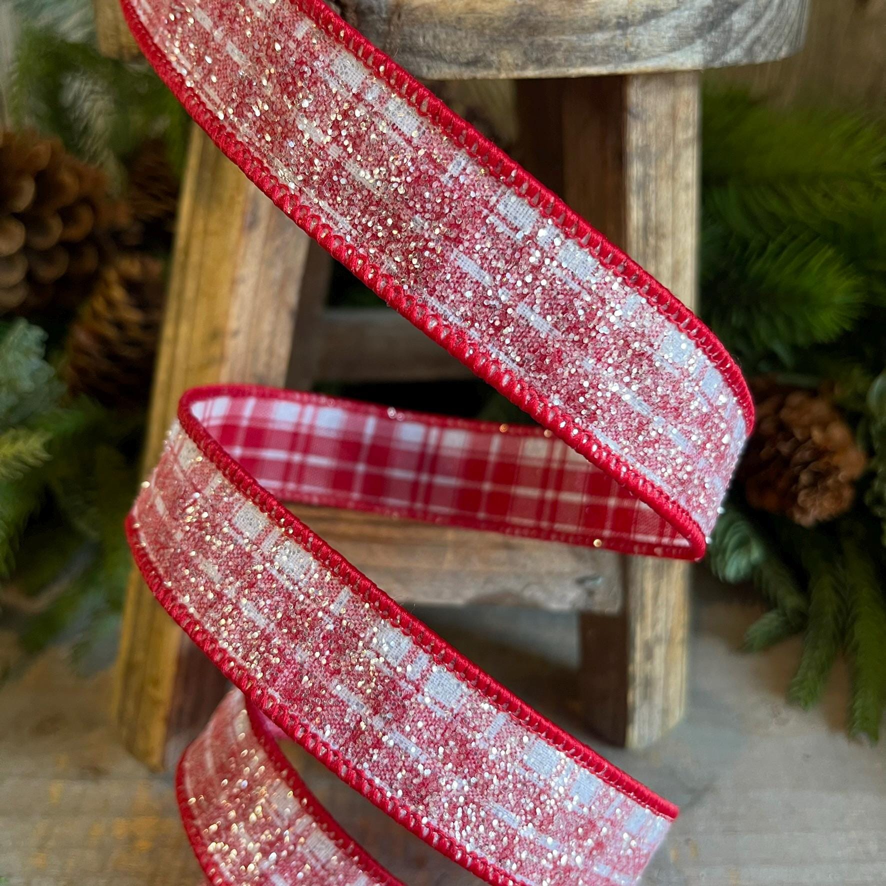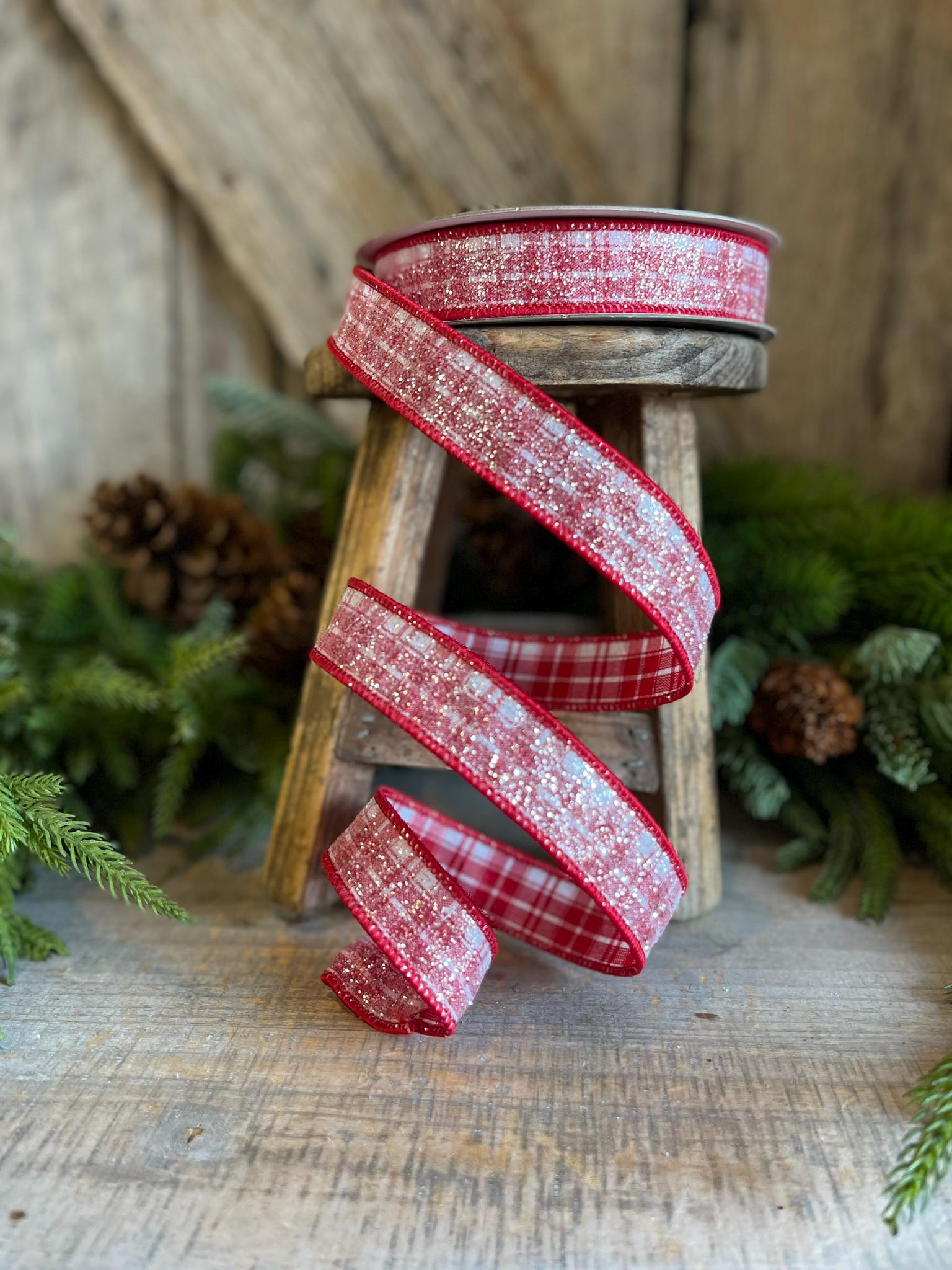 This ribbon is great for Gingerbread themes, Candy themes, or even traditional Christmas themes. This ribon is a red and white plaid with a sugar crystal finish on it. It is low shedding and has a great wire. You won't be disapointed in this ribbon!