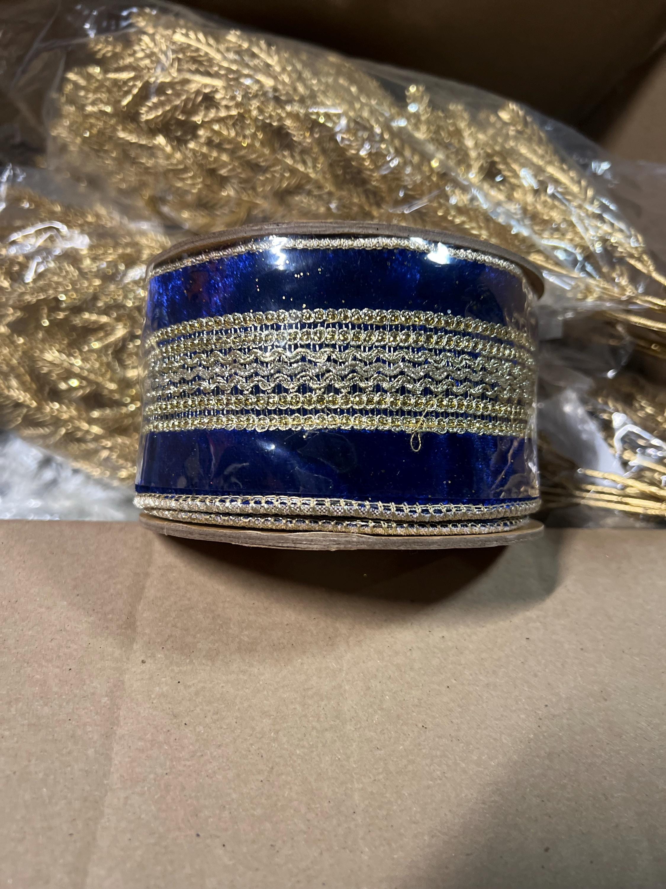 2.5" Blue and Gold Trim Ribbon, Royal Blue Ribbon, Wired Ribbon, Blue Christmas Ribbon, Jeweled RIbbon, Designer Ribbon