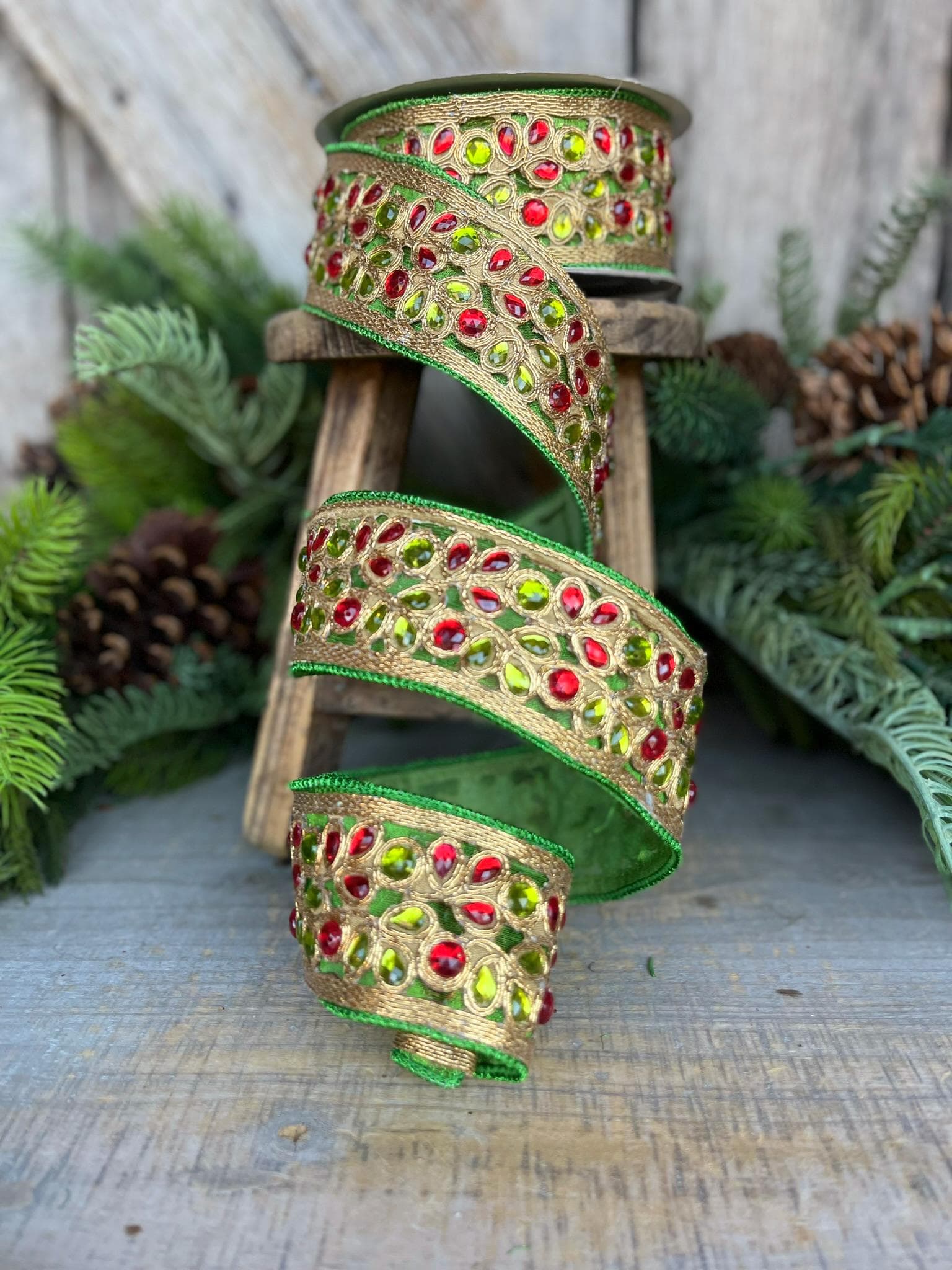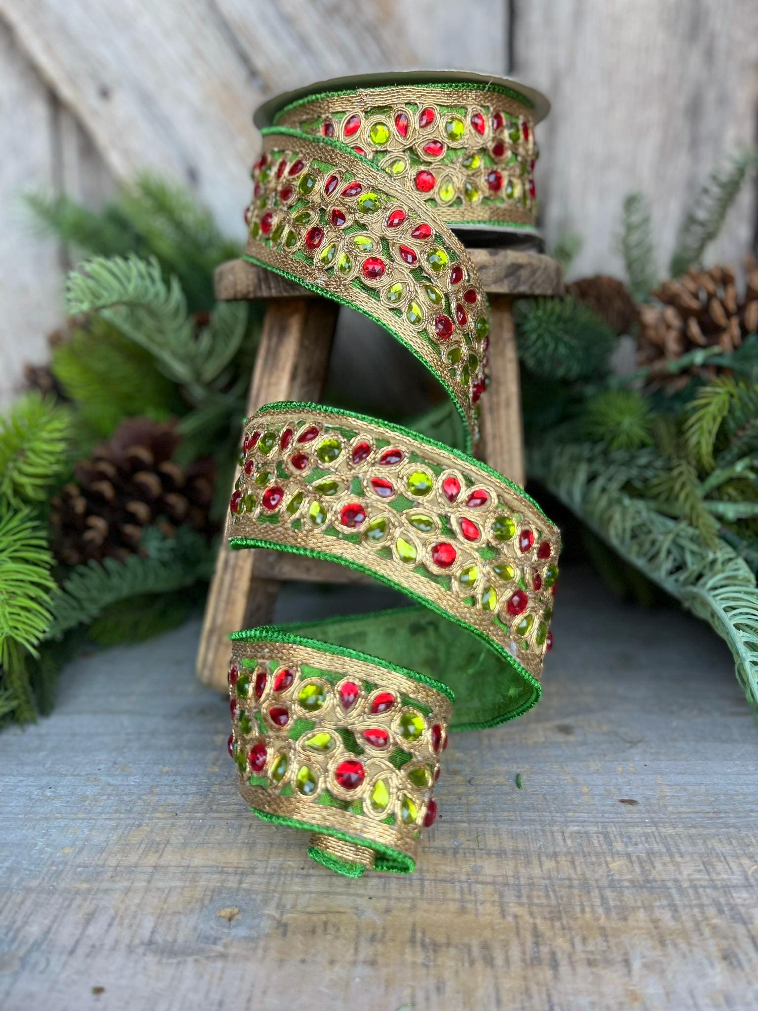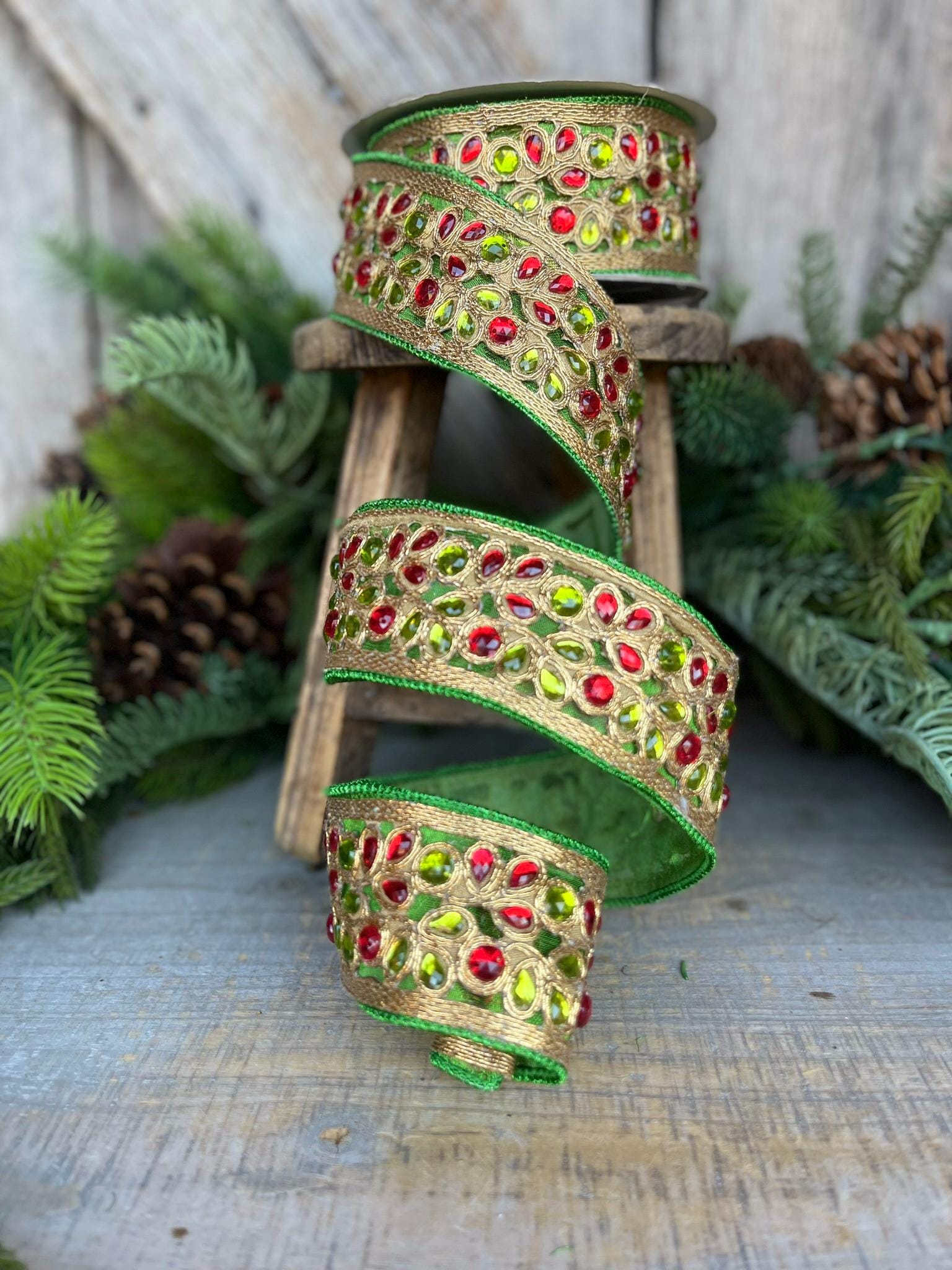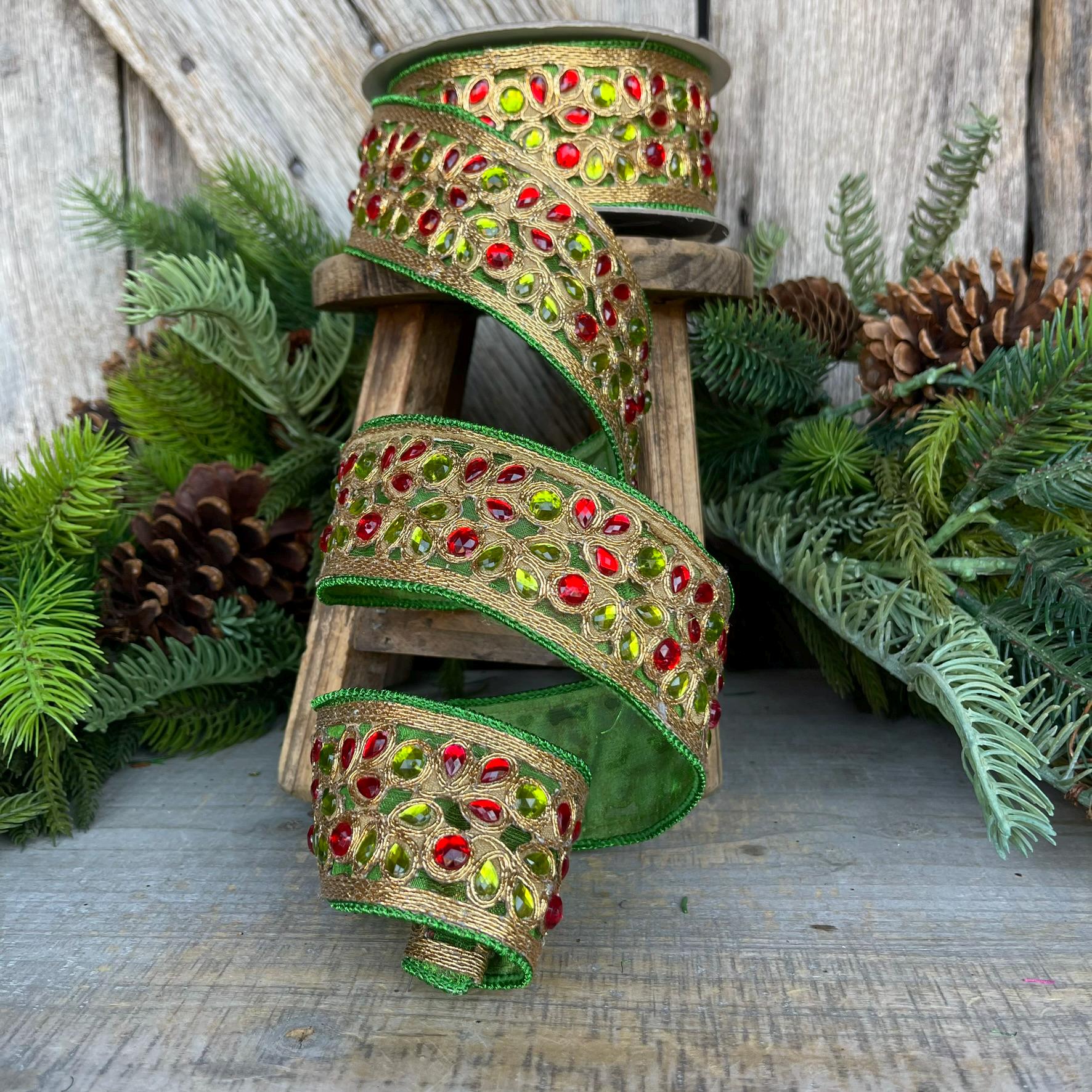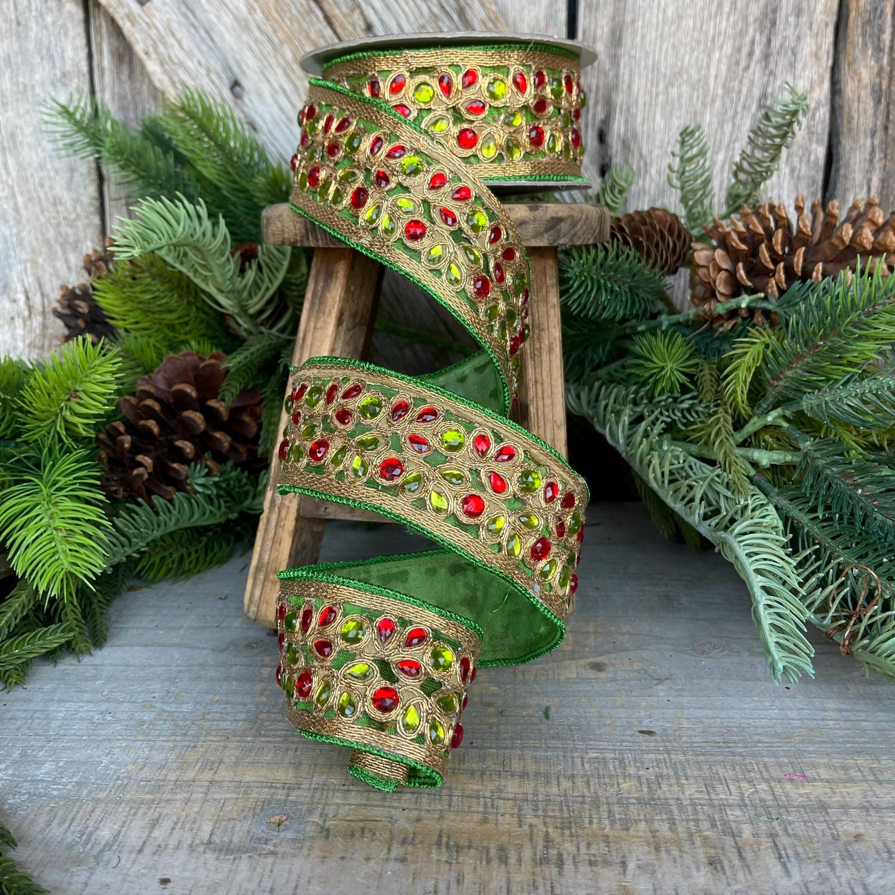 1.5" Red Green Gold Jeweled Ribbon, Farrisilk Ribbon, Jeweled Ribbon, Christmas Ribbon, Jeweled Ribbon, Christmas Ribbon, RG718-48