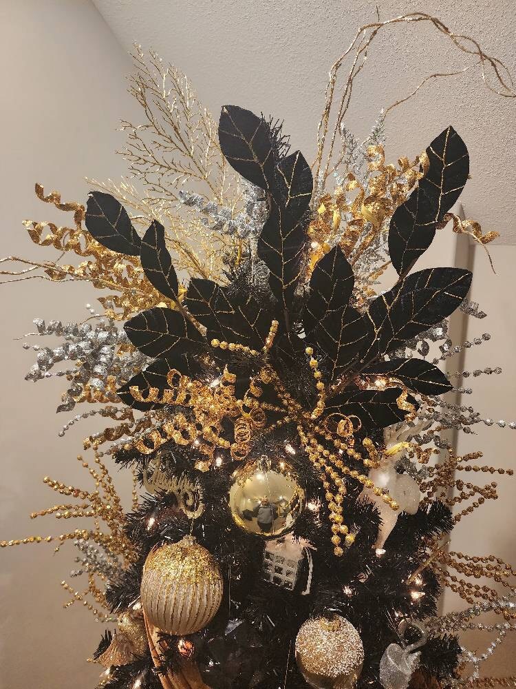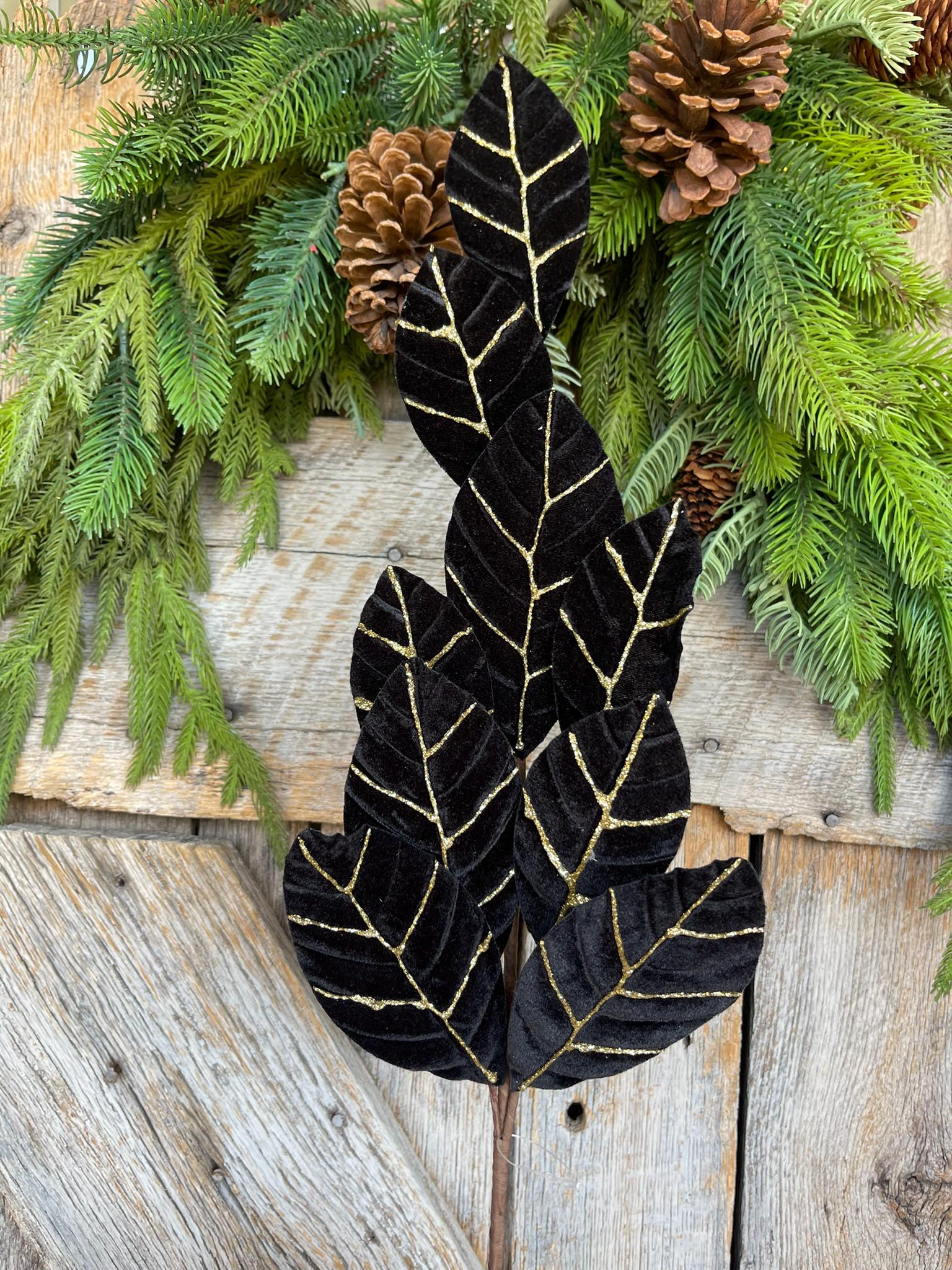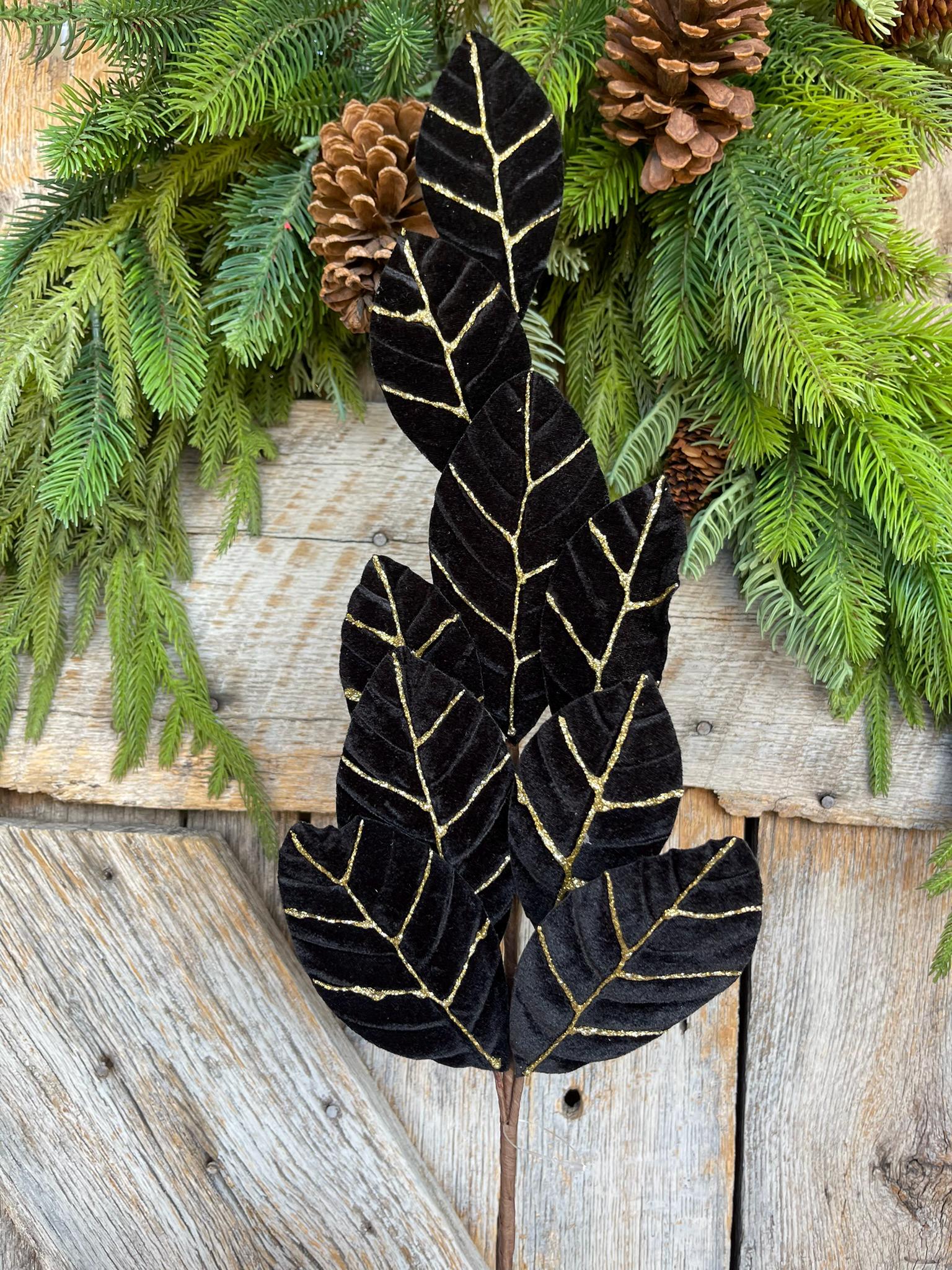 27" Black Velvet Leaf Spray, Black Gold Leaf Spray, Black Floral Spray, Black CHristmas Leaf Spray, Christmas Picks & Stems, XS239098