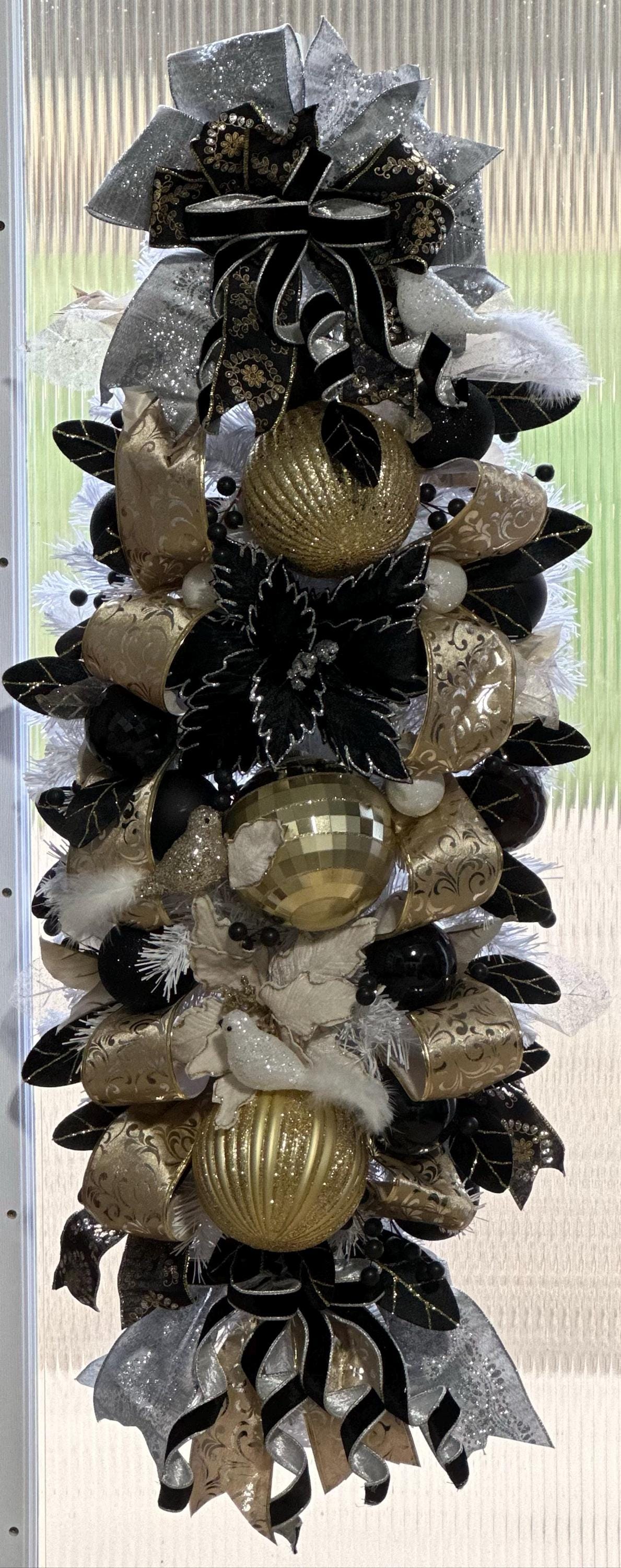 Add a touch of elegance and drama to your holiday décor with our 27" Black Velvet Leaf Spray. This stunning piece features velvety black leaves accented with a luxurious gold shimmer, perfect for creating sophisticated floral arrangements, wreaths, or centerpieces. Its versatile design makes it ideal for Christmas, Halloween, and winter-themed displays, adding a rich, modern flair to any setting. Whether you're decorating a mantel or crafting a custom wreath, this spray is the perfect pick to elevate your space. XS239098