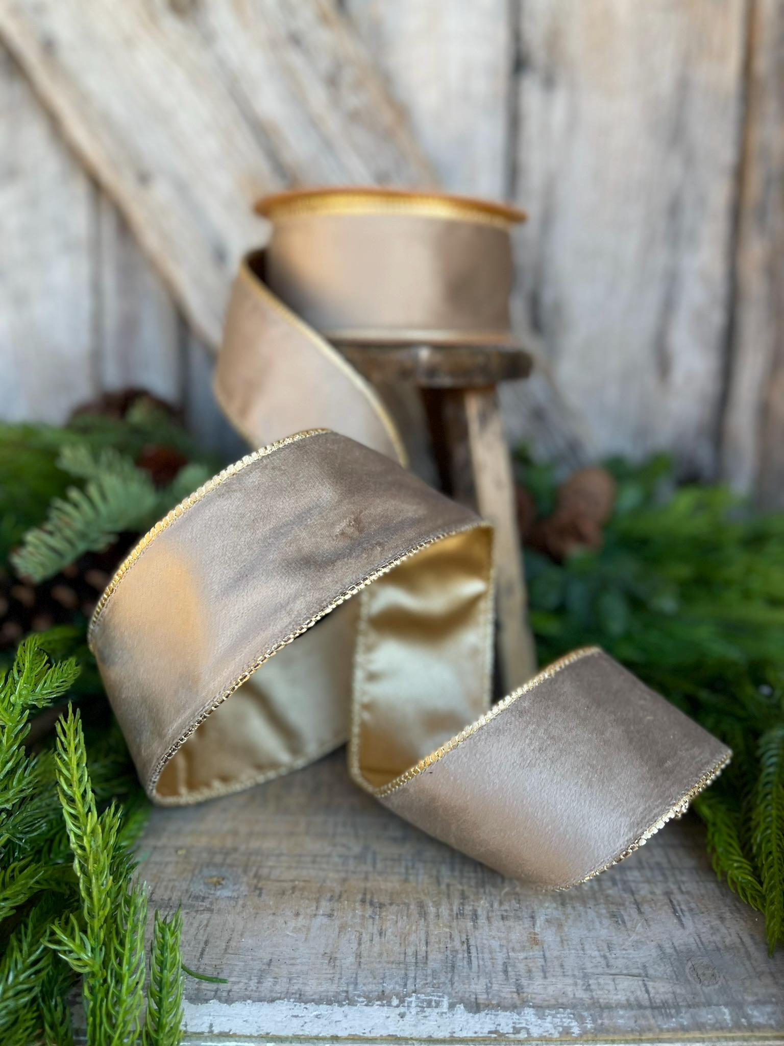 2.5" Mink Brown Velvet RIbbon, Wired Ribbon, Champagne Gold Velvet Ribbon, Christmas Velvet Ribbon, Fall Ribbon, Designer Velvet Ribbon