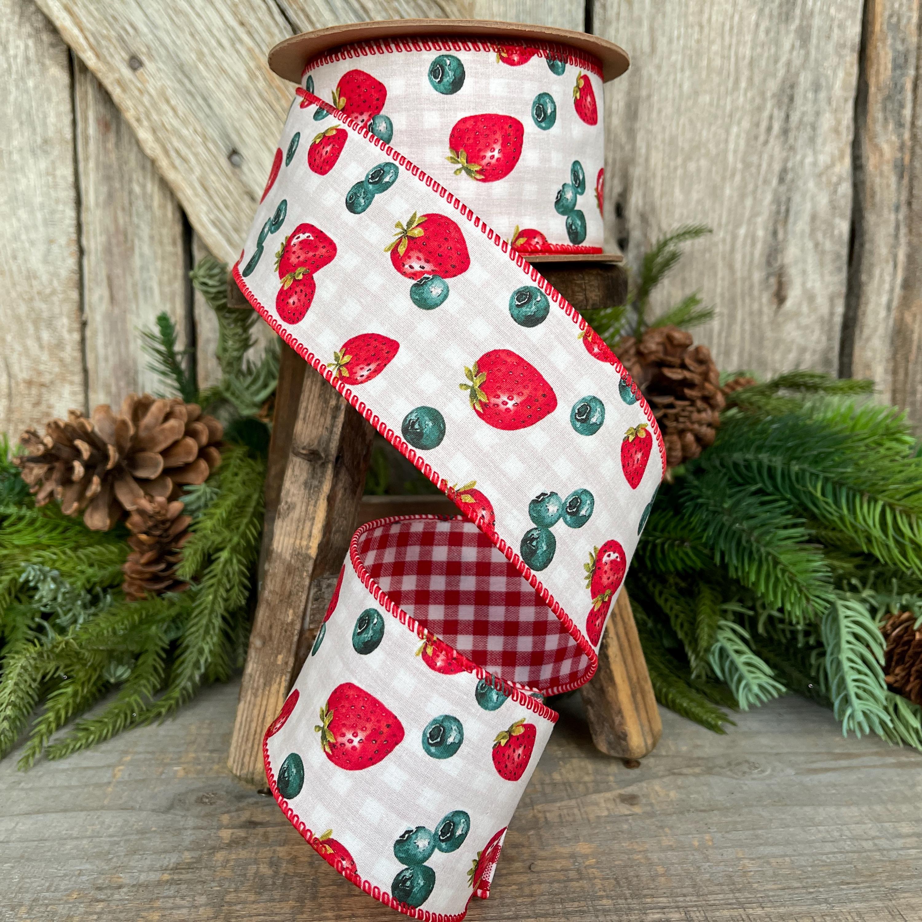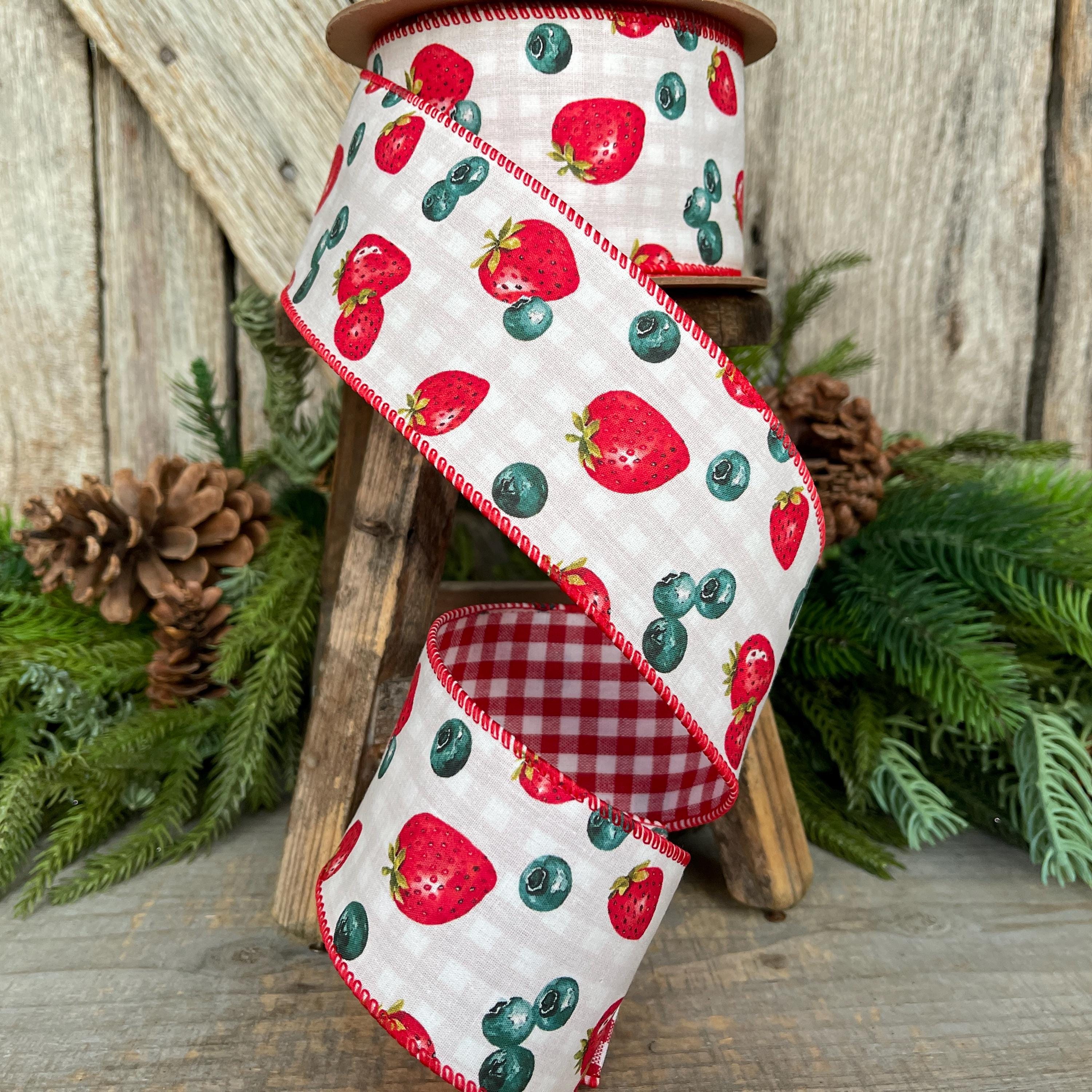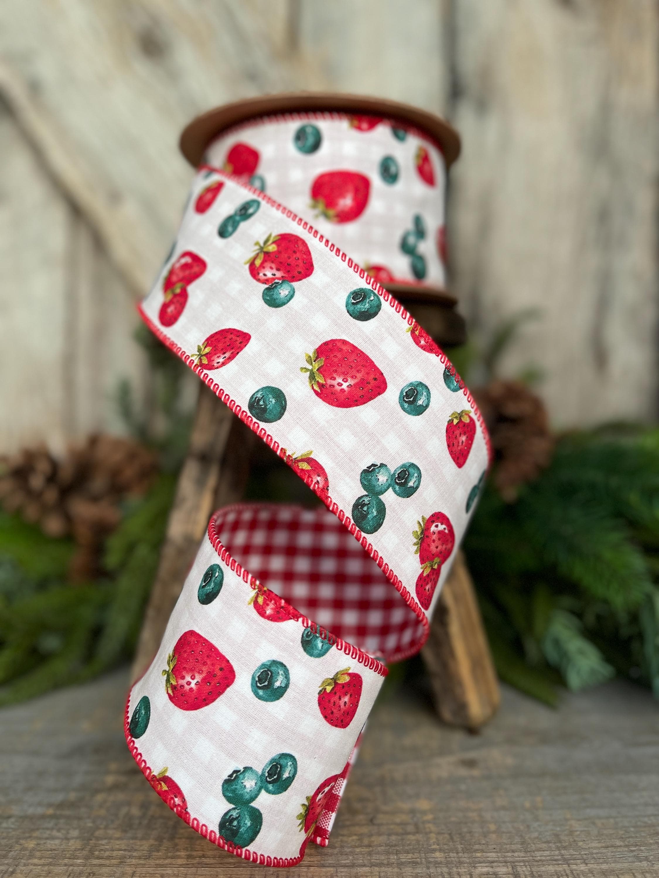 2.5" Strawberry Blueberry Ribbon, Wired Ribbon, Spring Ribbon, Summer Ribbon, Strawberry Decor, Red Blue Ribbon, 4401W-250-63E
