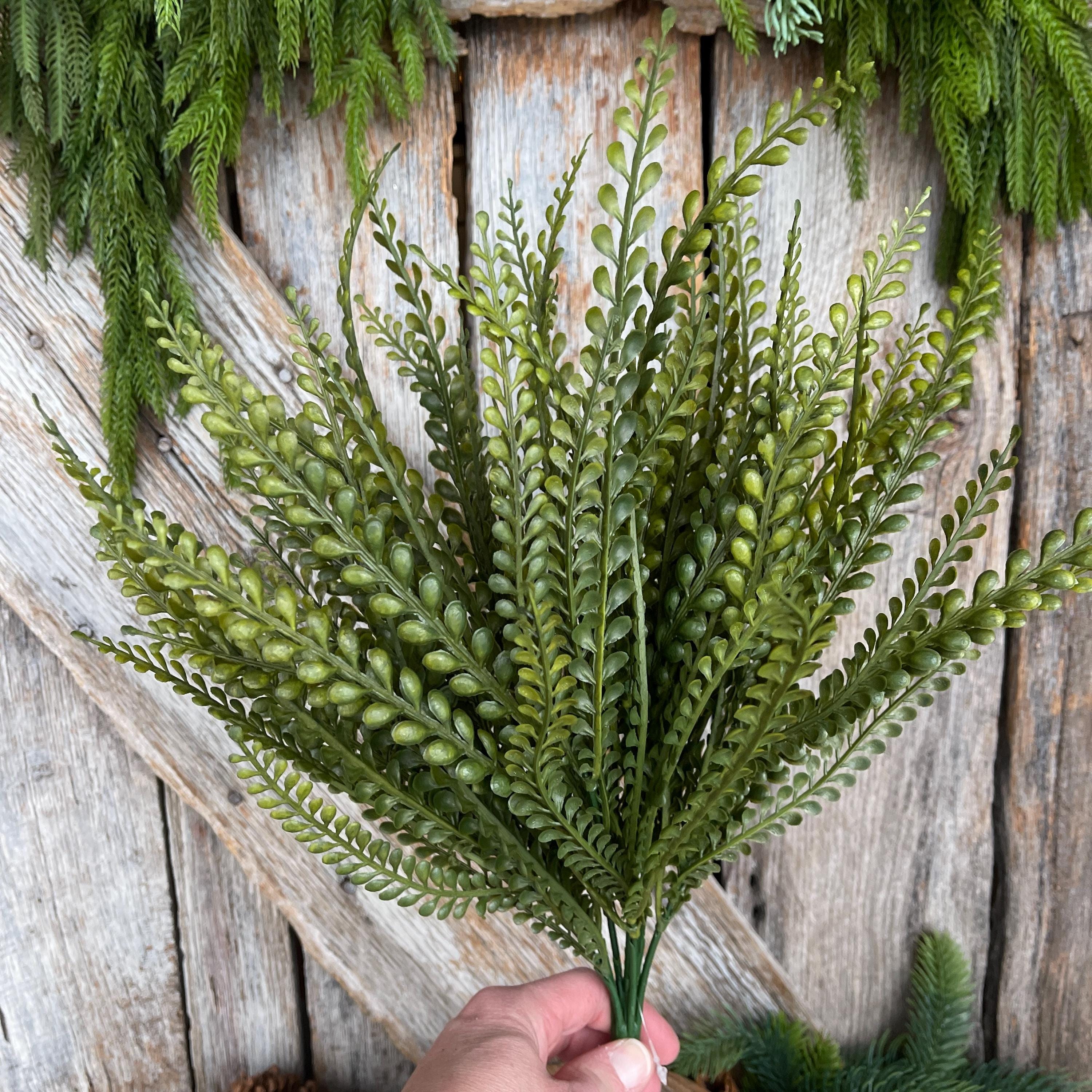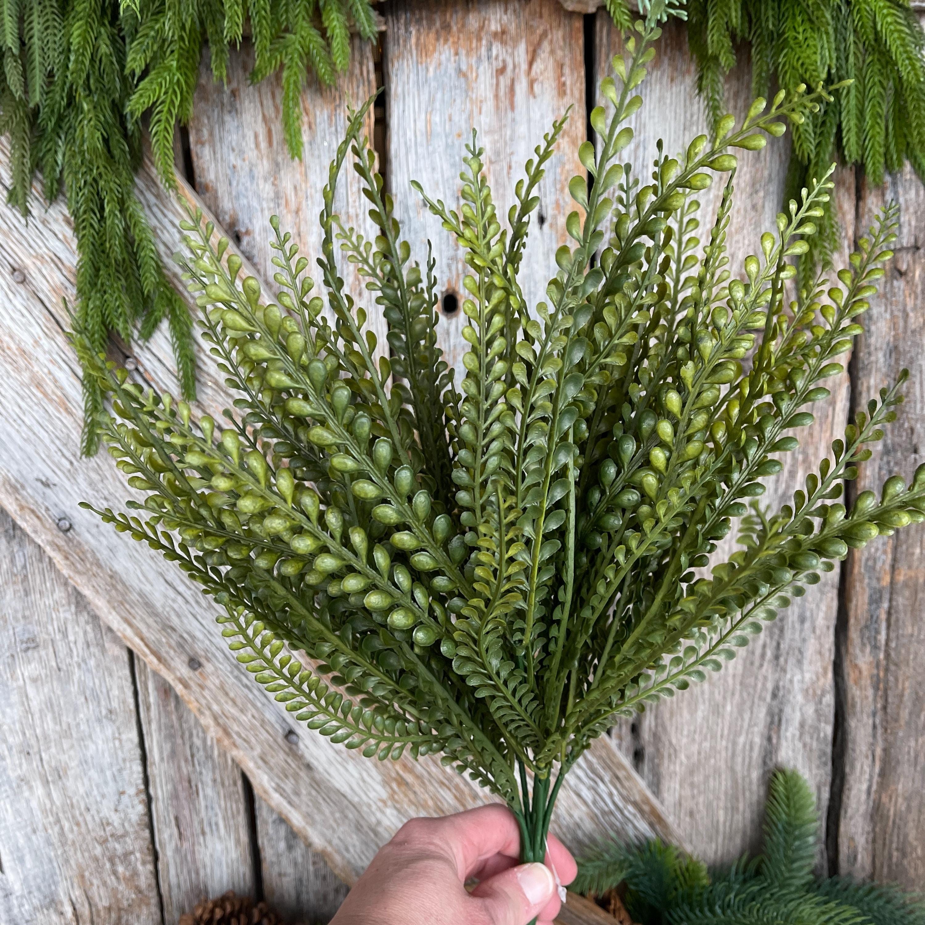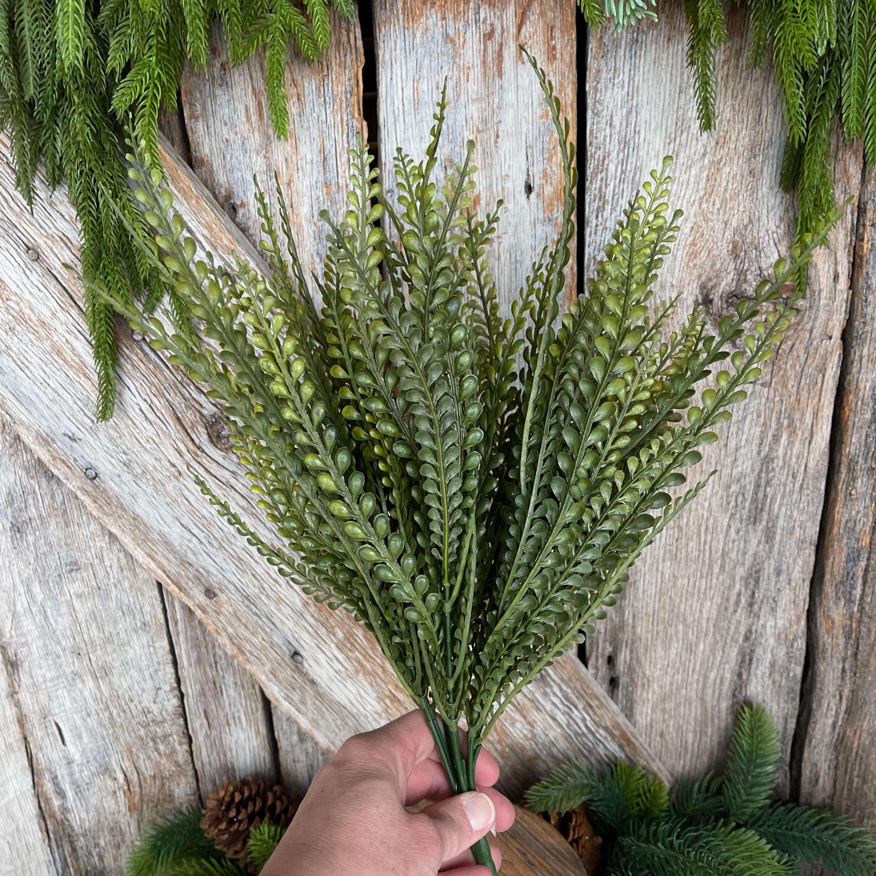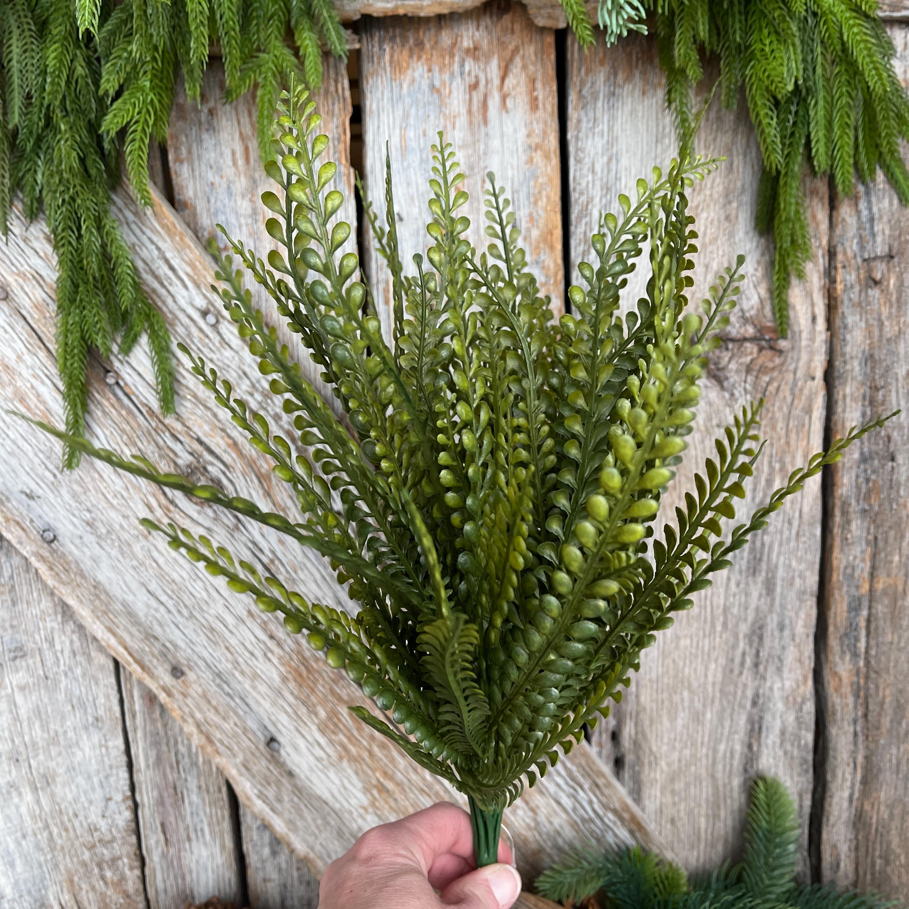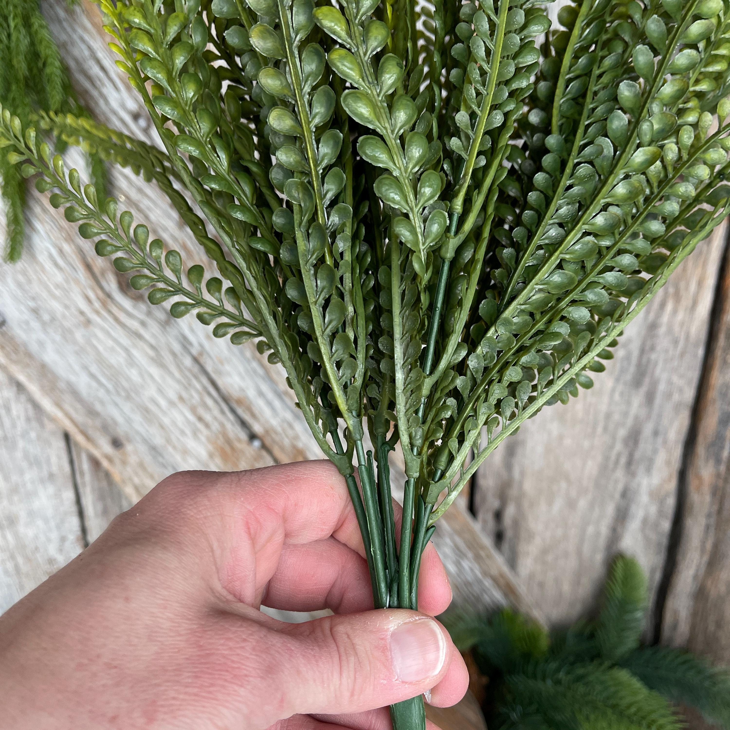 This artificial greenery bush features finely detailed beaded leaves inspired by button fern foliage, offering a soft, organic texture that blends beautifully with florals, ribbons, and decorative accents.
