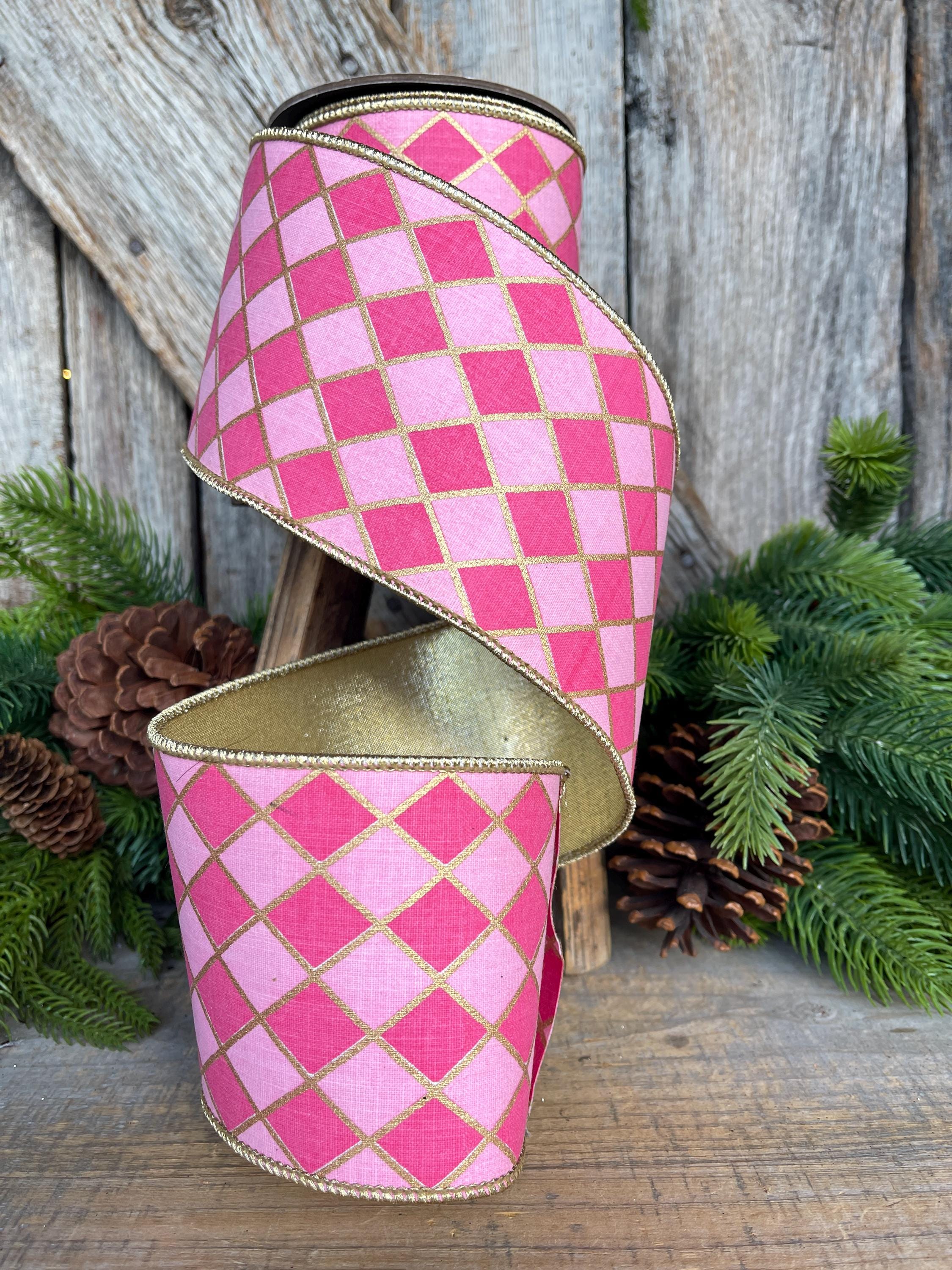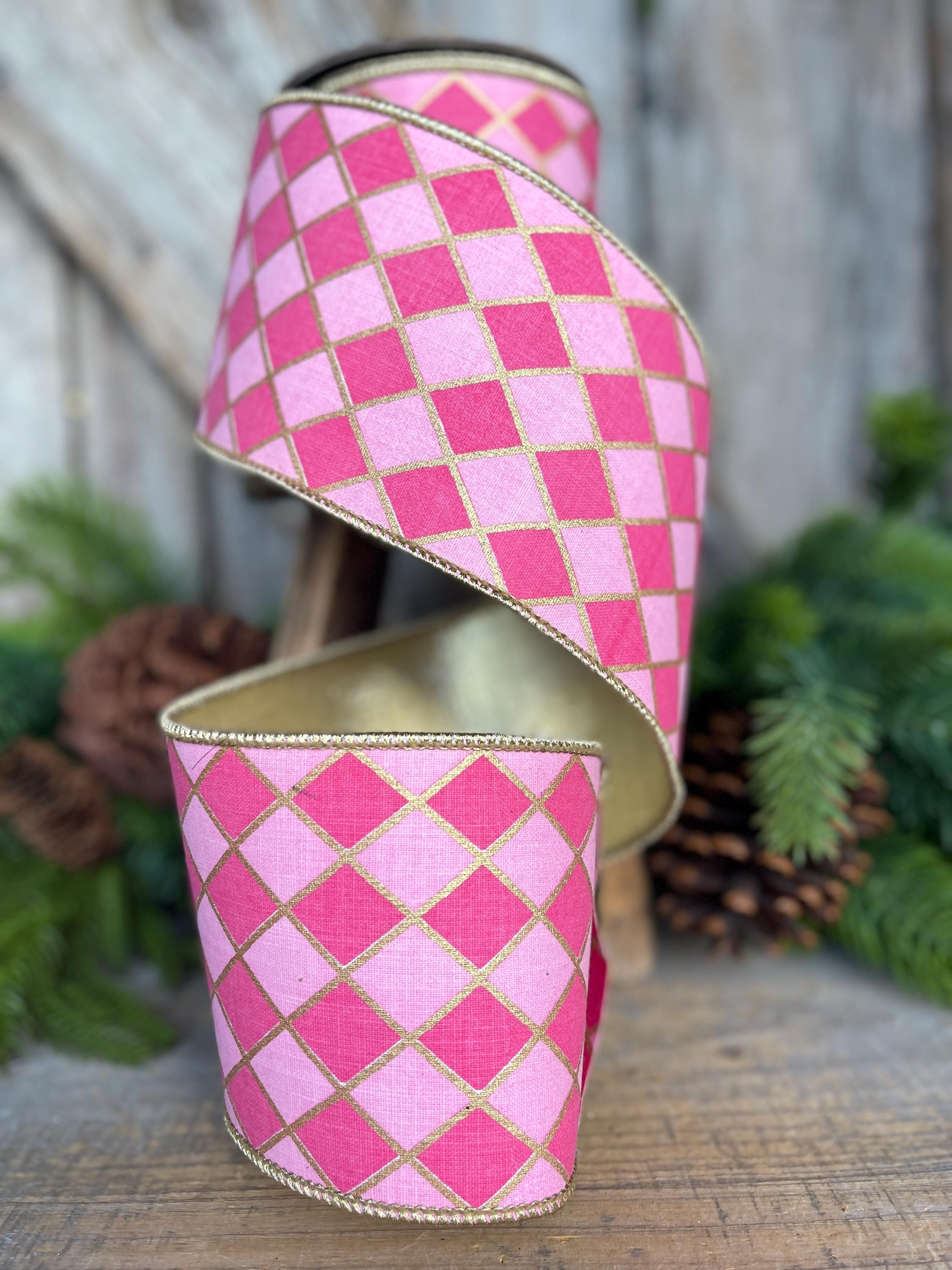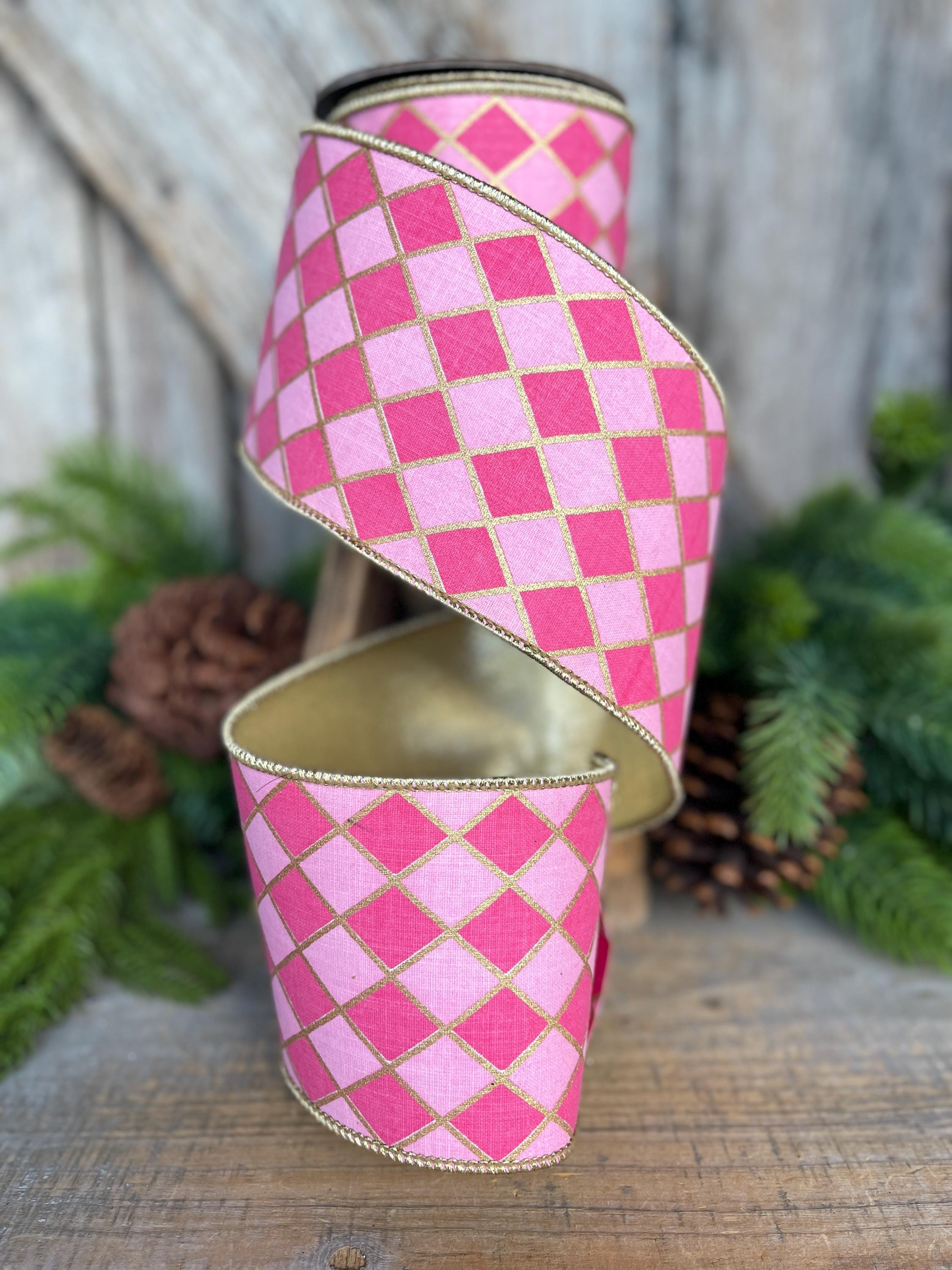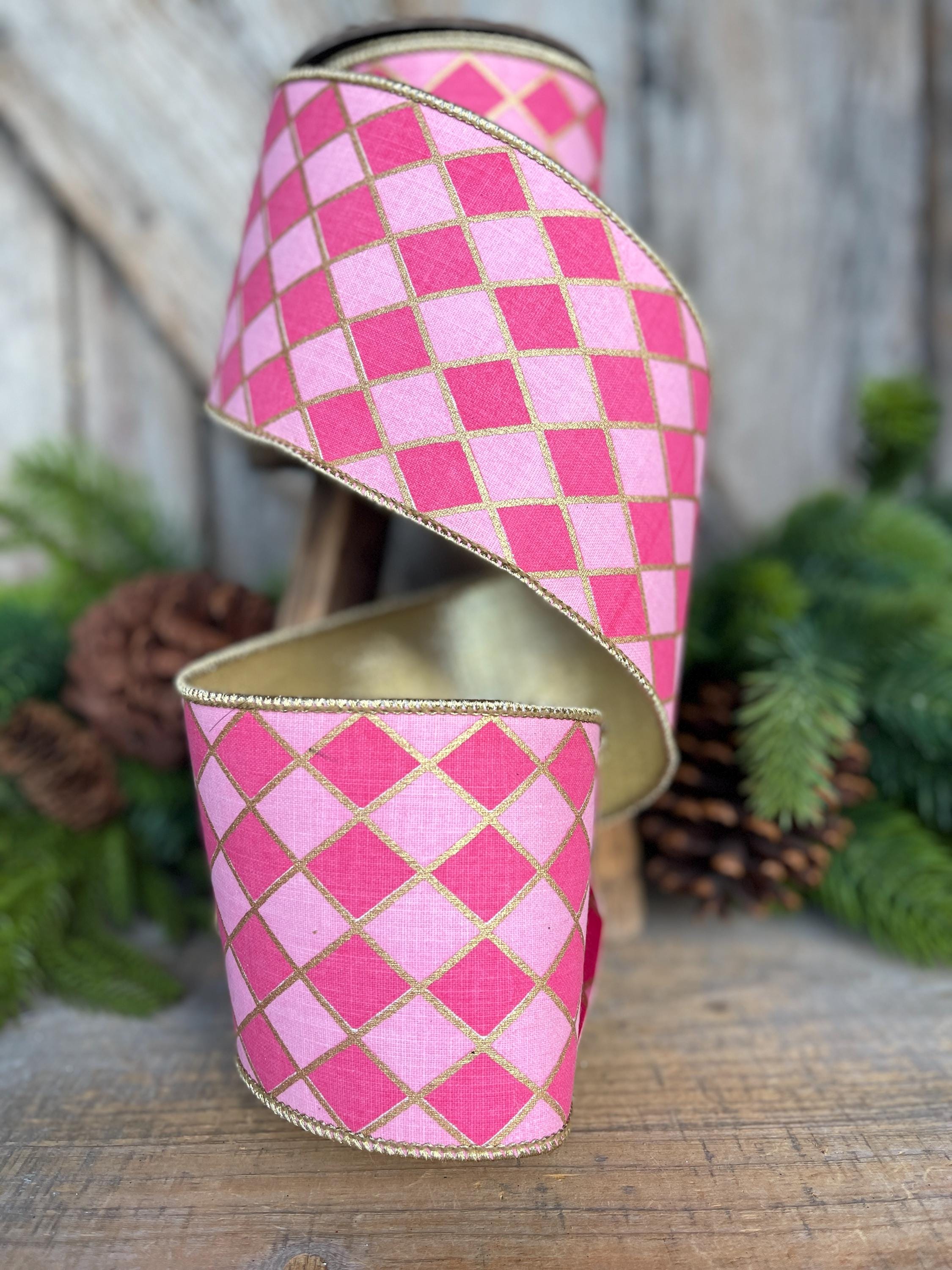 Add a playful pop of color to your holiday crafts and seasonal décor with this stunning 4-inch wired ribbon! Featuring a vibrant pink harlequin diamond pattern in alternating light and dark shades, this ribbon is accented with elegant gold glitter outlines and a metallic gold backing. It's the perfect blend of whimsical and classy.