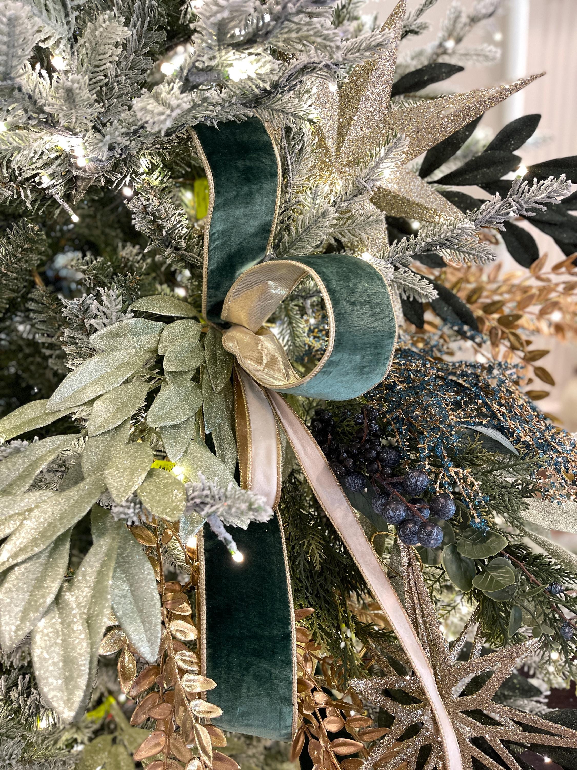This shade of green is absolutely stunning! As you can tell, it reflects light so well and almost glows! This green velvet has a light gold metallic gold backing. This is the perfect green ribbon to use on a green tree because it will POP off your tree while other green ribbons may blend in with a green tree. It's just stunning ribbon!