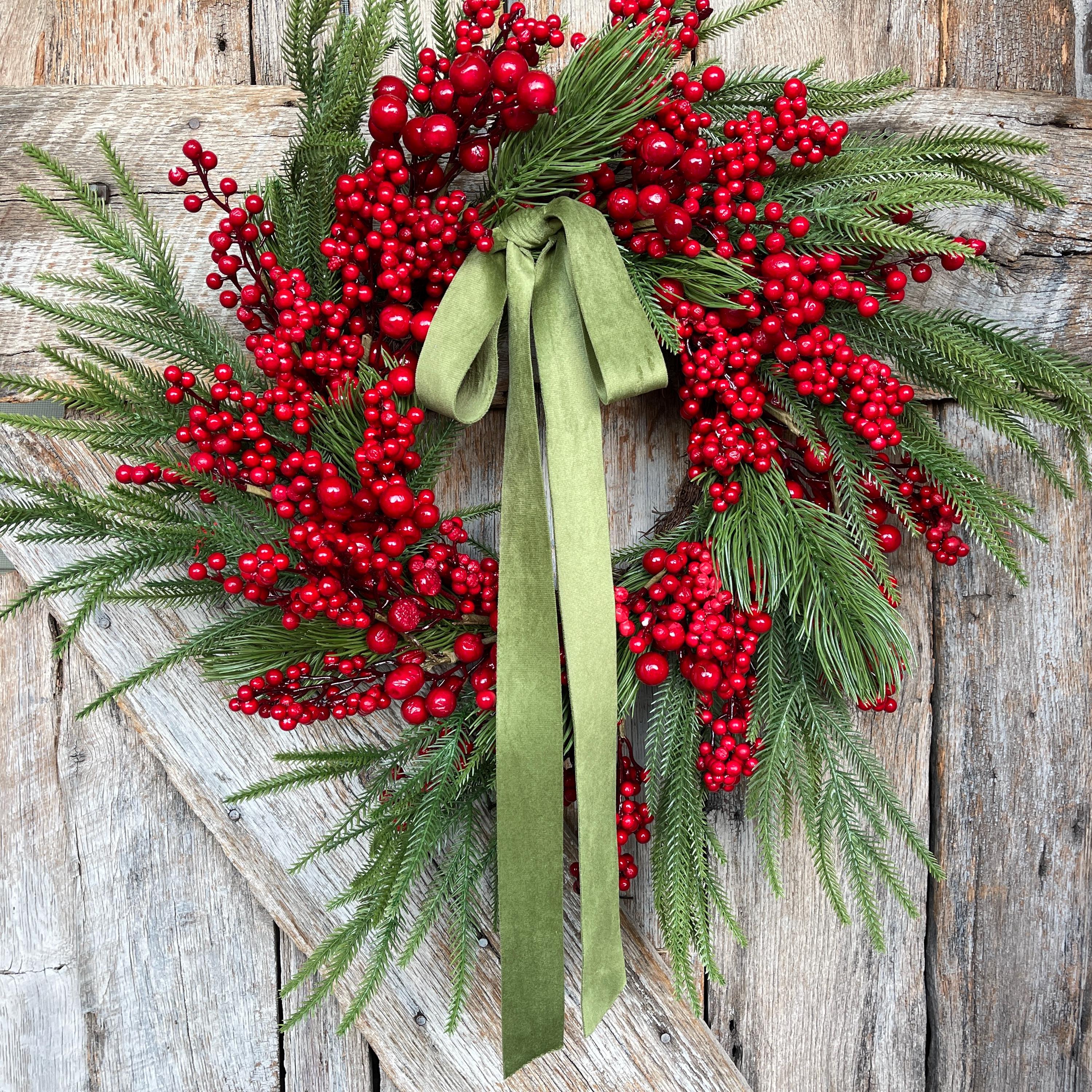 This festive 24-inch Christmas wreath is designed with lush pine greenery and vibrant red berries for a classic holiday look. A soft green velvet ribbon bow completes the design, adding a touch of elegance and timeless charm.