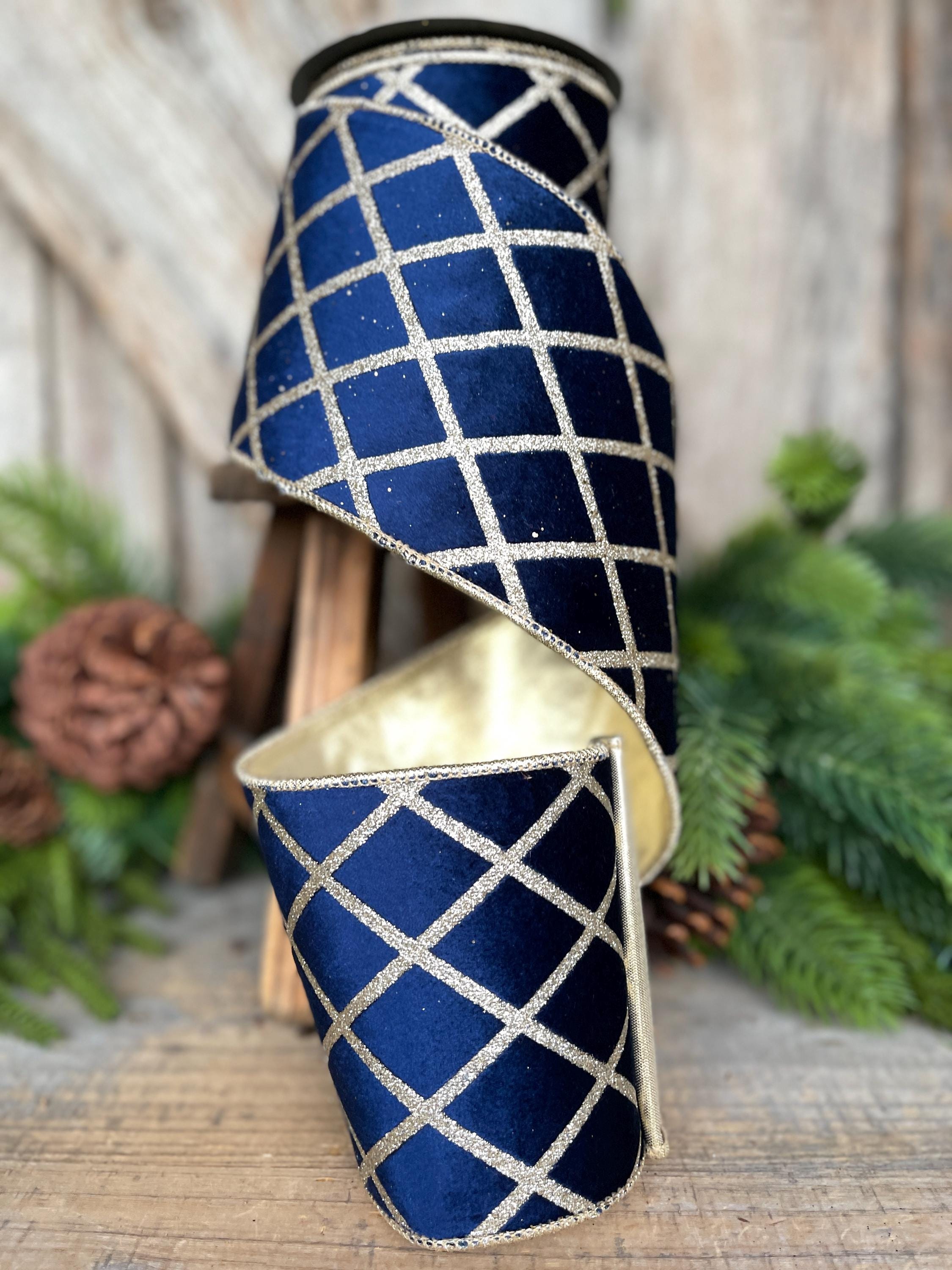 Add a touch of luxury to your holiday decorating with this stunning Navy Blue and Gold Lattice Velvet Ribbon. The deep navy velvet background is accented with a shimmering gold glitter lattice pattern and finished with wired edges for perfect shaping. The soft gold backing gives this ribbon a rich, elegant look from every angle.