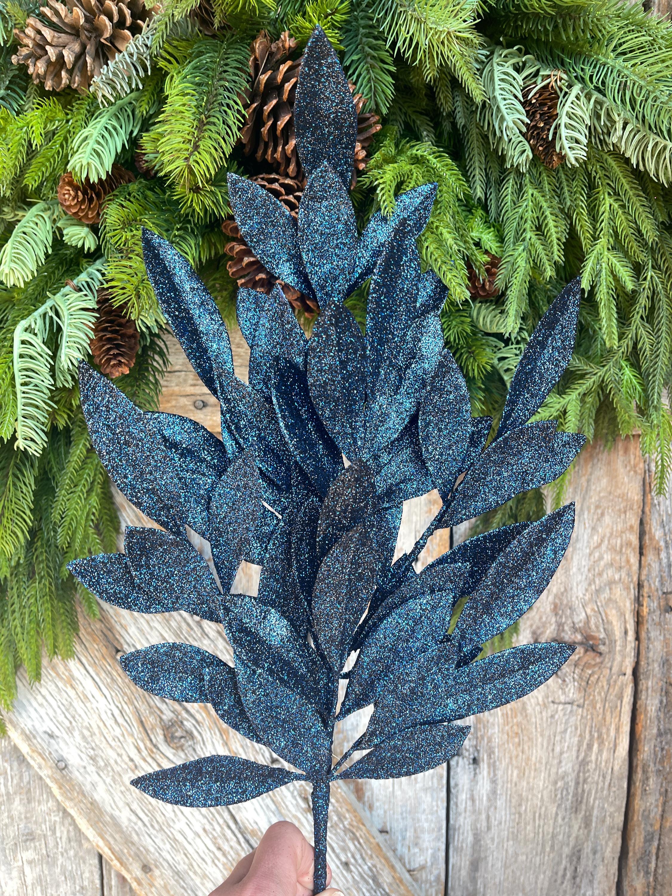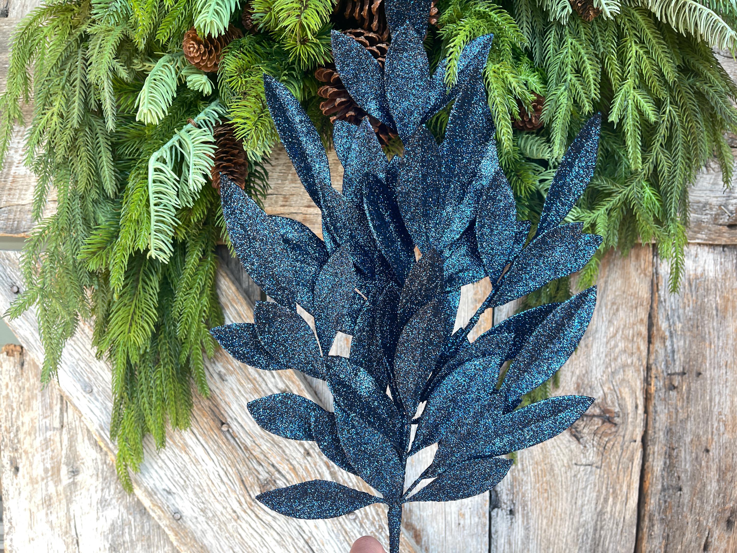 23" Navy Blue Bay Leaf Glitter Spray, Burgundy Blue Spray, Christmas Leaf Spray