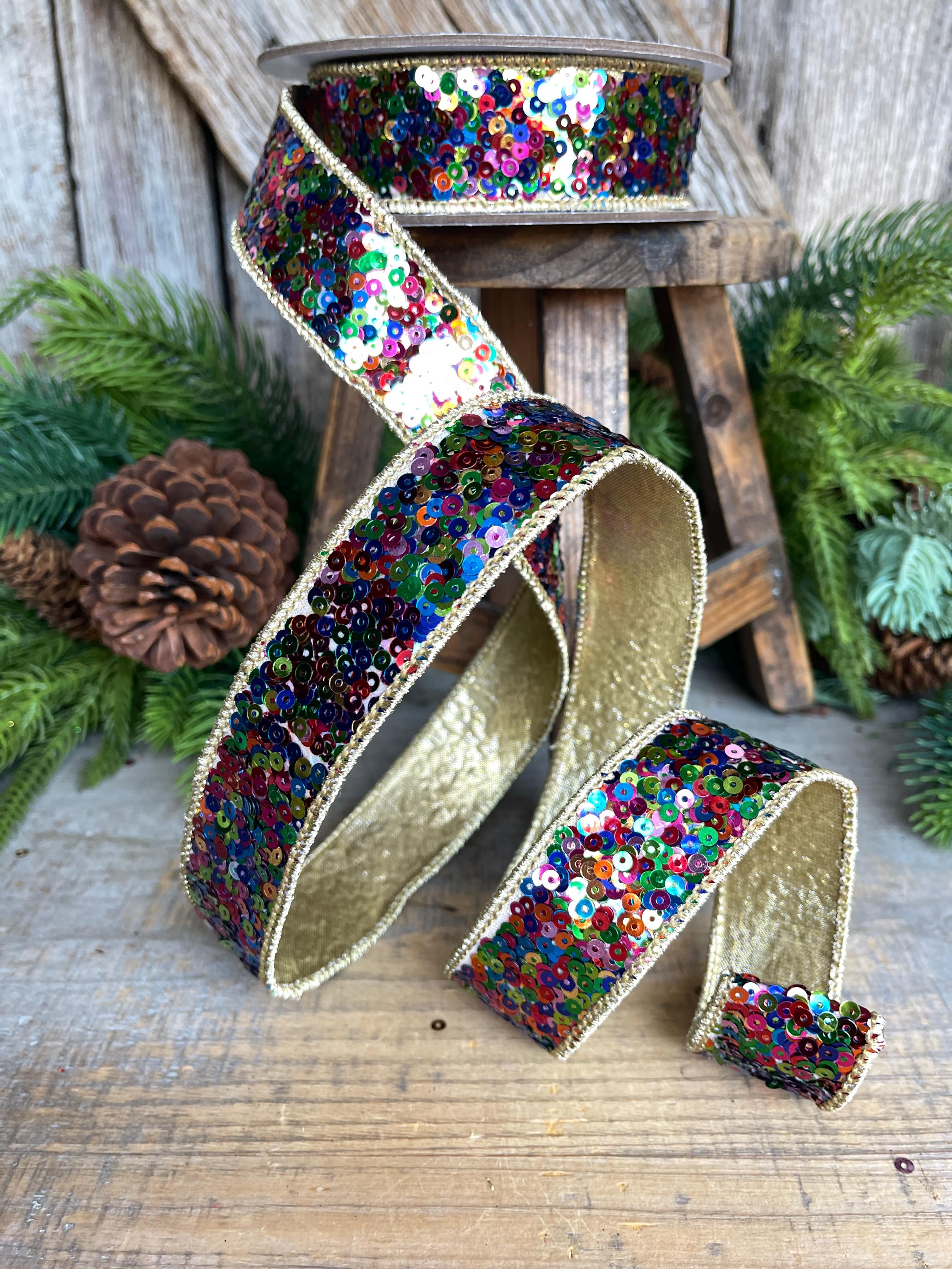 Bring instant sparkle to your holiday décor with this 1" multi-colored sequin ribbon! This dazzling ribbon features shimmering rainbow sequins adhered to a gold fabric backing with wired edges, making it easy to shape perfect bows and accents.