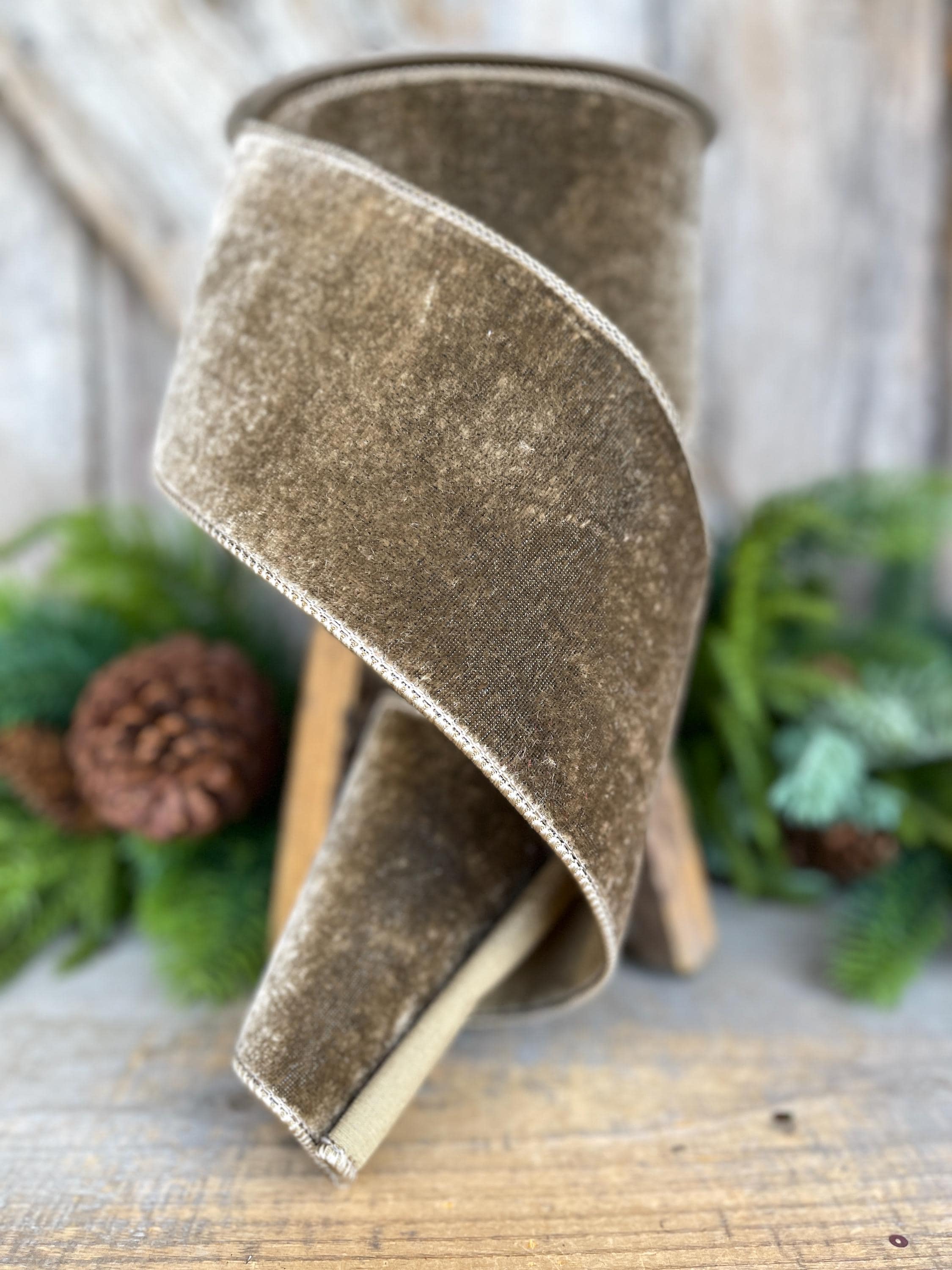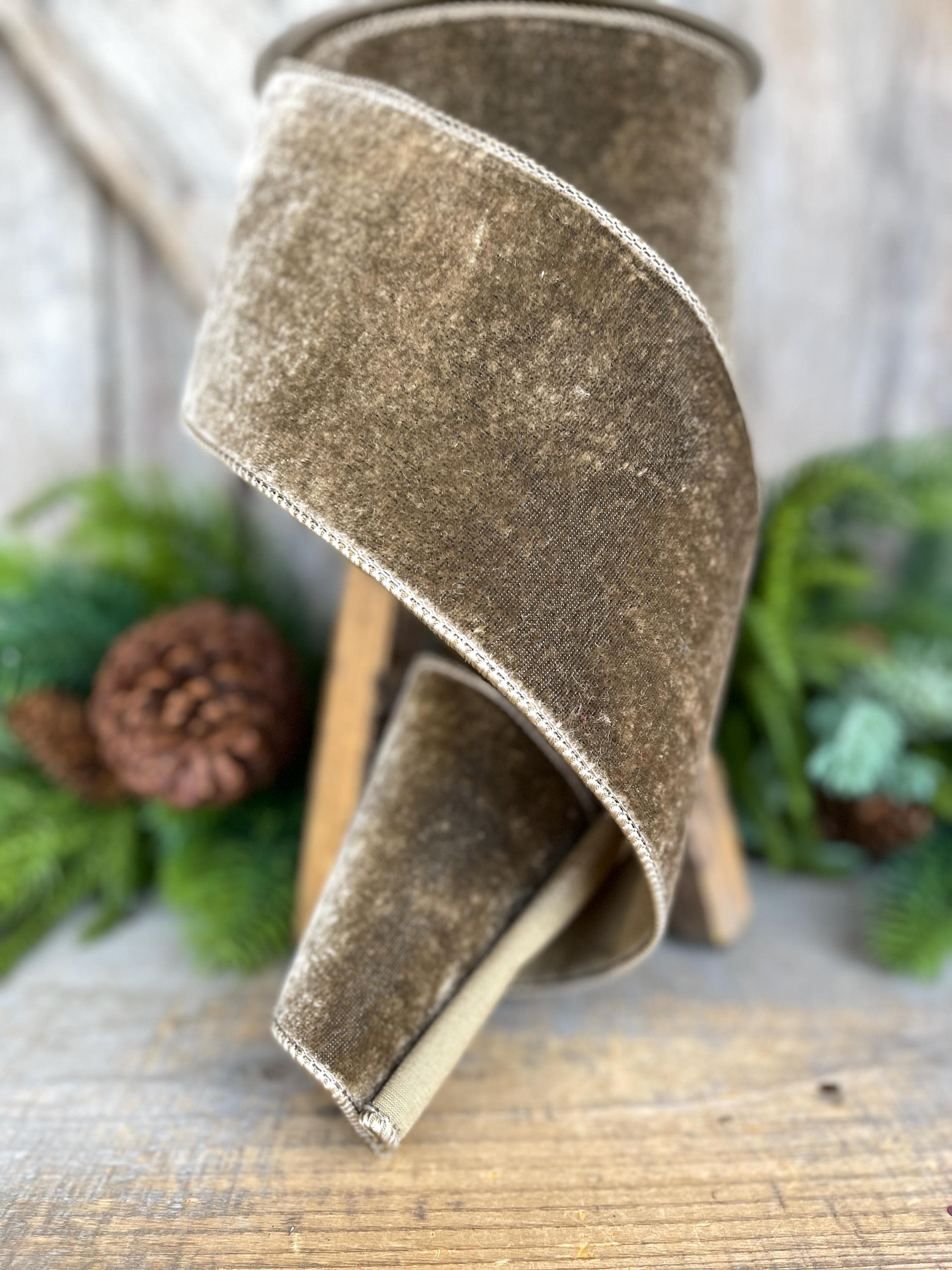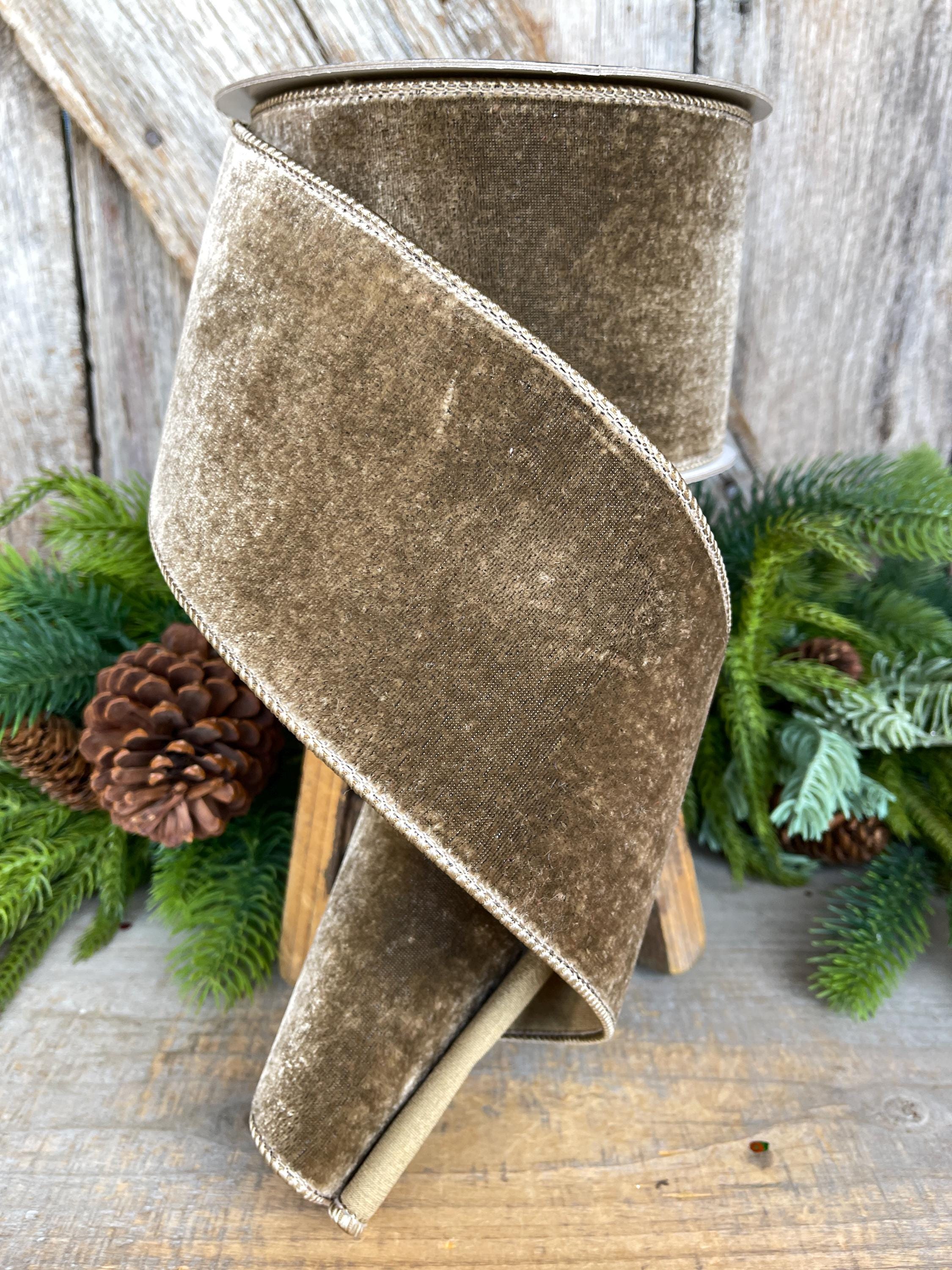 Features a lush mink colored velvet. Ribbon is constructed with thick, wired edge and is fused with a secondary fabric to provide shape and structure.