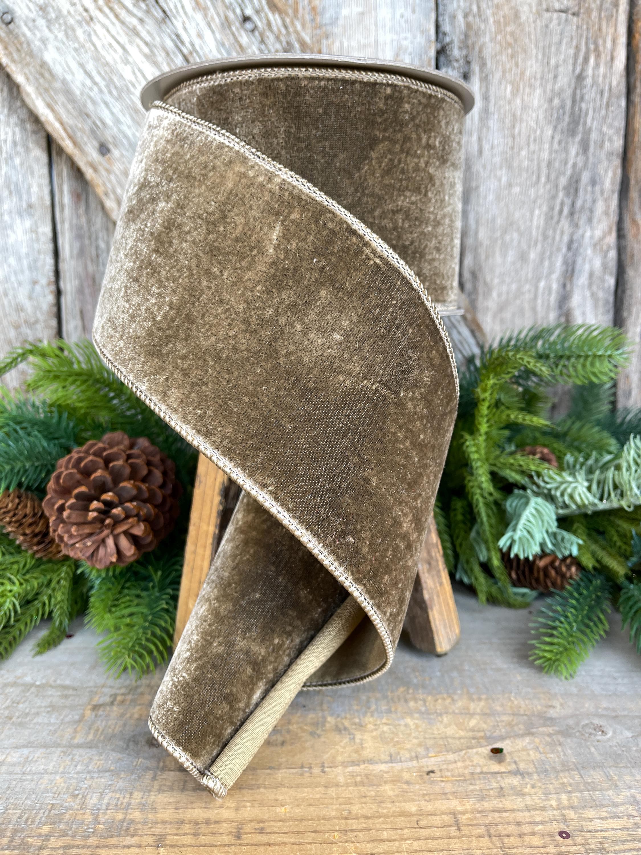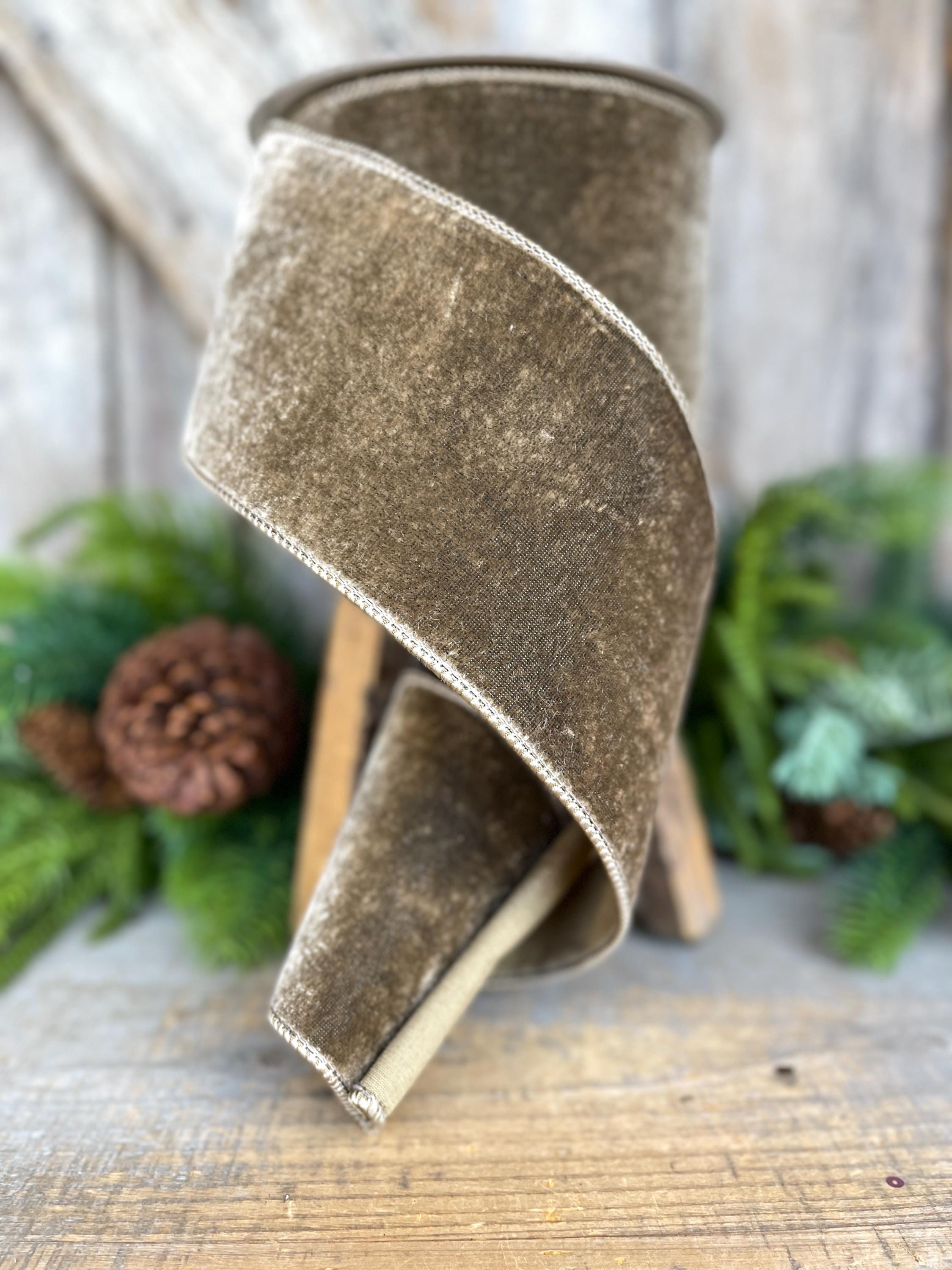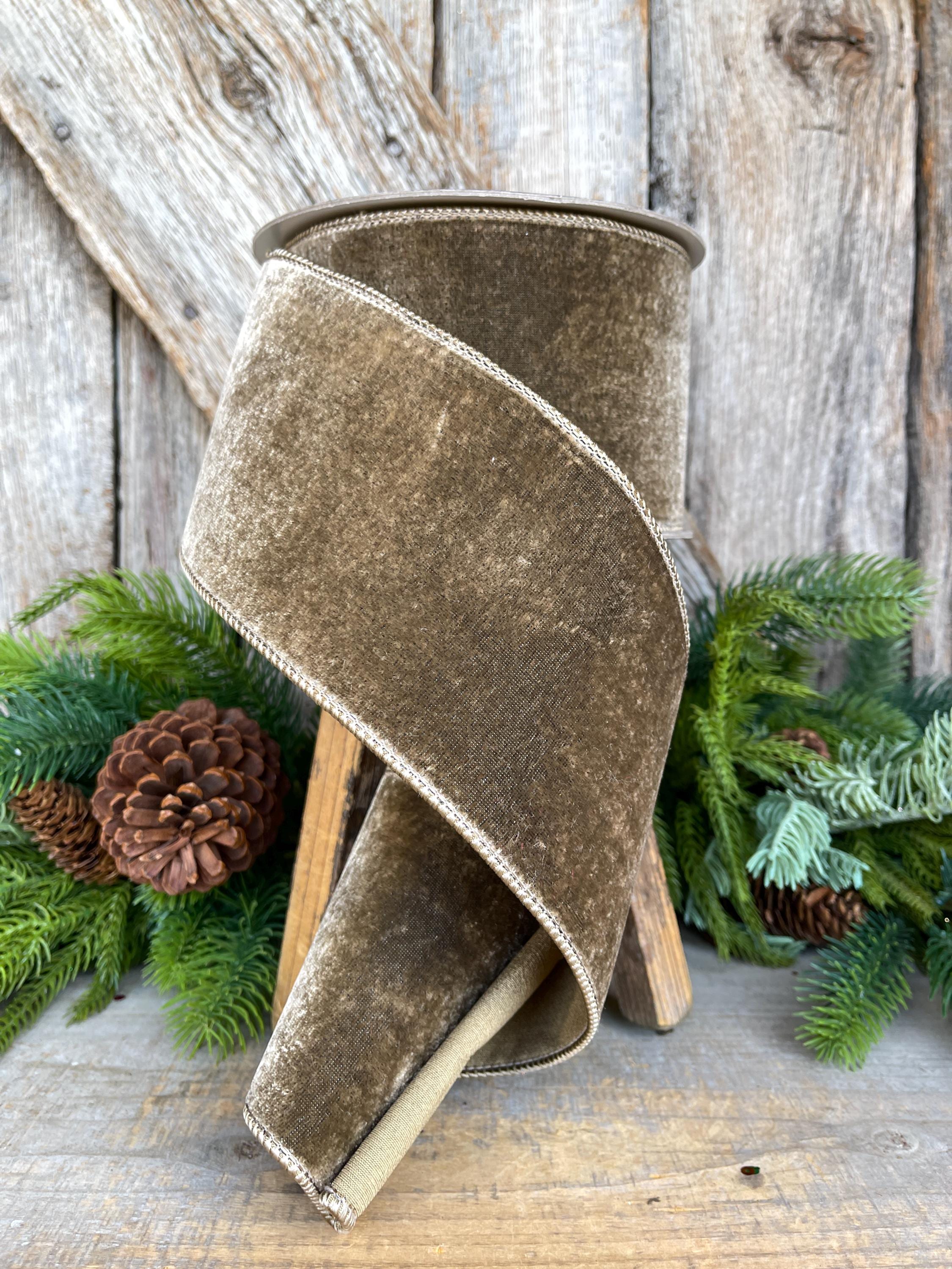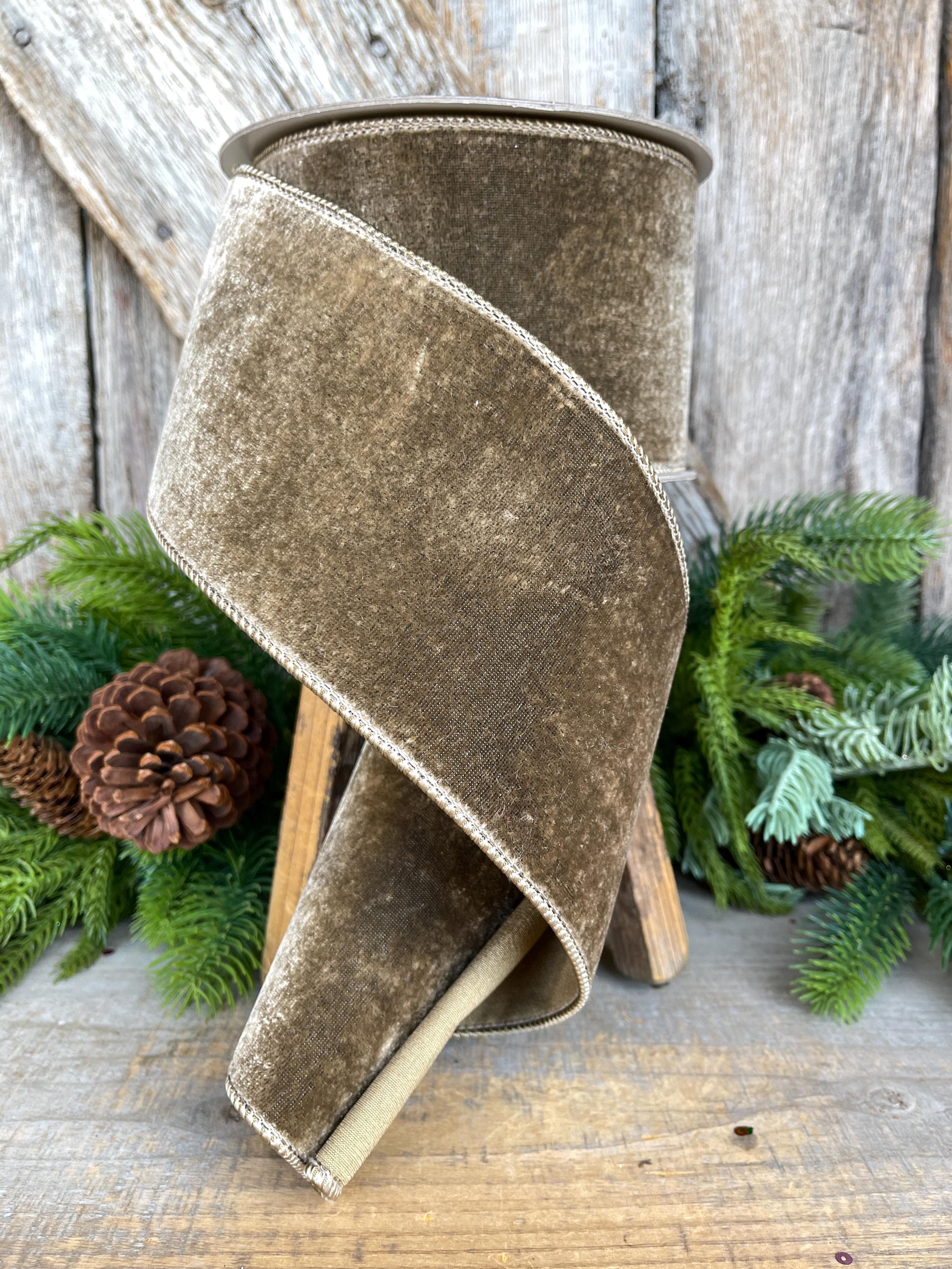 Features a lush mink colored velvet. Ribbon is constructed with thick, wired edge and is fused with a secondary fabric to provide shape and structure.