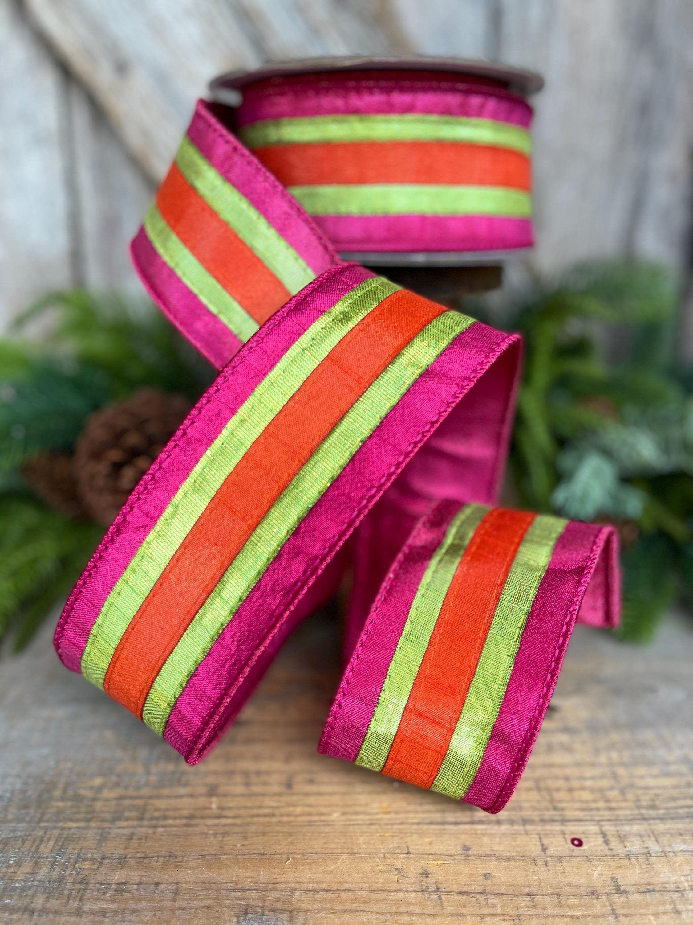 2.5" Christmas Striped Ribbon, Hot PInk Orange Ribbon, Farrisilk ribbon, 2.5" x 10yds, Classic Stripes, RK886-08