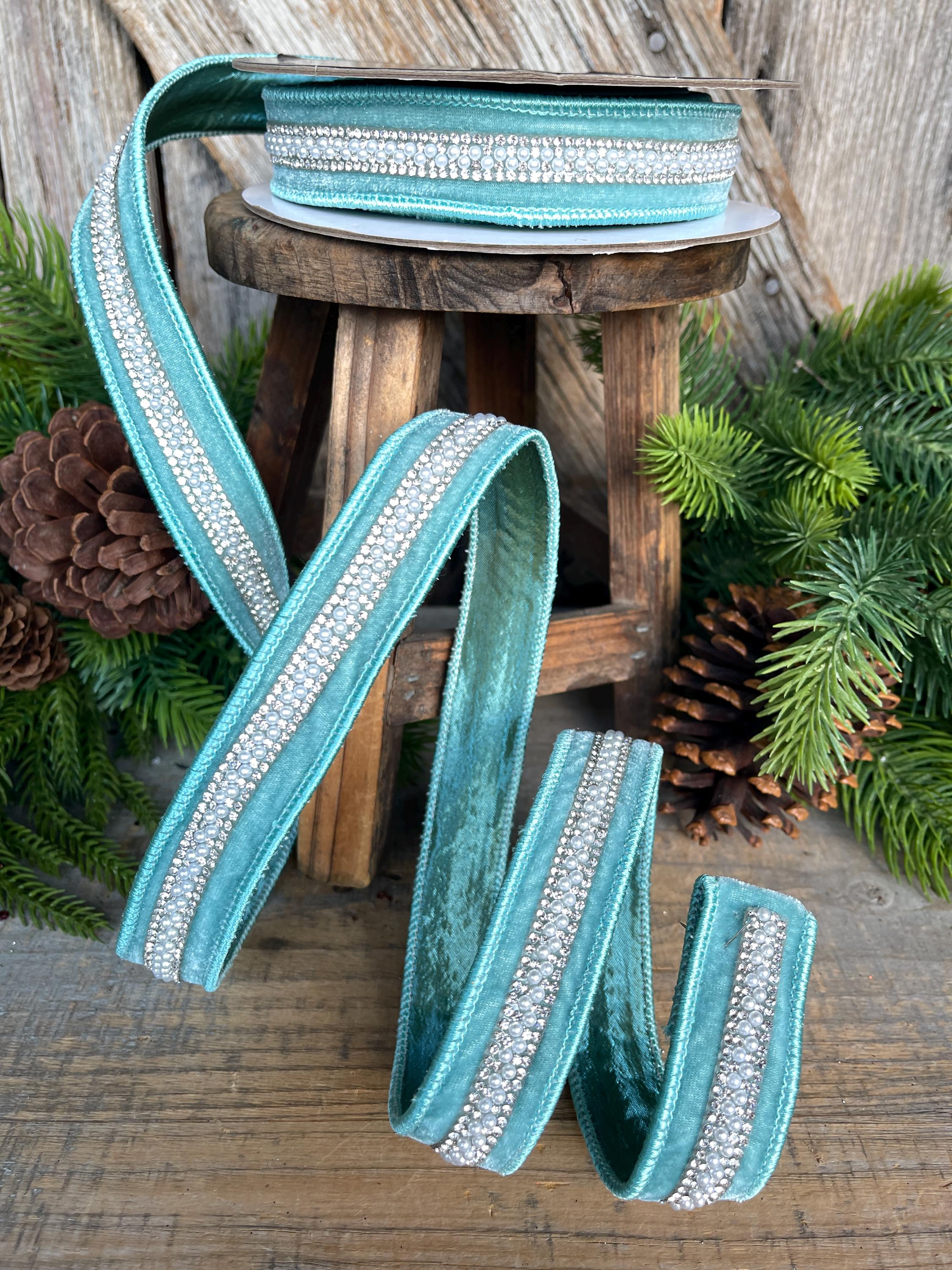 1" Teal Velvet with jewel and pearl stripe, Teal Christmas Ribbon, Designer RIbbon