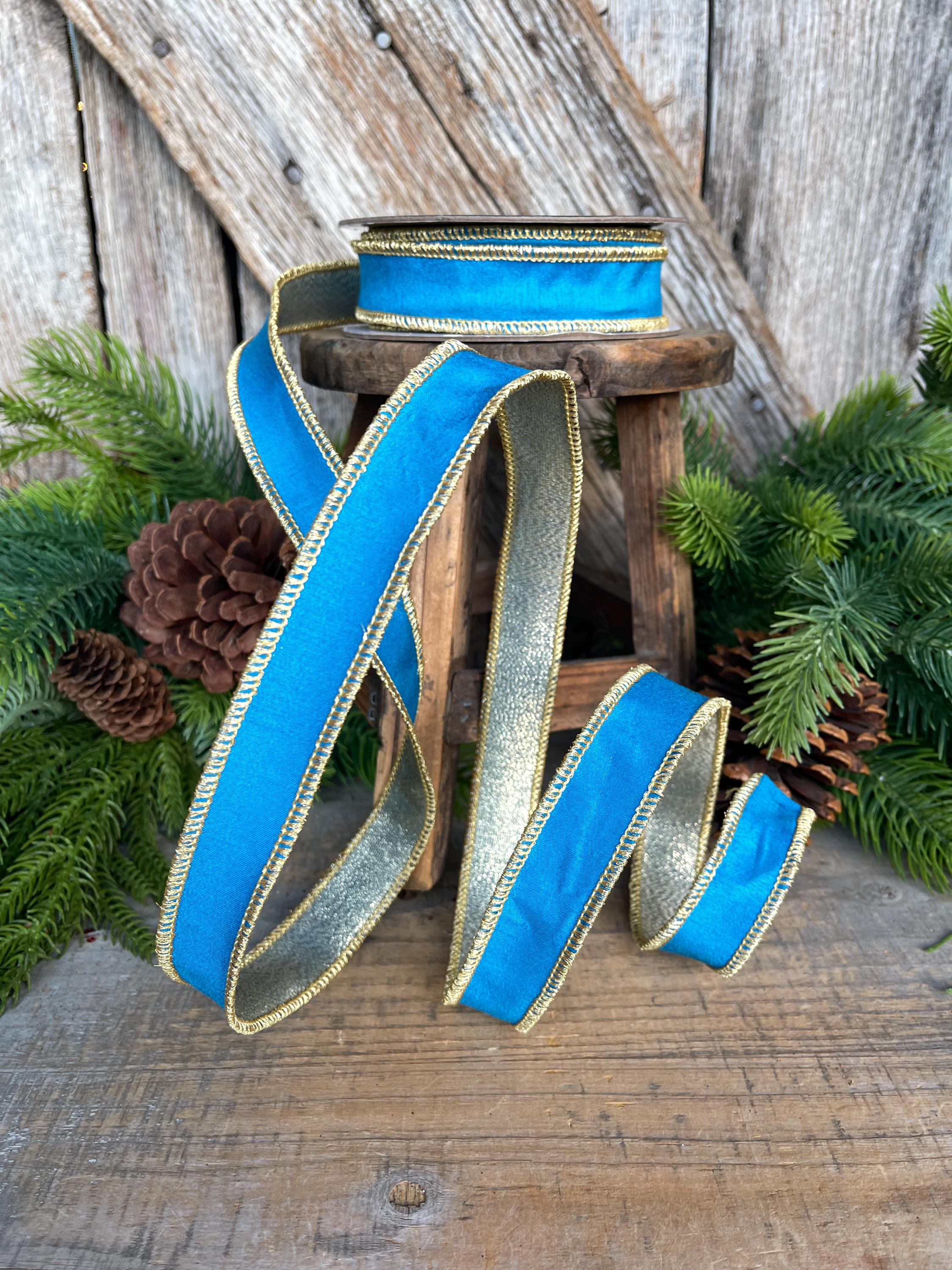 1" Blue Gold Ribbon, Blue Christmas Ribbon, Nancy Brown Ribbon