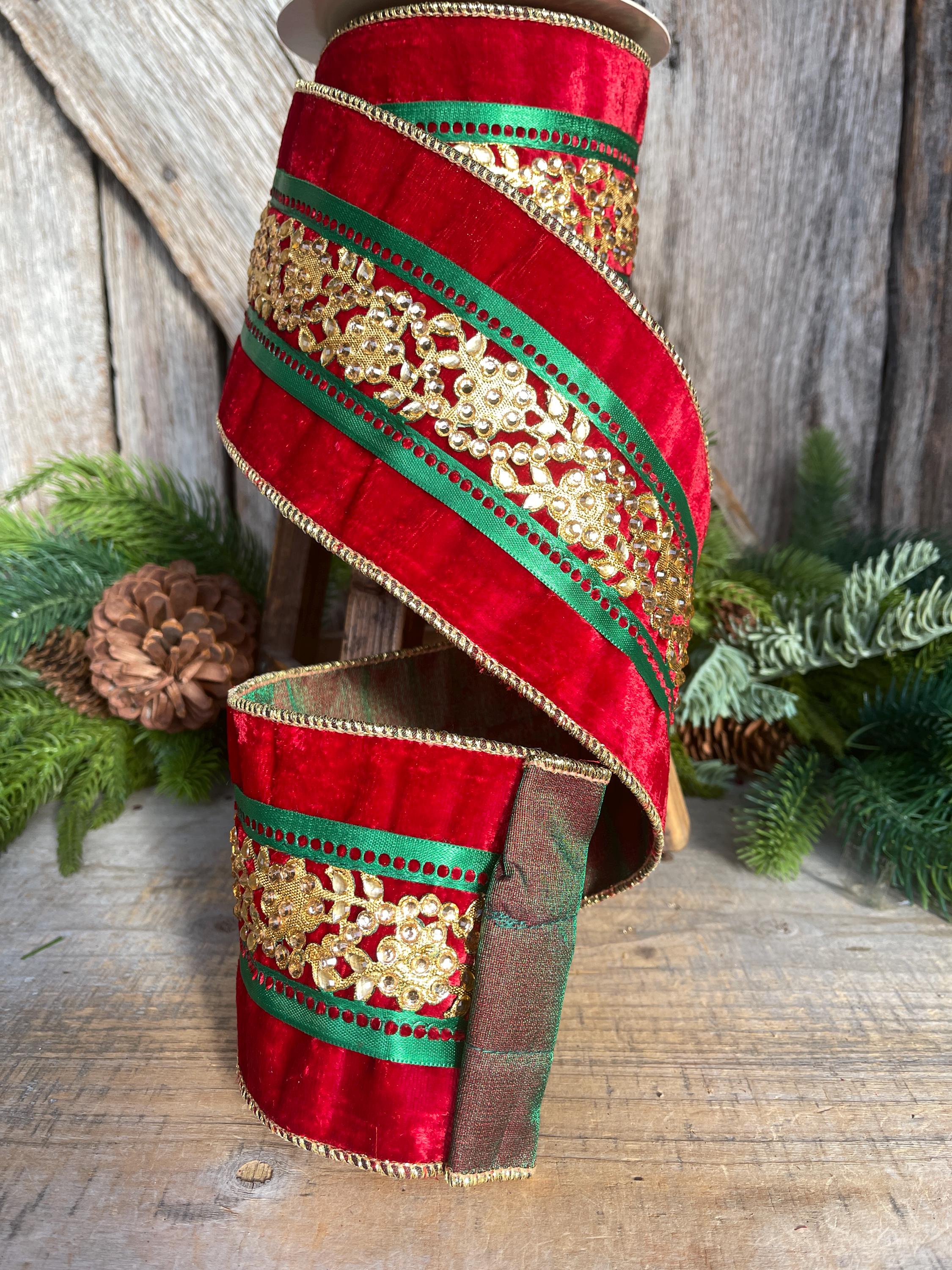 4" Red Embellished Velvet Ribbon, Luxury Christmas Ribbon