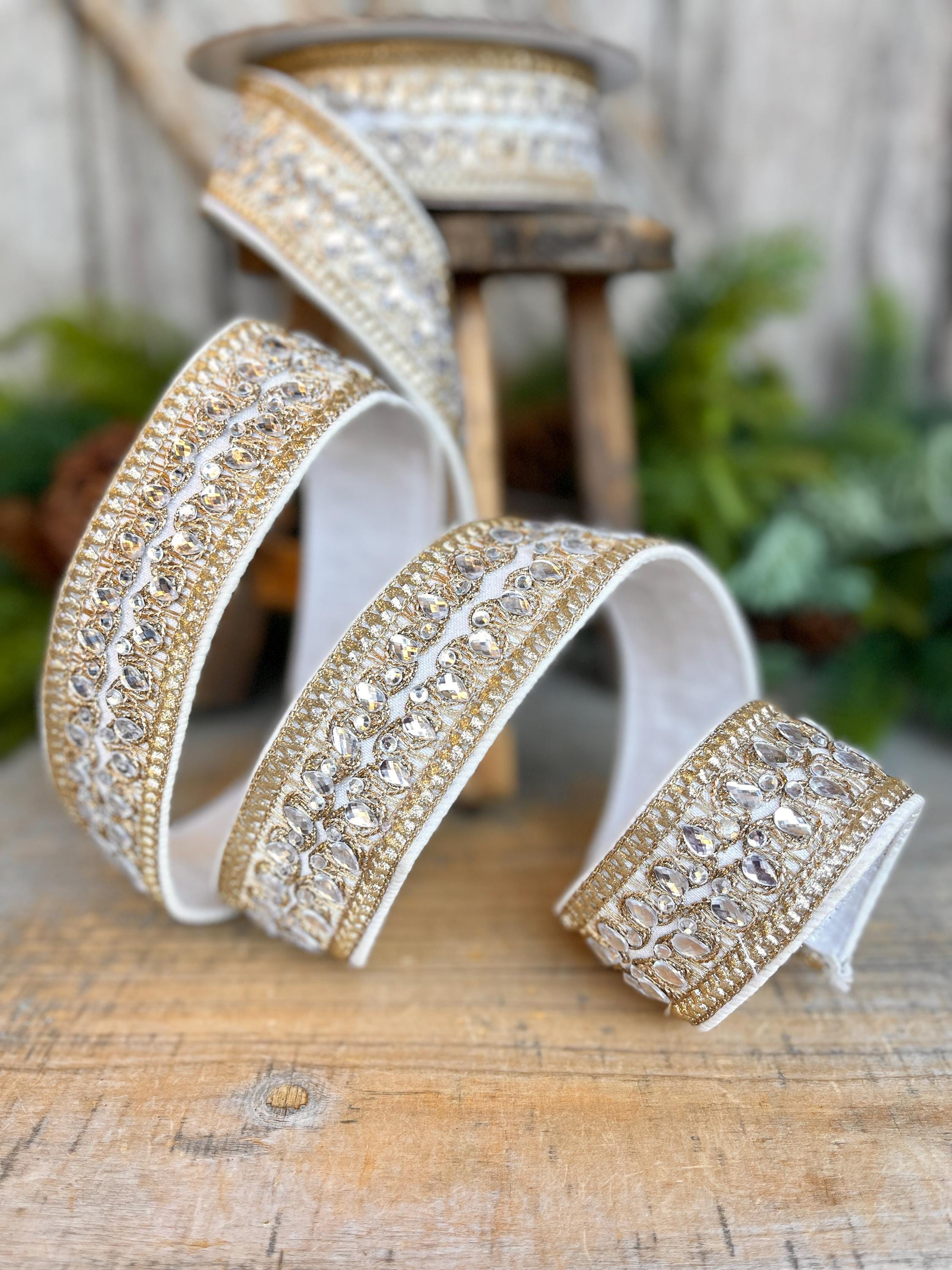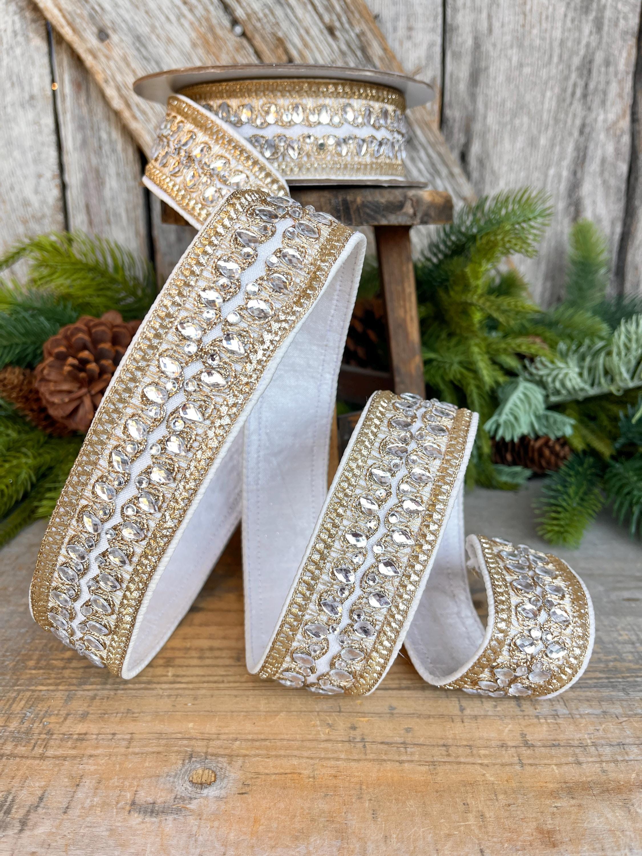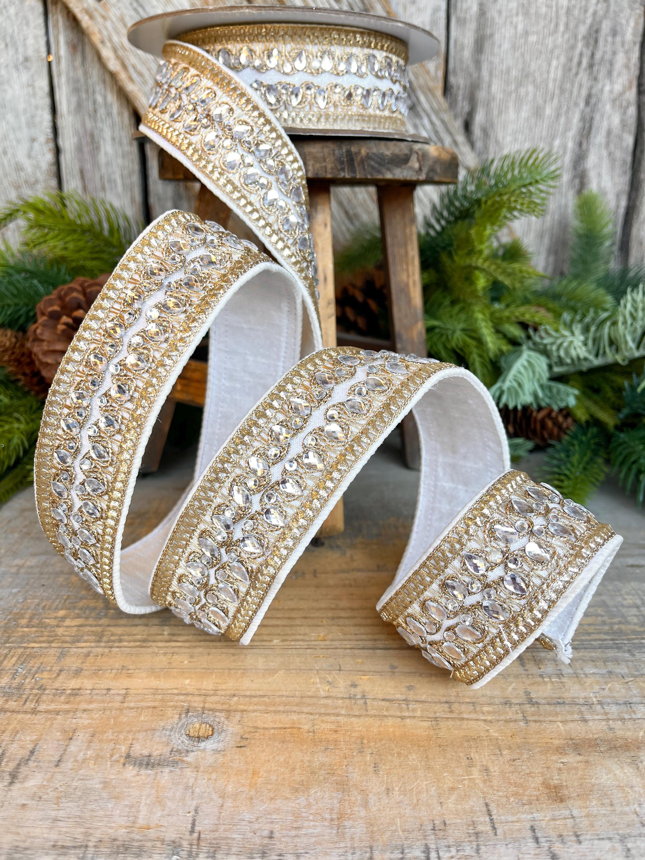 1.5" Ivory Gold Ribbon, Farrisilk Ribbon, Ivory Christmas Ribbon, Jeweled Ribbon