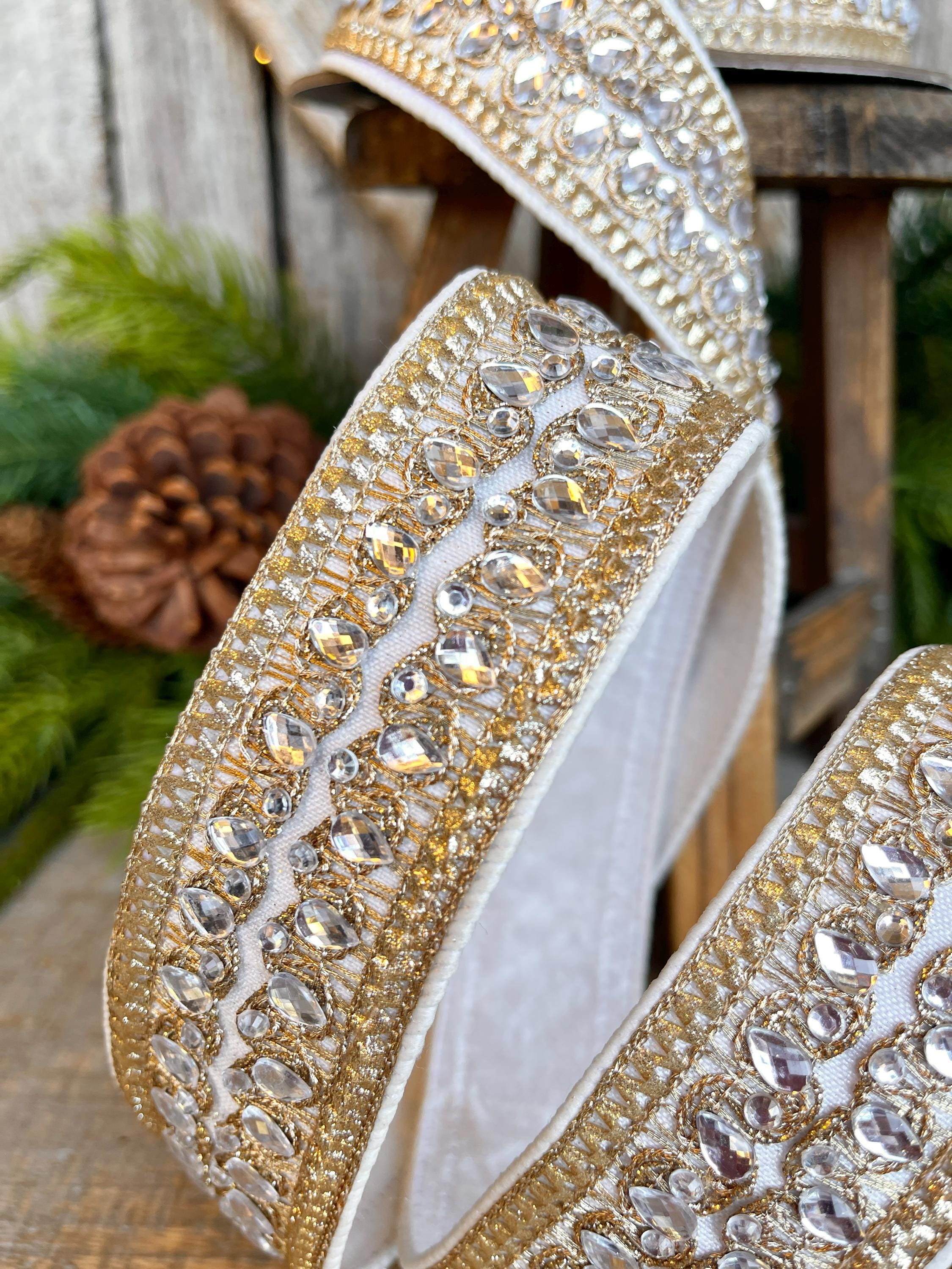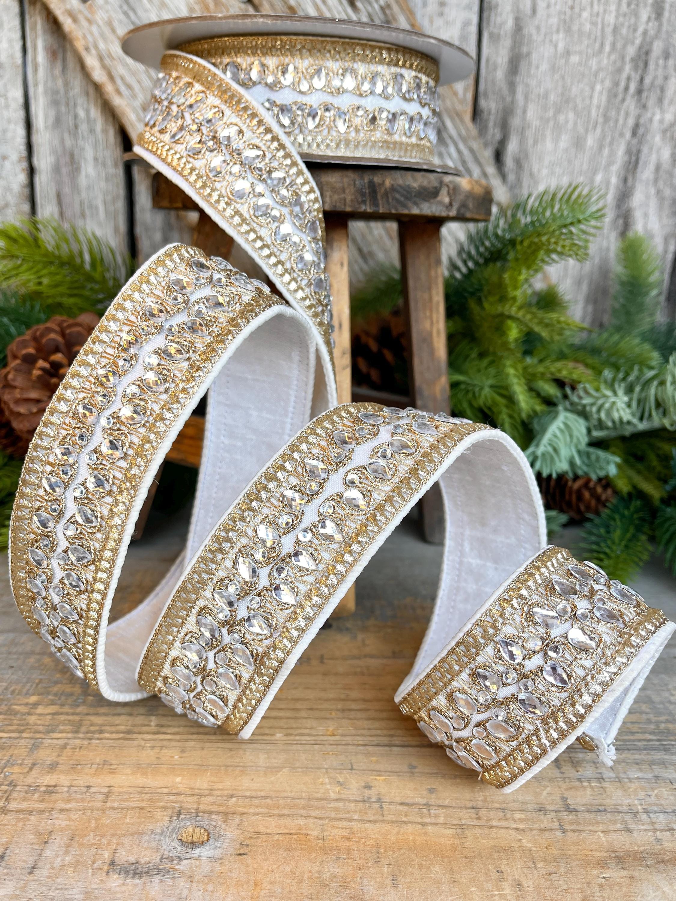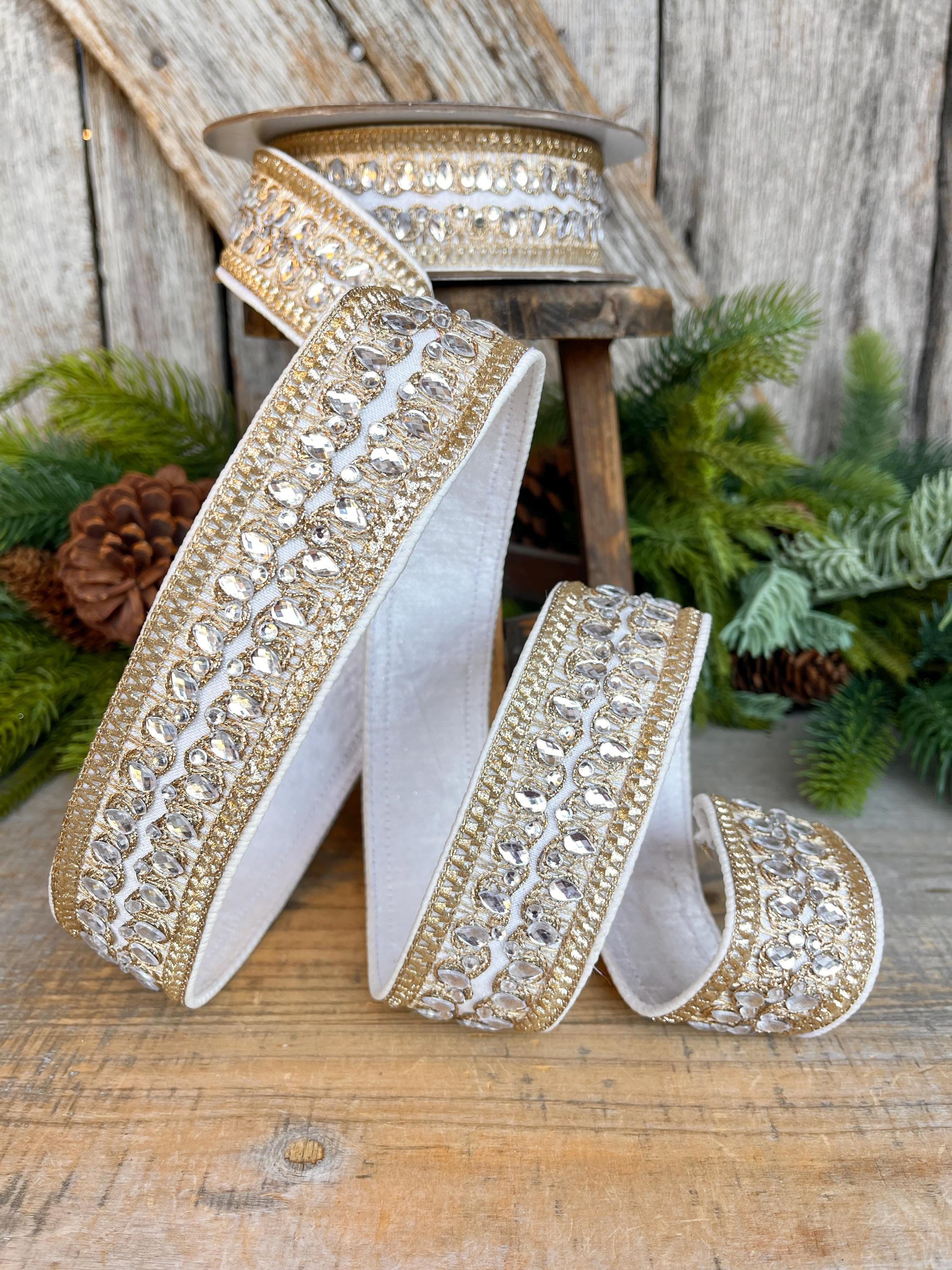 1.5" Ivory Gold Ribbon, Farrisilk Ribbon, Ivory Christmas Ribbon, Jeweled Ribbon
