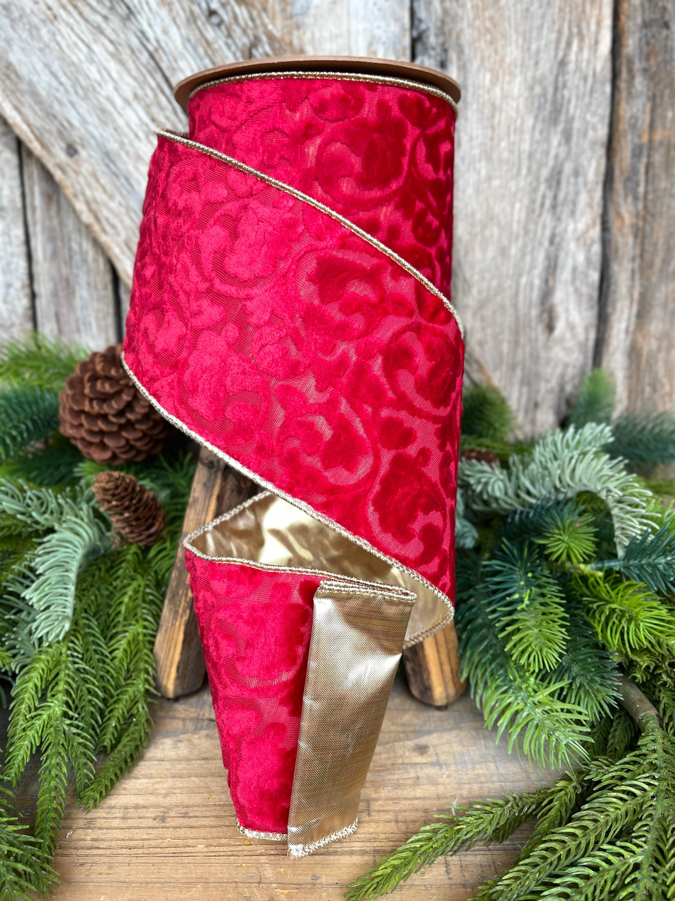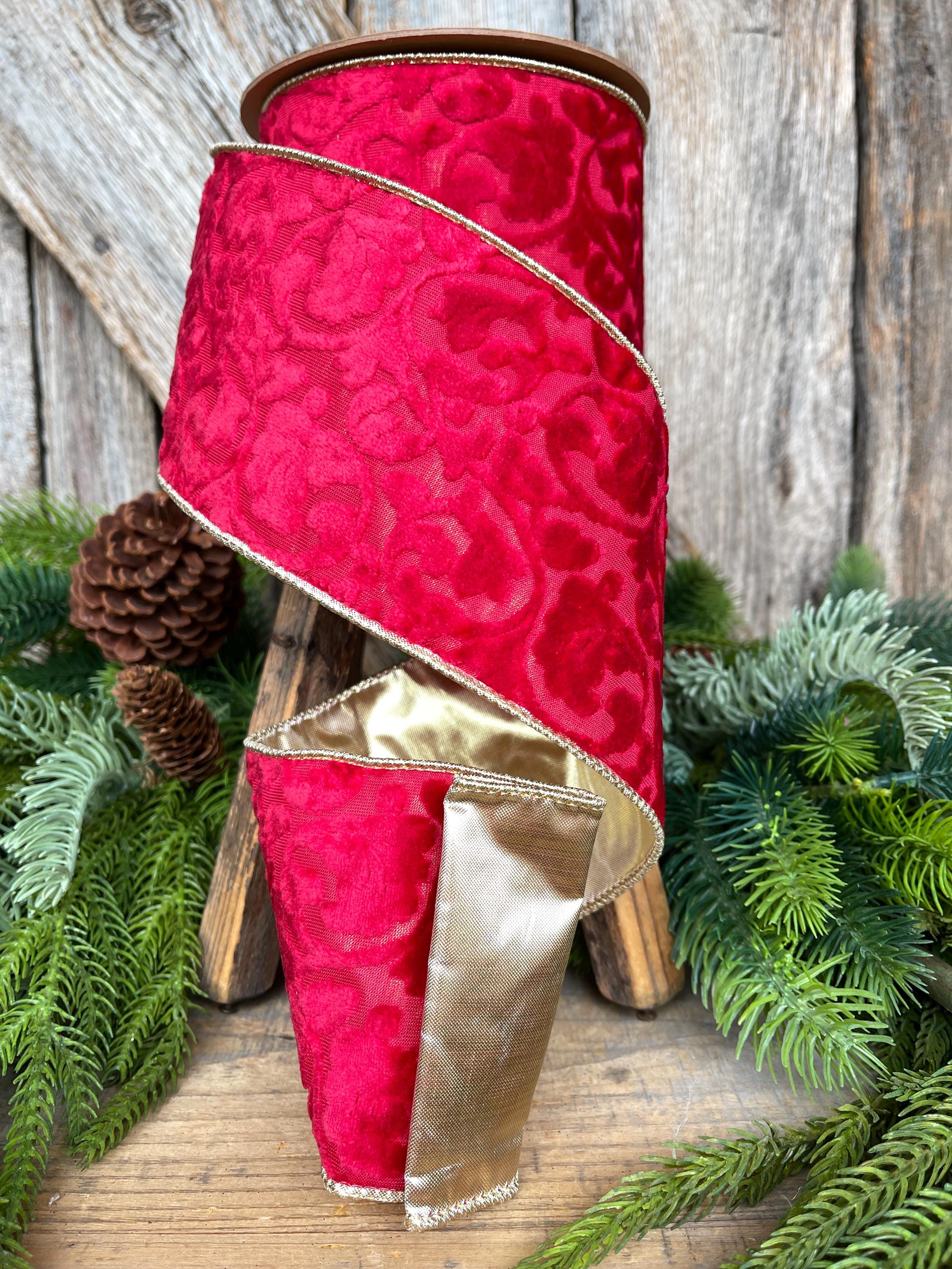 4" Red Embossed Velvet Ribbon, Christmas Ribbon, Red Velvet Ribbon