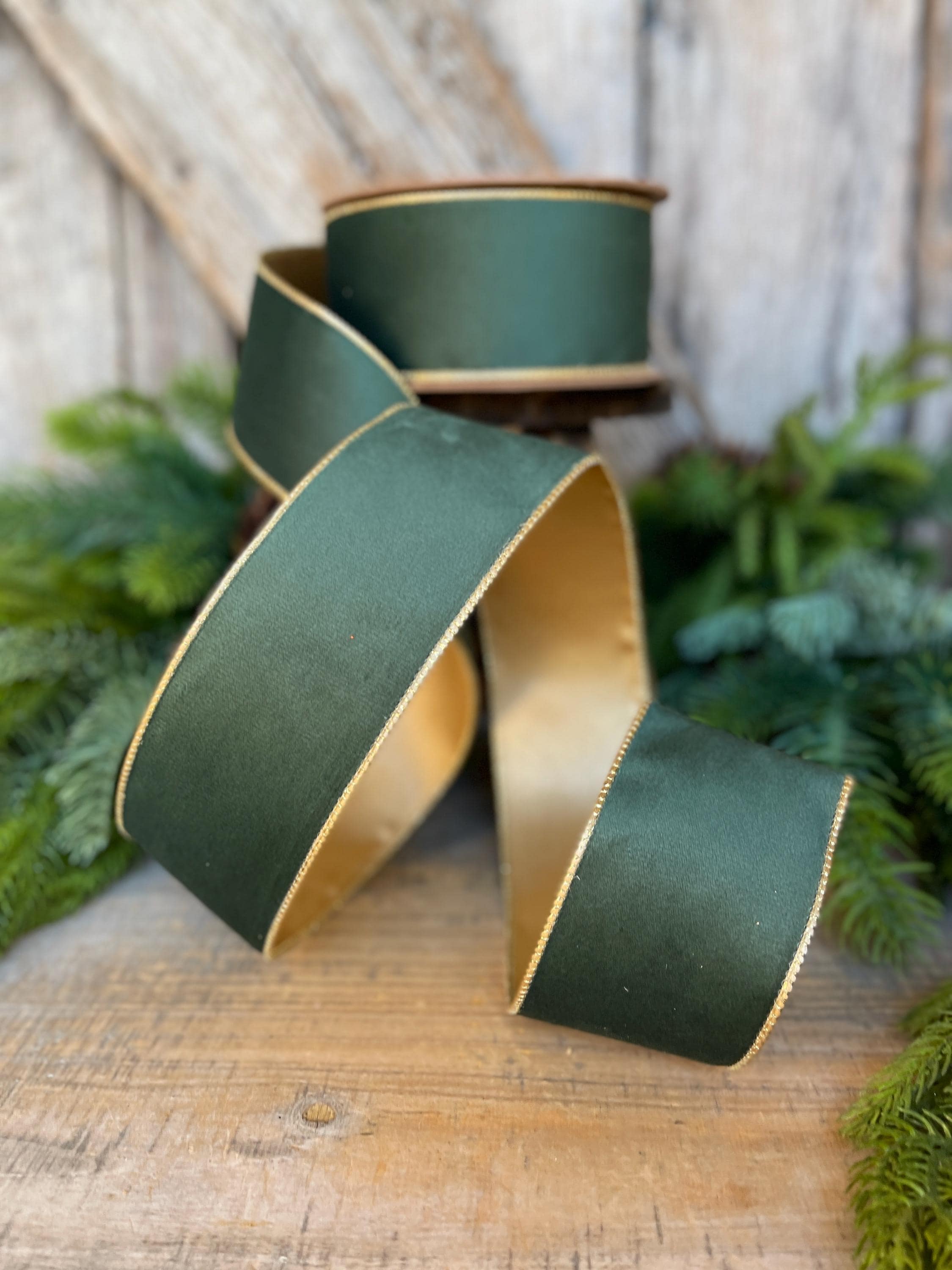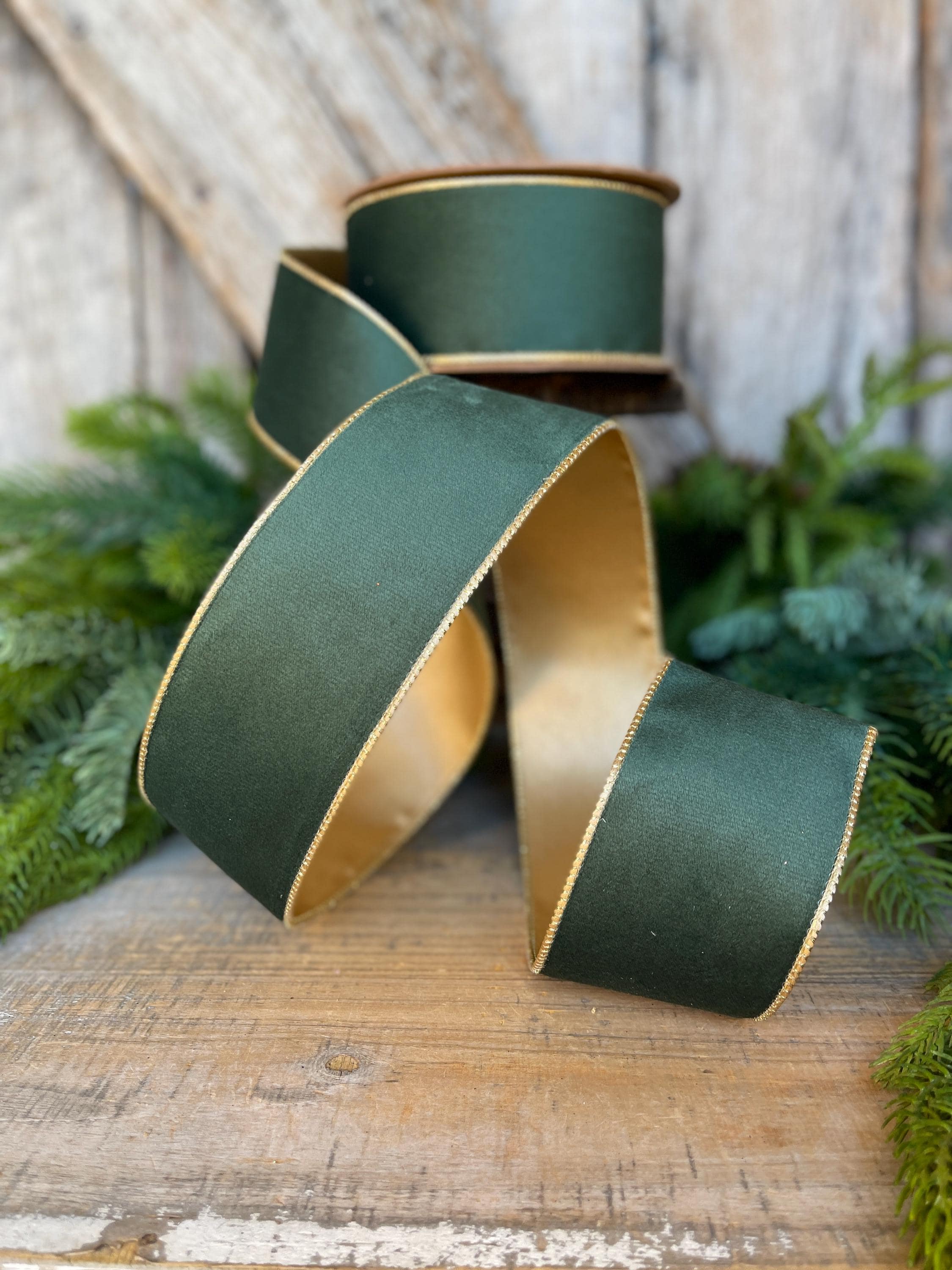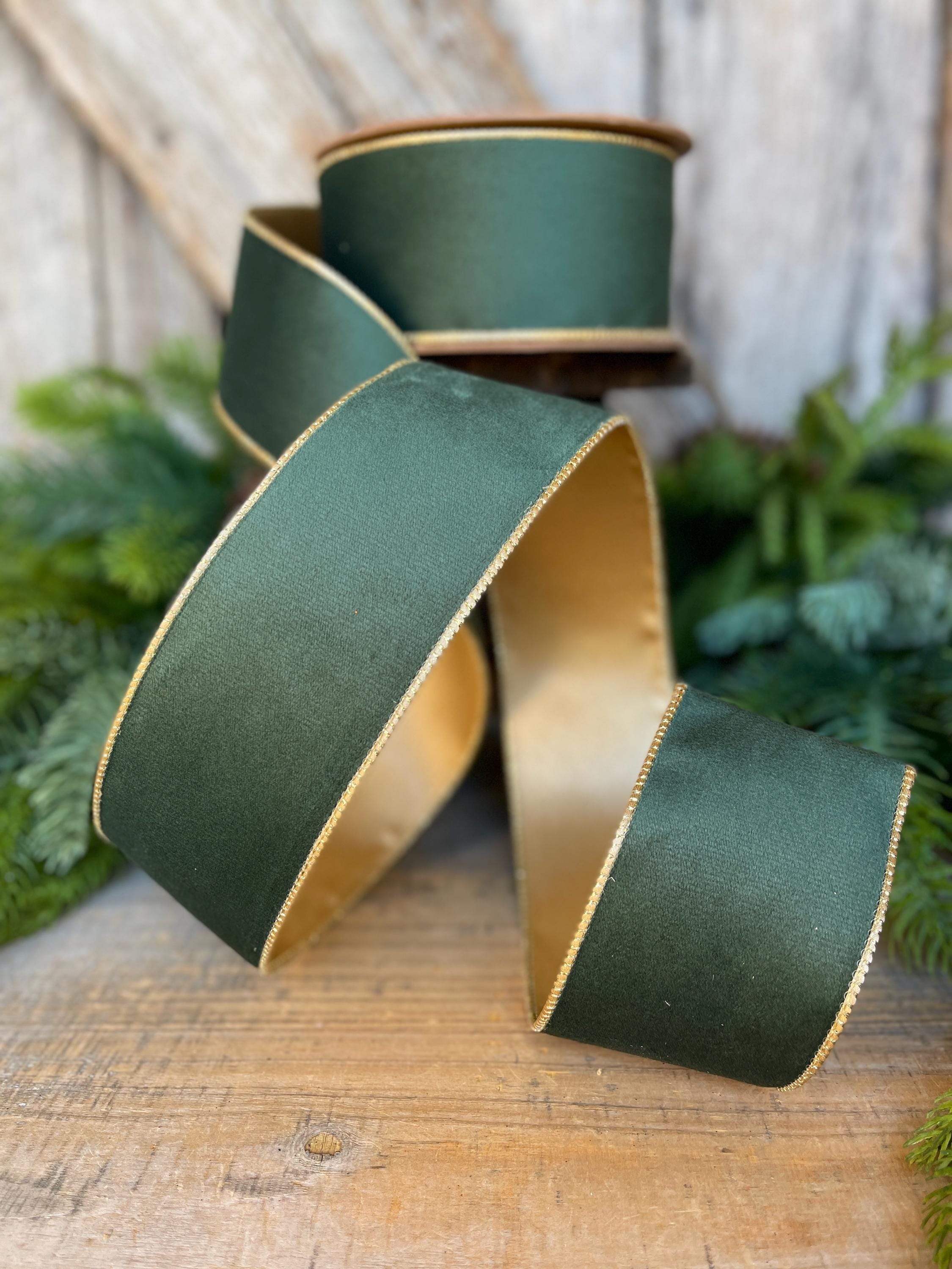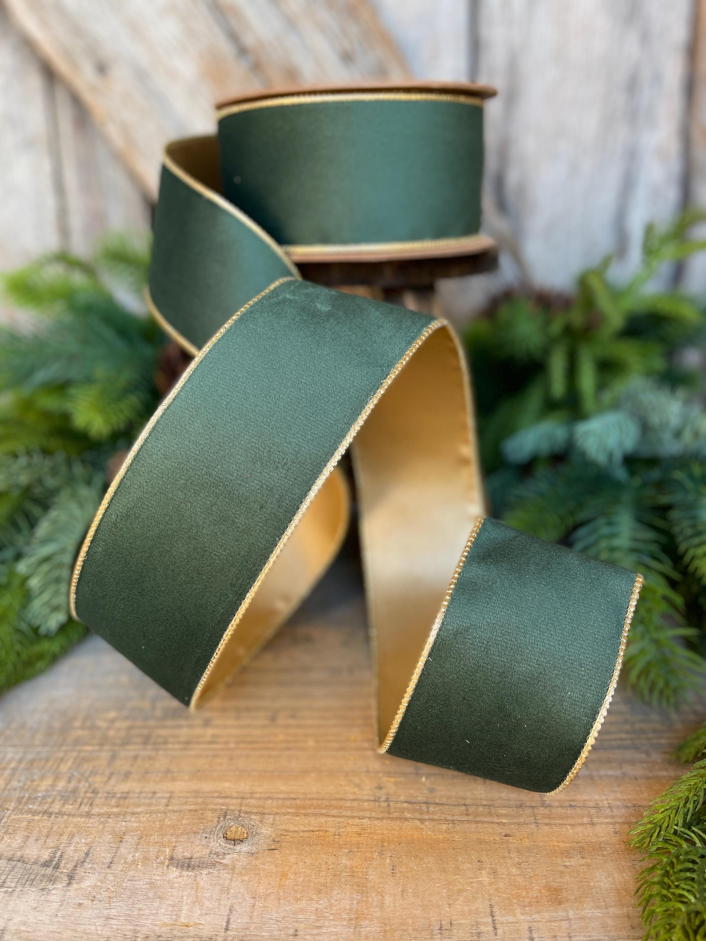 2.5" Green Velvet Ribbon, Green & Gold Velvet Ribbon, Christmas RIbbon, Hunter Green Velvet Ribbon