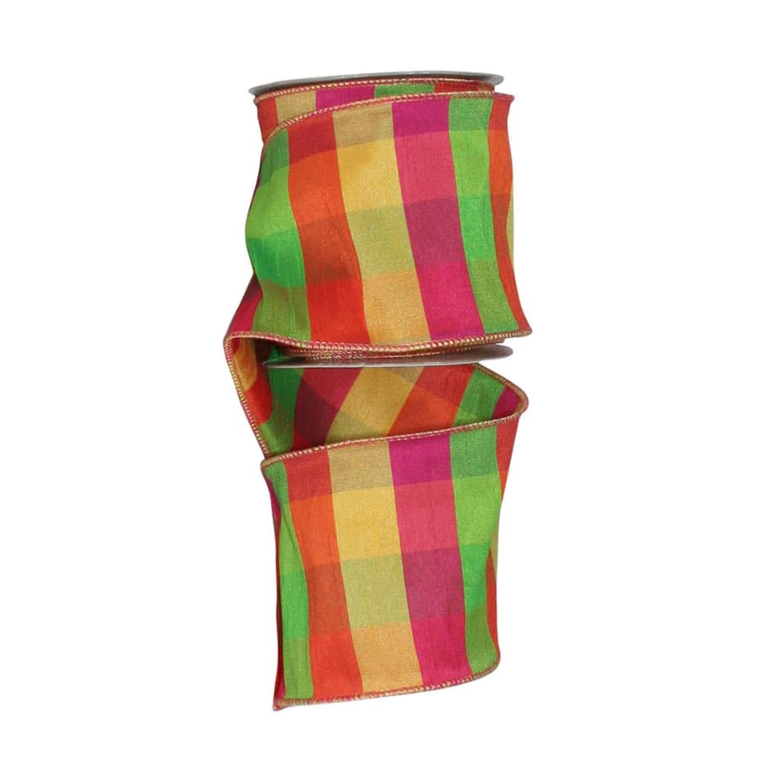 4" Bright Pink Yellow Plaid Wired Ribbon, Spring Ribbon, Summer Ribbon, Pink Yellow Orange Ribbon, Dupion Ribbon, Wired Ribbon