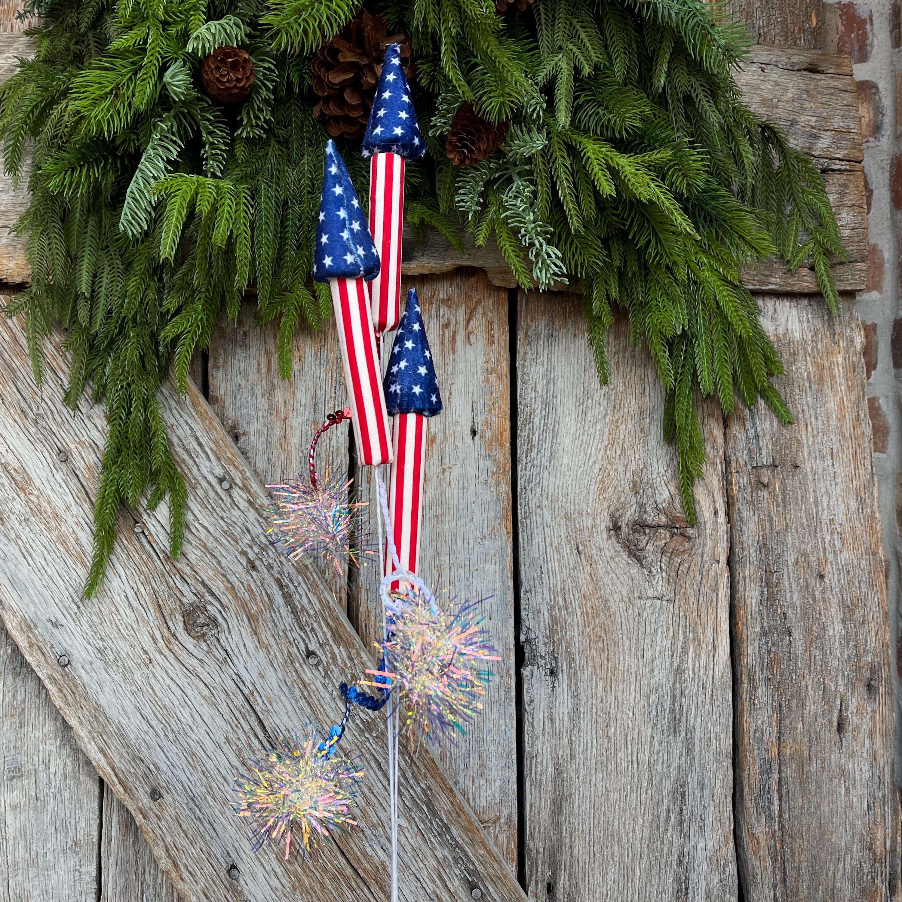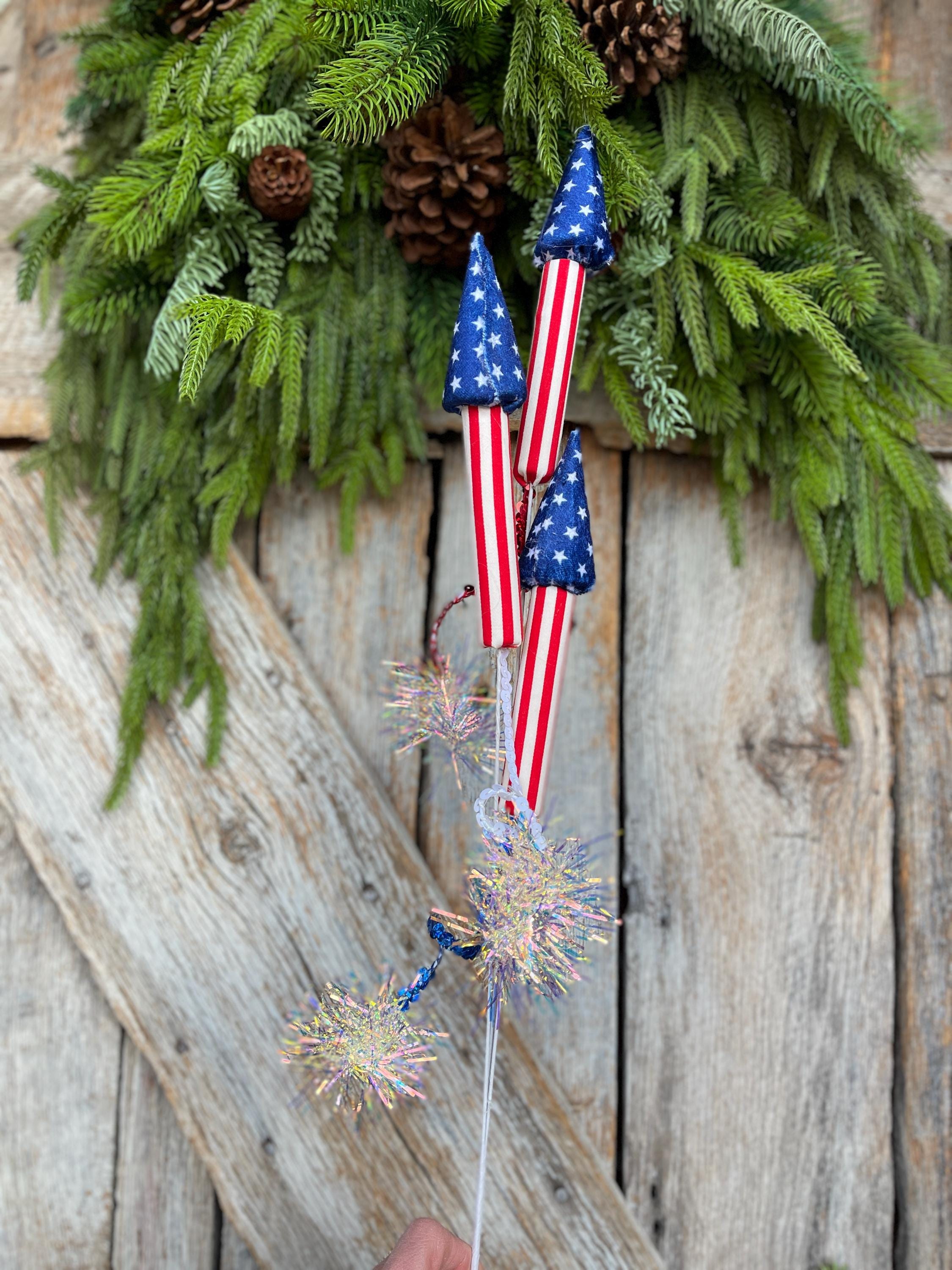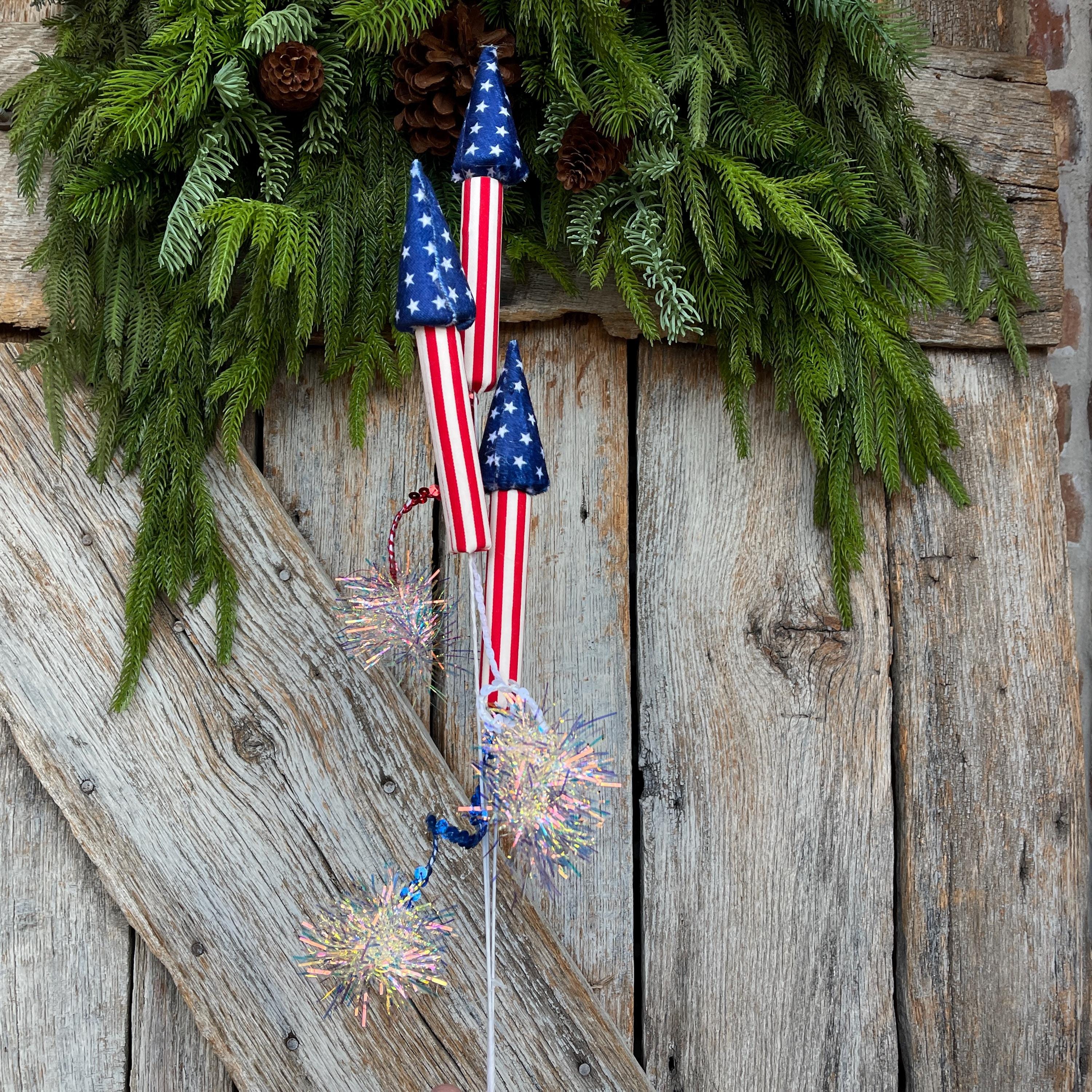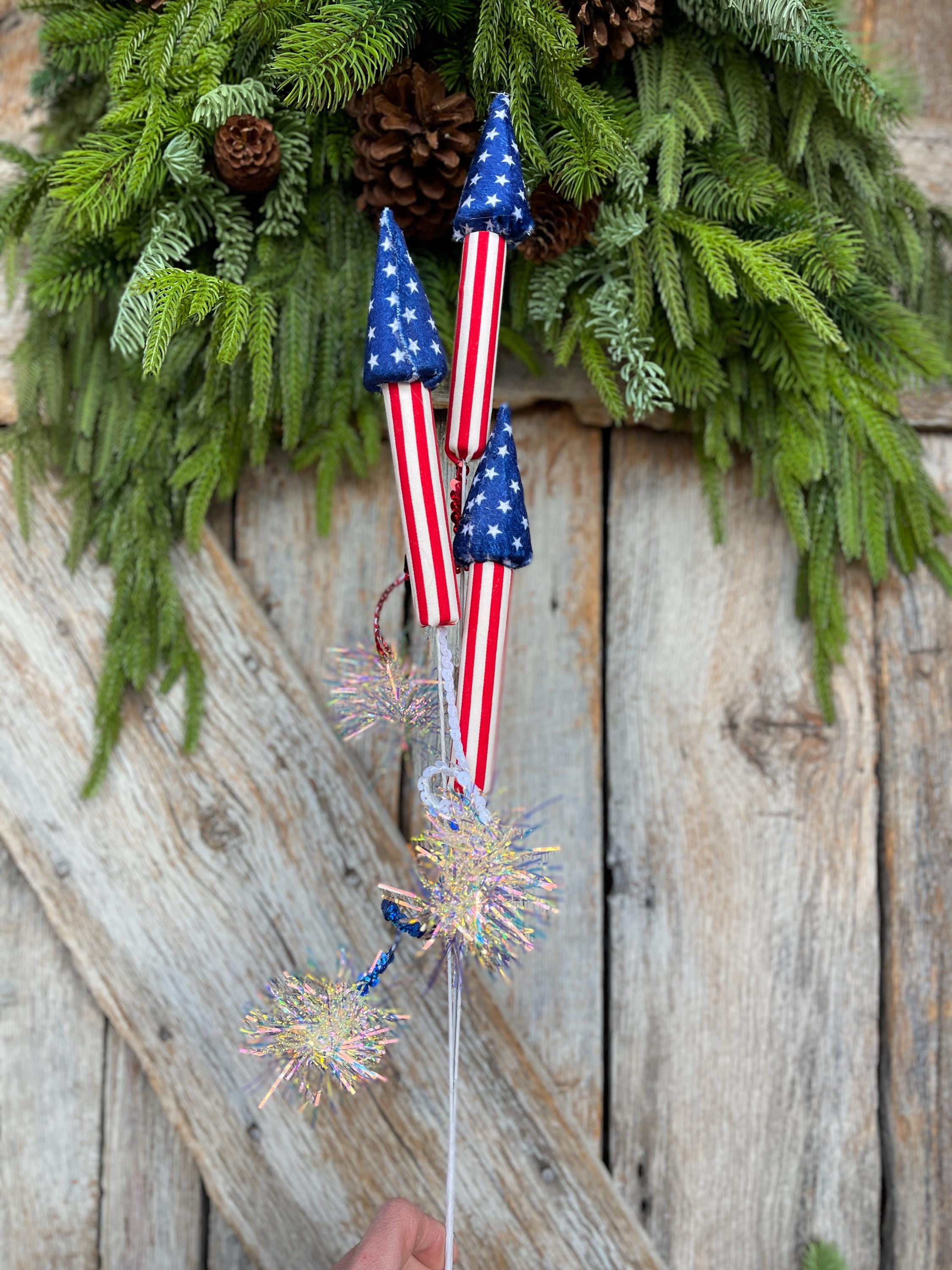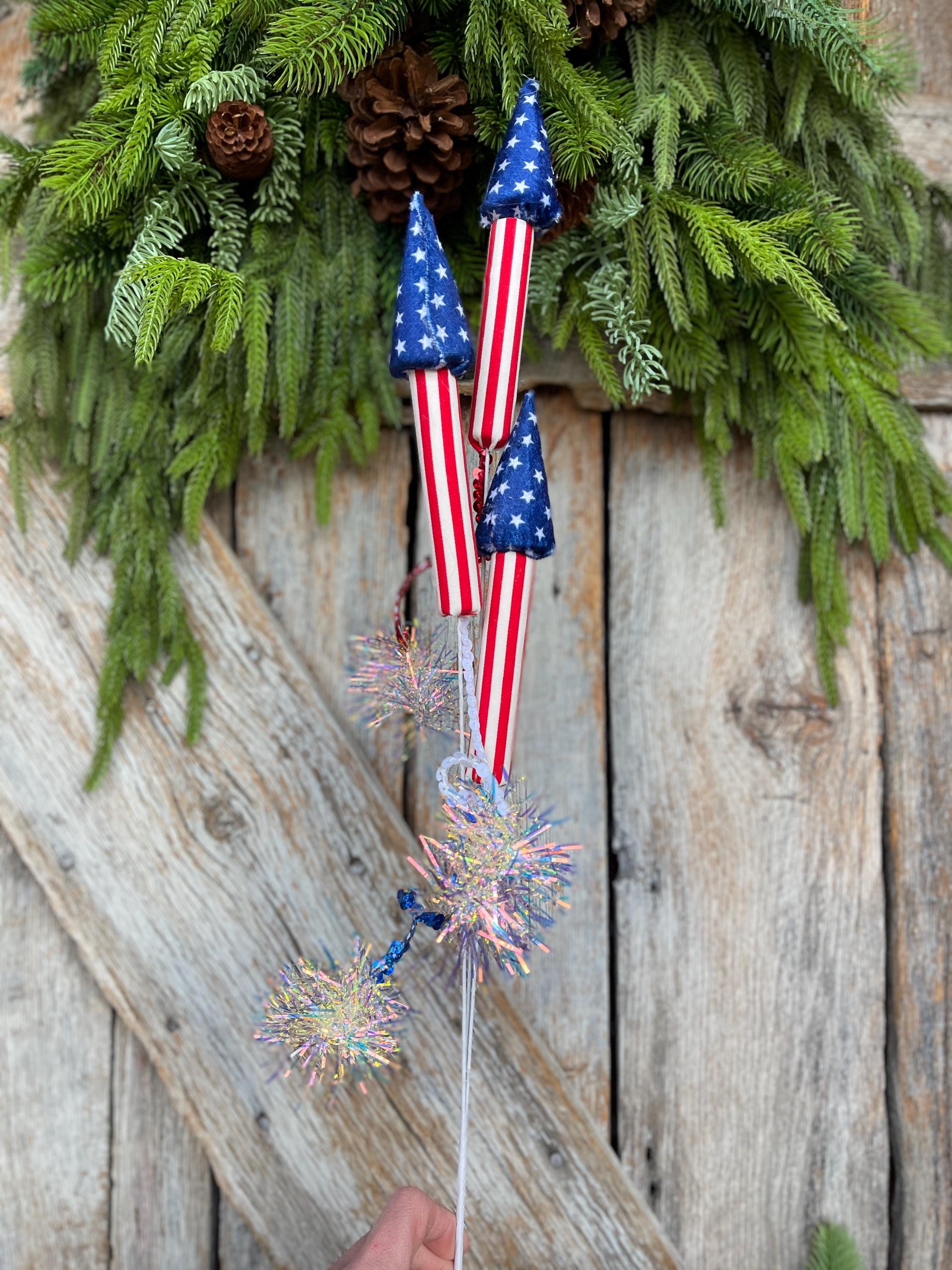 Add a bold burst of Americana charm to your summer décor with this 31-inch Patriotic Rocket Spray. Featuring red, white, and blue rocket designs accented with sparkling firework pom details, this statement piece is perfect for 4th of July, Memorial Day, Veterans Day, and patriotic wreaths or arrangements.