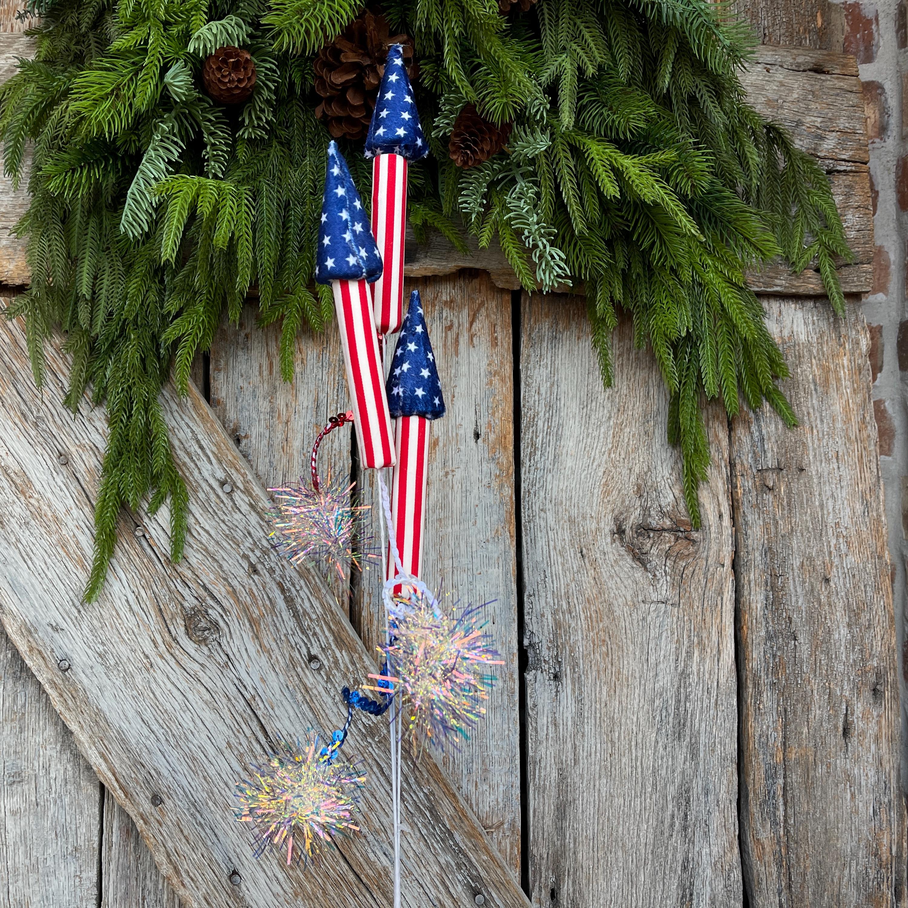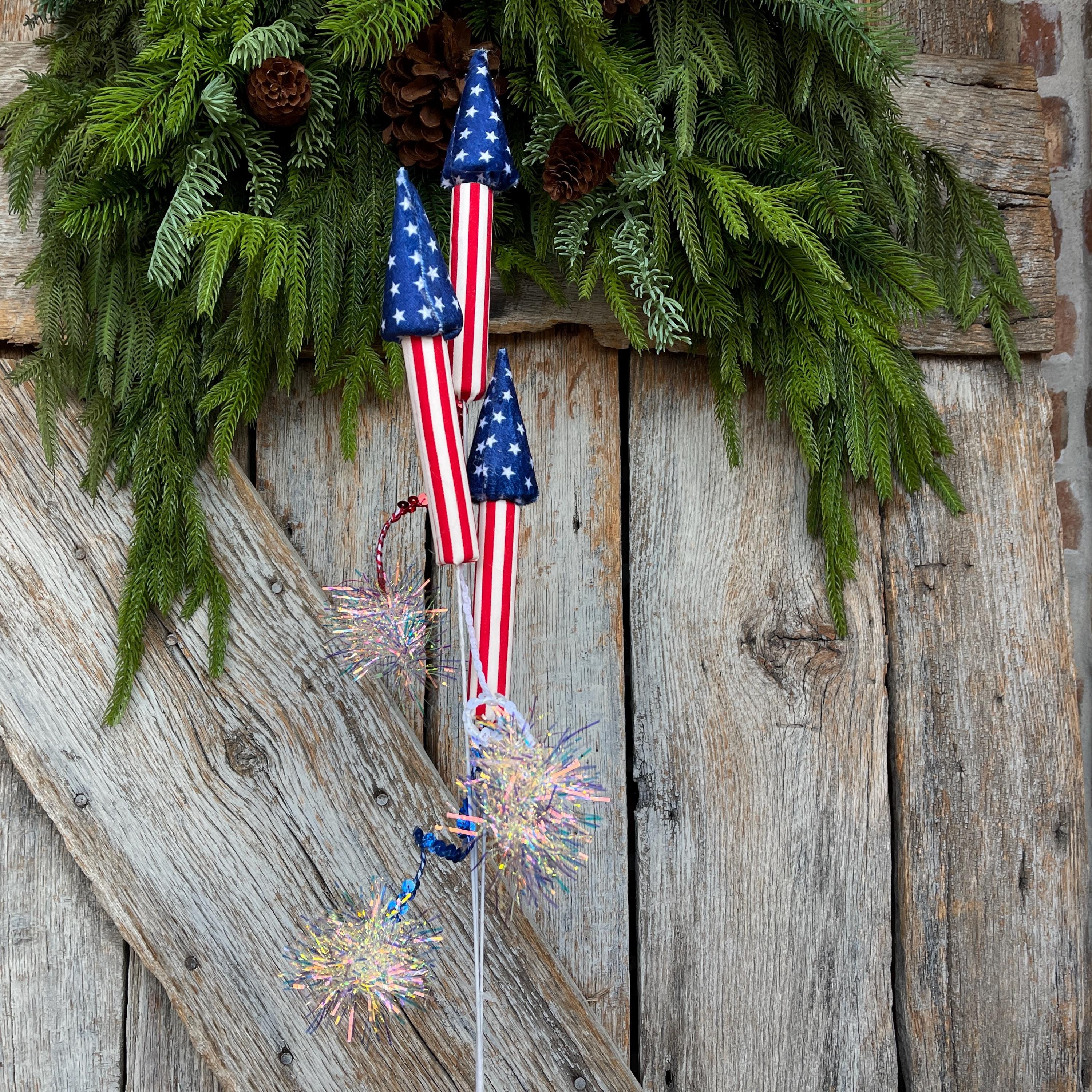 Material: Fabric rockets with tinsel firework accents