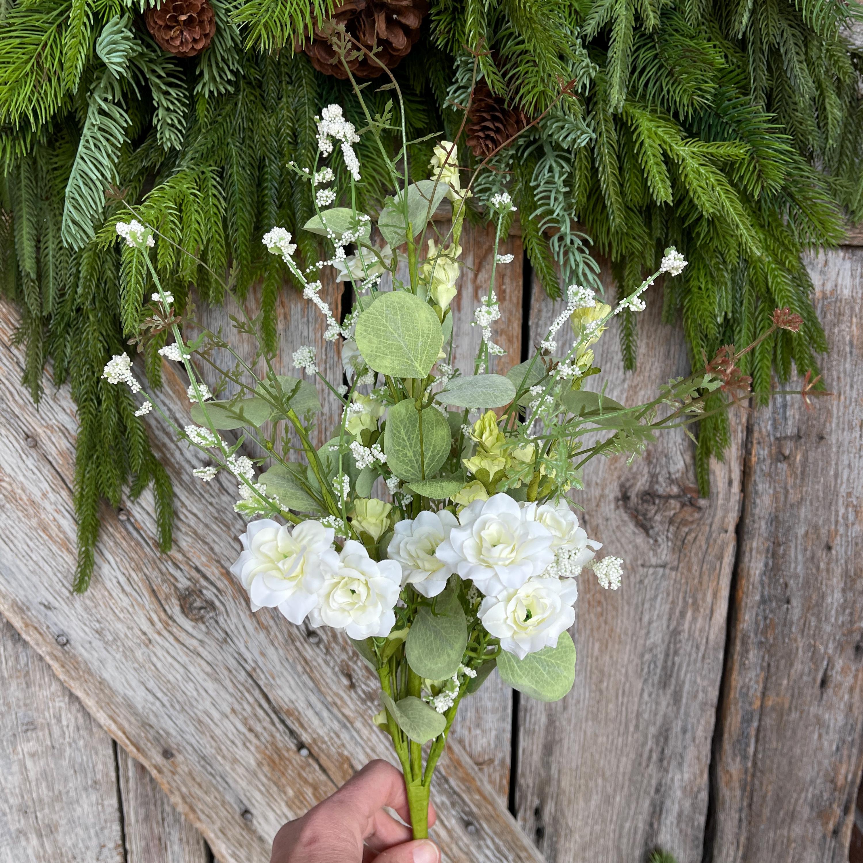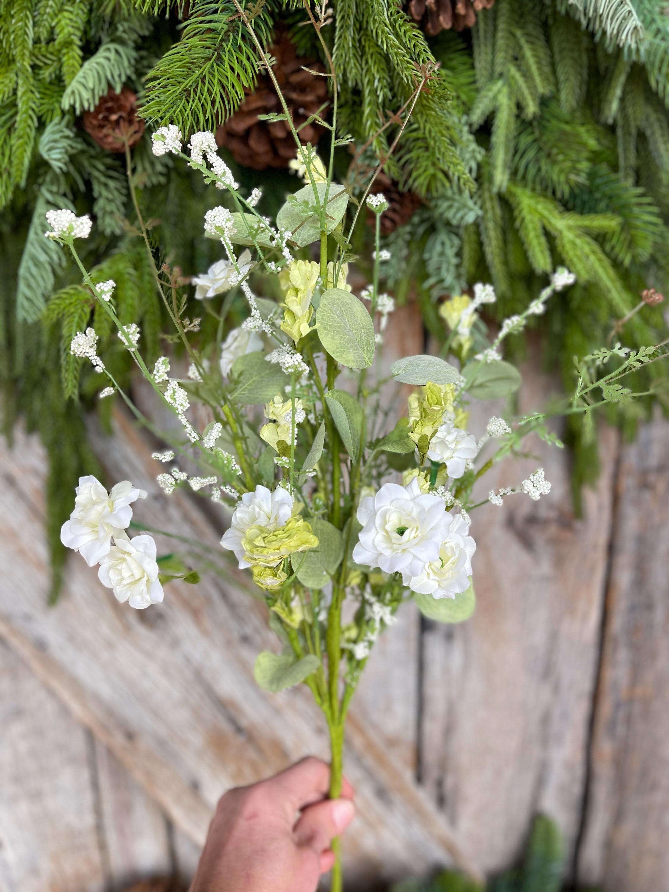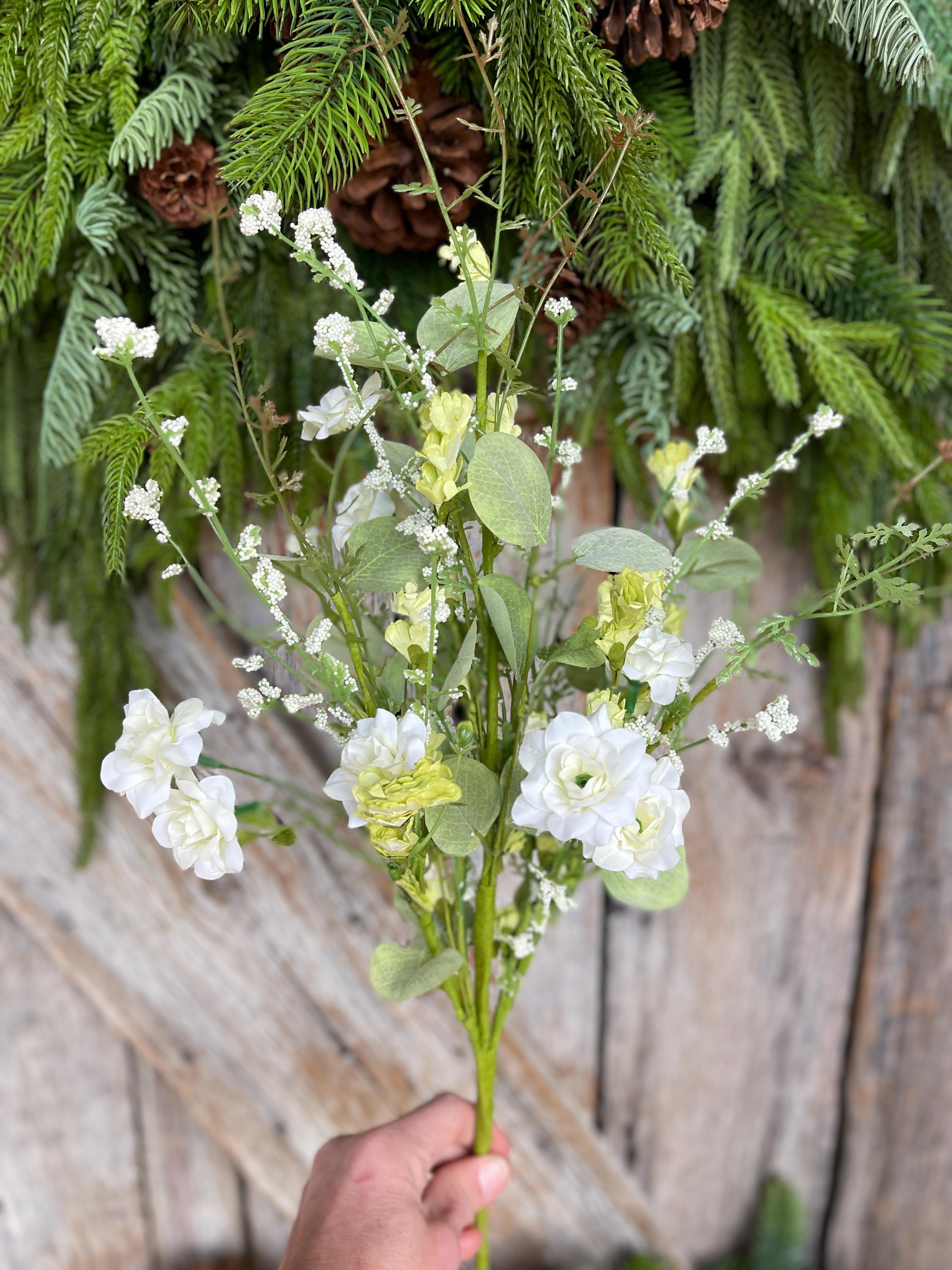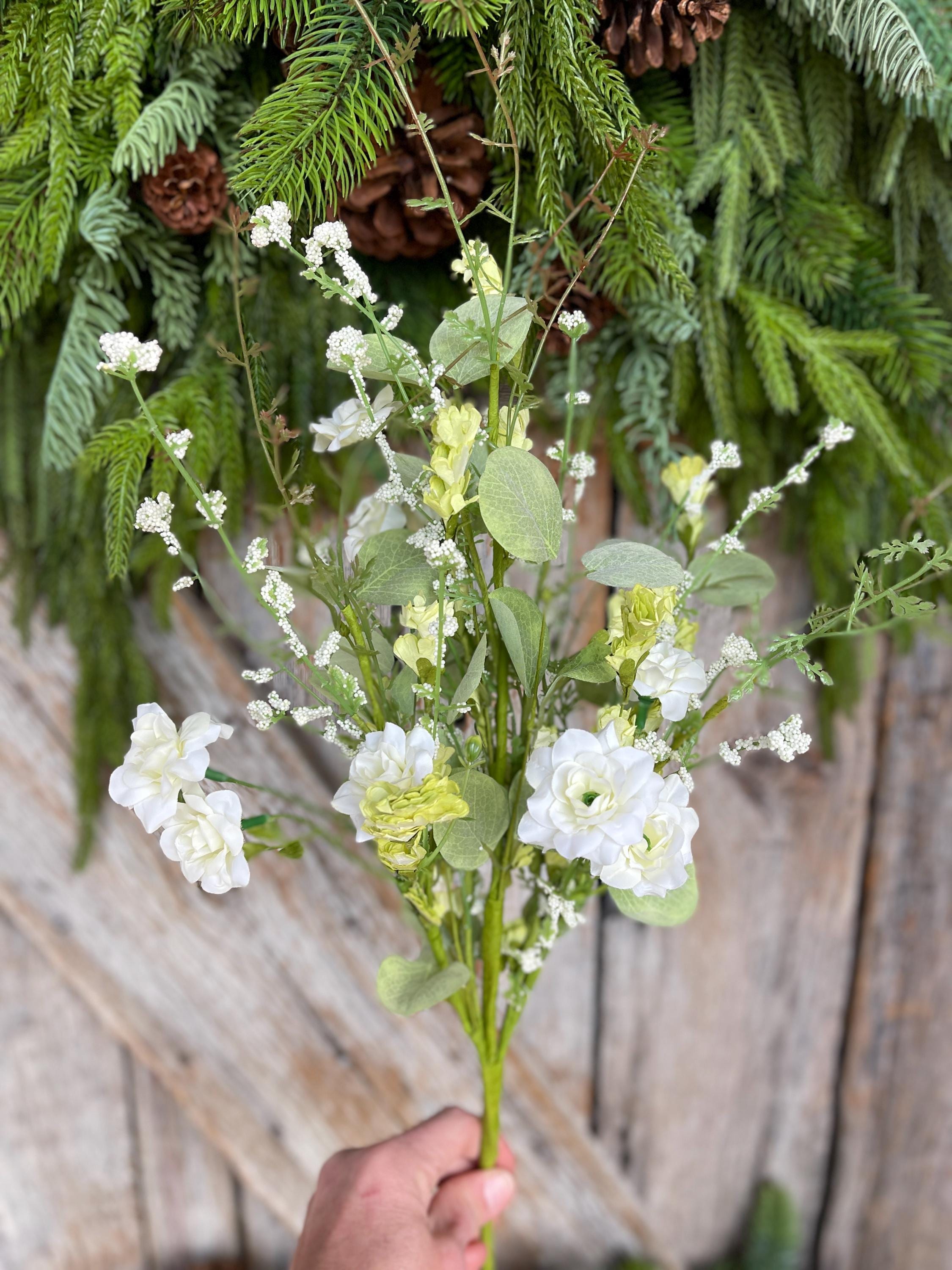 Bring soft, airy color to your designs with this 20 inch mixed wildflower bush in cream white. Featuring layered rose-style blooms, delicate filler sprigs, and natural-looking leaves, this floral bush adds effortless charm to wreaths, arrangements, and seasonal décor.