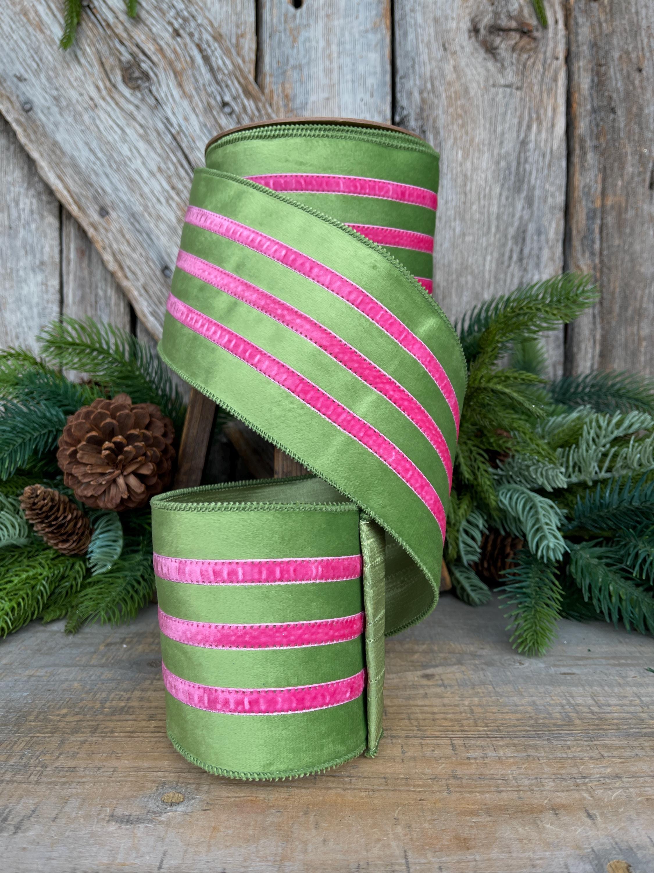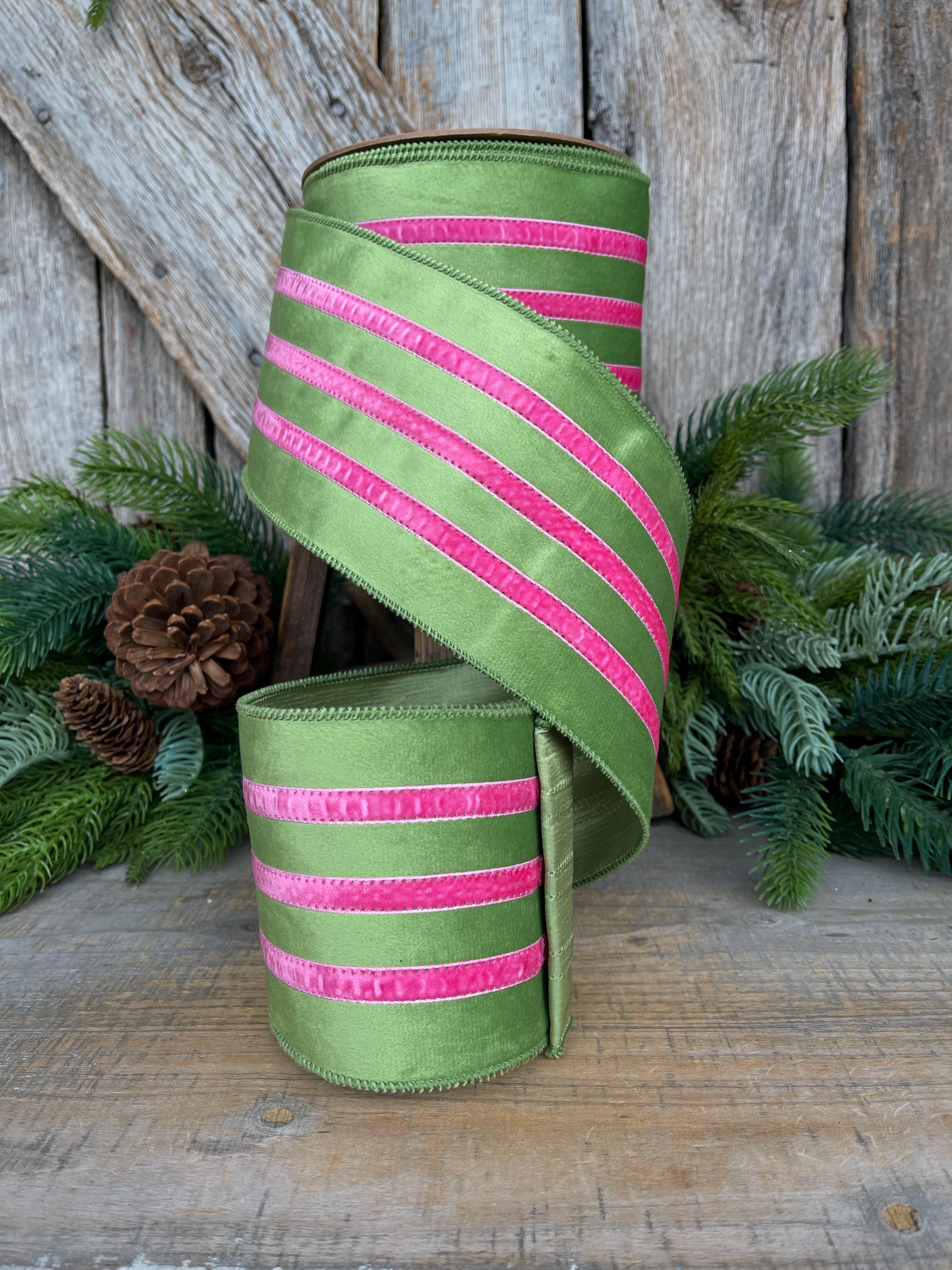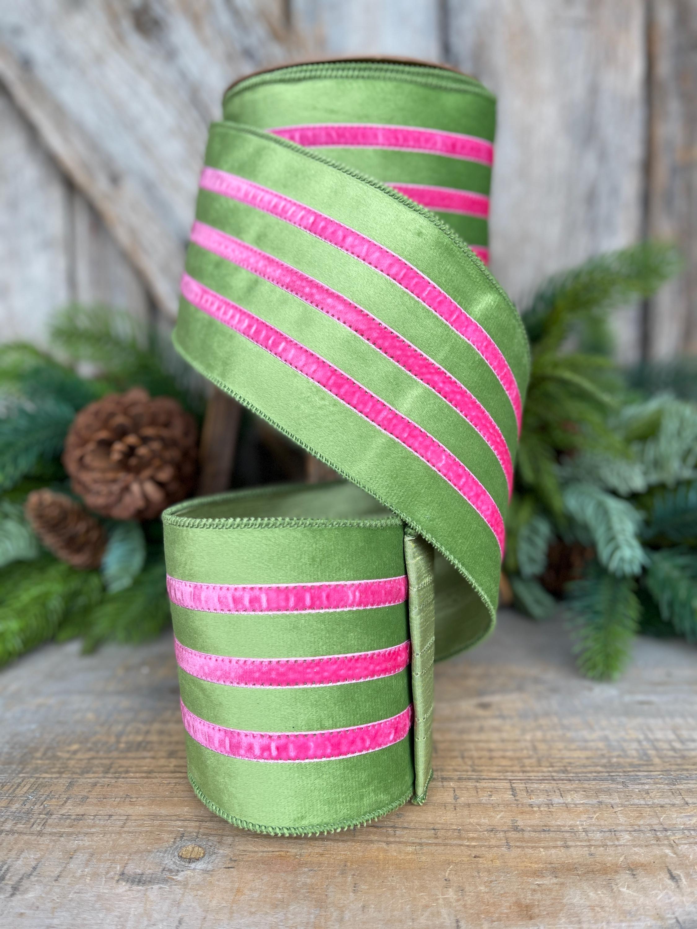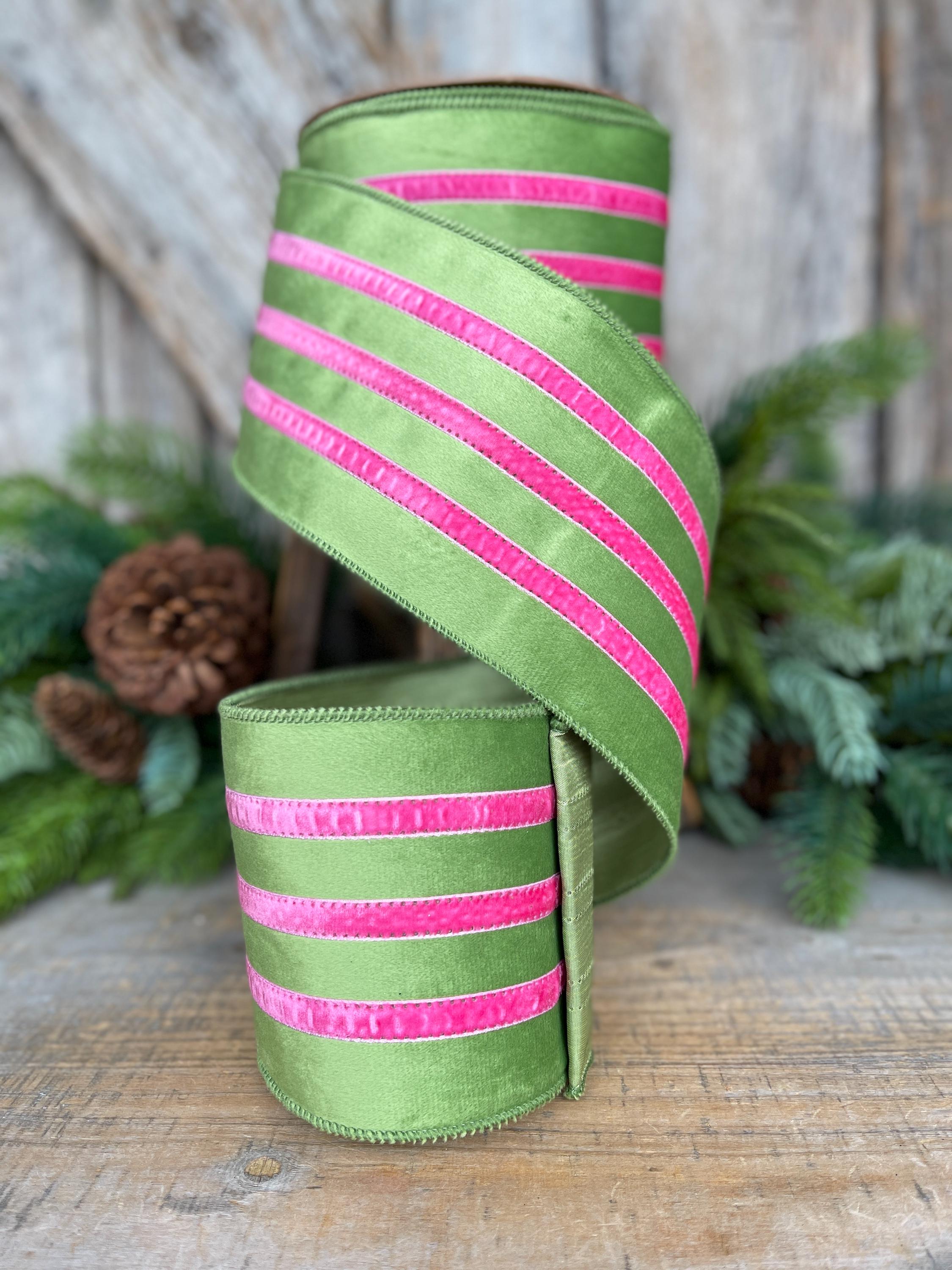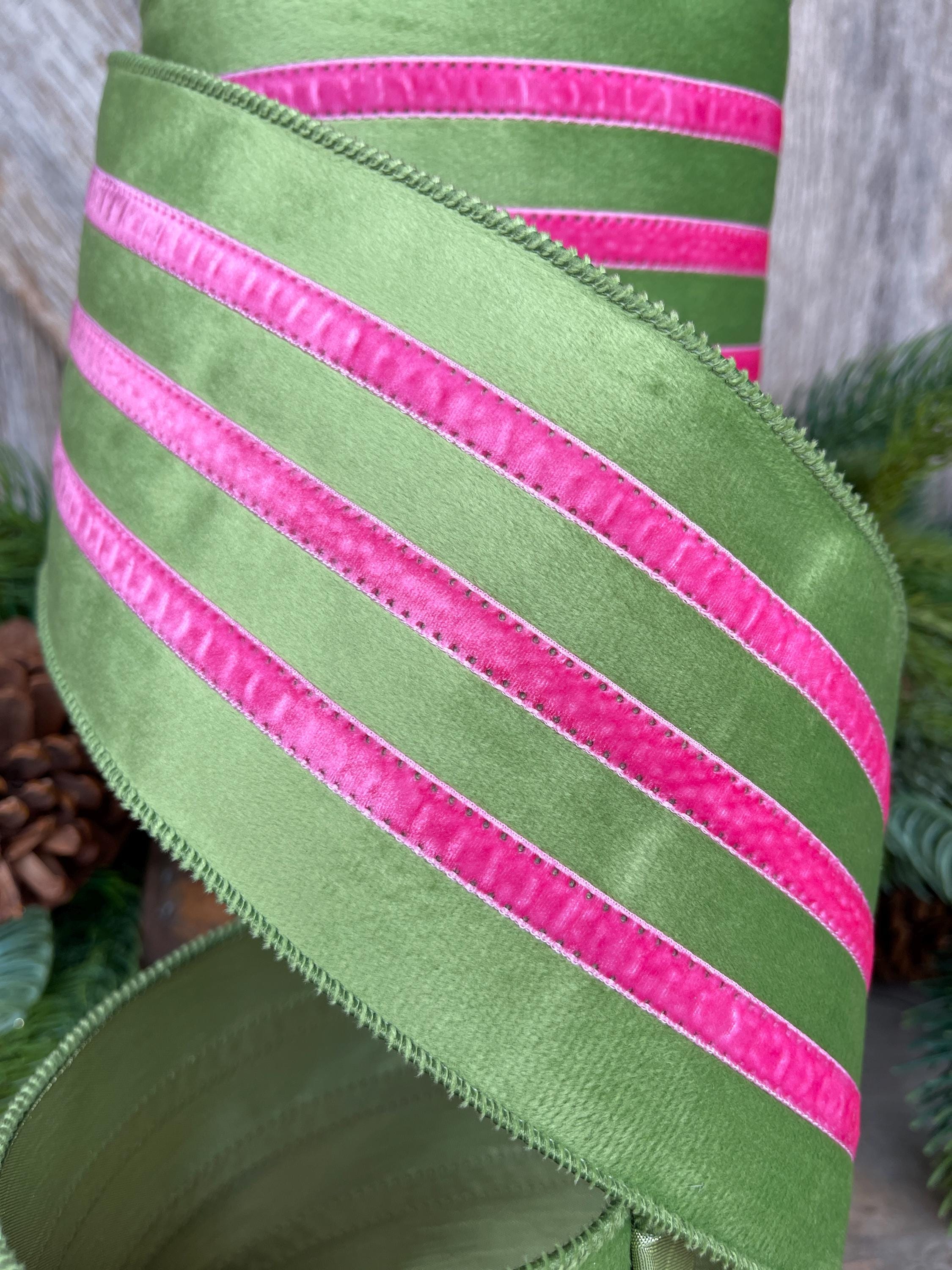 Add a bold pop of color and luxury texture to your designs with this pink and green velvet ribbon. Featuring rich green velvet with vibrant pink velvet stripe accents, this ribbon brings an upscale, designer feel to wreaths, bows, garlands, and seasonal décor.