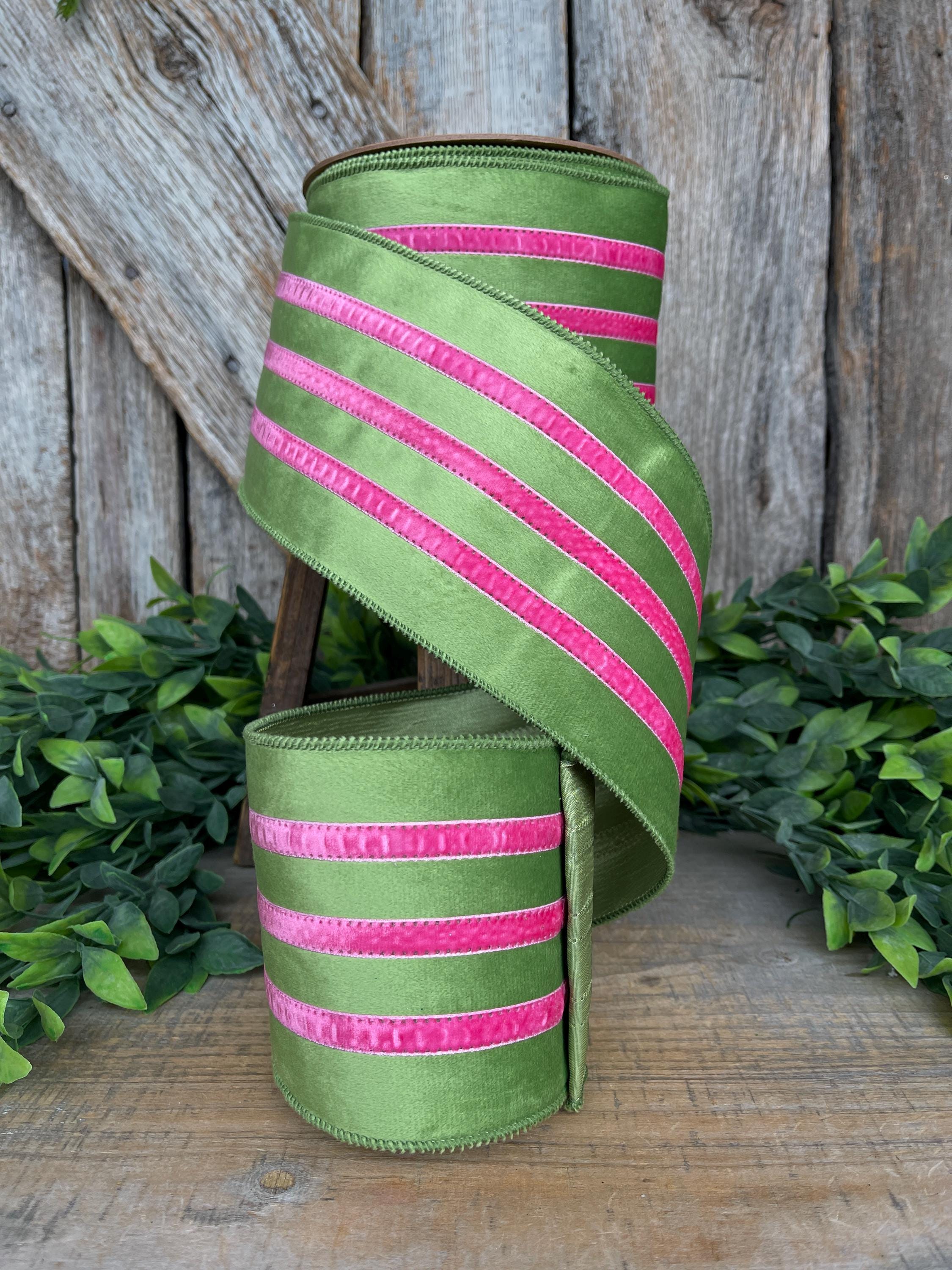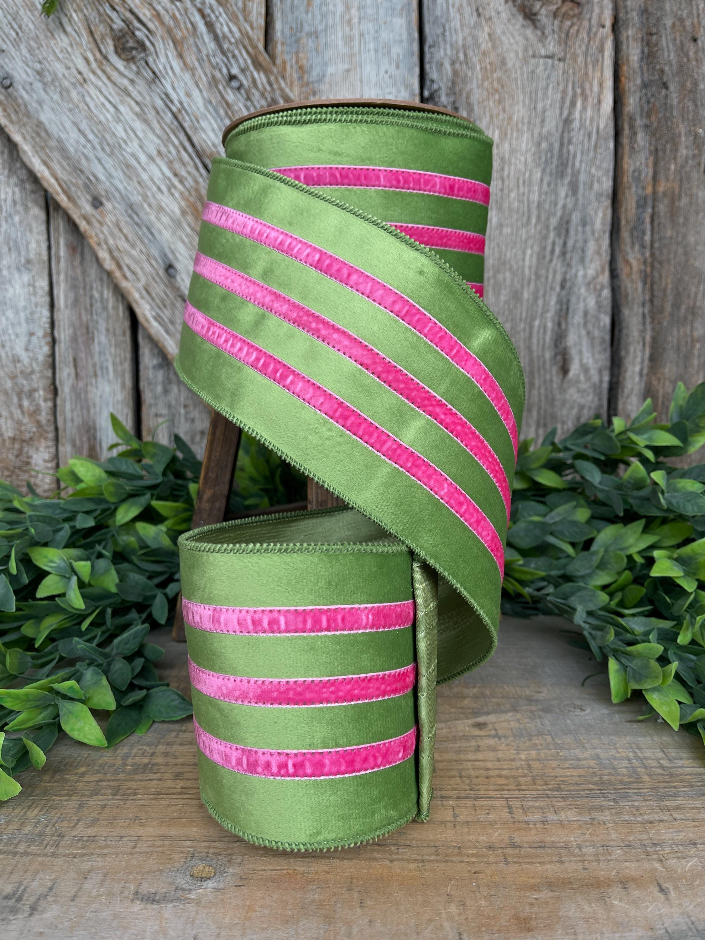 4" Pink Green Velvet Ribbon, Spring Designer Ribbon