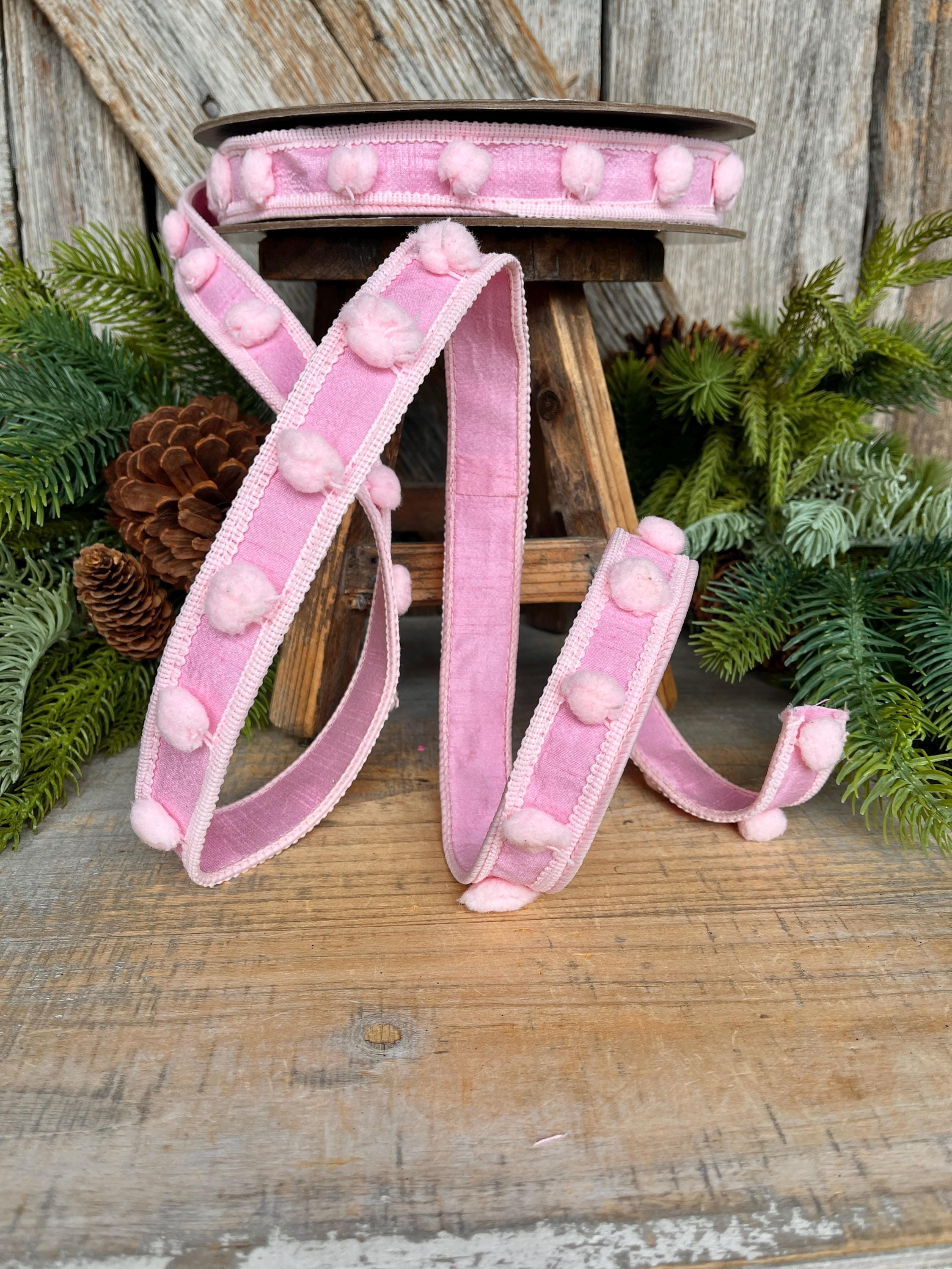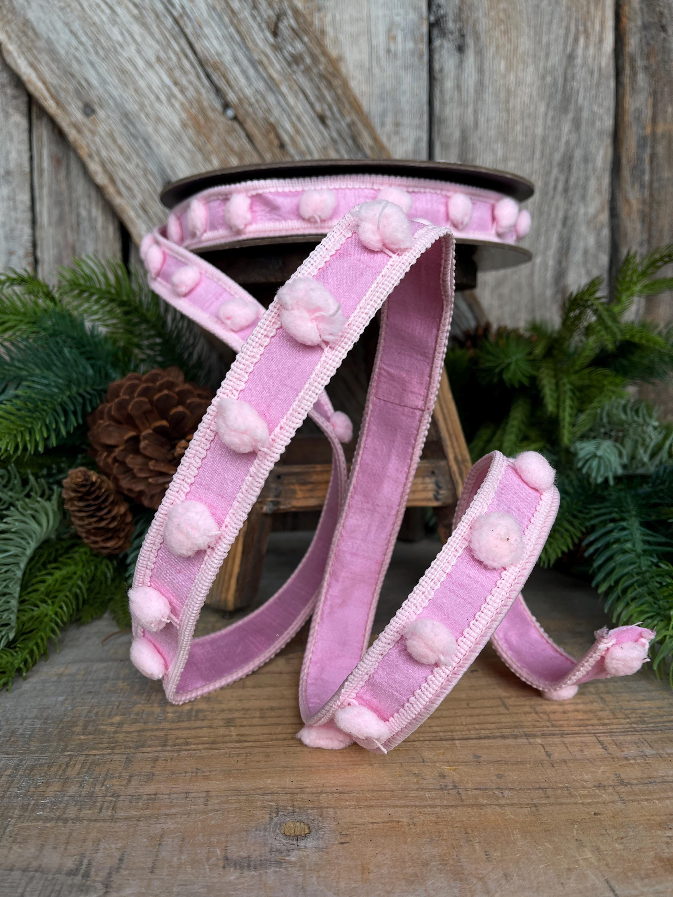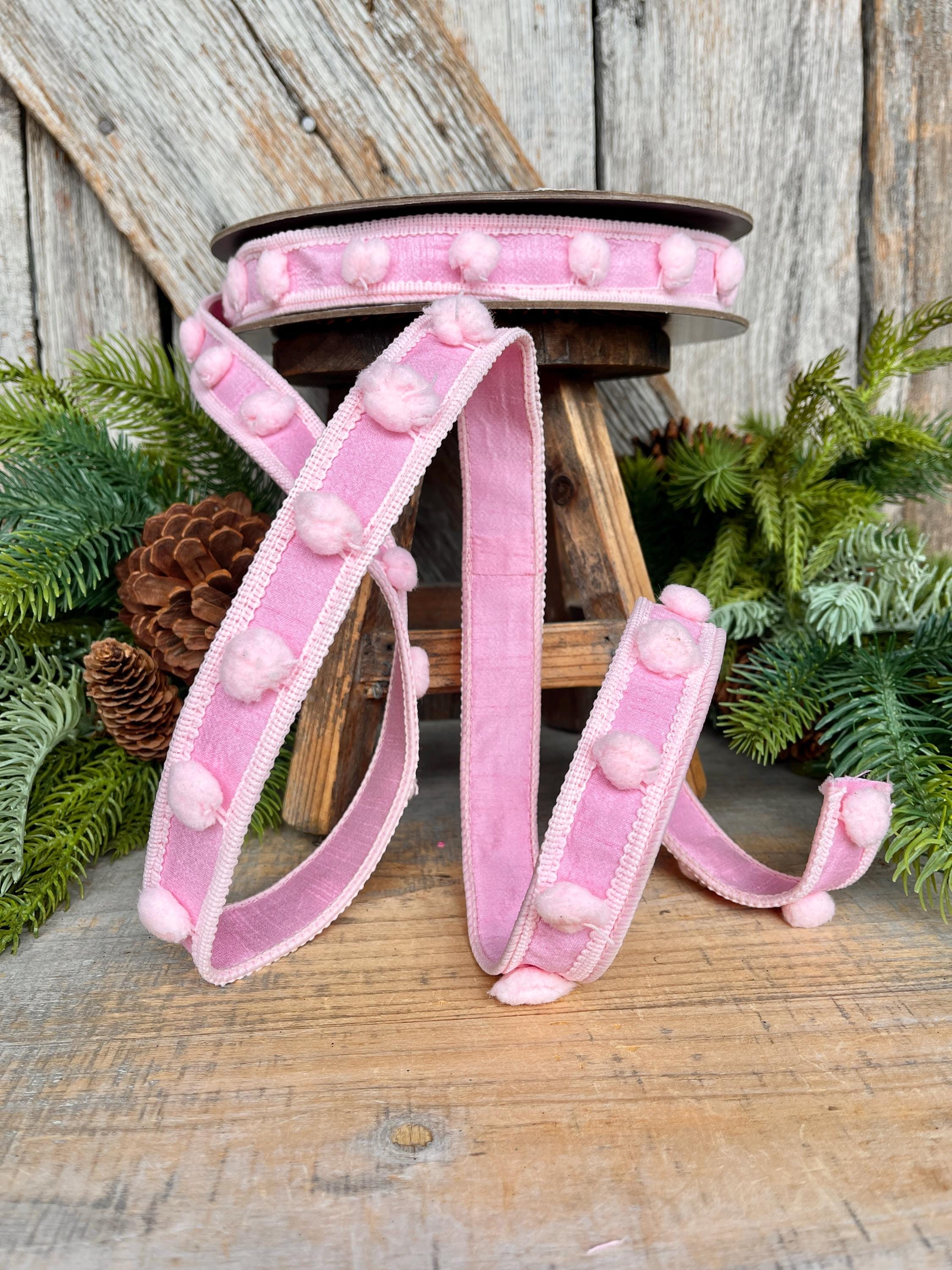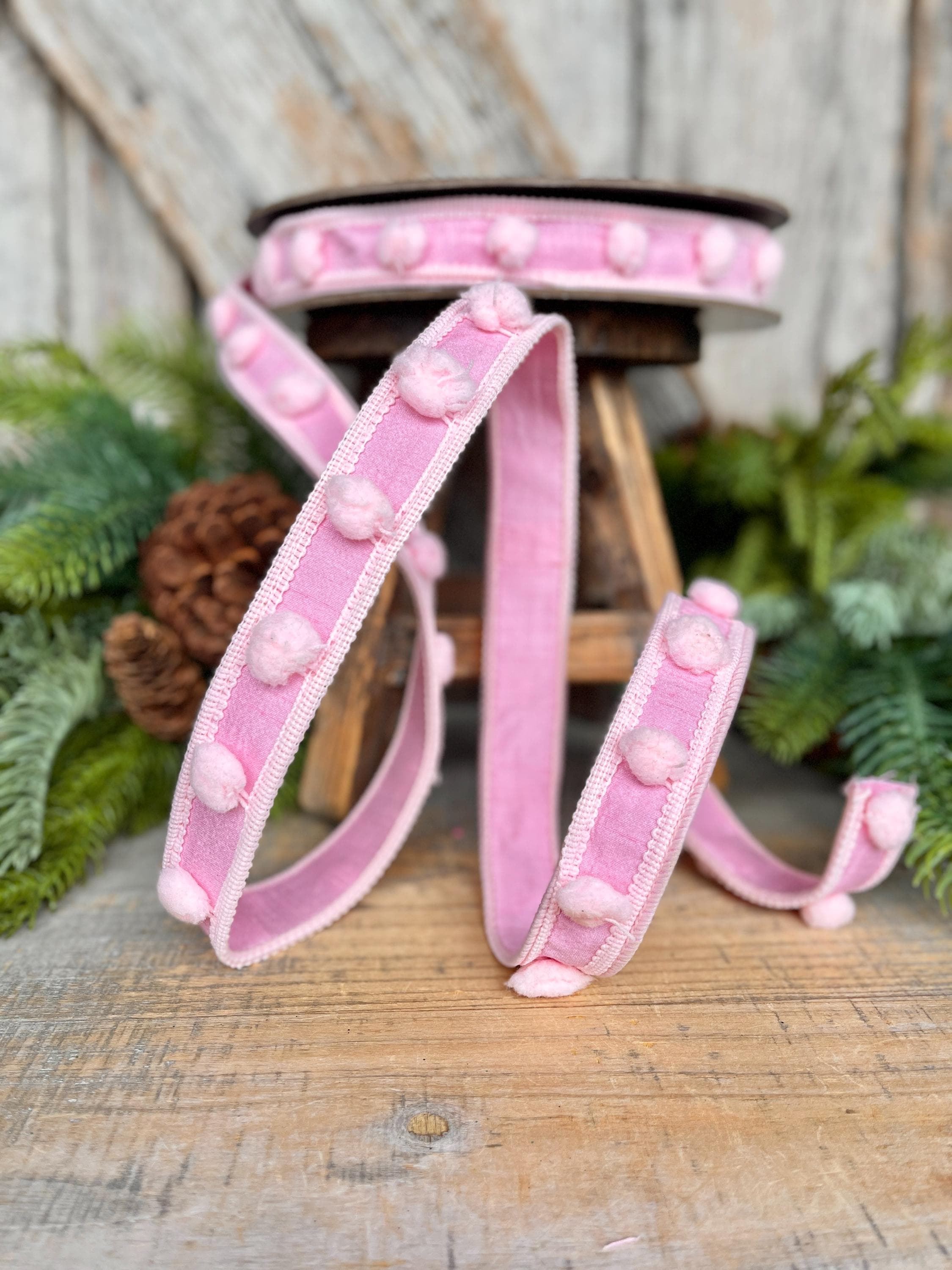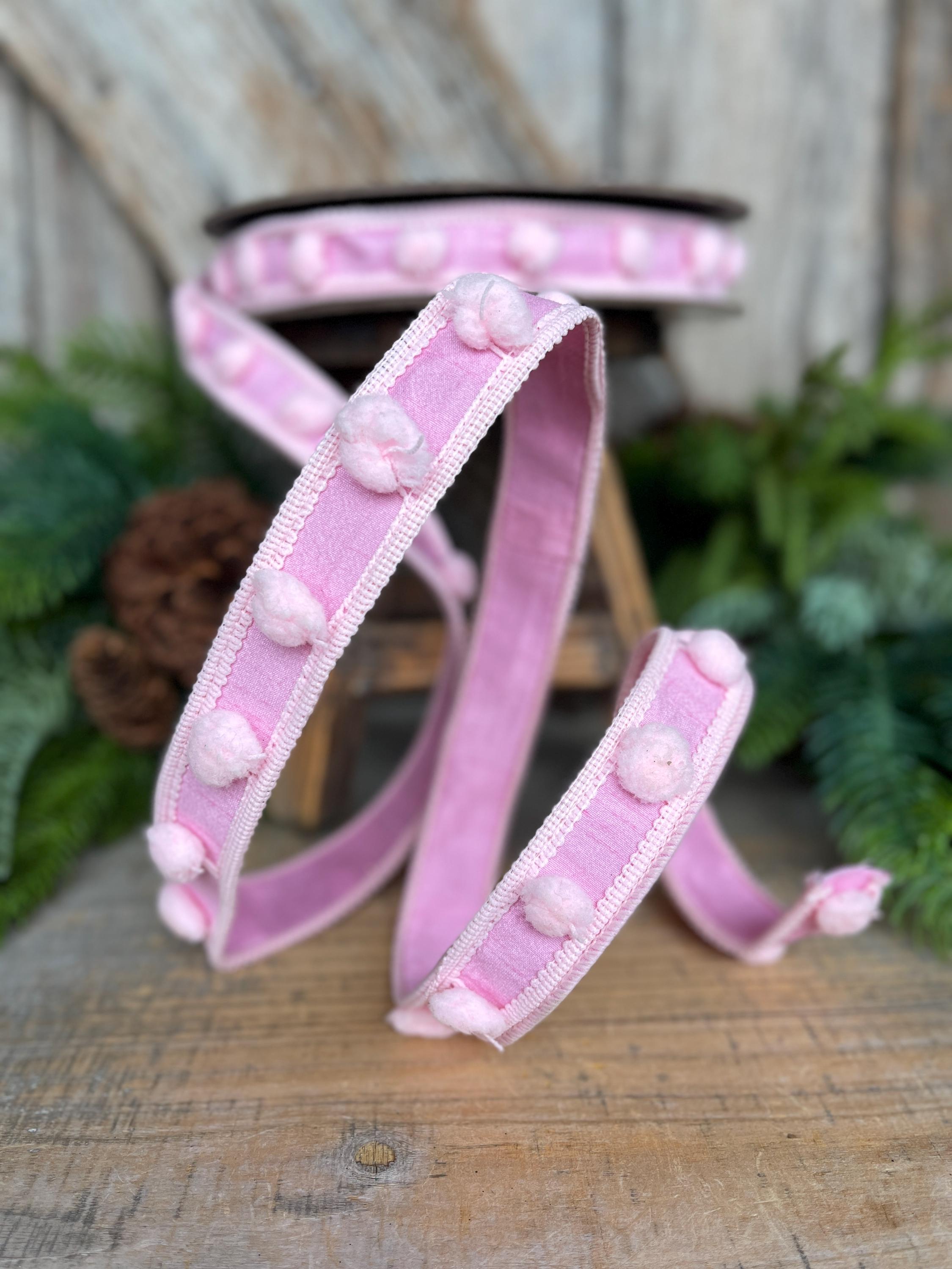 Add a playful, textured accent to your designs with this 1" pink pom pom ribbon. This ribbon features a soft woven fabric center with plush pom poms along the edges and wired sides for easy shaping and full, professional bows.