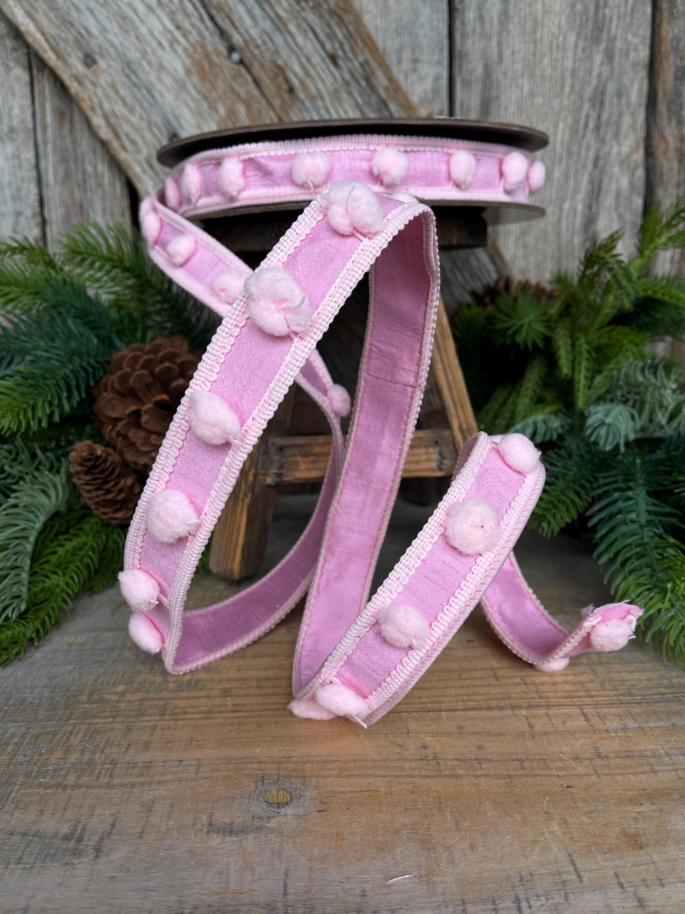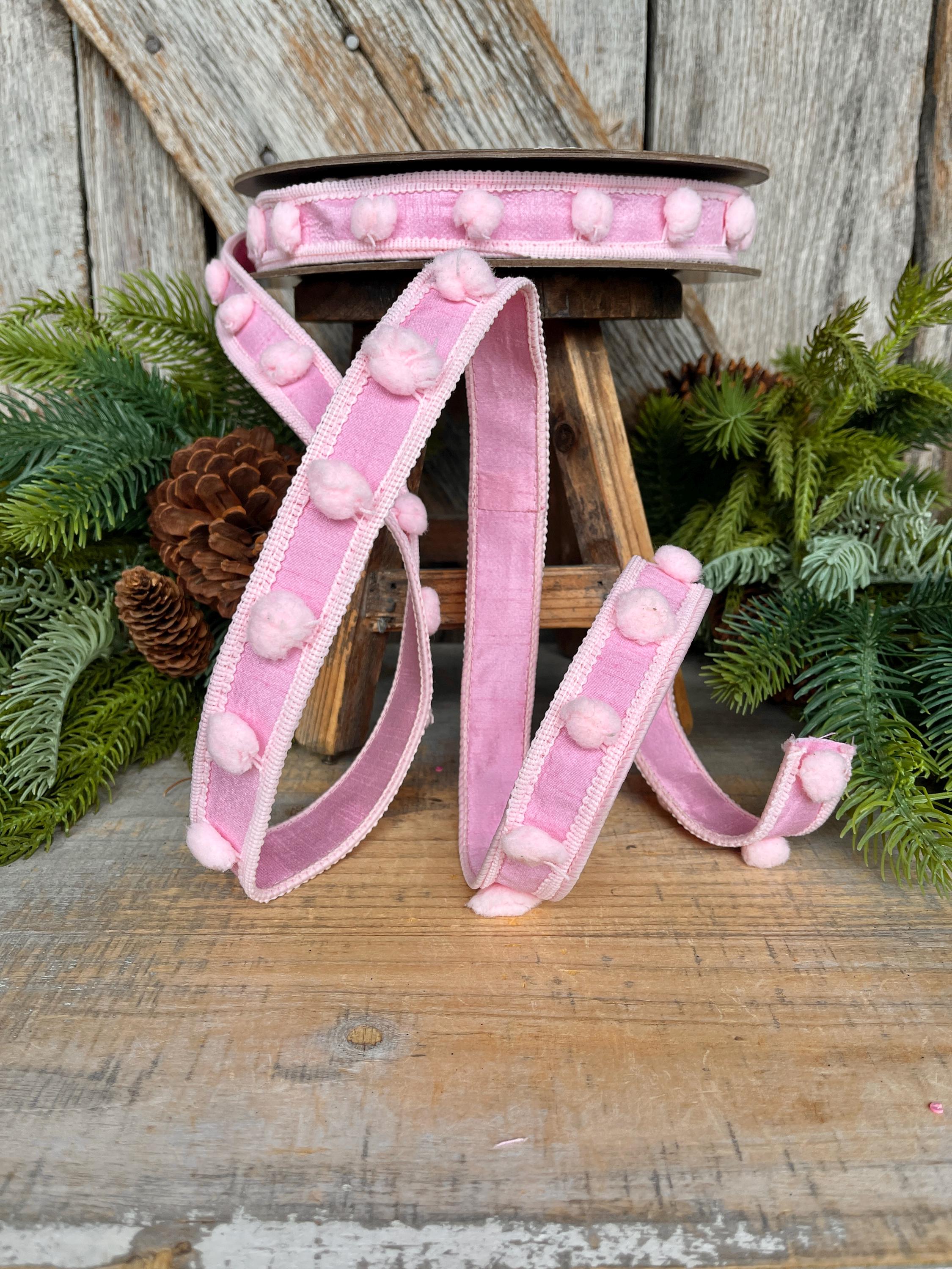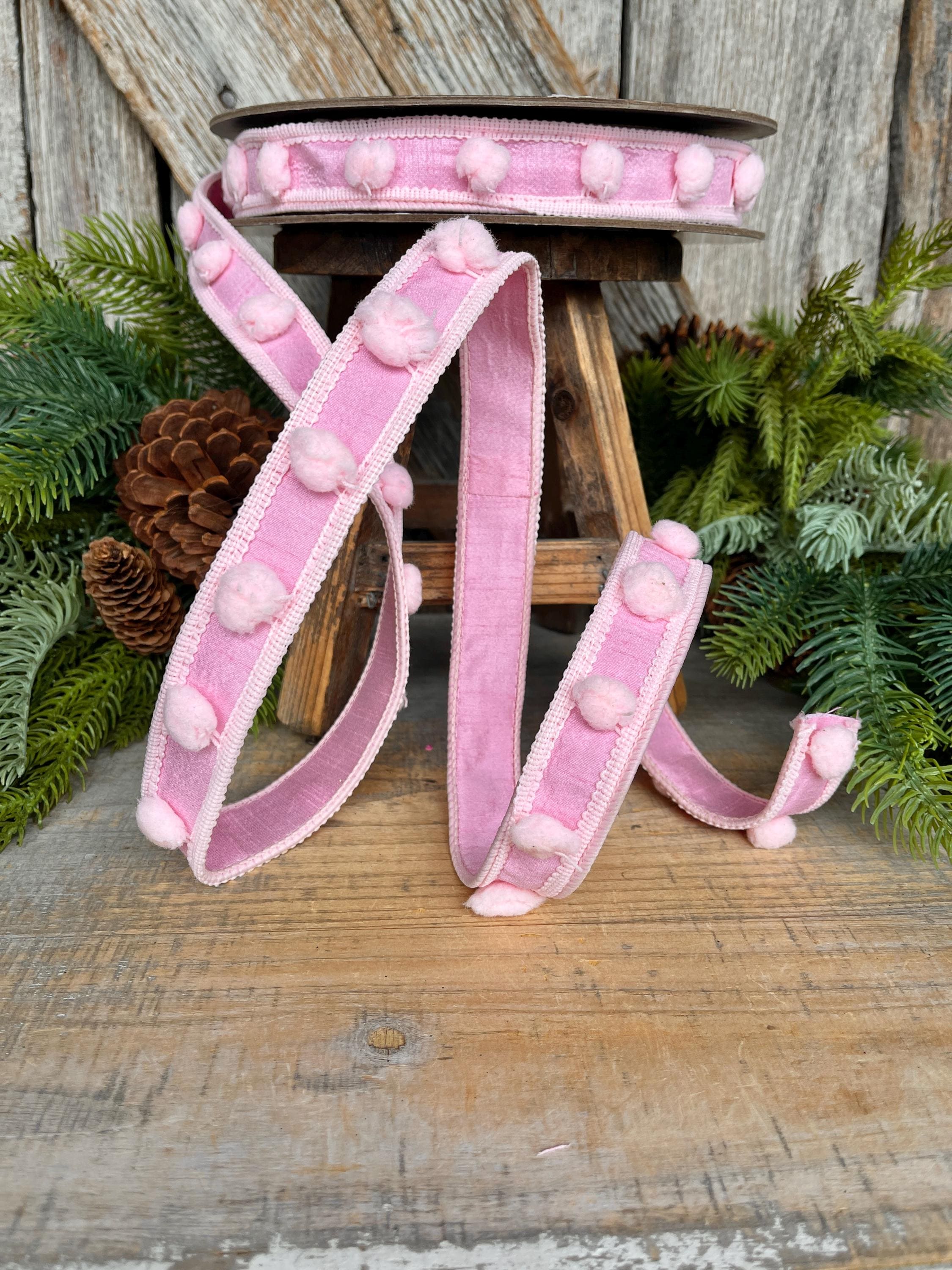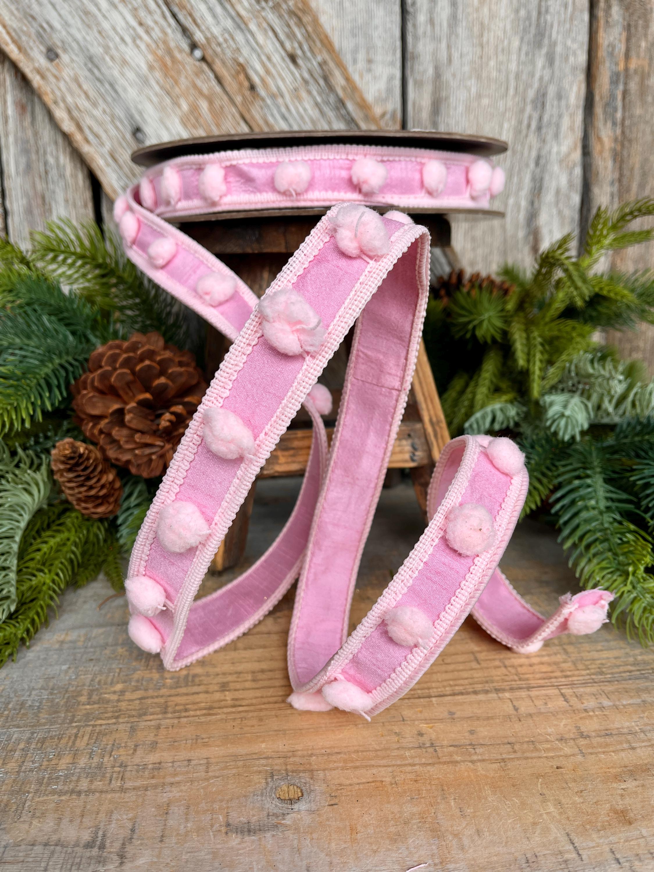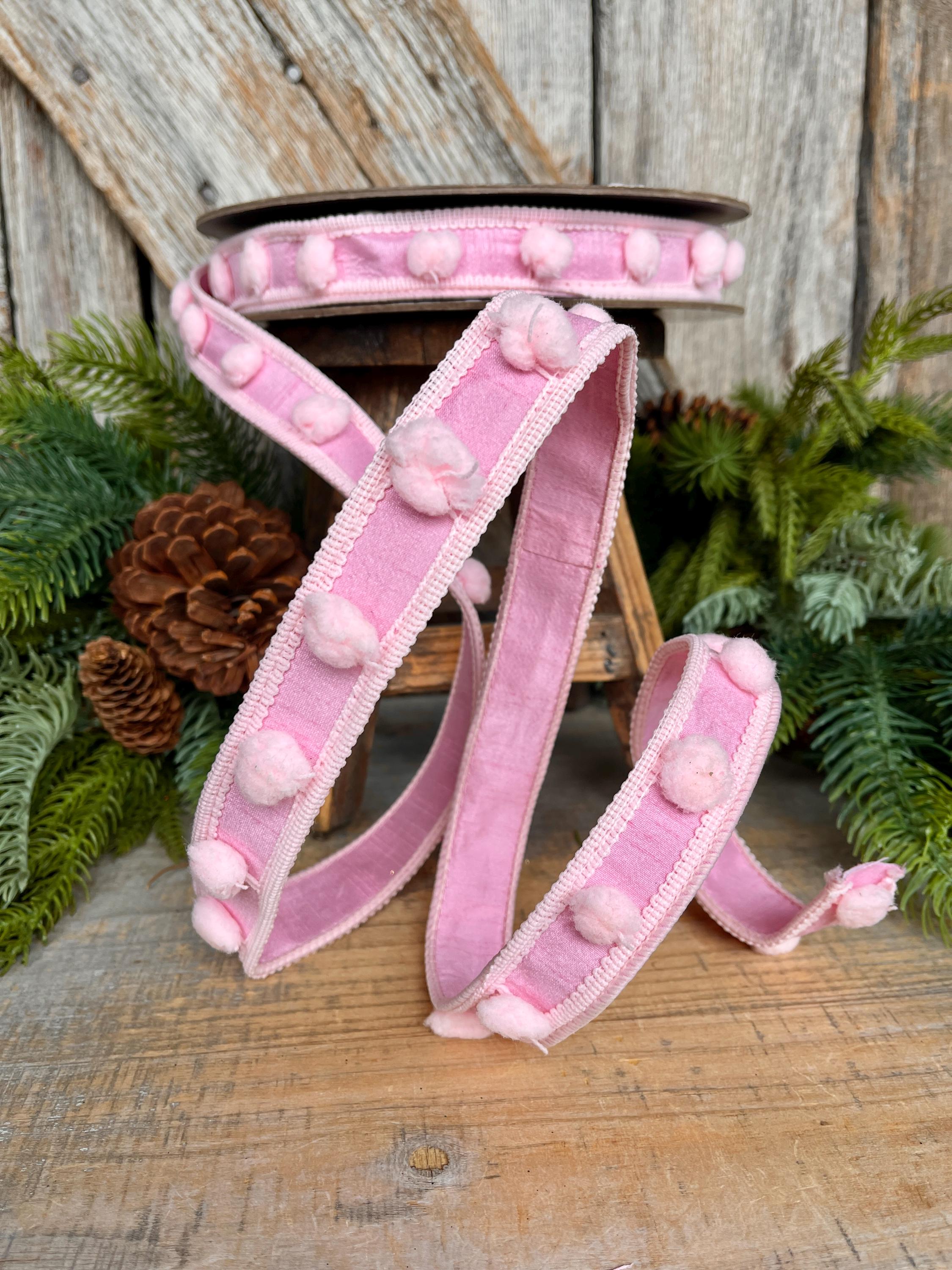 Add a playful, textured accent to your designs with this 1" pink pom pom ribbon. This ribbon features a soft woven fabric center with plush pom poms along the edges and wired sides for easy shaping and full, professional bows.