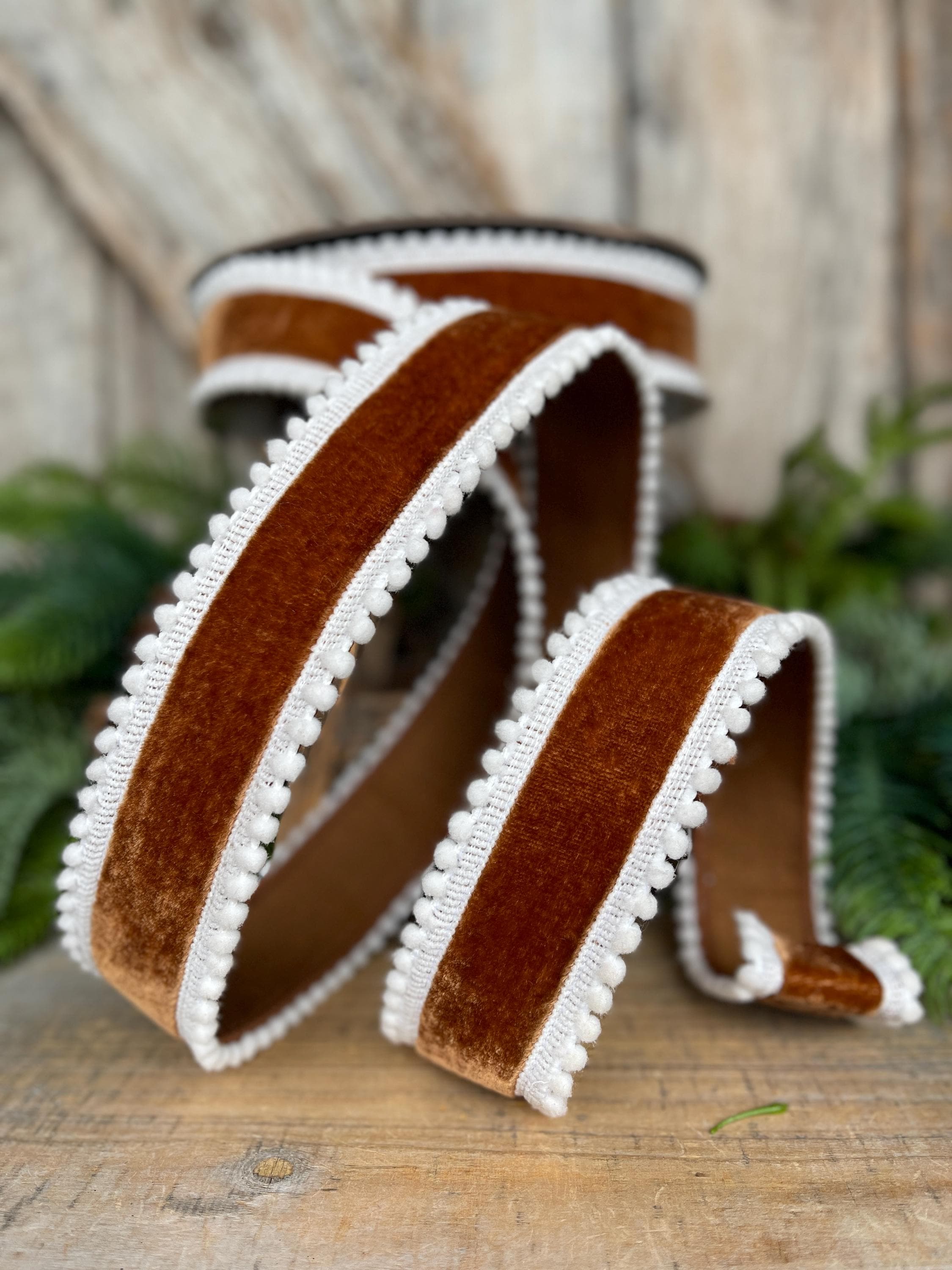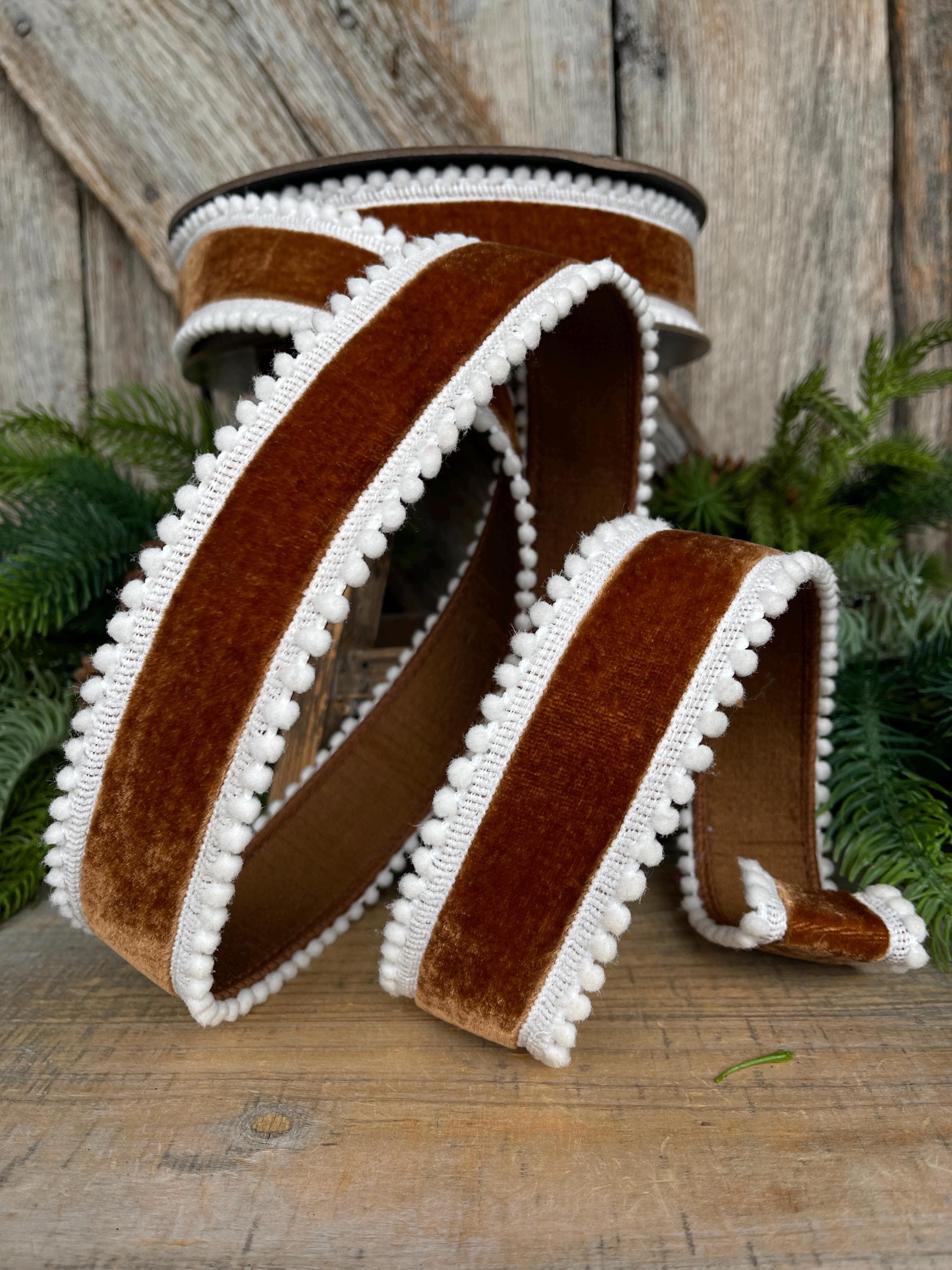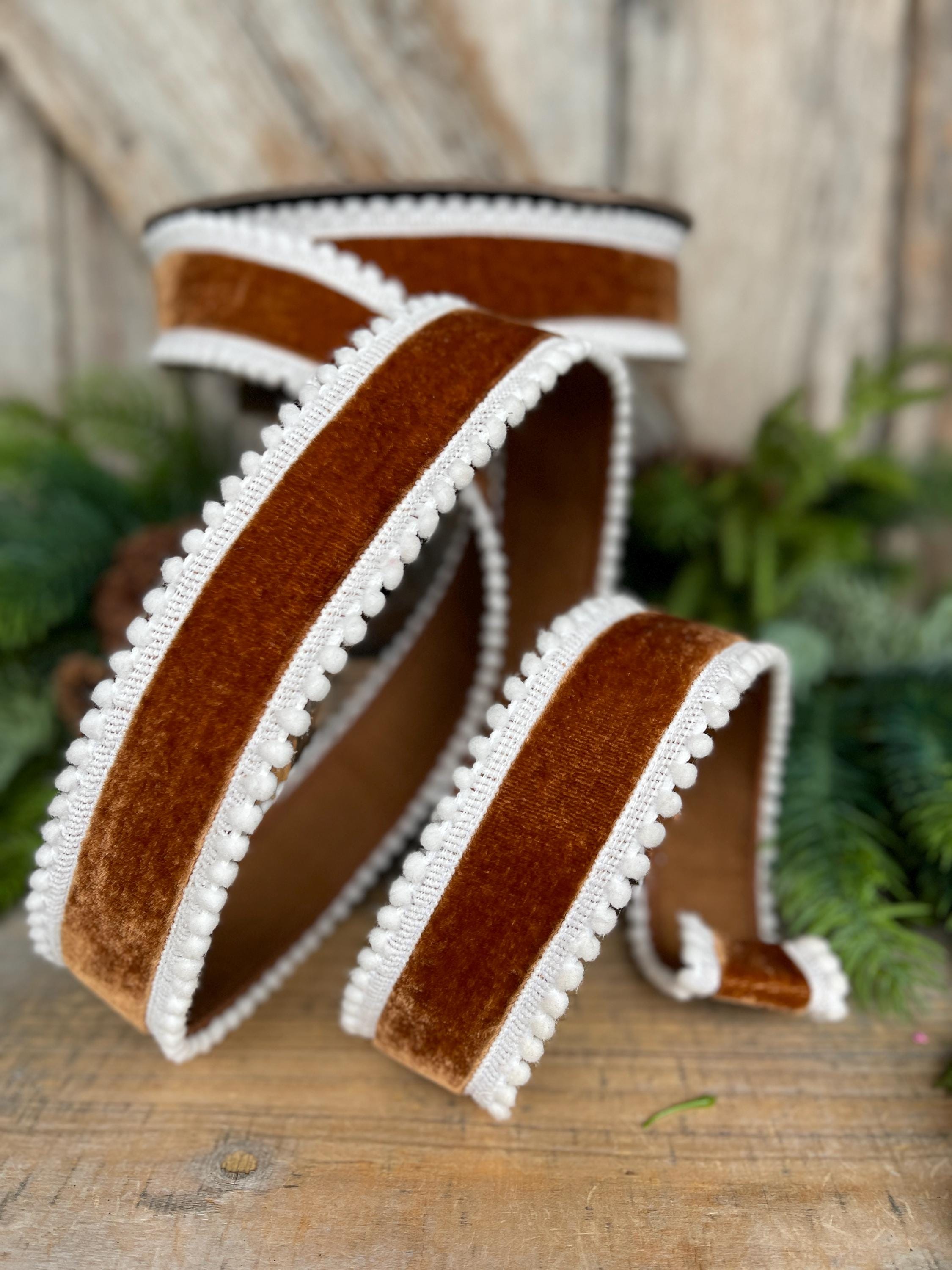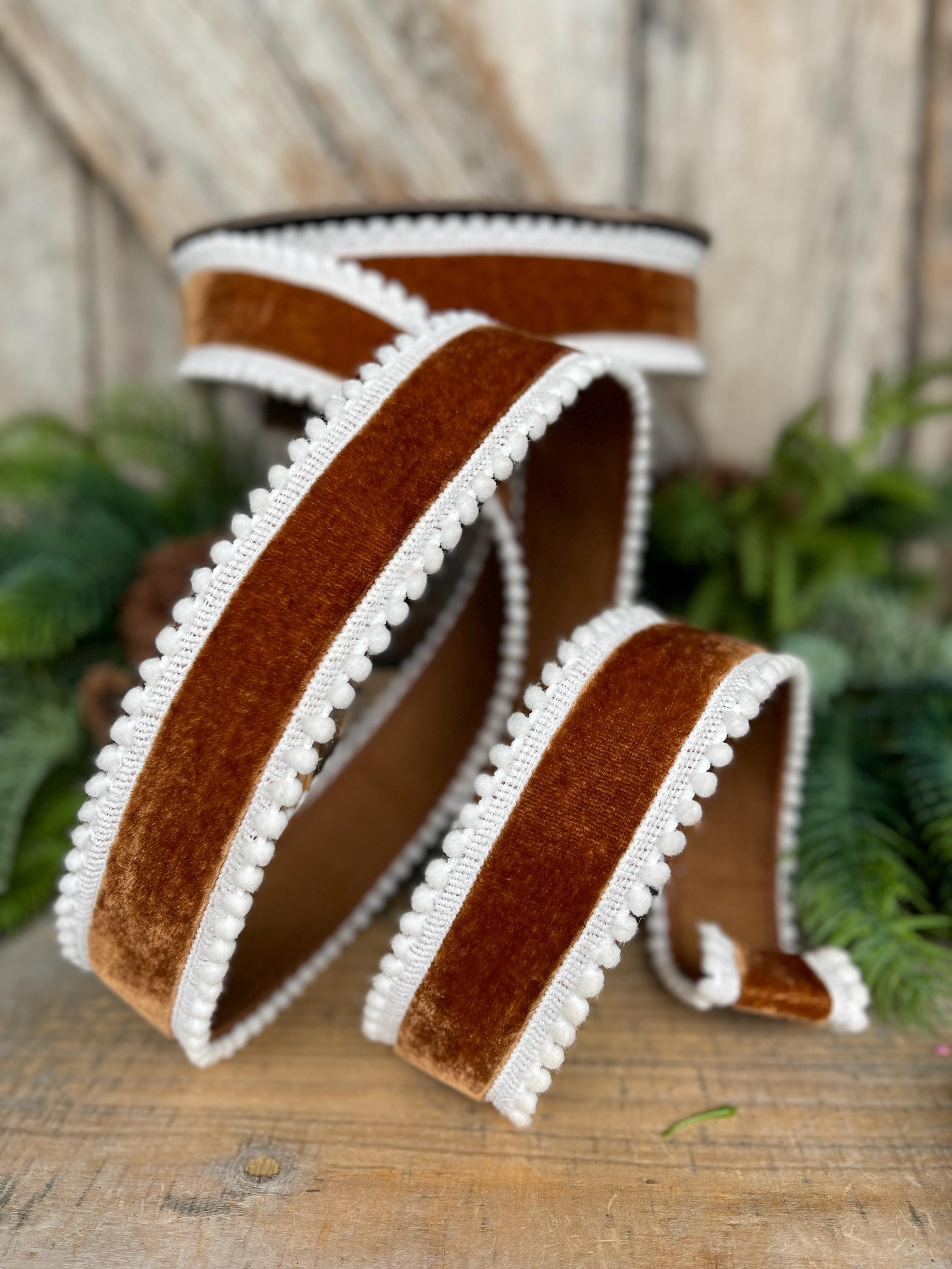 Add rich, cozy texture to your holiday designs with this 1.5 inch chocolate brown gingerbread ribbon. Featuring a soft faux suede finish and a white pom pom edge, this wired ribbon holds its shape beautifully—perfect for bows, wreaths, garlands, tree décor, and gift wrapping.