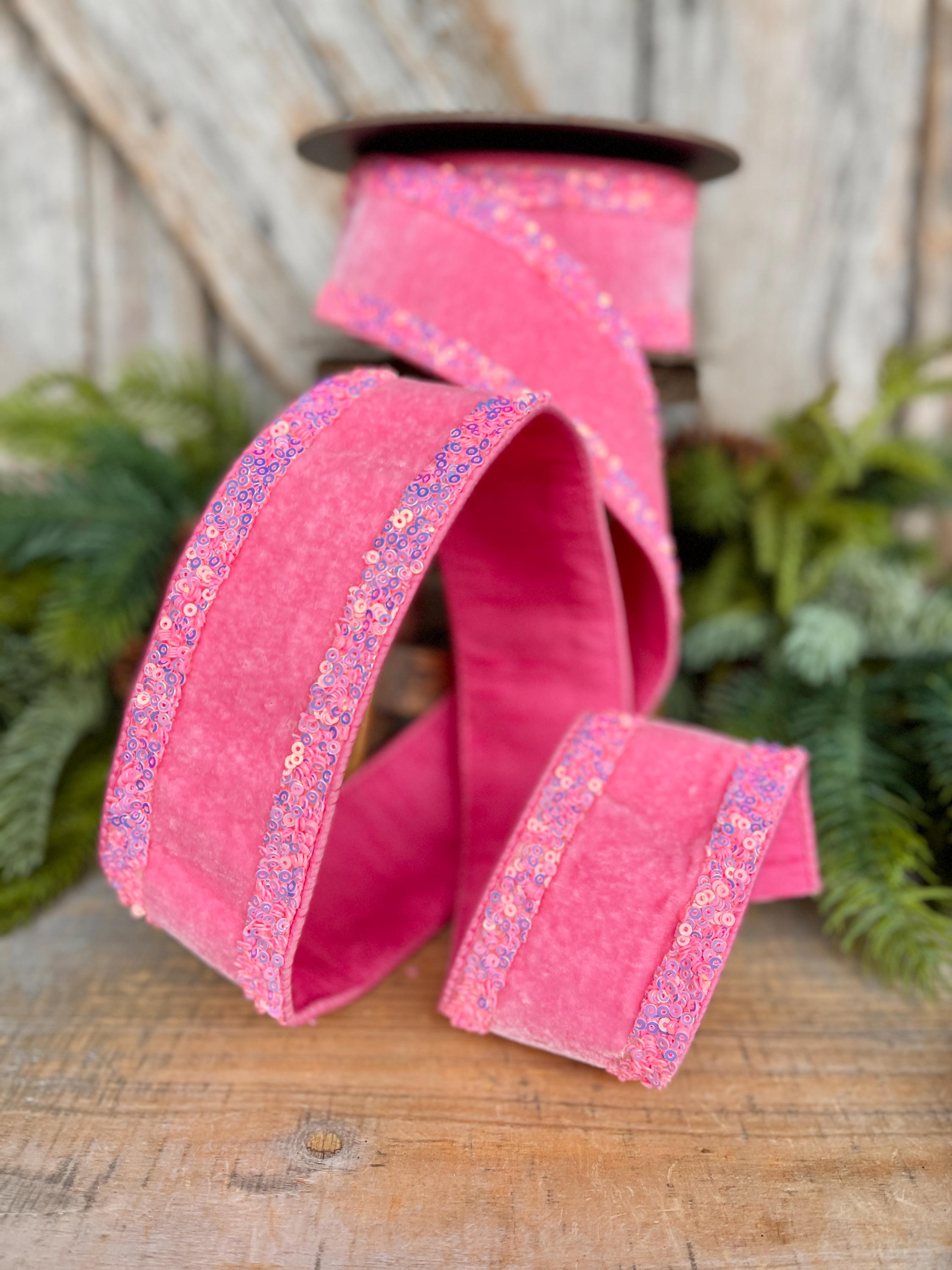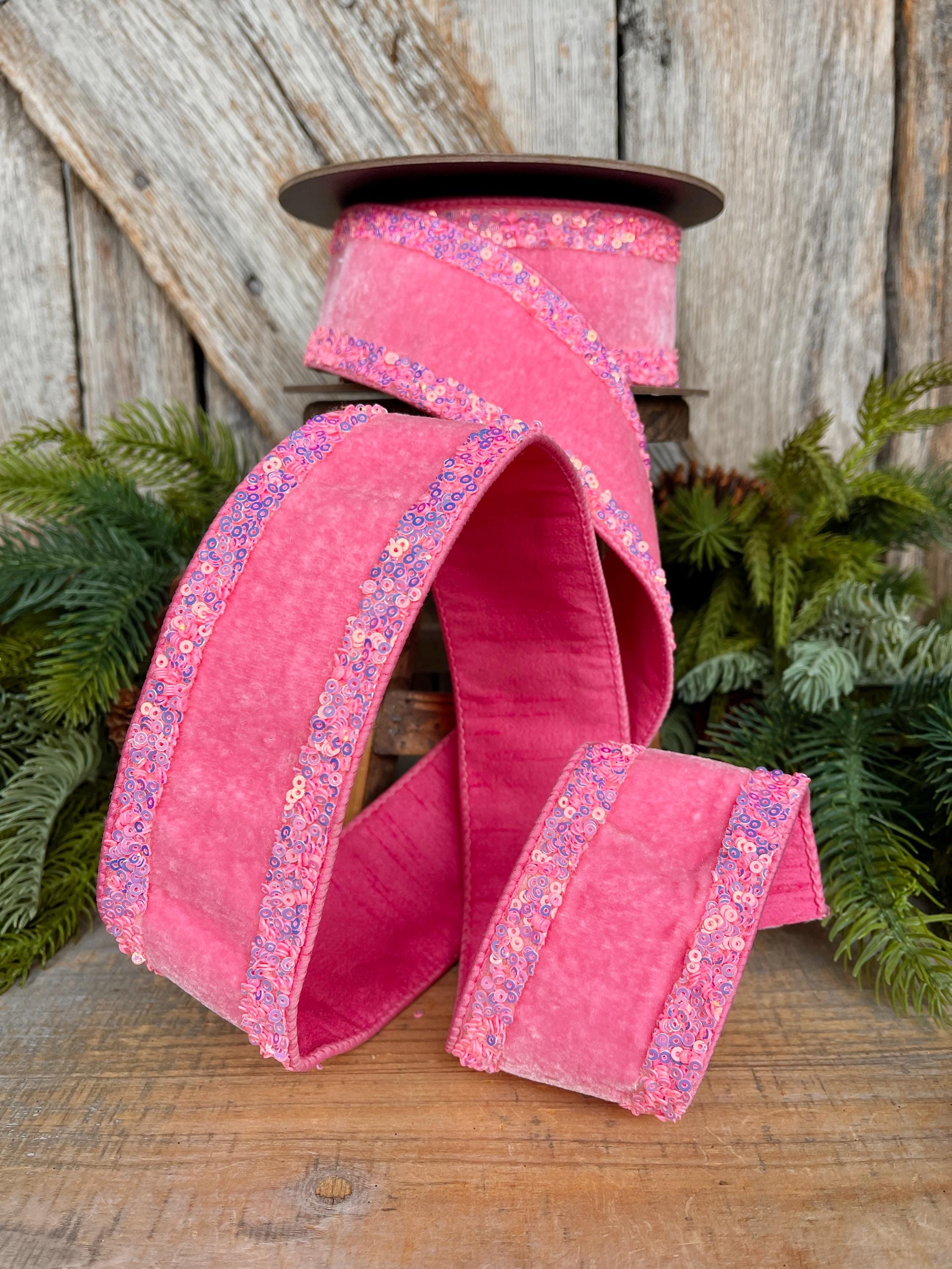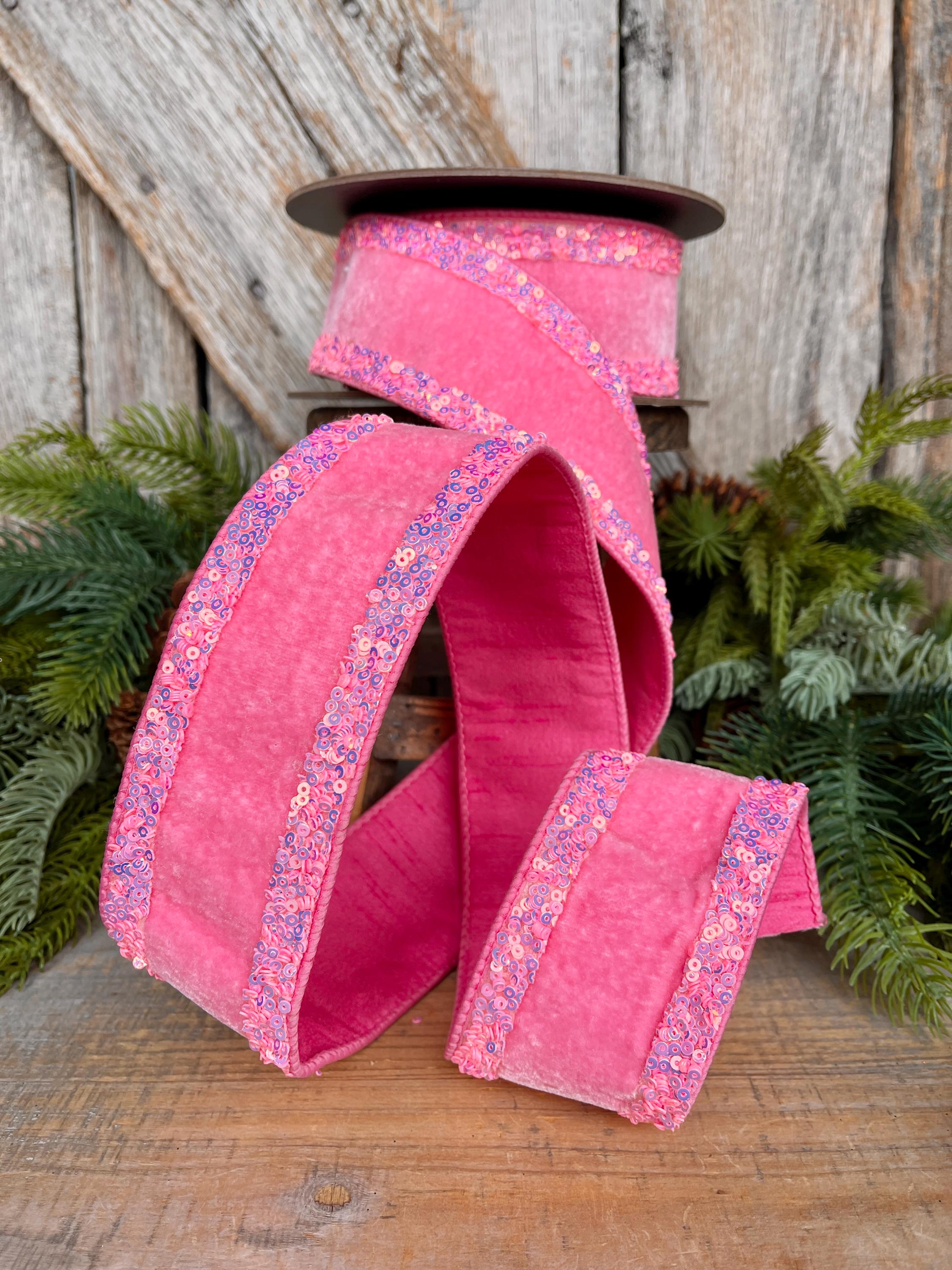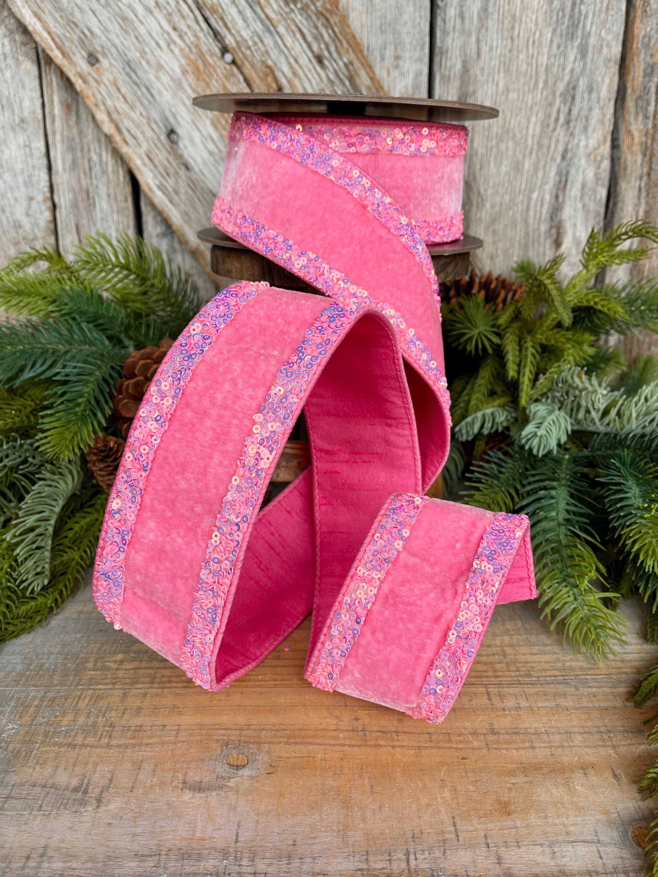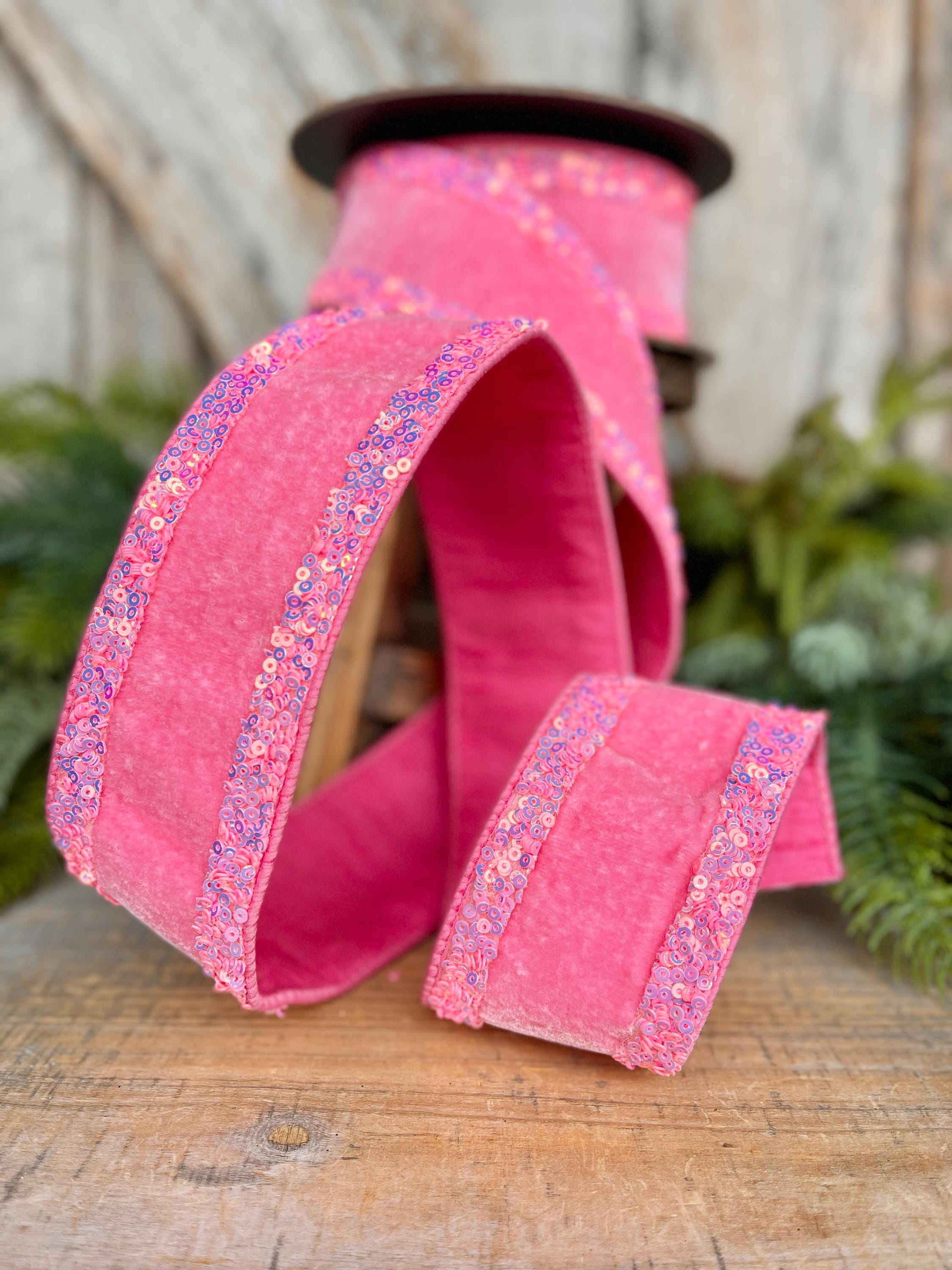 2.5" Pink Velvet Ribbon, Bubblegum Pink Ribbon with Iridescent Border