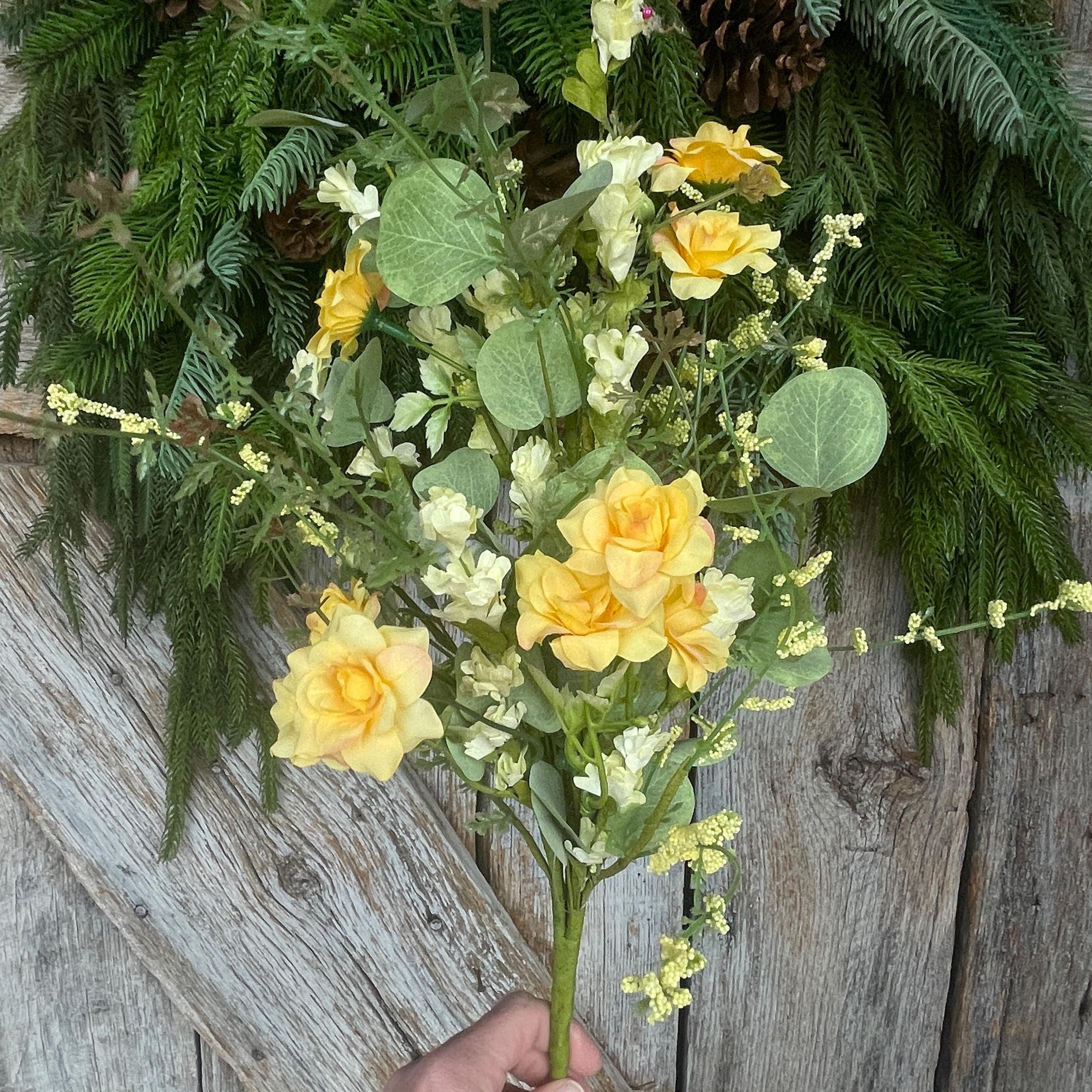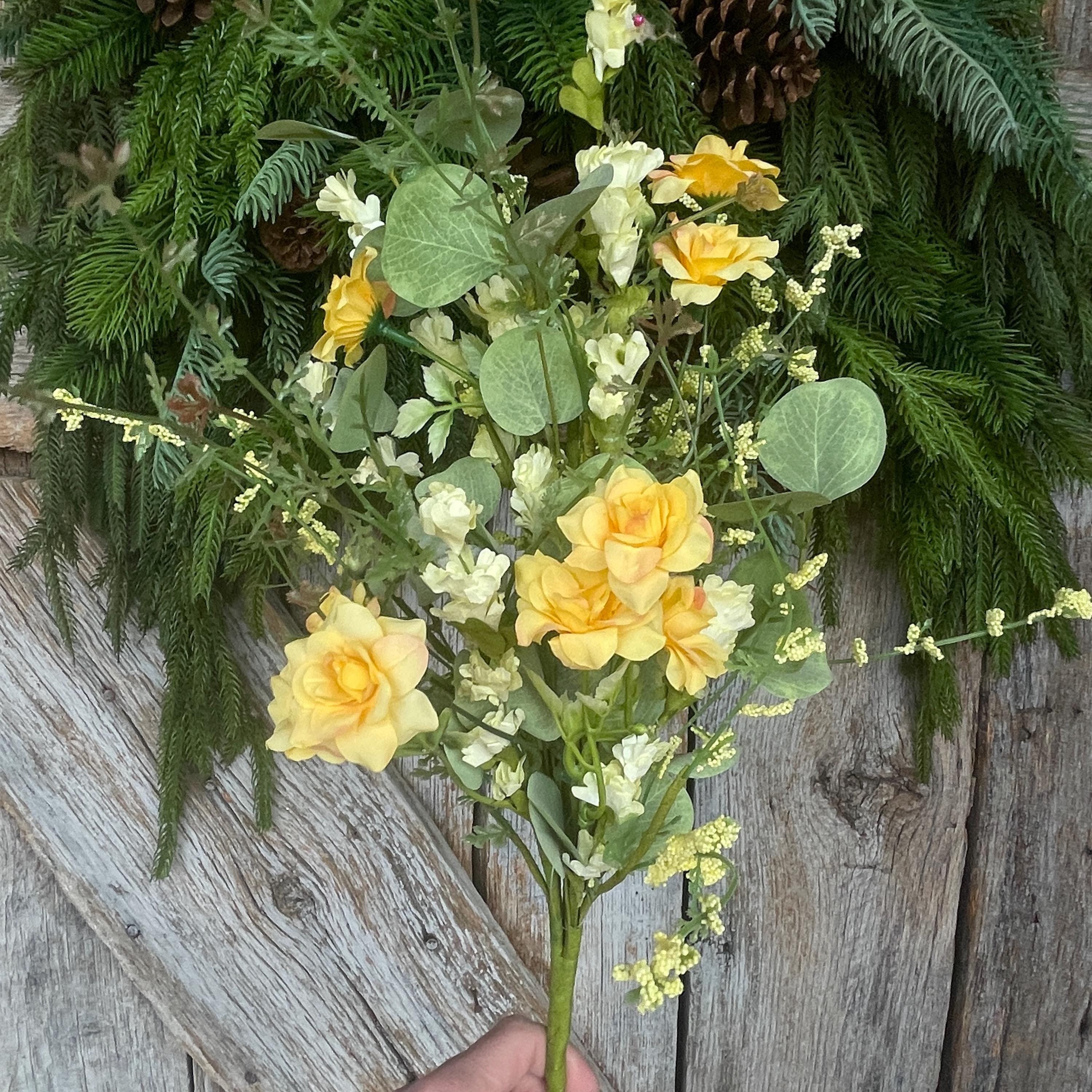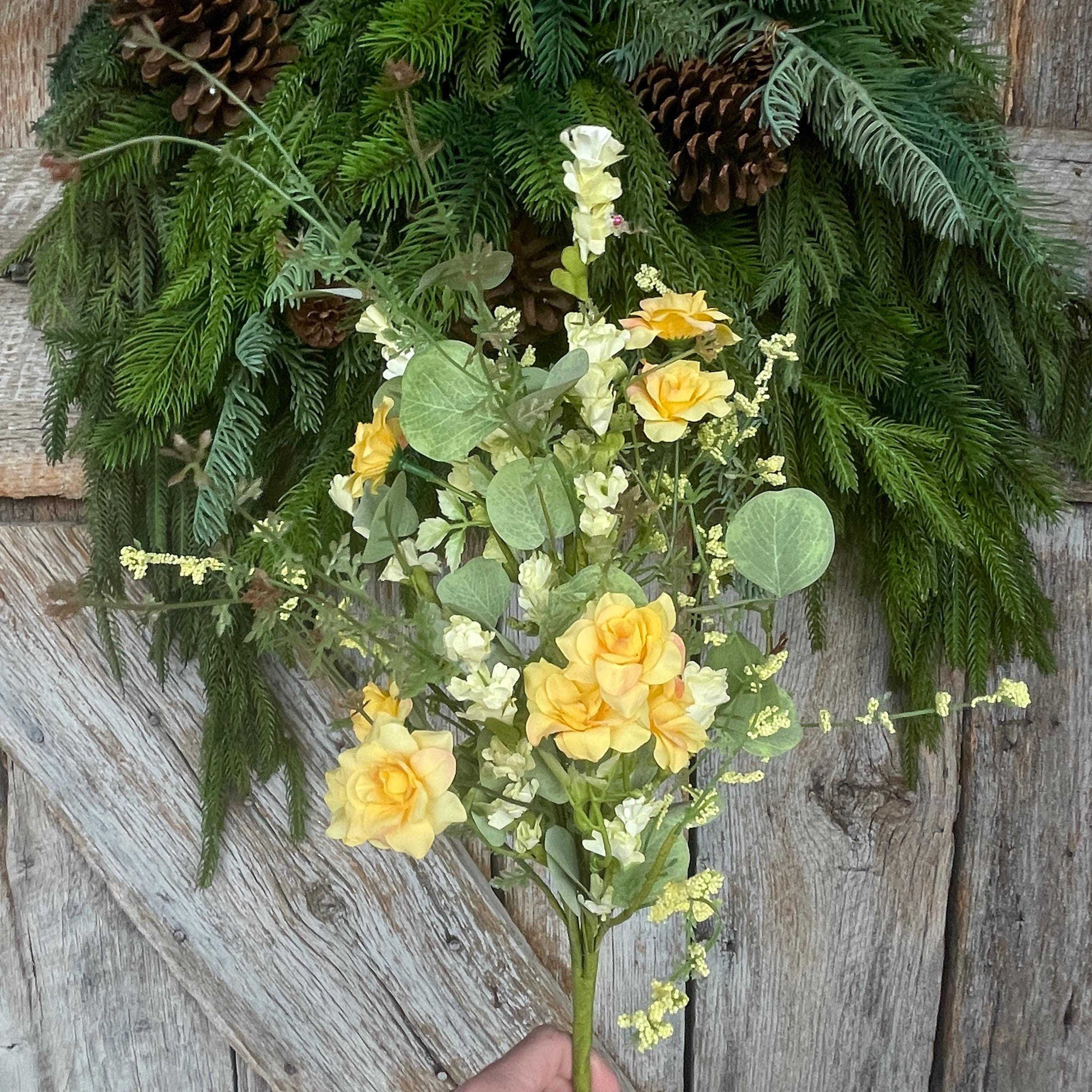 Bring soft, airy color to your designs with this 20 inch mixed wildflower bush in calming shades of yellow and soft greenery. Featuring layered rose-style blooms, delicate filler sprigs, and natural-looking leaves, this floral bush adds effortless charm to wreaths, arrangements, and seasonal décor.