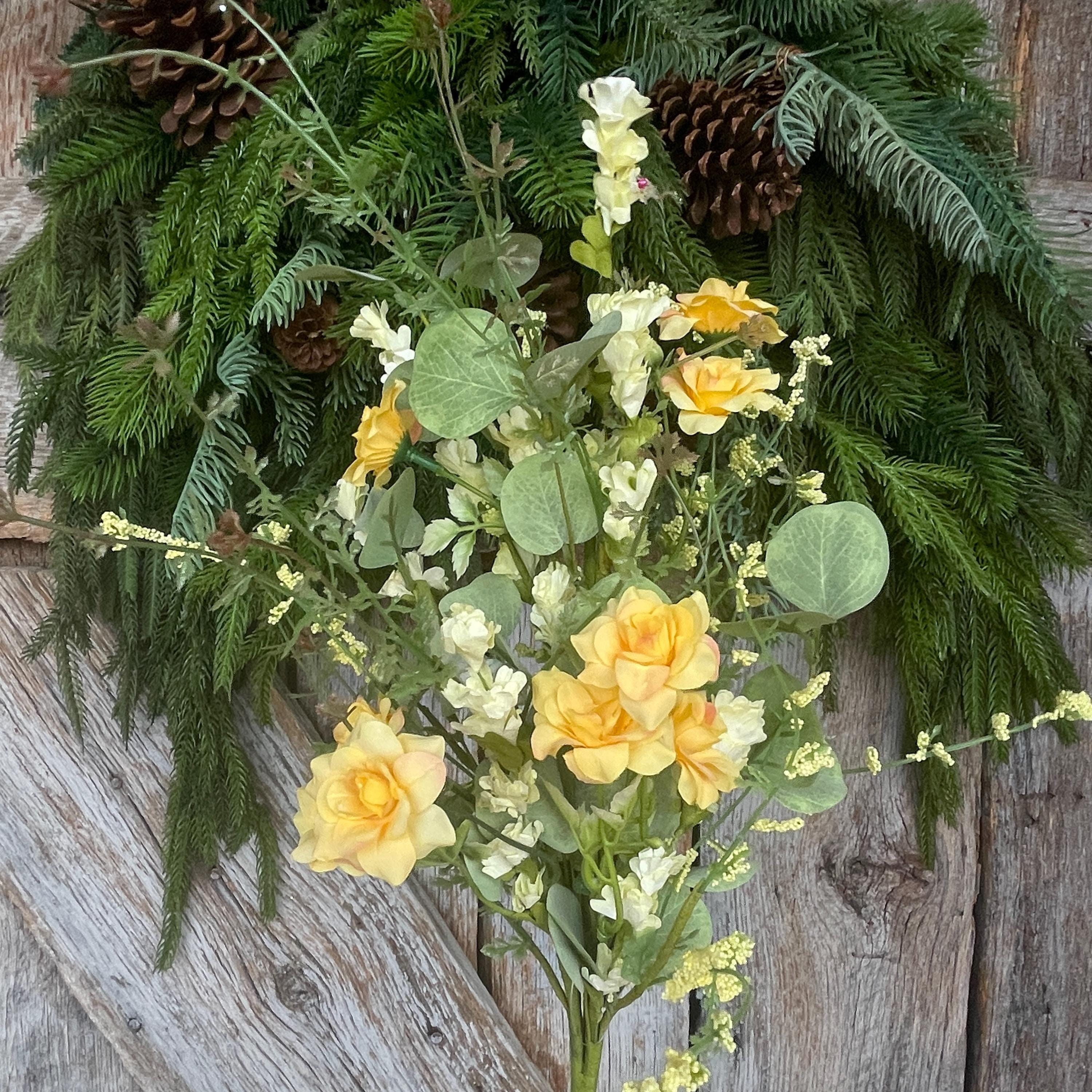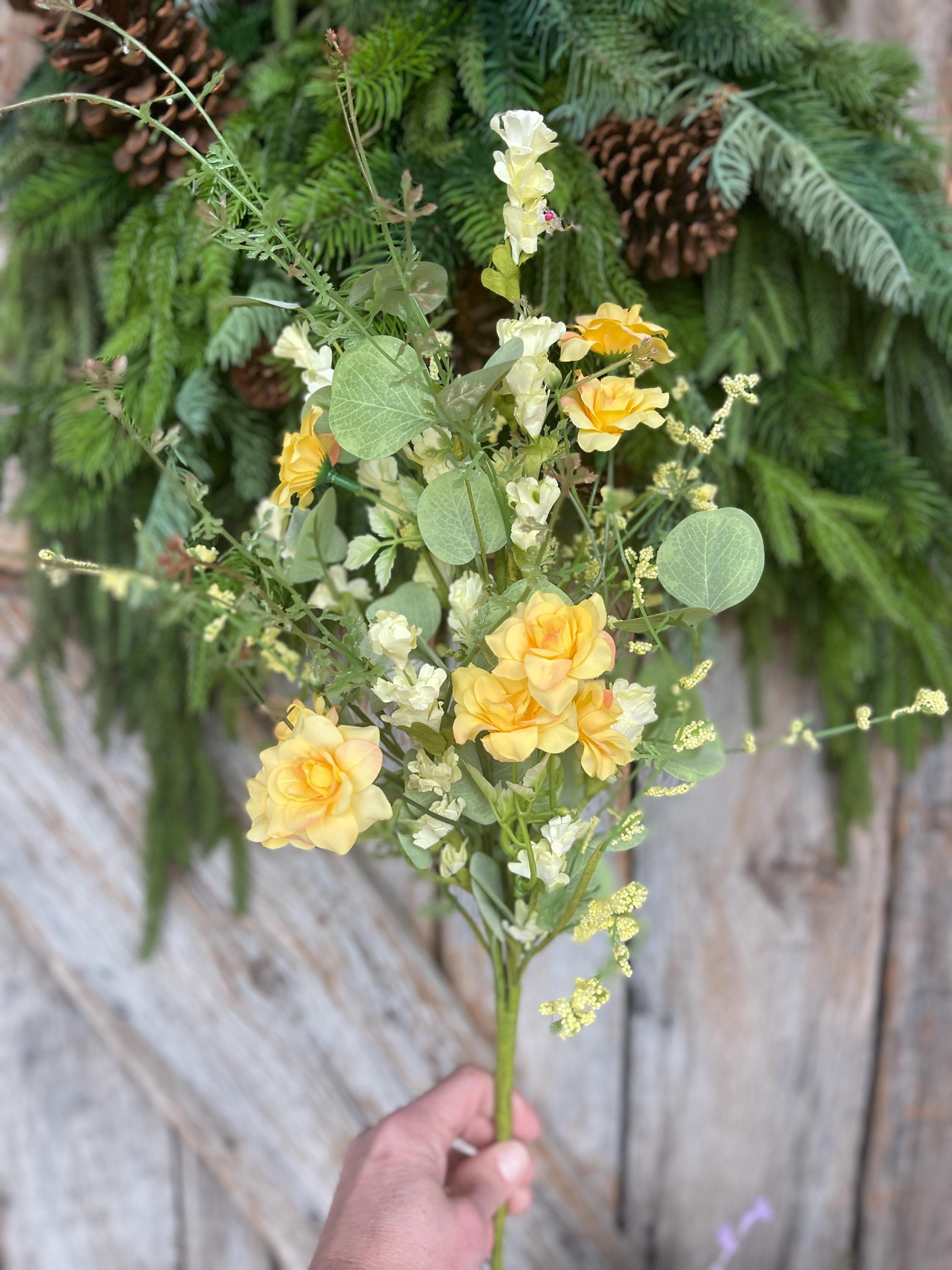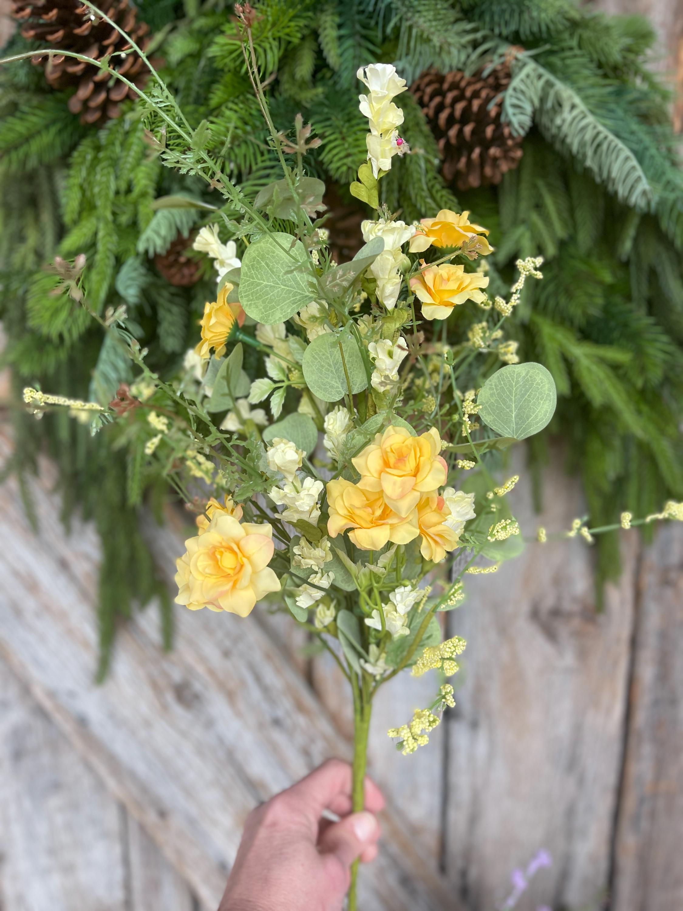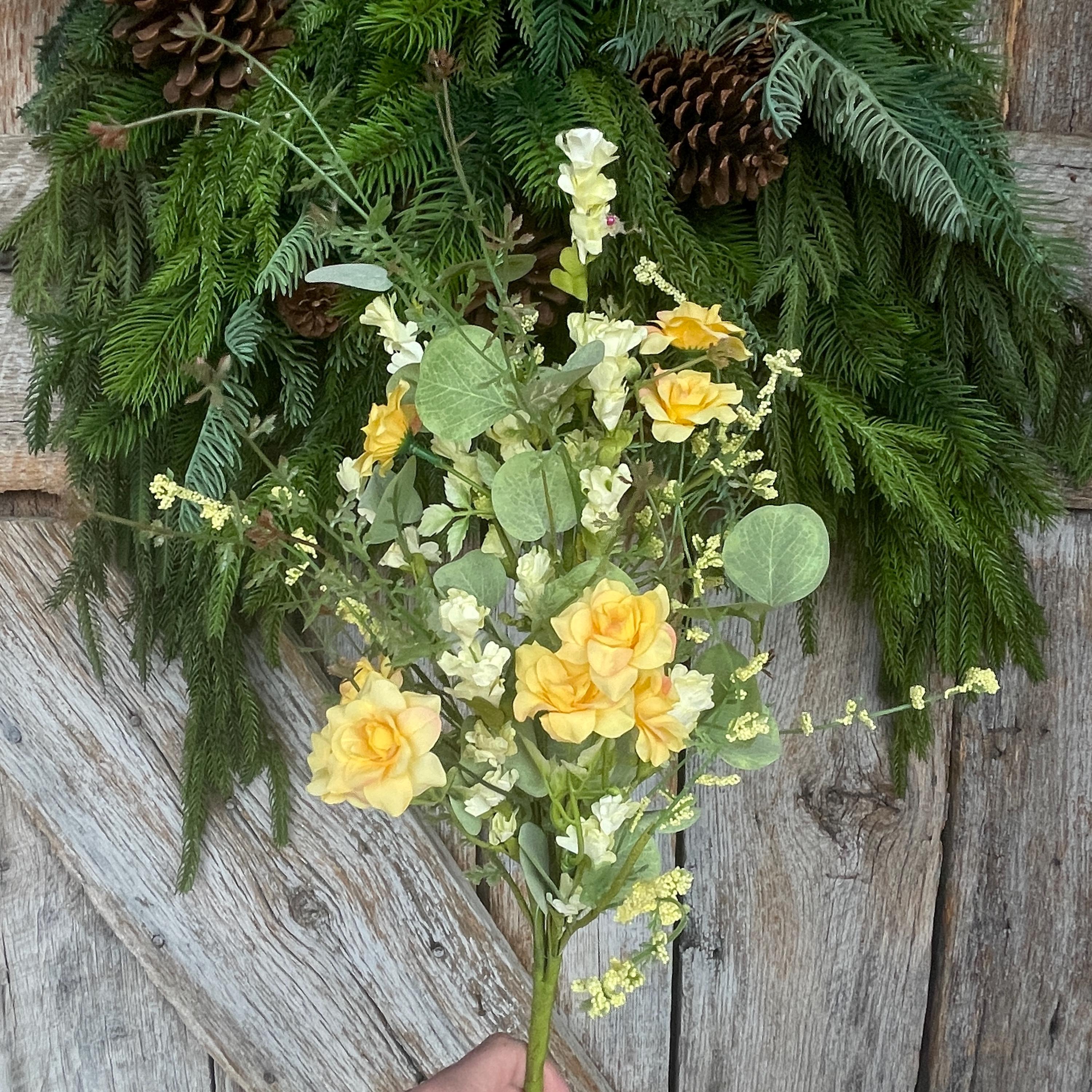 Bring soft, airy color to your designs with this 20 inch mixed wildflower bush in calming shades of yellow and soft greenery. Featuring layered rose-style blooms, delicate filler sprigs, and natural-looking leaves, this floral bush adds effortless charm to wreaths, arrangements, and seasonal décor.