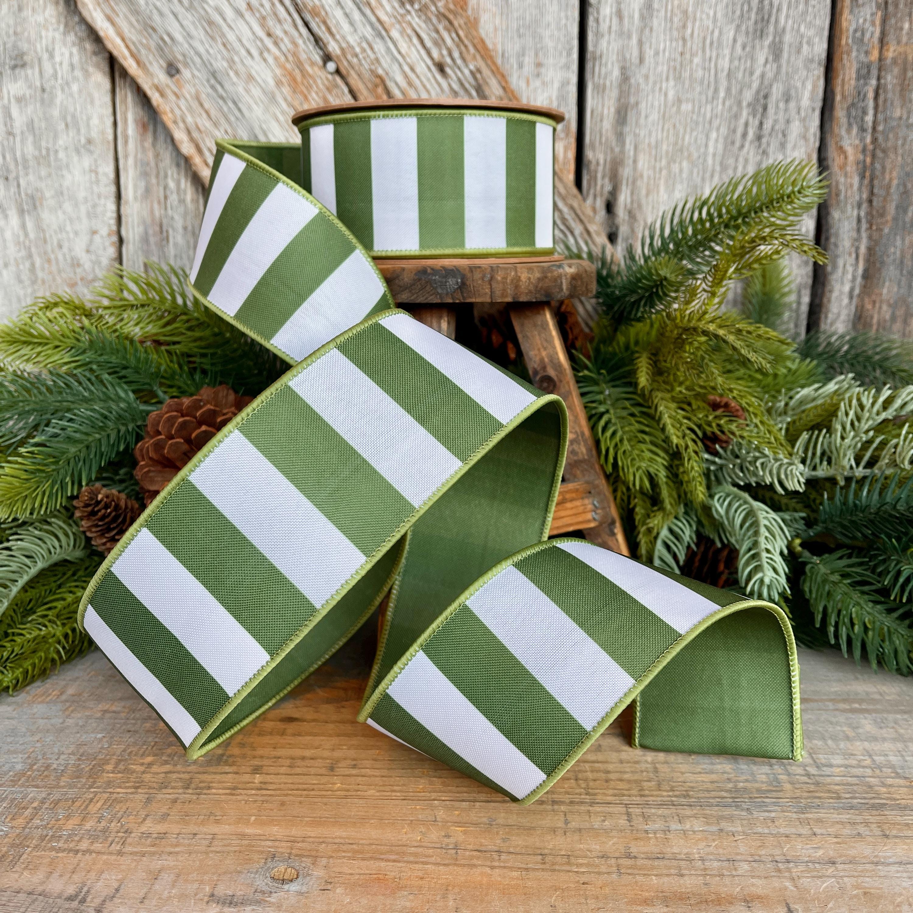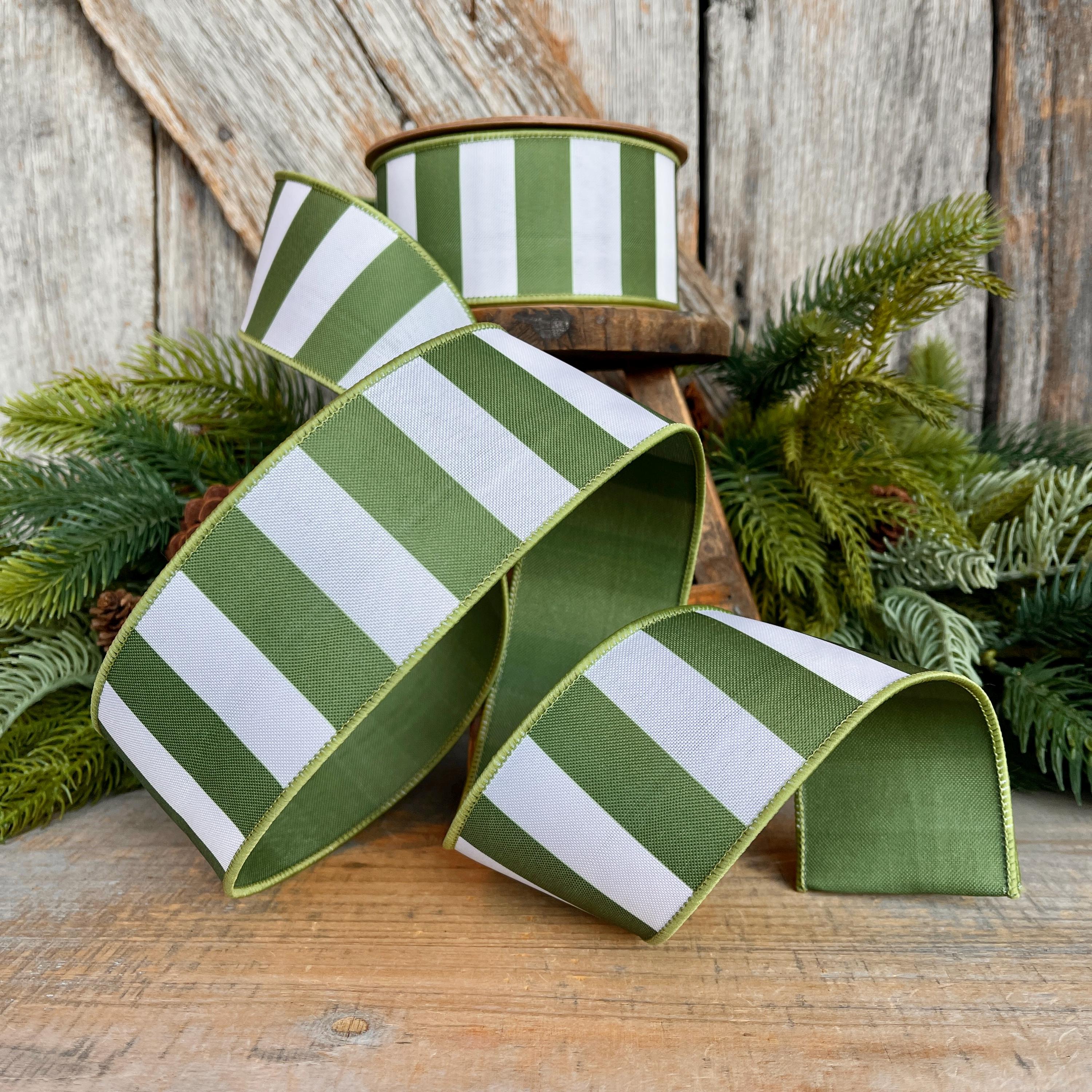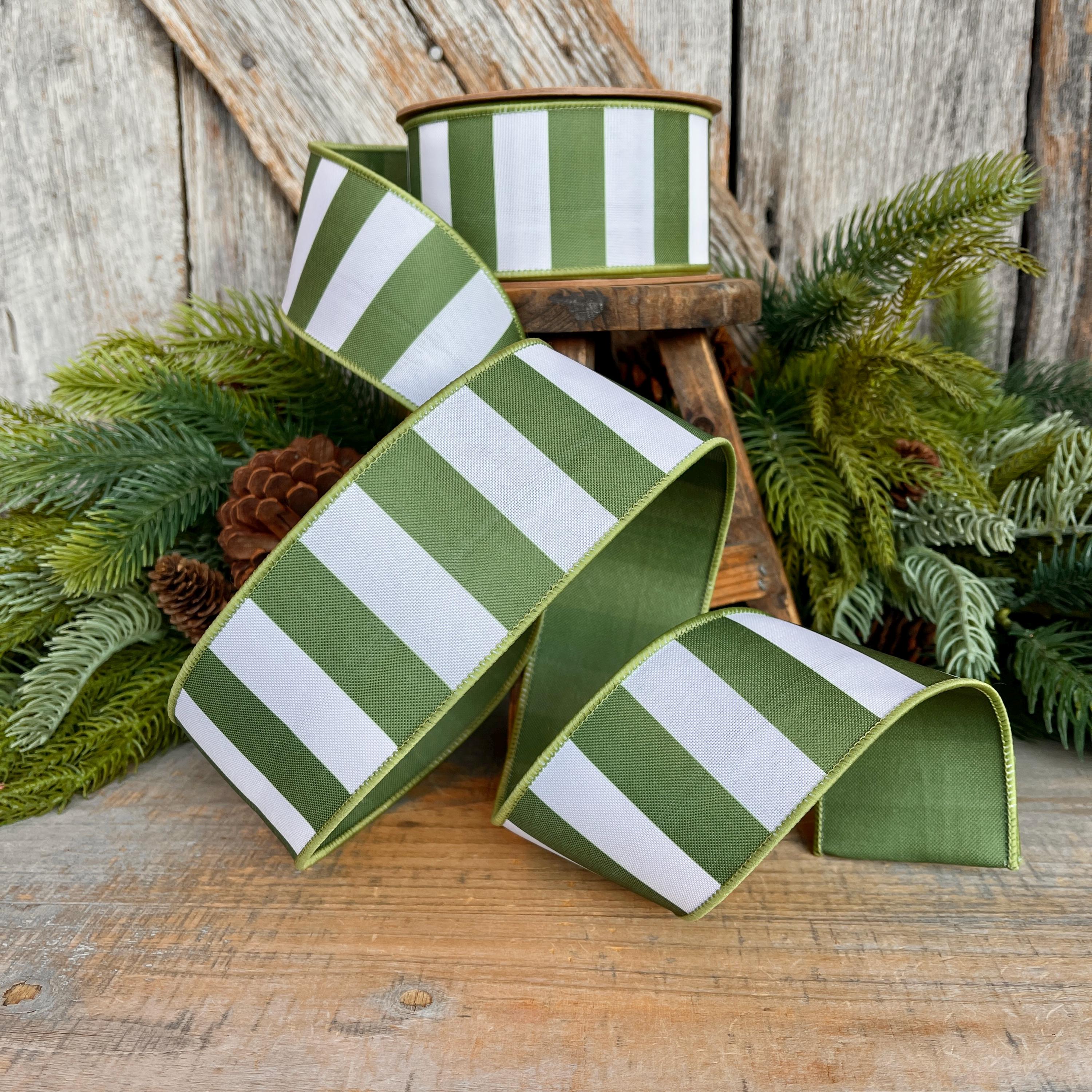Bring timeless charm to your seasonal designs with this 1.5 inch moss green striped ribbon. Featuring crisp green and white stripes with a soft woven texture and wired edges, this ribbon holds its shape beautifully—perfect for bows that stay full and elegant.