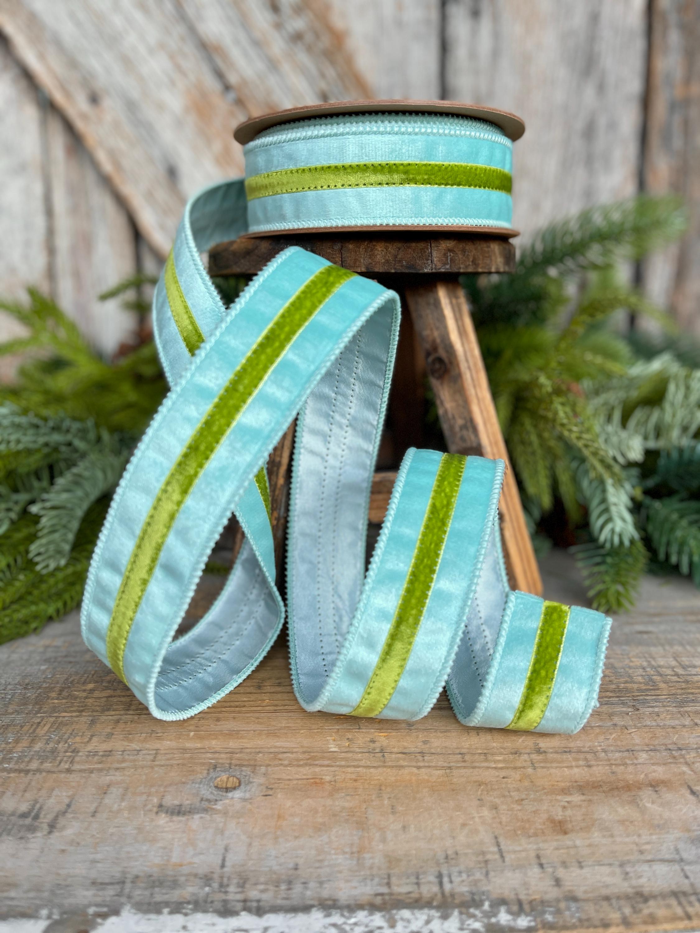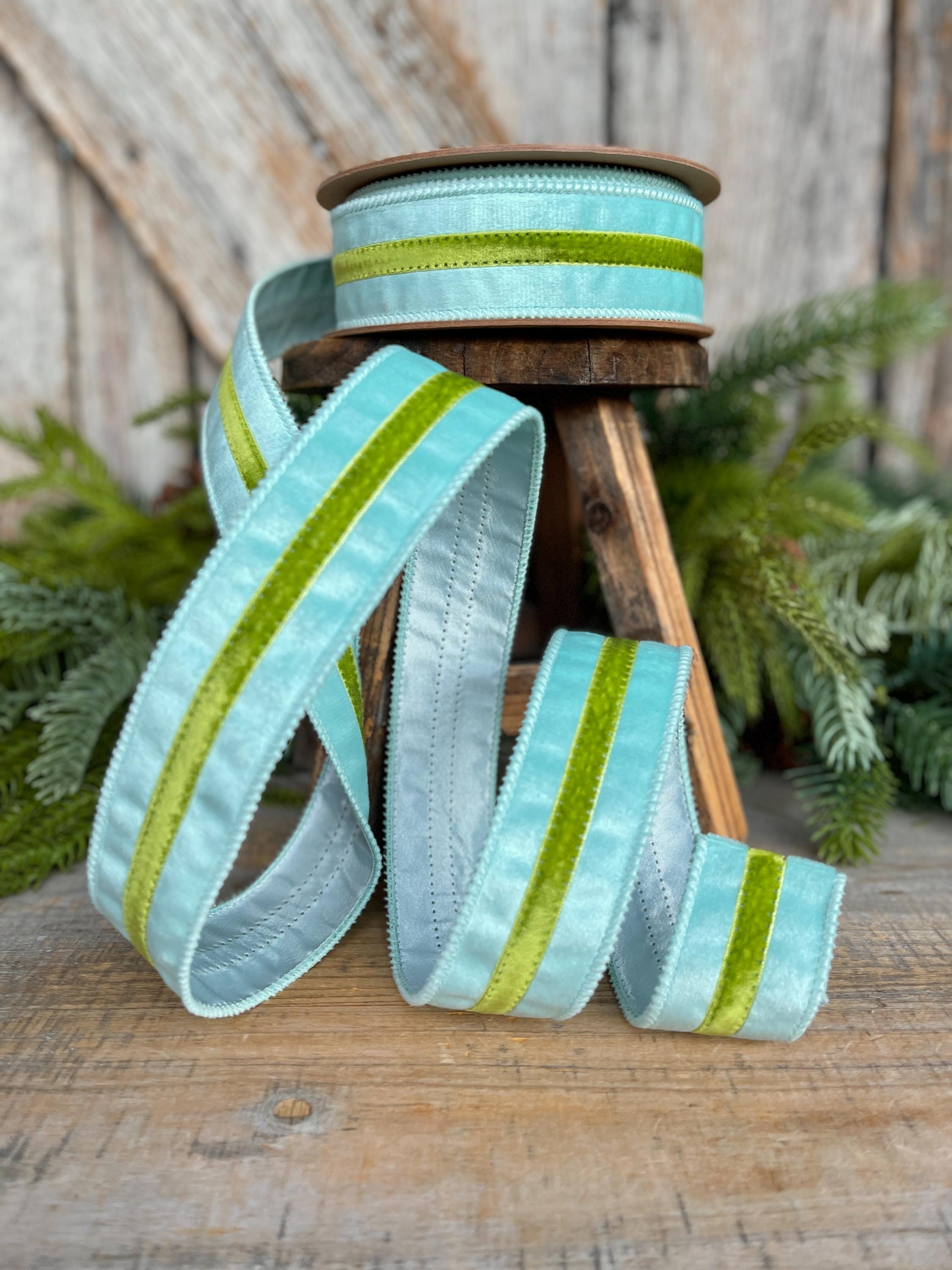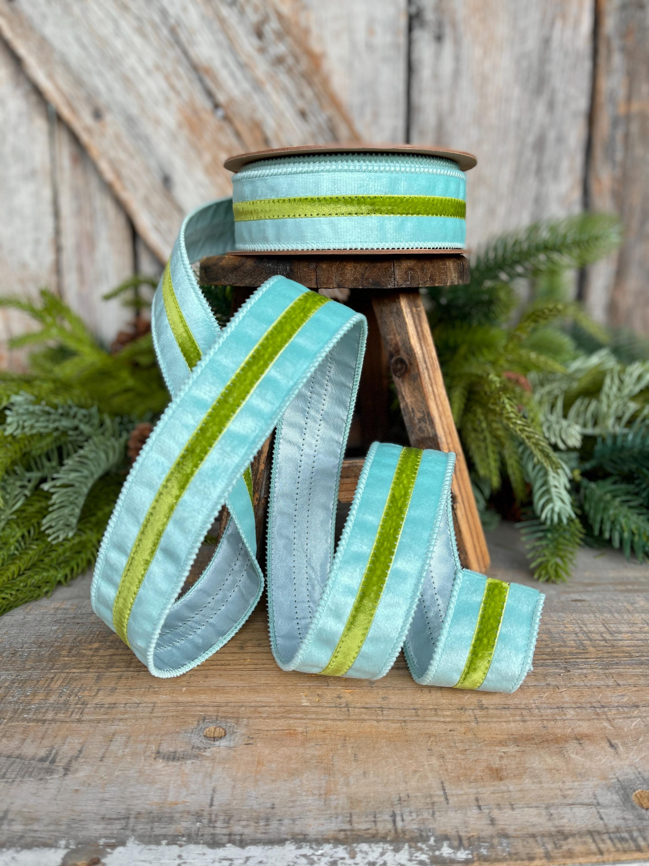 Elevate your designs with this 1.5-inch blue velvet wired ribbon featuring a rich green velvet trim. The soft, luxe velvet texture paired with contrasting trim creates a polished, high-end look perfect for designer wreaths and statement bows.