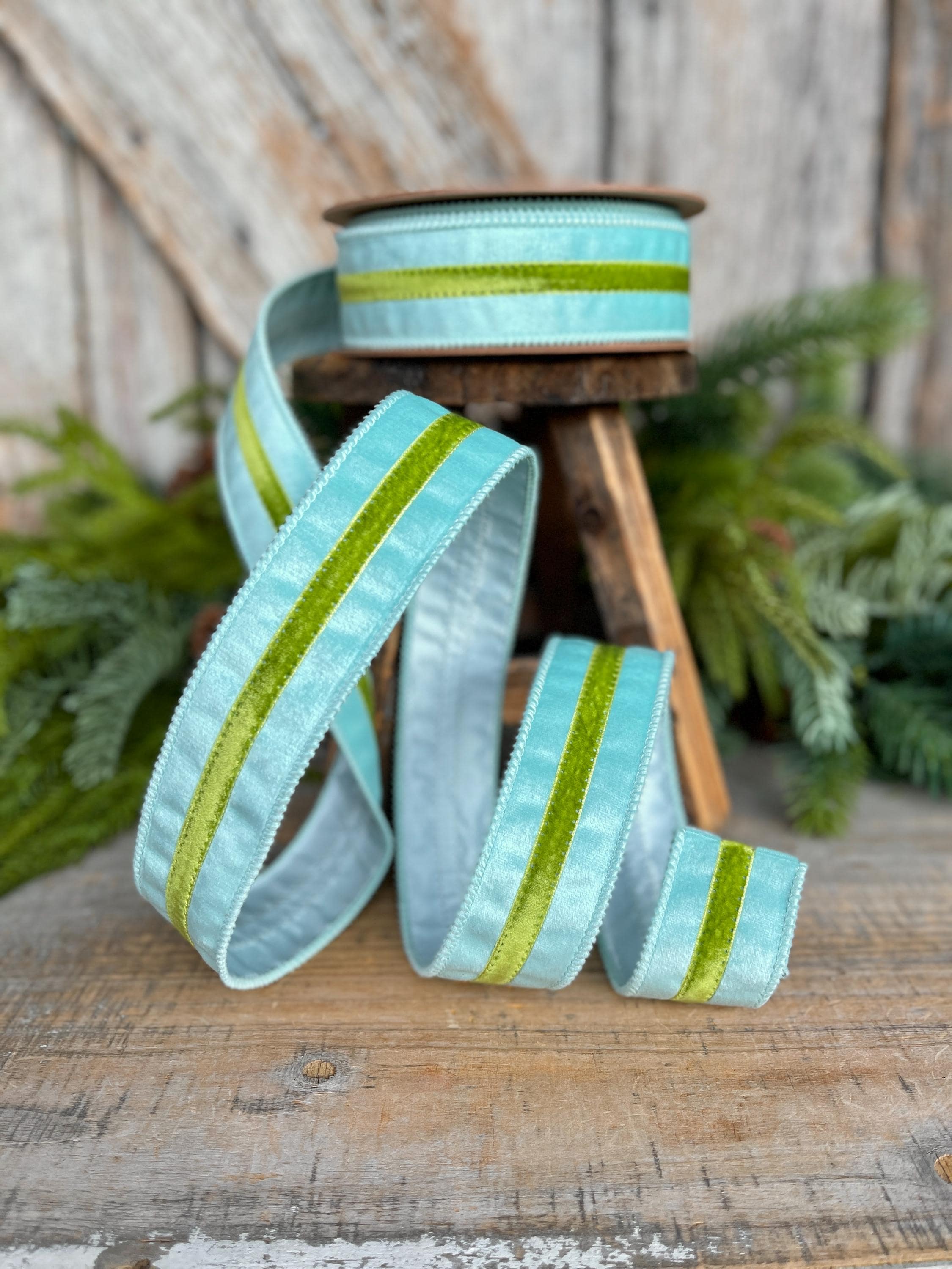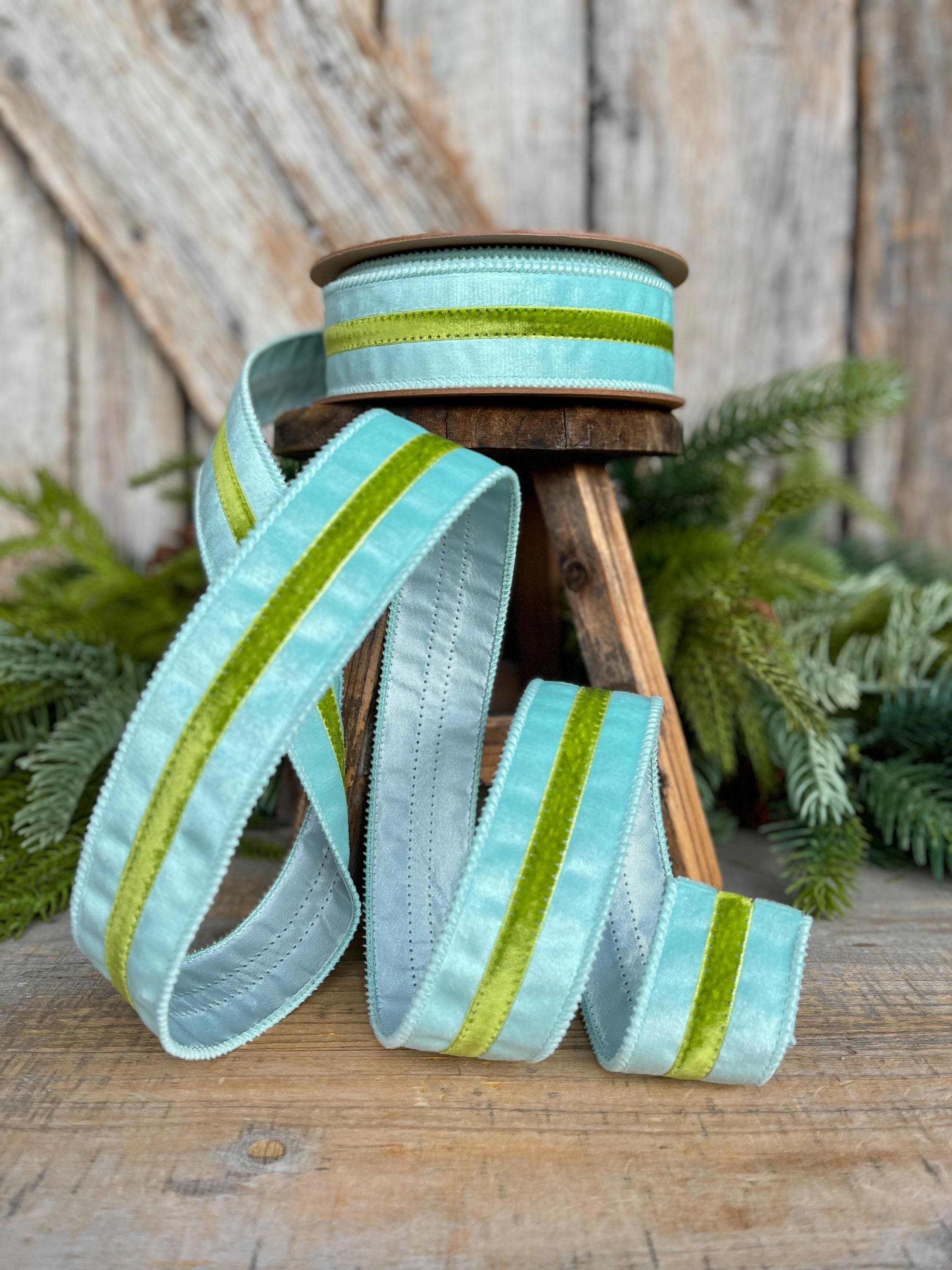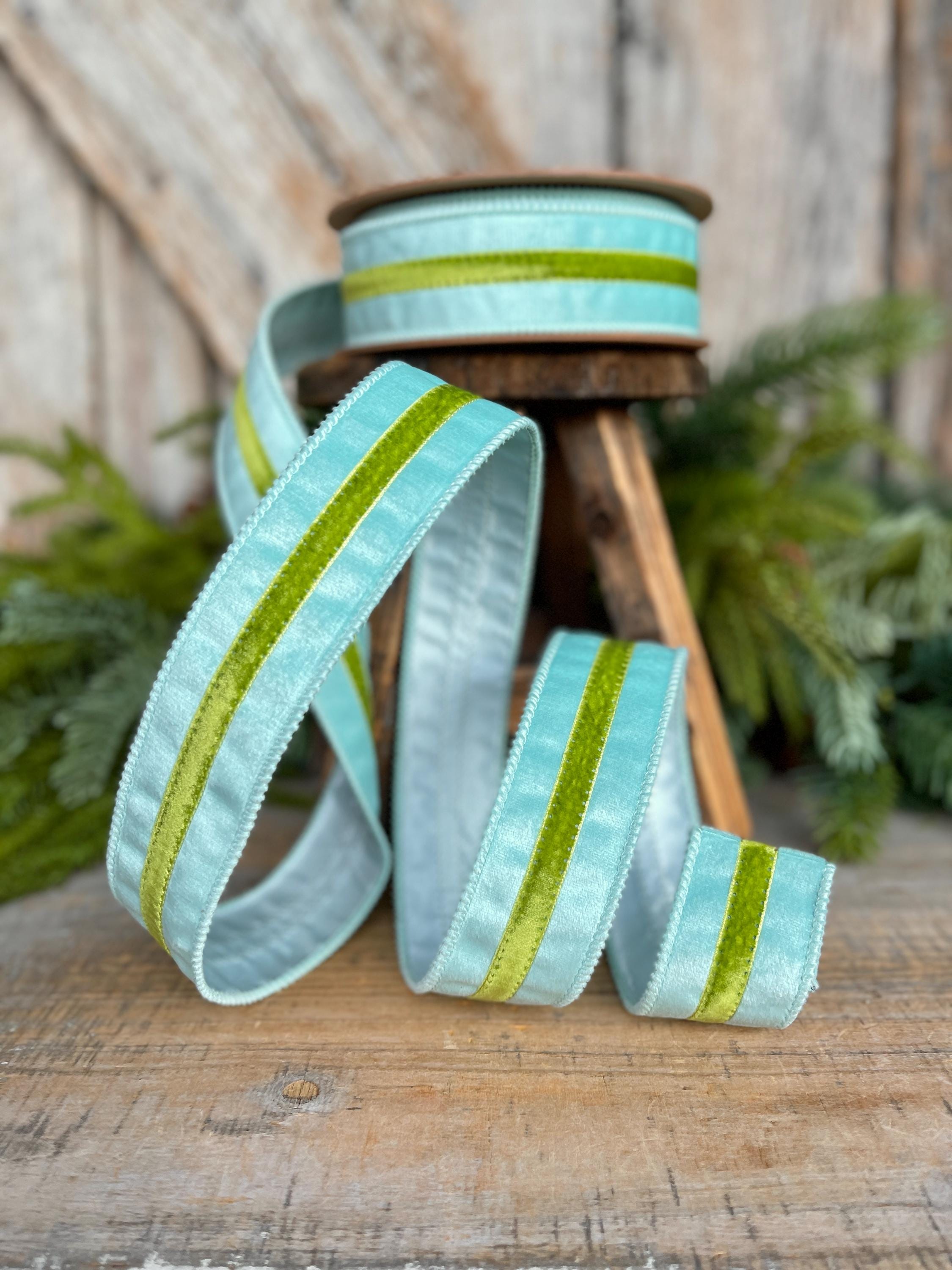 Elevate your designs with this 1.5-inch blue velvet wired ribbon featuring a rich green velvet trim. The soft, luxe velvet texture paired with contrasting trim creates a polished, high-end look perfect for designer wreaths and statement bows.