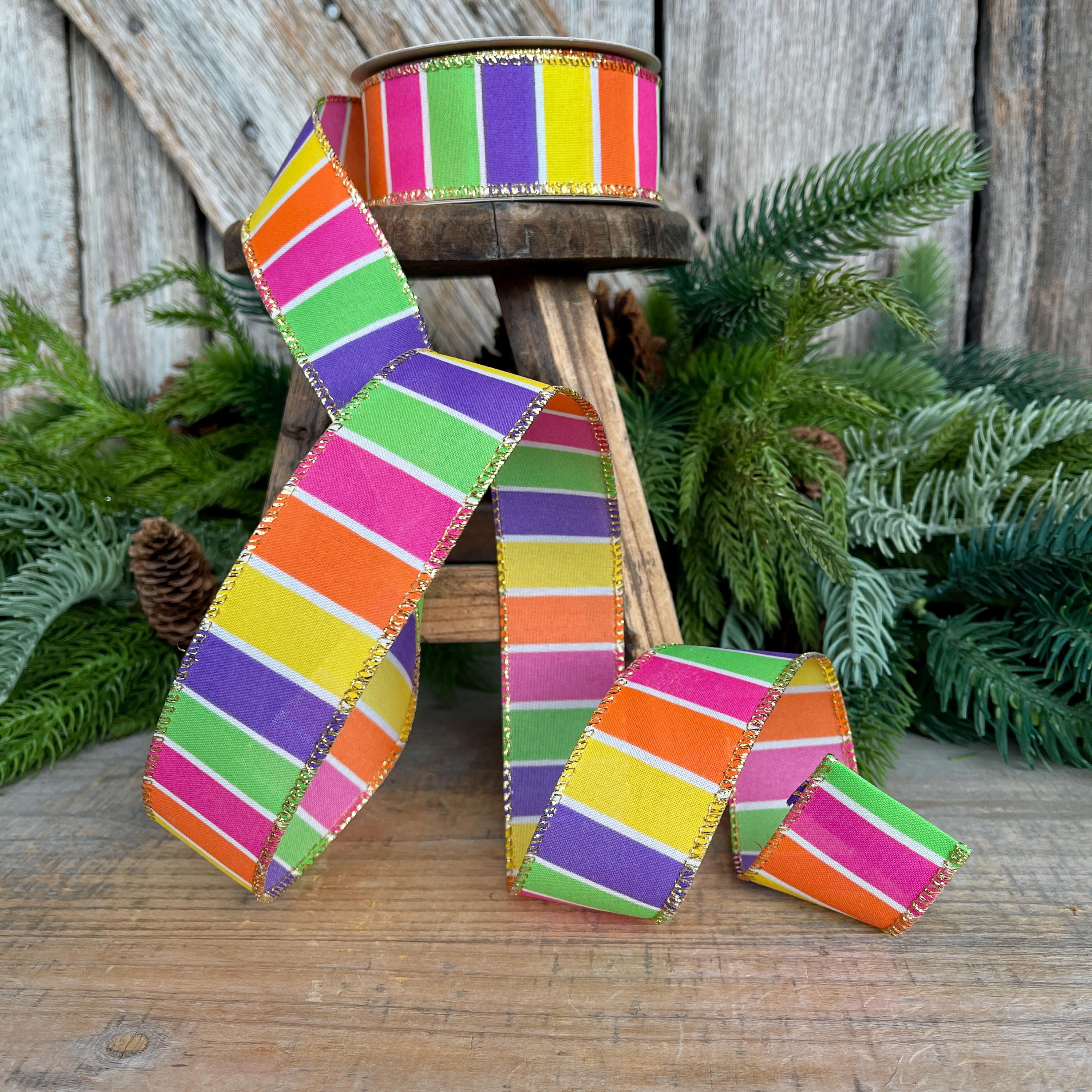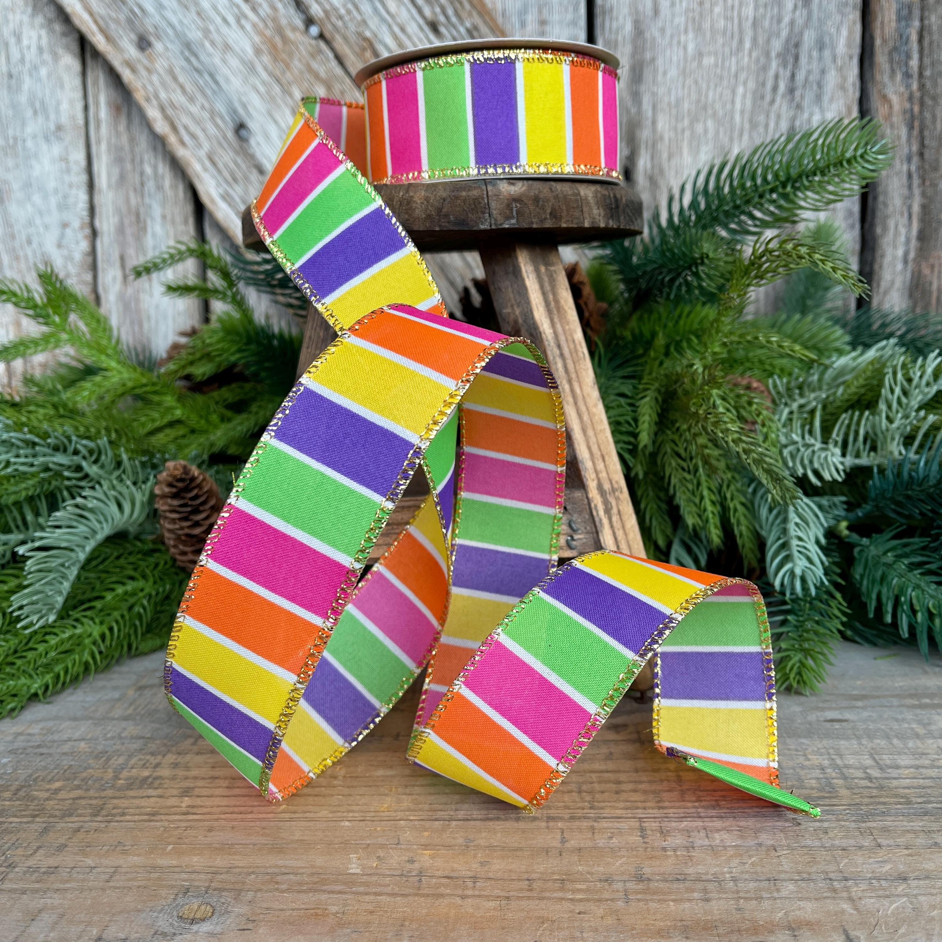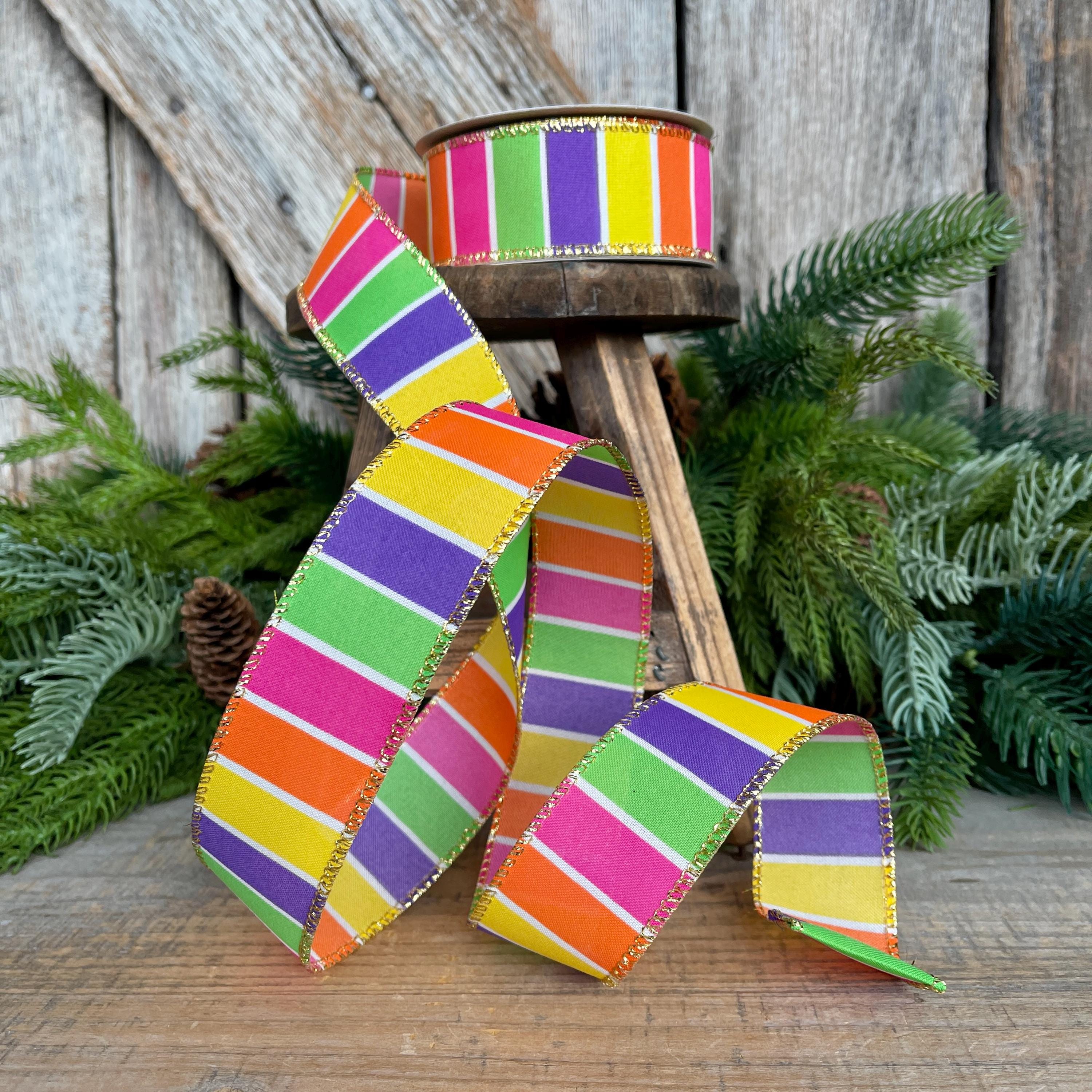 Make a statement with this 1.5-inch wide rainbow striped wired ribbon, finished with shimmering gold edges for an elevated designer look. Featuring vibrant stripes of orange, yellow, fuchsia, lime green, and purple, this ribbon adds instant personality and movement to any design.