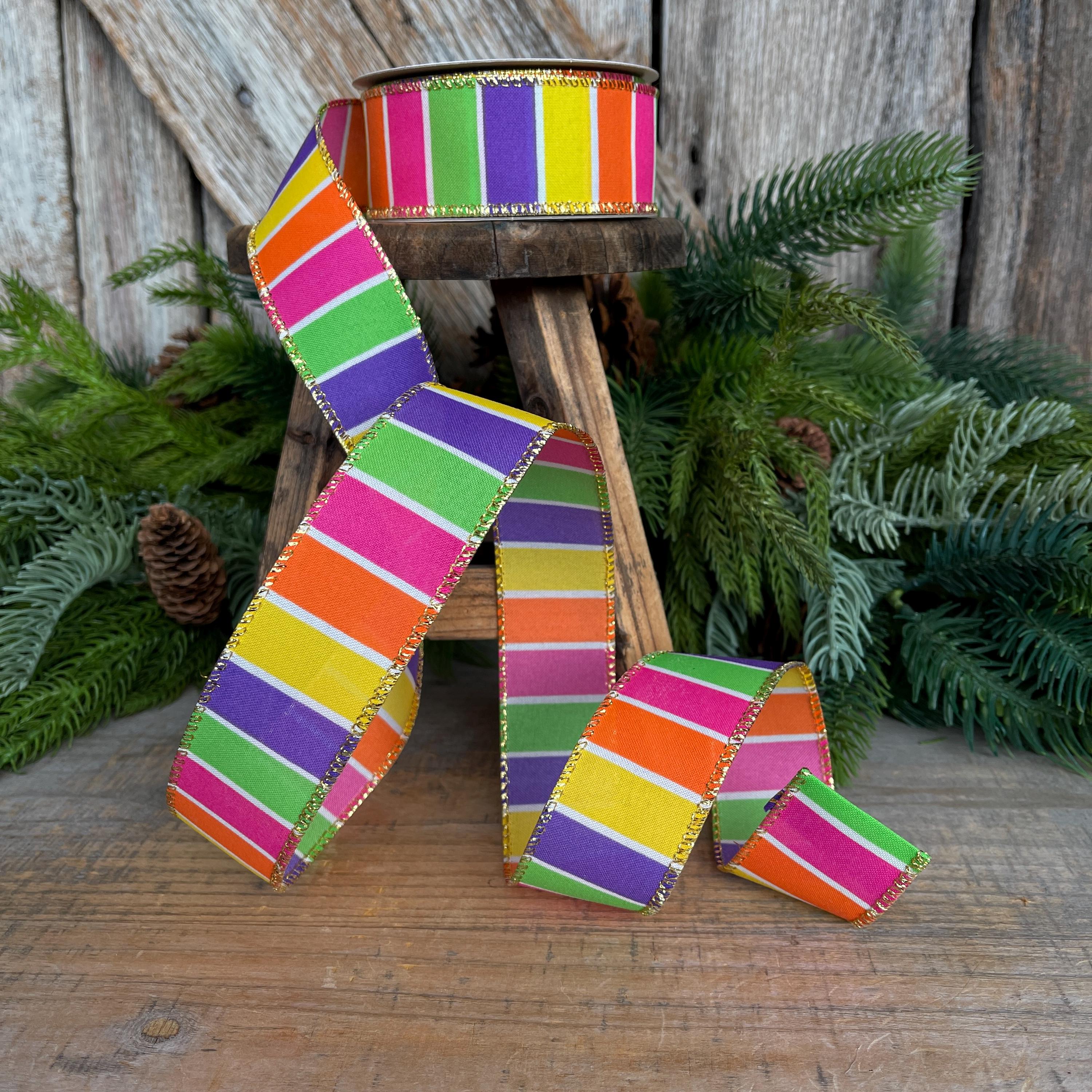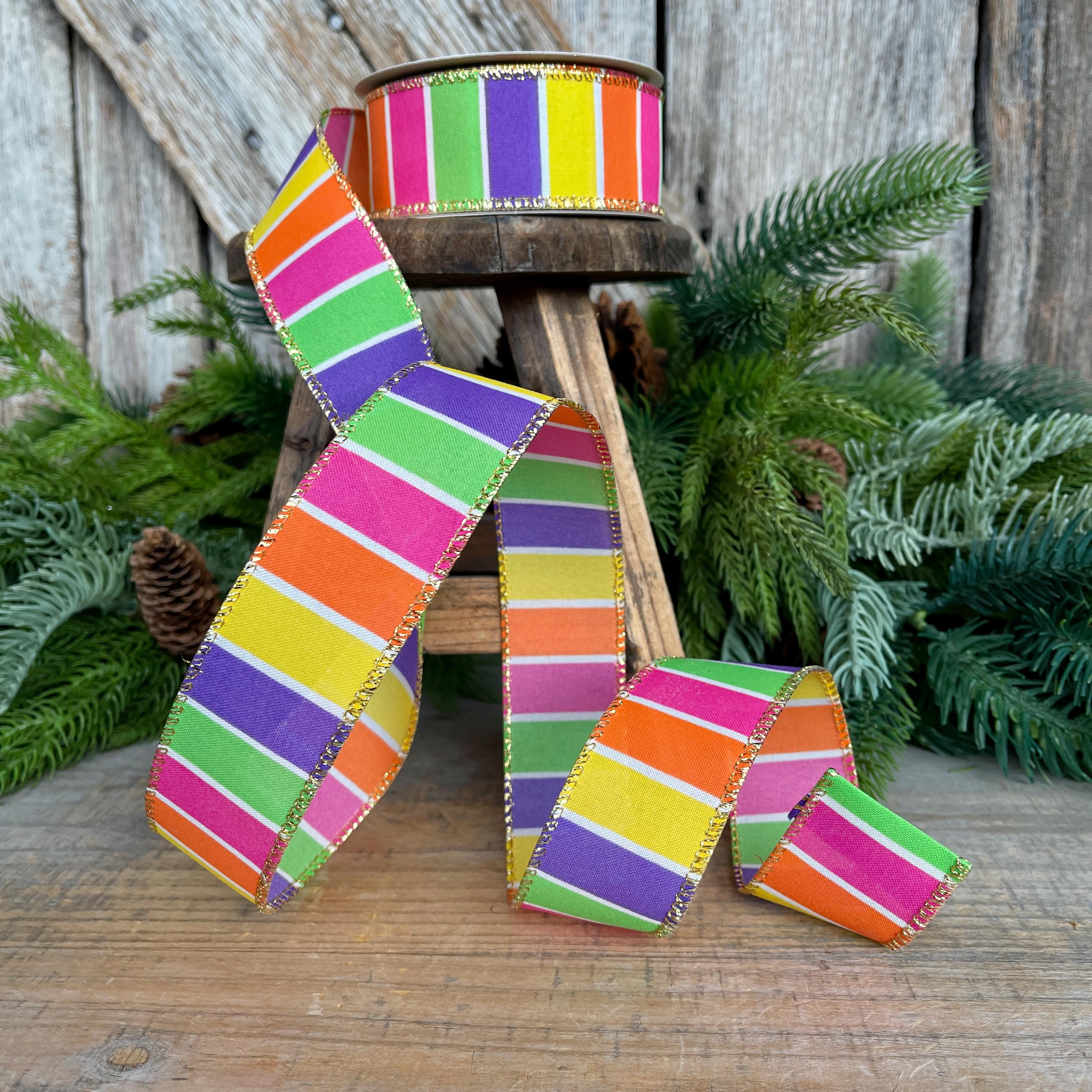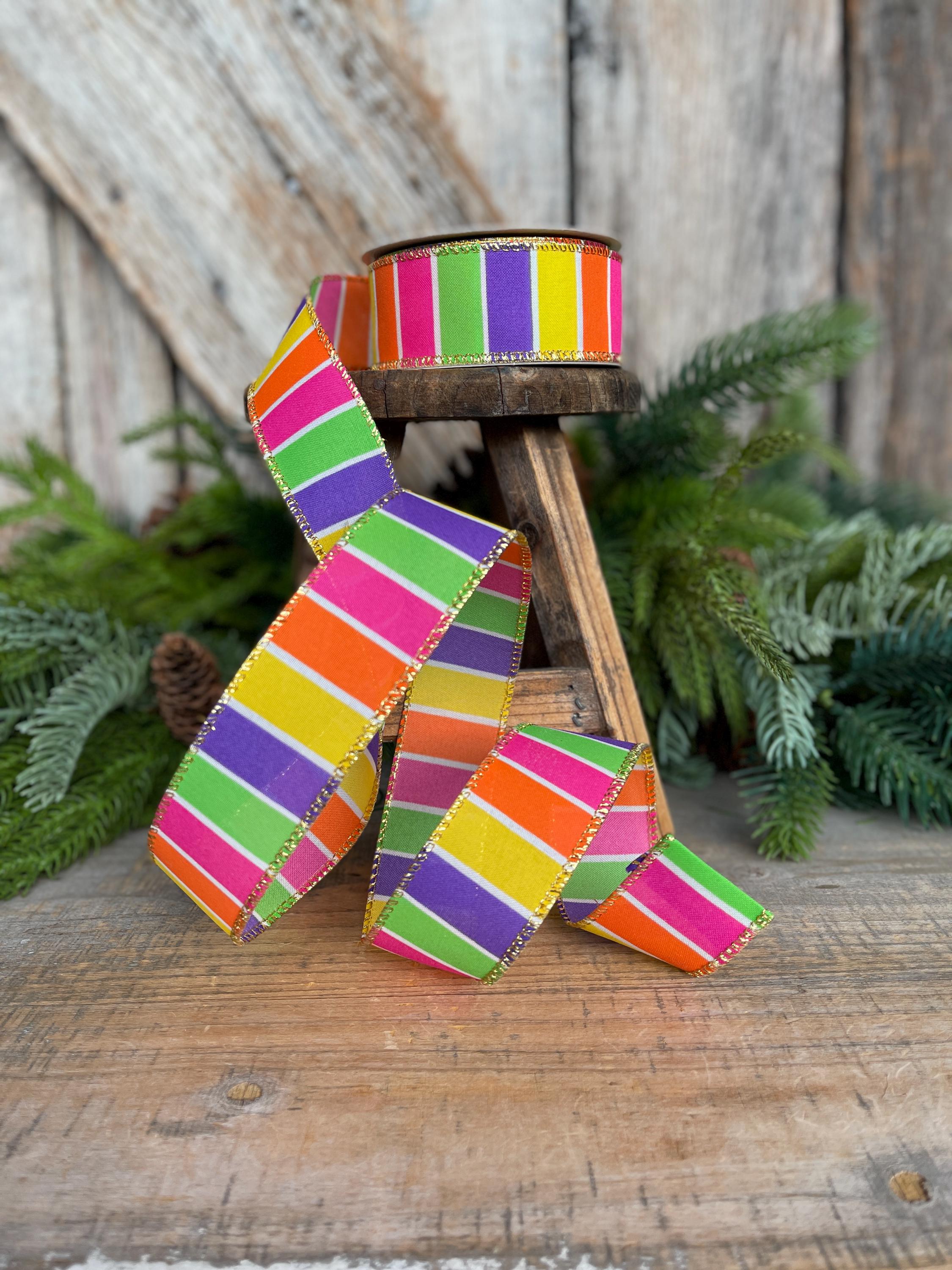 Make a statement with this 1.5-inch wide rainbow striped wired ribbon, finished with shimmering gold edges for an elevated designer look. Featuring vibrant stripes of orange, yellow, fuchsia, lime green, and purple, this ribbon adds instant personality and movement to any design.